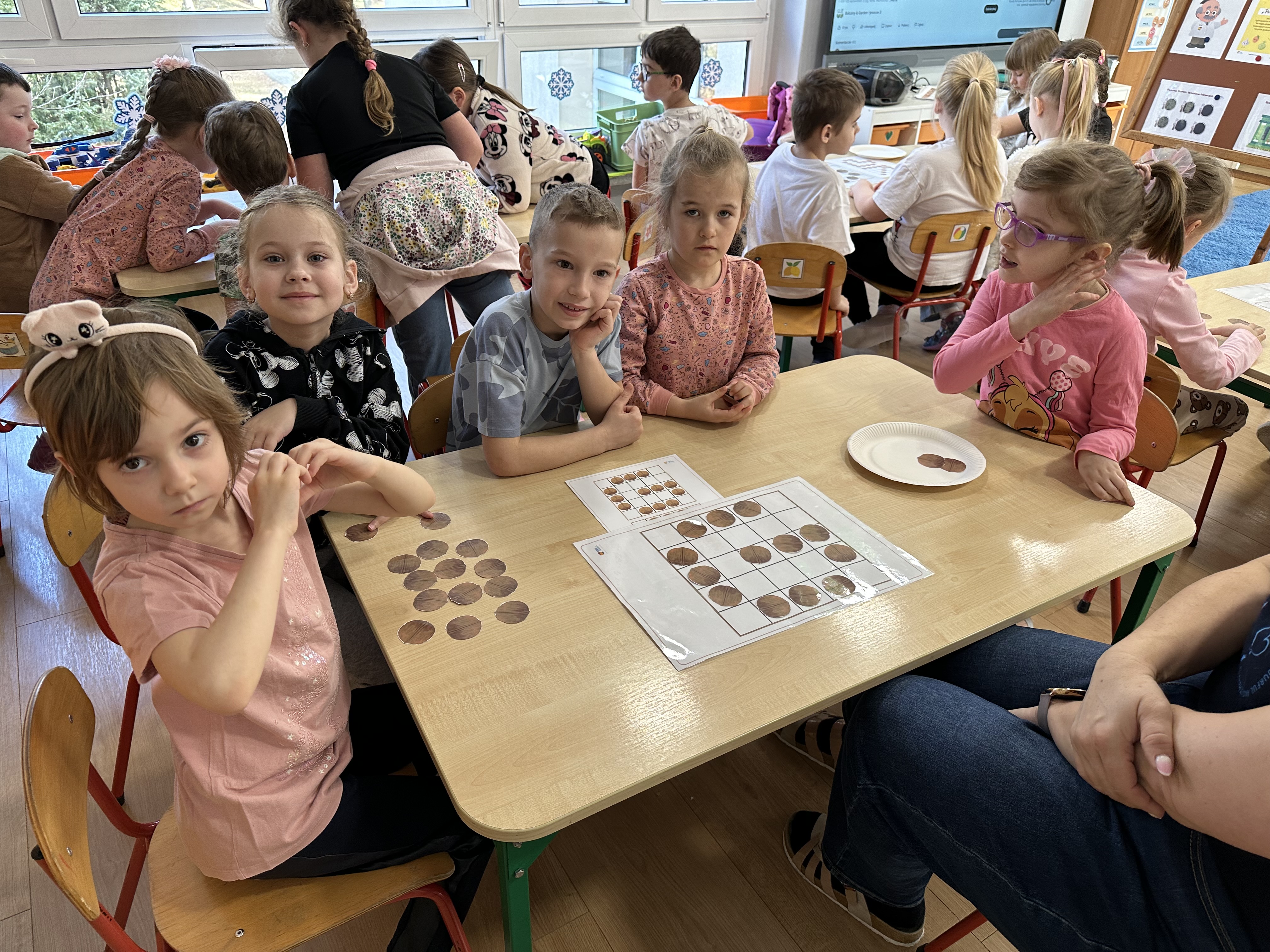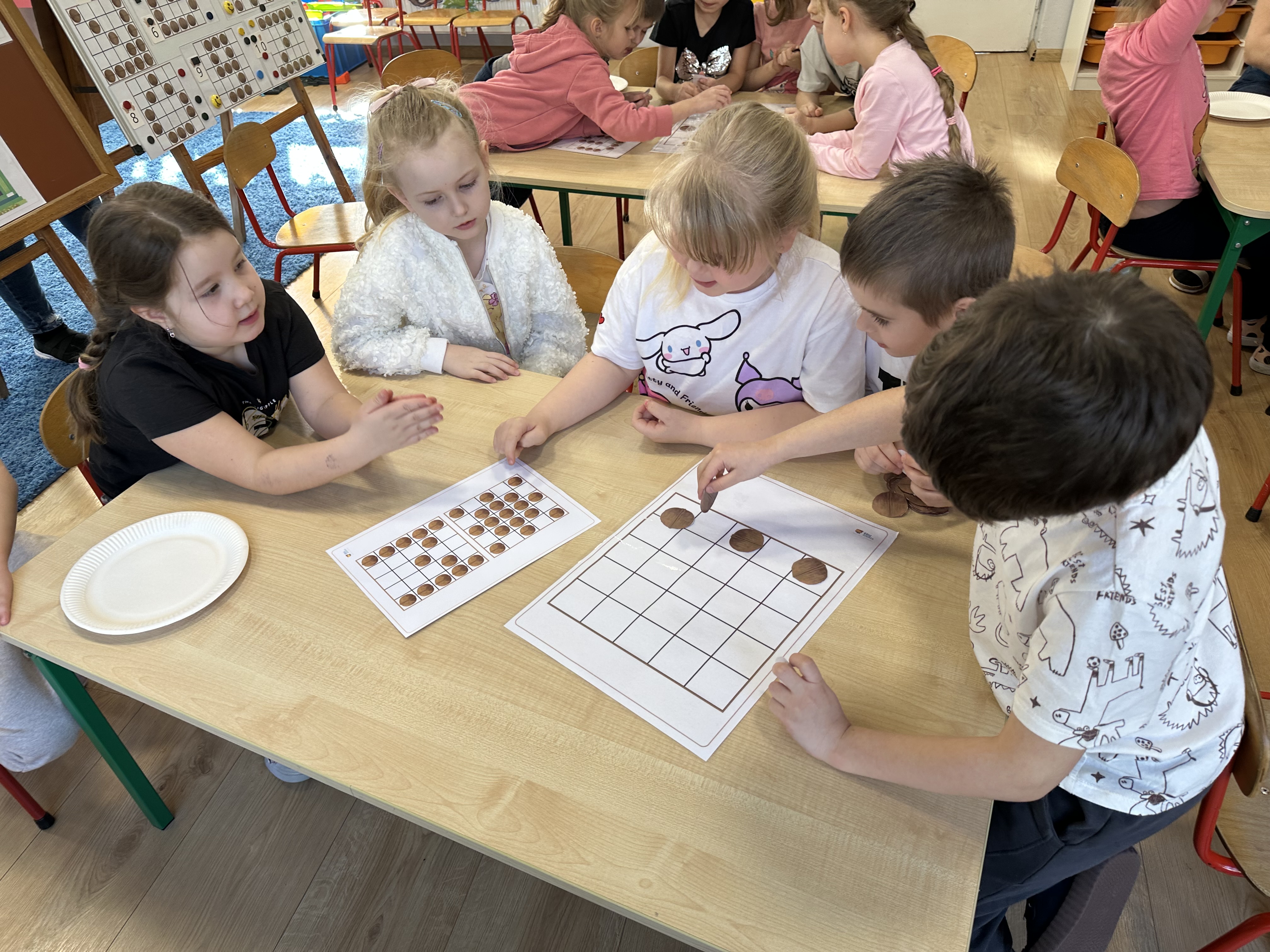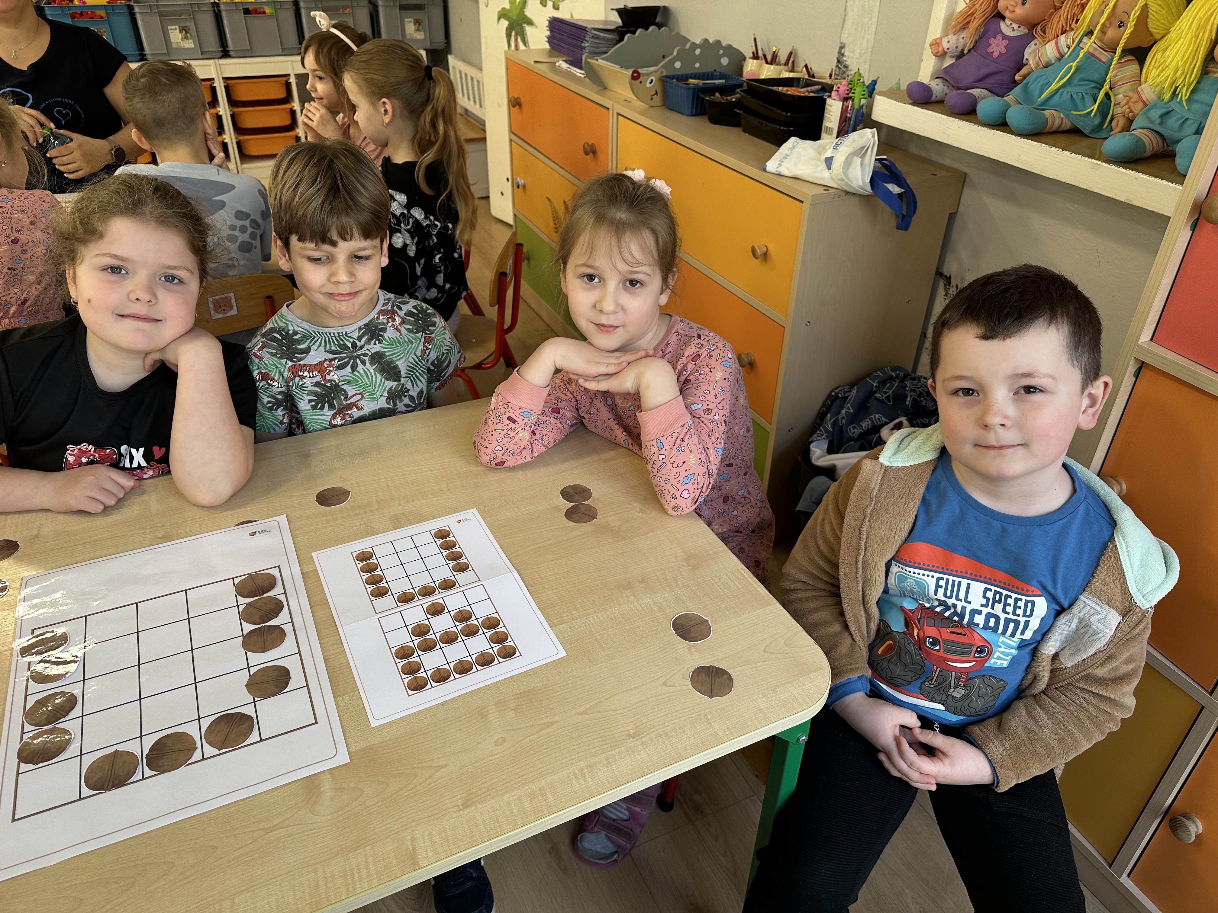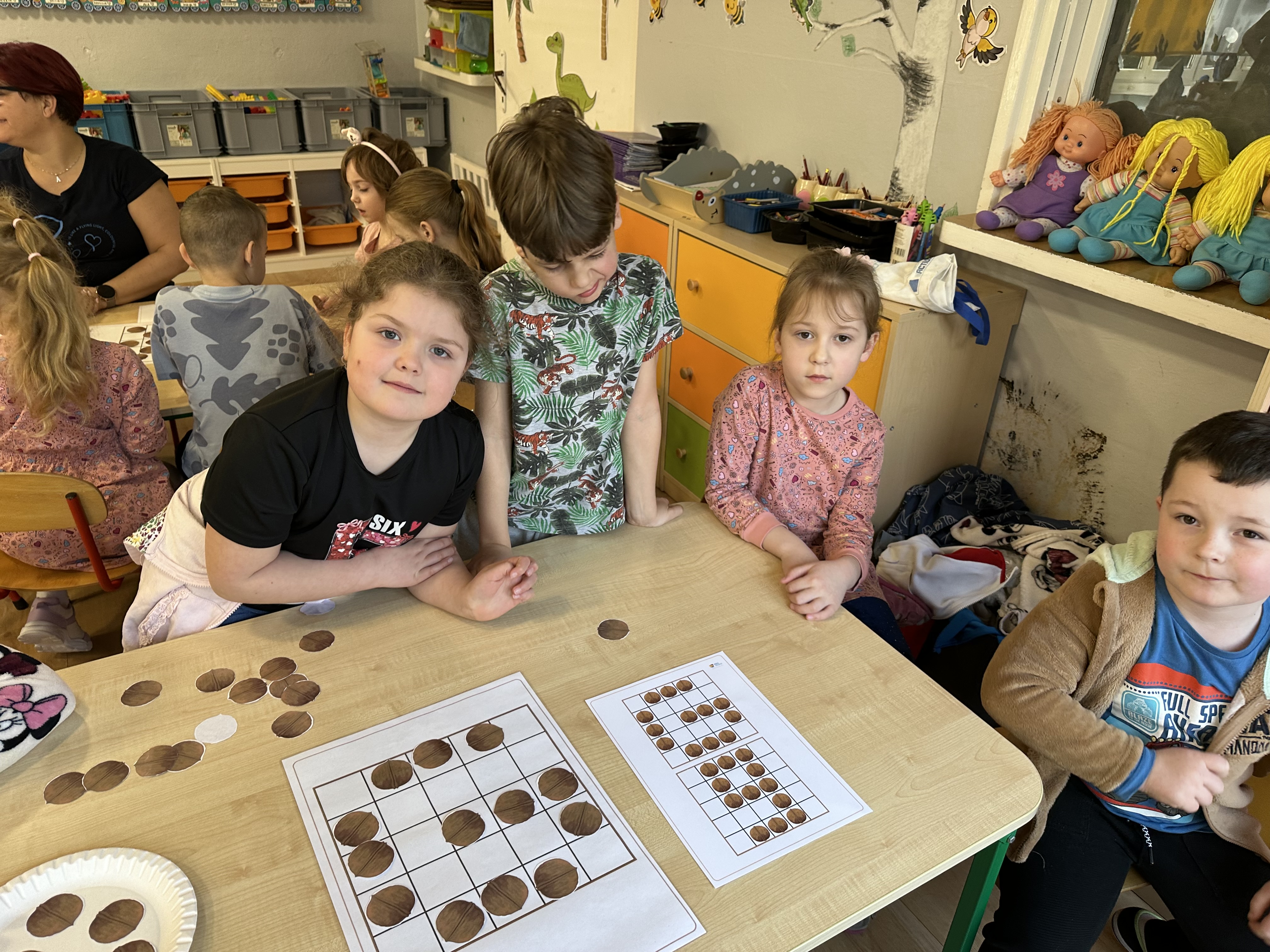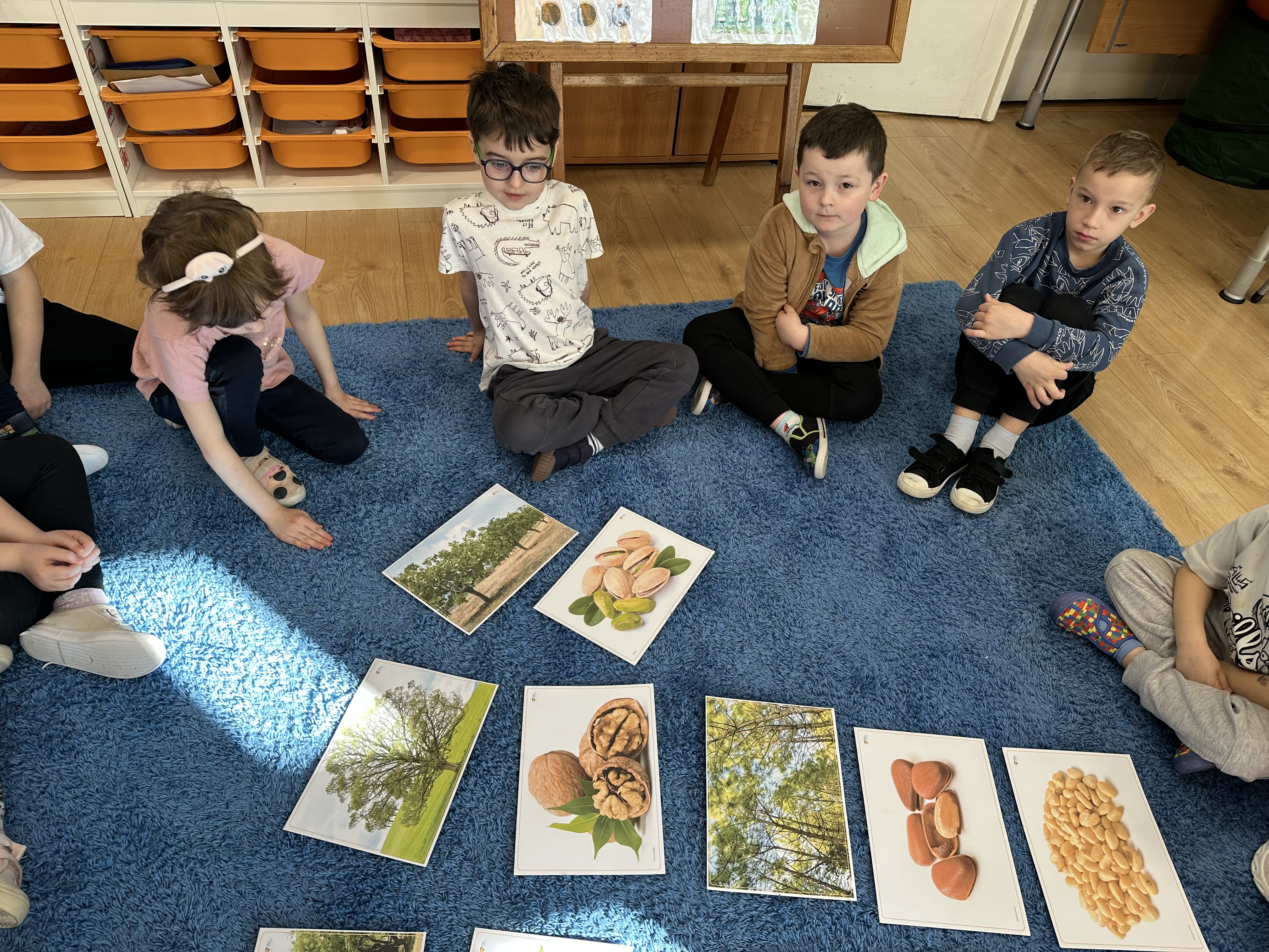 W ramach realizacji kolejnego modułu projektu edukacyjnego grupa „Pszczółek” poznawała wartości odżywcze orzechów. Wprowadzeniem do zajęć było wysłuchanie wiersza pt. „Orzechowy skarb”, który stał się inspiracją do rozmowy na temat różnych rodzajów orzechów. Dzieci aktywnie uczestniczyły w dyskusji – wymieniały znane im rodzaje orzechów oraz dzieliły się swoimi preferencjami smakowymi. Następnie oglądały ilustracje przedstawiające różnorodne orzechy oraz wysłuchały ciekawostek na ich temat. Miały również okazję do bezpośredniego kontaktu z wybranymi okazami – orzechami włoskimi i laskowymi - poprzez dotykanie, wąchanie i degustację. Dużym zainteresowaniem cieszył się film edukacyjny przedstawiający proces wzrostu orzechów ziemnych w przyspieszonym tempie. Po jego obejrzeniu dzieci utrwalały zdobytą wiedzę, układając ilustracje w odpowiedniej kolejności. W trakcie zajęć nie zabrakło również aktywności ruchowych – dzieci brały udział w zabawie „Wiewiórka hop do dziupli z orzeszkiem – wiewiórka z dziupli”, która rozwijała ich sprawność fizyczną i refleks. W dalszej części zajęć dzieci zapoznały się z nazwami zdrowych potraw zawierających orzechy oraz uczestniczyły w zabawie „Układanka lewopółkulowa”, odwzorowując kształty z orzechów na planszach oraz tworząc własne kompozycje. Ćwiczyły również spostrzegawczość w zabawie „Rozpoznaj i połącz”. Zrealizowane działania pozwoliły dzieciom poszerzyć wiedzę na temat zdrowego odżywiania, rozwijać zmysły oraz umiejętności poznawcze i manualne.