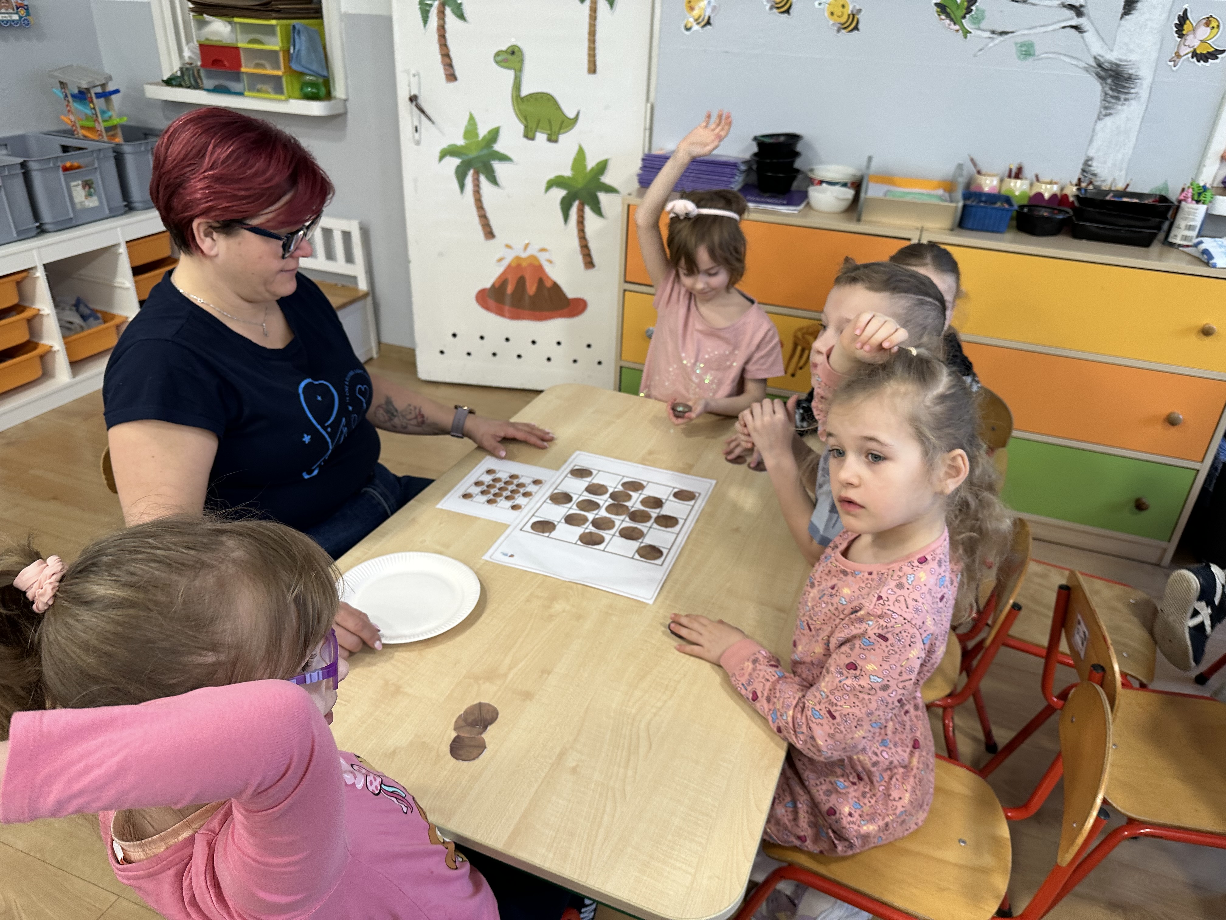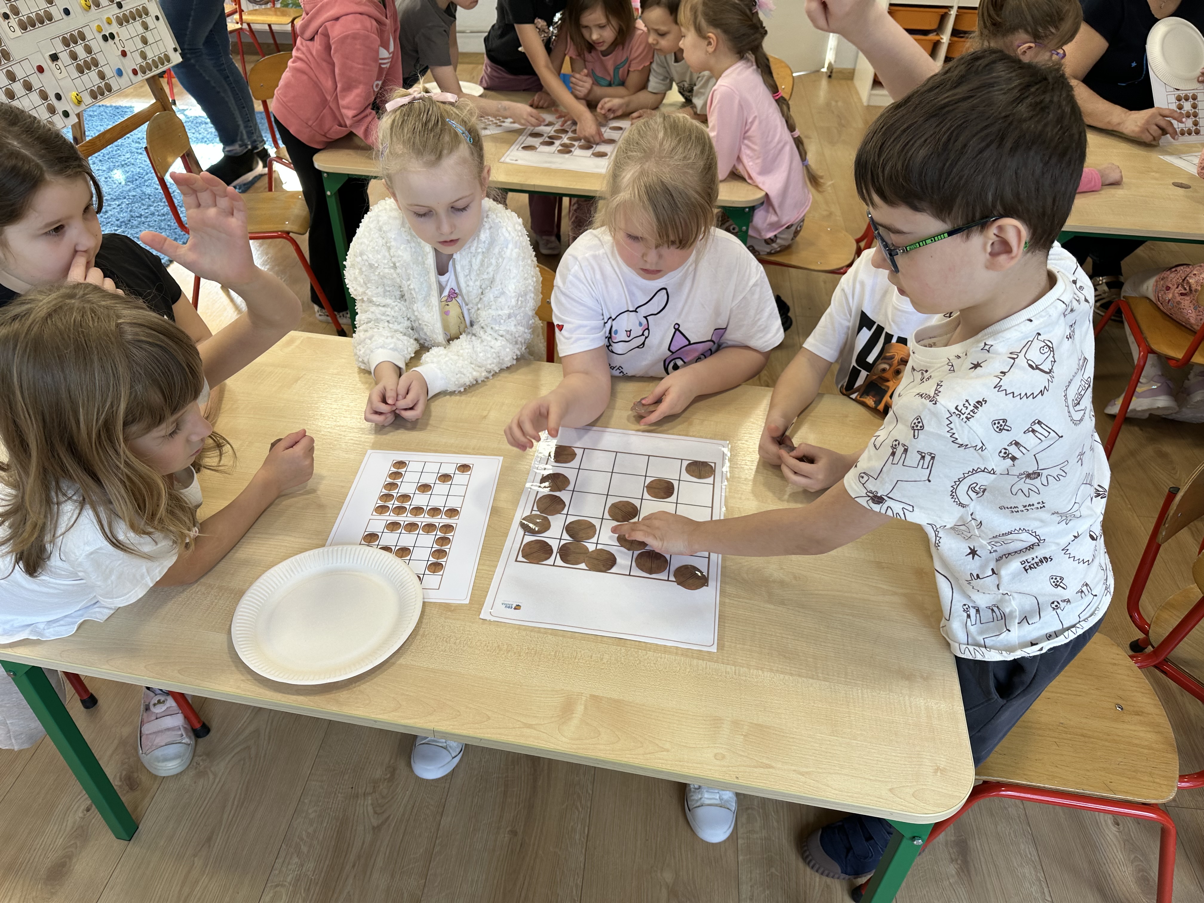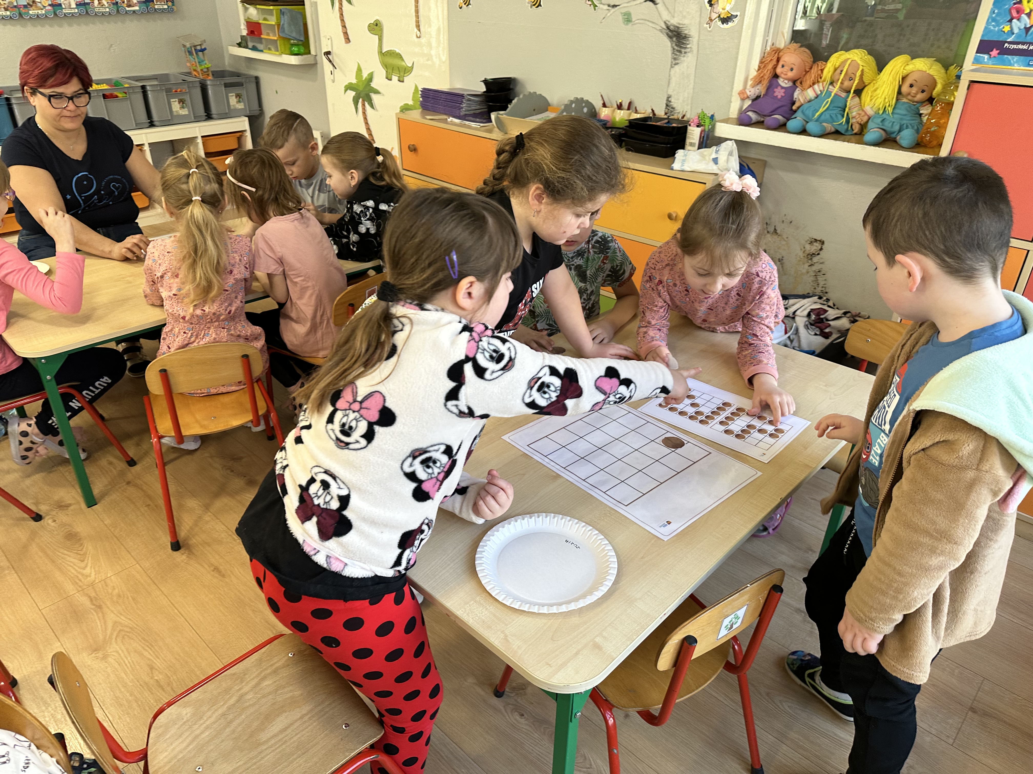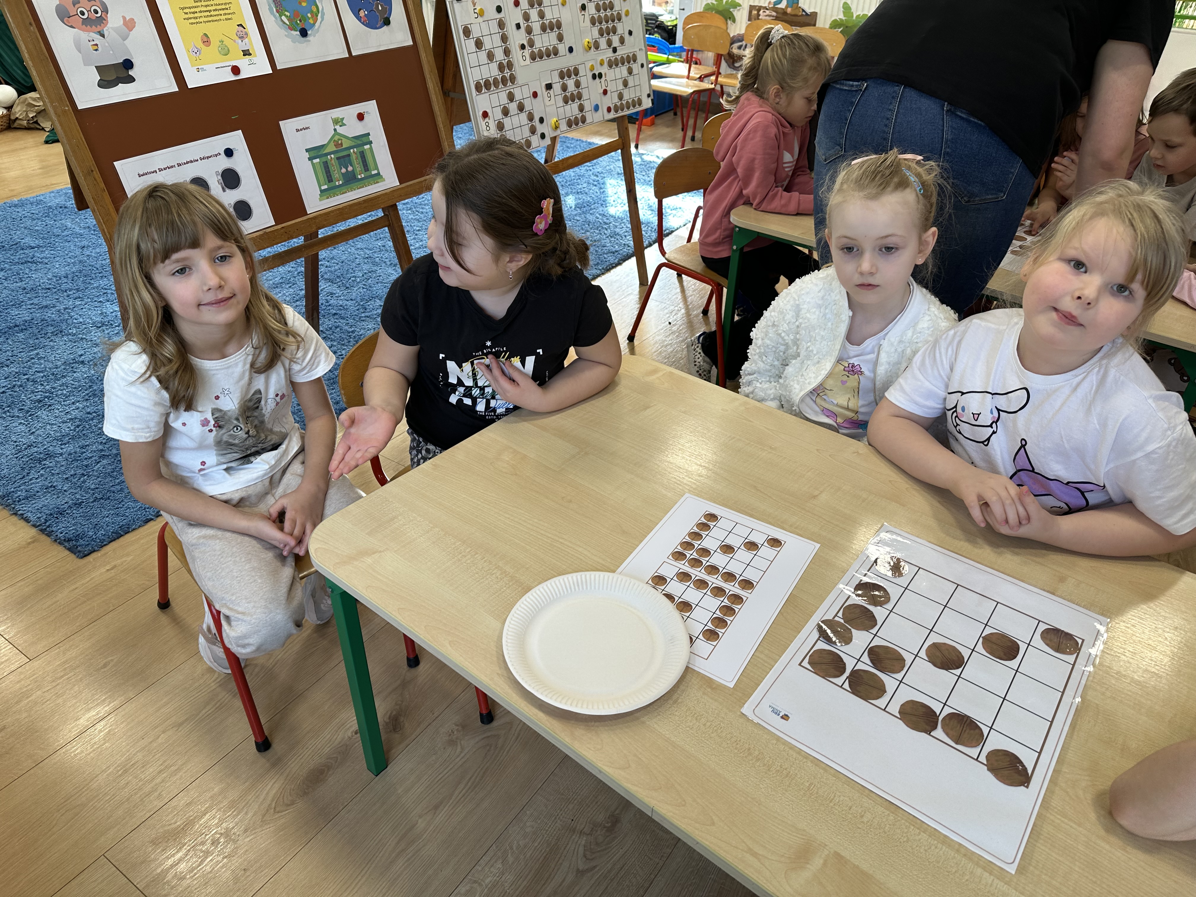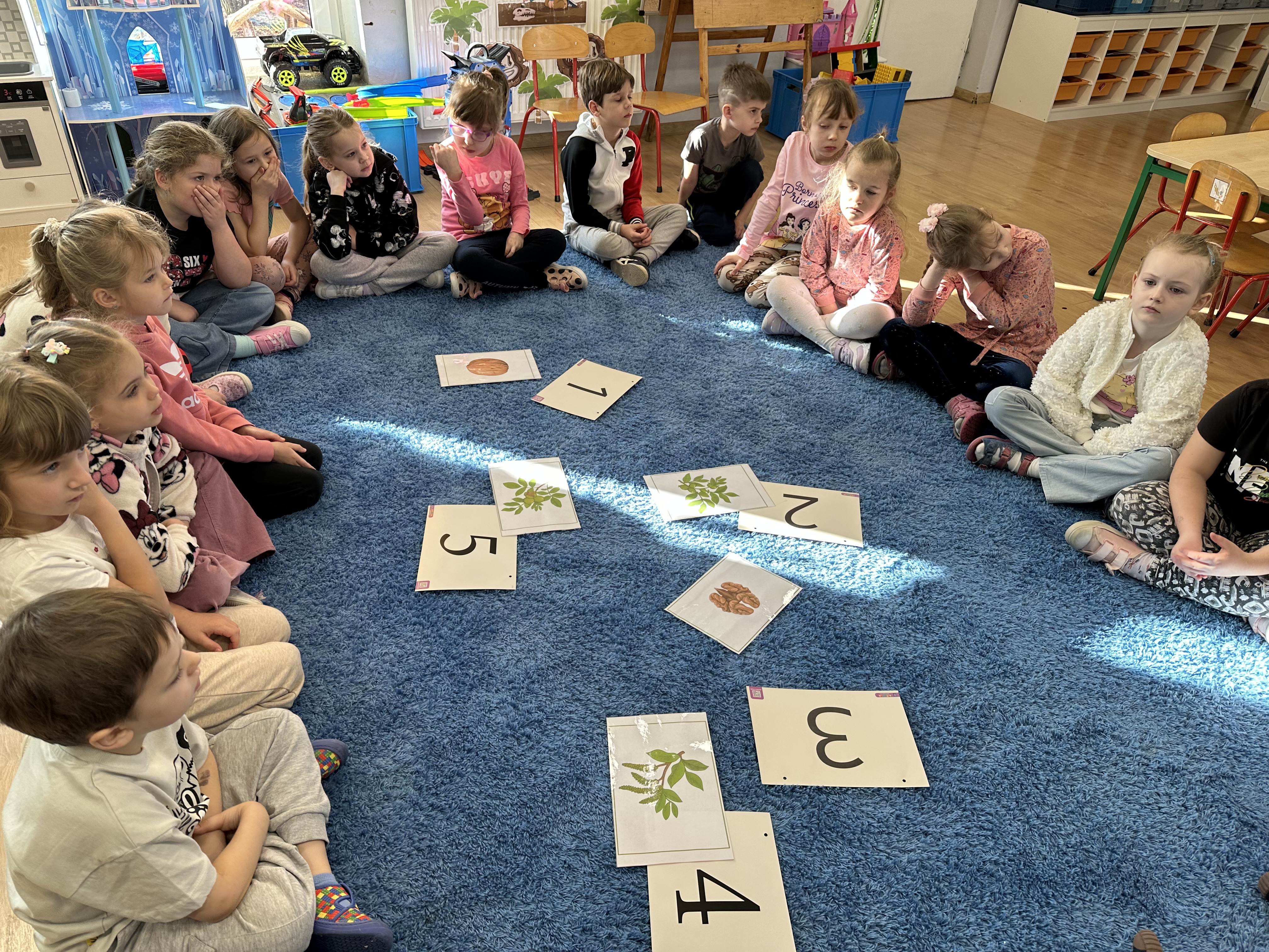 W ramach realizacji kolejnego modułu projektu edukacyjnego grupa „Pszczółek” poznawała wartości odżywcze orzechów. Wprowadzeniem do zajęć było wysłuchanie wiersza pt. „Orzechowy skarb”, który stał się inspiracją do rozmowy na temat różnych rodzajów orzechów. Dzieci aktywnie uczestniczyły w dyskusji – wymieniały znane im rodzaje orzechów oraz dzieliły się swoimi preferencjami smakowymi. Następnie oglądały ilustracje przedstawiające różnorodne orzechy oraz wysłuchały ciekawostek na ich temat. Miały również okazję do bezpośredniego kontaktu z wybranymi okazami – orzechami włoskimi i laskowymi - poprzez dotykanie, wąchanie i degustację. Dużym zainteresowaniem cieszył się film edukacyjny przedstawiający proces wzrostu orzechów ziemnych w przyspieszonym tempie. Po jego obejrzeniu dzieci utrwalały zdobytą wiedzę, układając ilustracje w odpowiedniej kolejności. W trakcie zajęć nie zabrakło również aktywności ruchowych – dzieci brały udział w zabawie „Wiewiórka hop do dziupli z orzeszkiem – wiewiórka z dziupli”, która rozwijała ich sprawność fizyczną i refleks. W dalszej części zajęć dzieci zapoznały się z nazwami zdrowych potraw zawierających orzechy oraz uczestniczyły w zabawie „Układanka lewopółkulowa”, odwzorowując kształty z orzechów na planszach oraz tworząc własne kompozycje. Ćwiczyły również spostrzegawczość w zabawie „Rozpoznaj i połącz”. Zrealizowane działania pozwoliły dzieciom poszerzyć wiedzę na temat zdrowego odżywiania, rozwijać zmysły oraz umiejętności poznawcze i manualne.