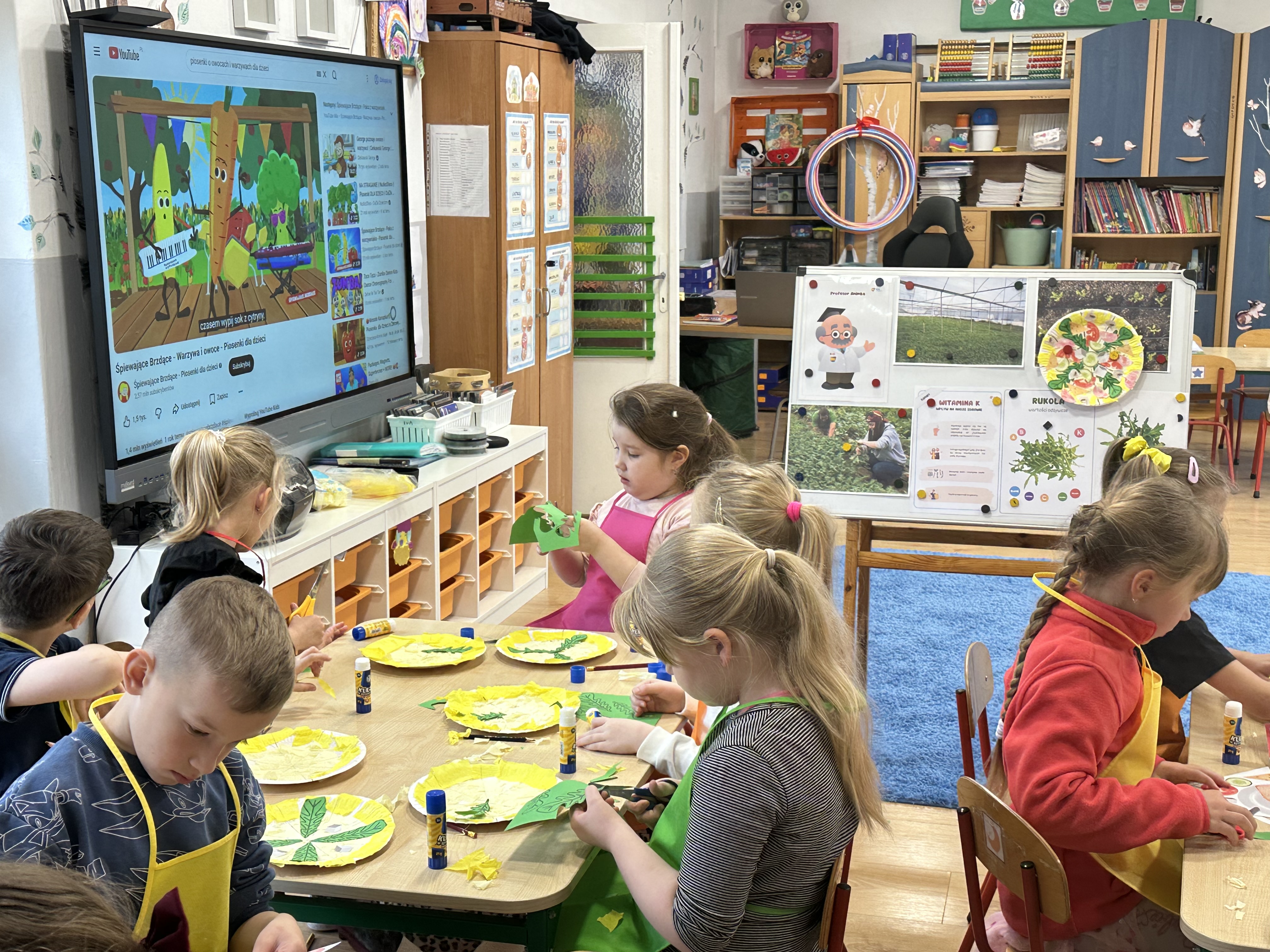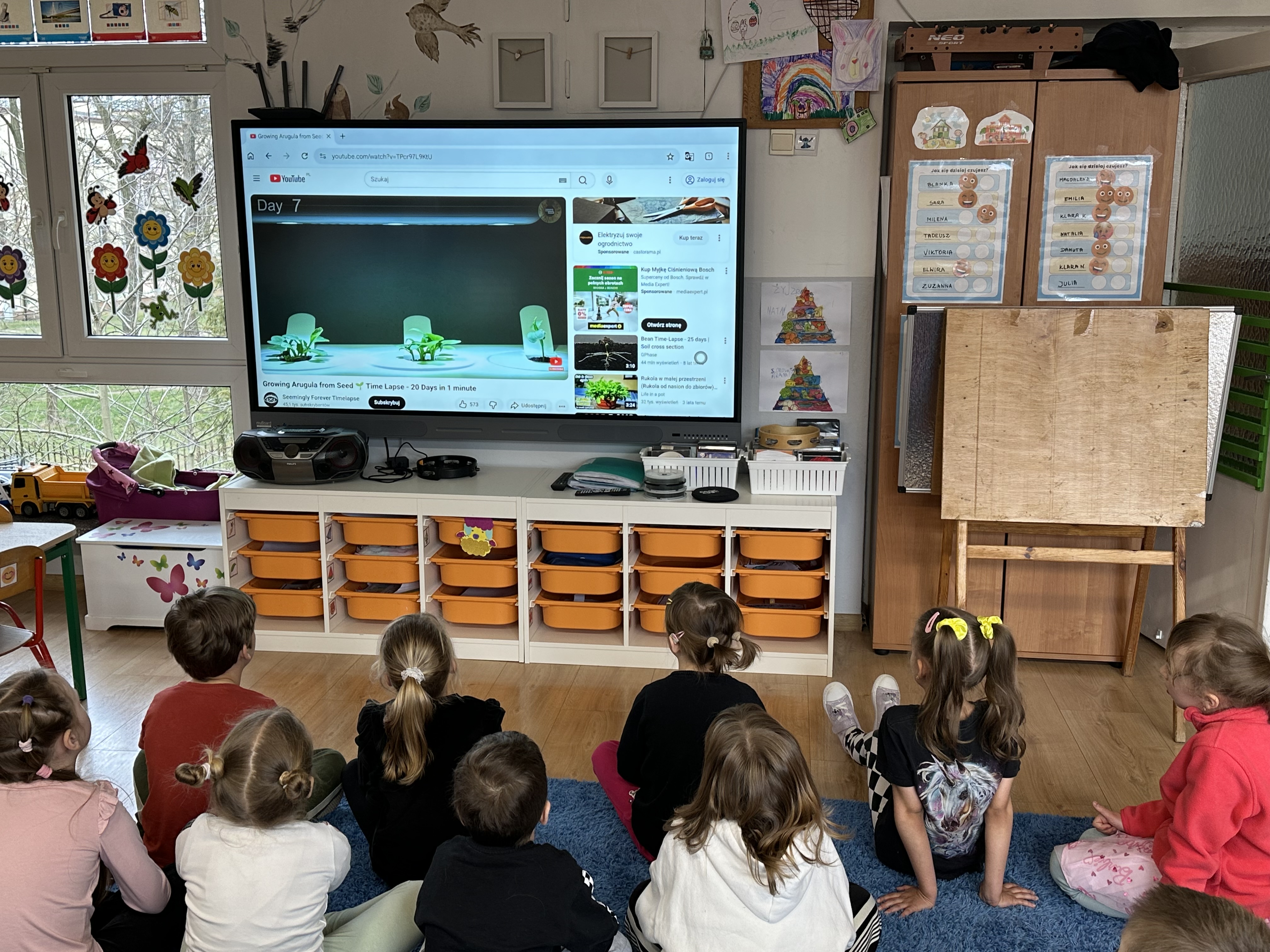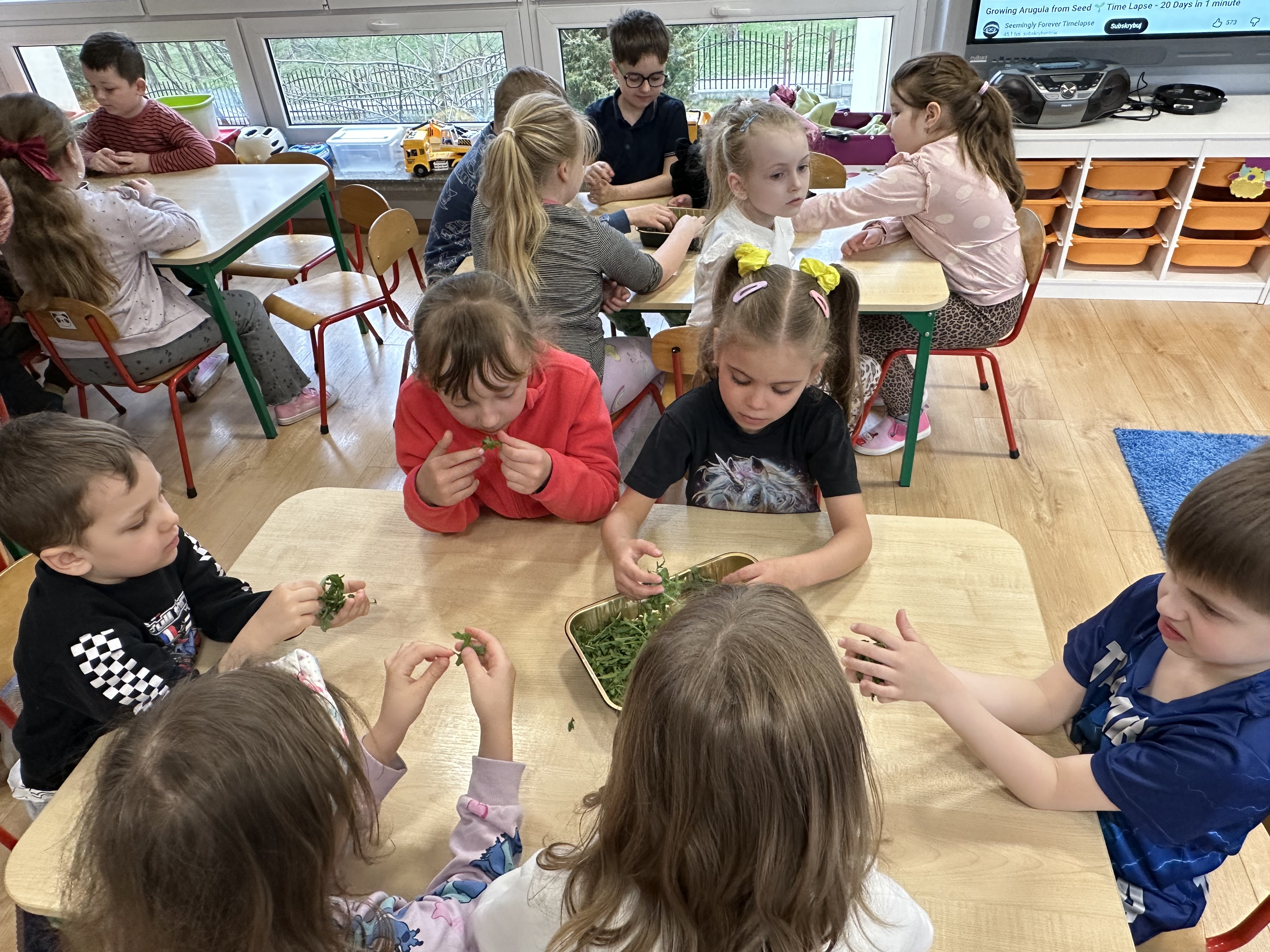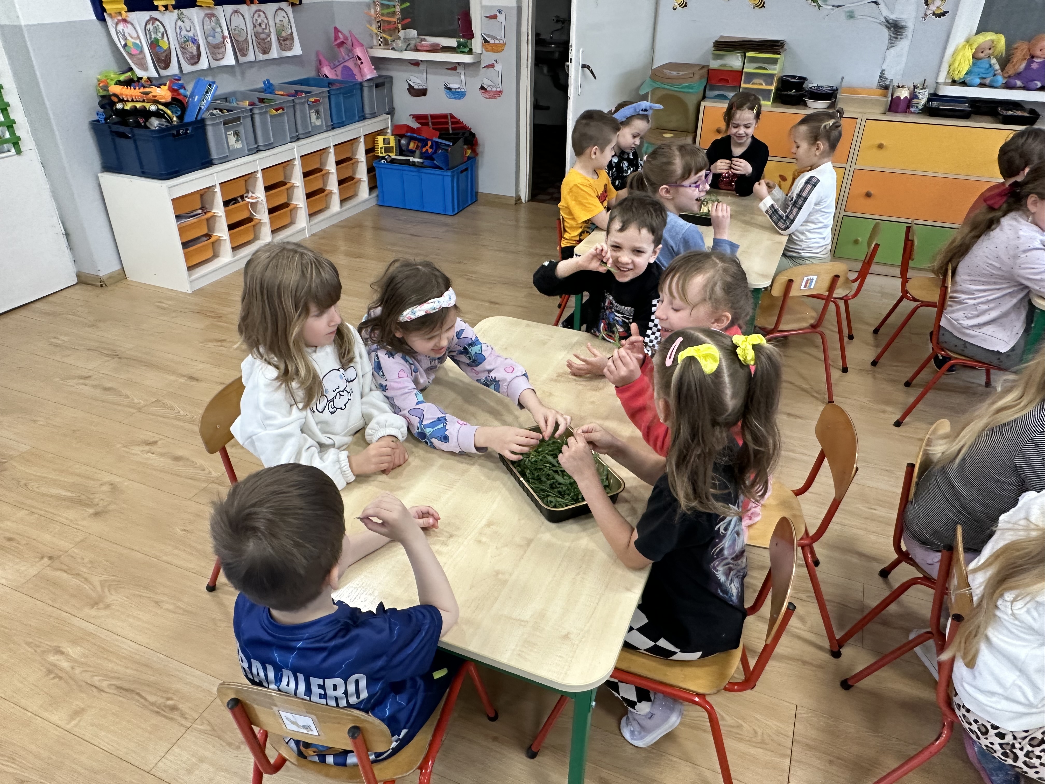 W ramach realizacji Modułu 7 dzieci z grupy „Pszczółki” poznały kolejne zdrowe warzywo -rukolę. Sytuacje edukacyjne rozpoczęły się od obejrzenia filmu edukacyjnego, dzięki któremu dzieci dowiedziały się, jak wygląda proces uprawy rukoli - od maleńkiego ziarenka aż po dojrzałą roślinę. Następnie utrwaliły zdobytą wiedzę, układając historyjkę obrazkową przedstawiającą kolejne etapy wzrostu rośliny.
