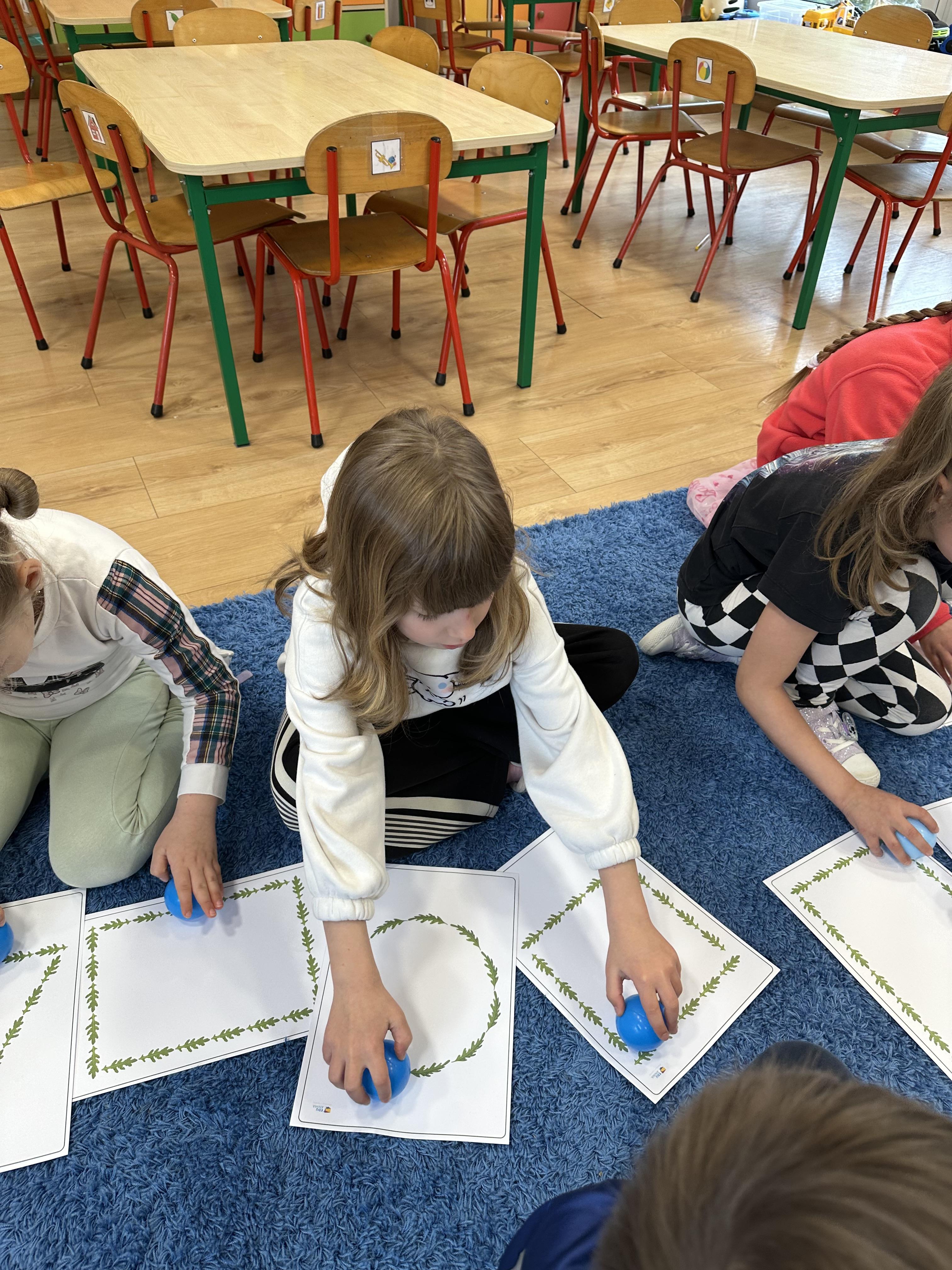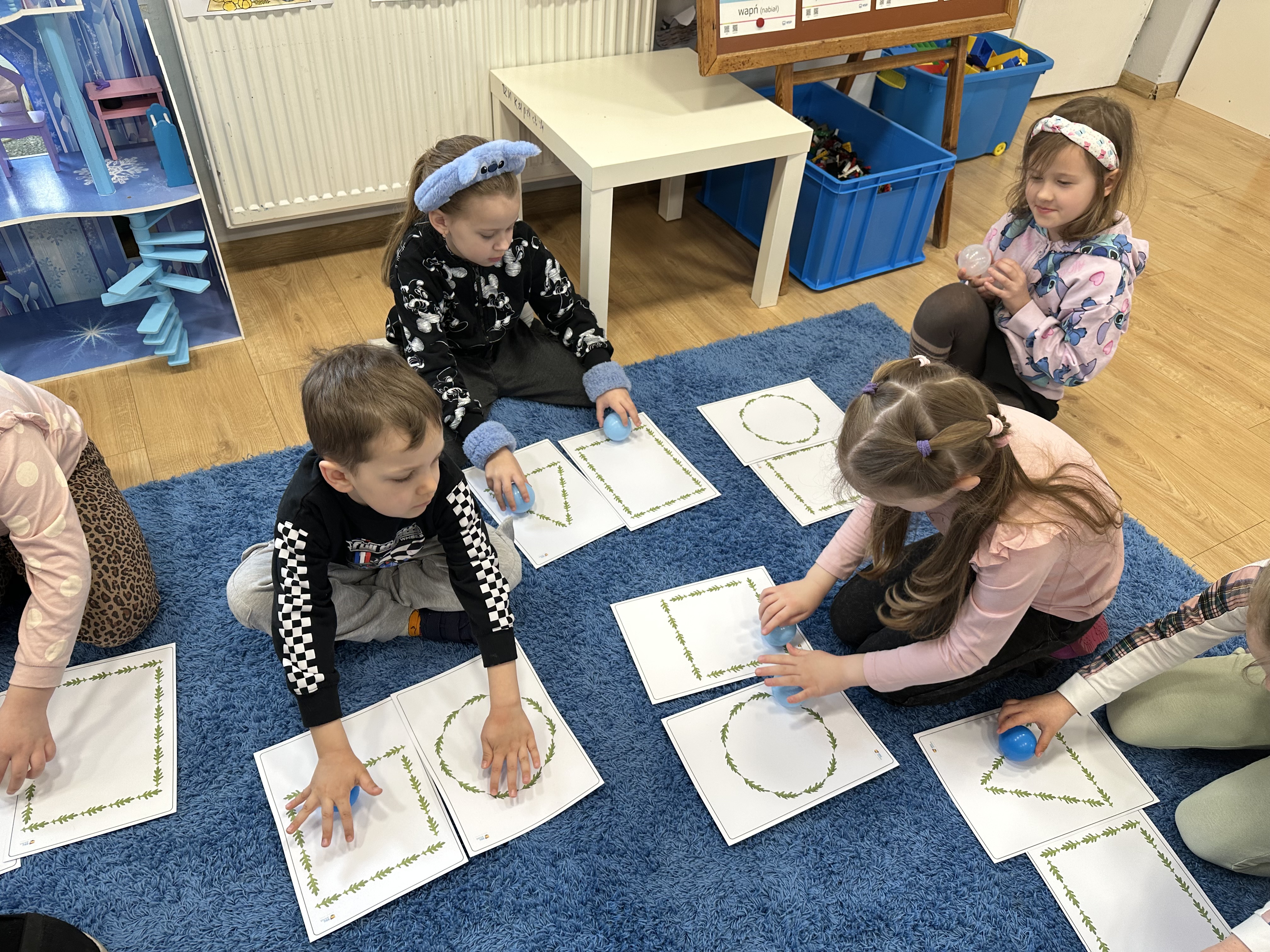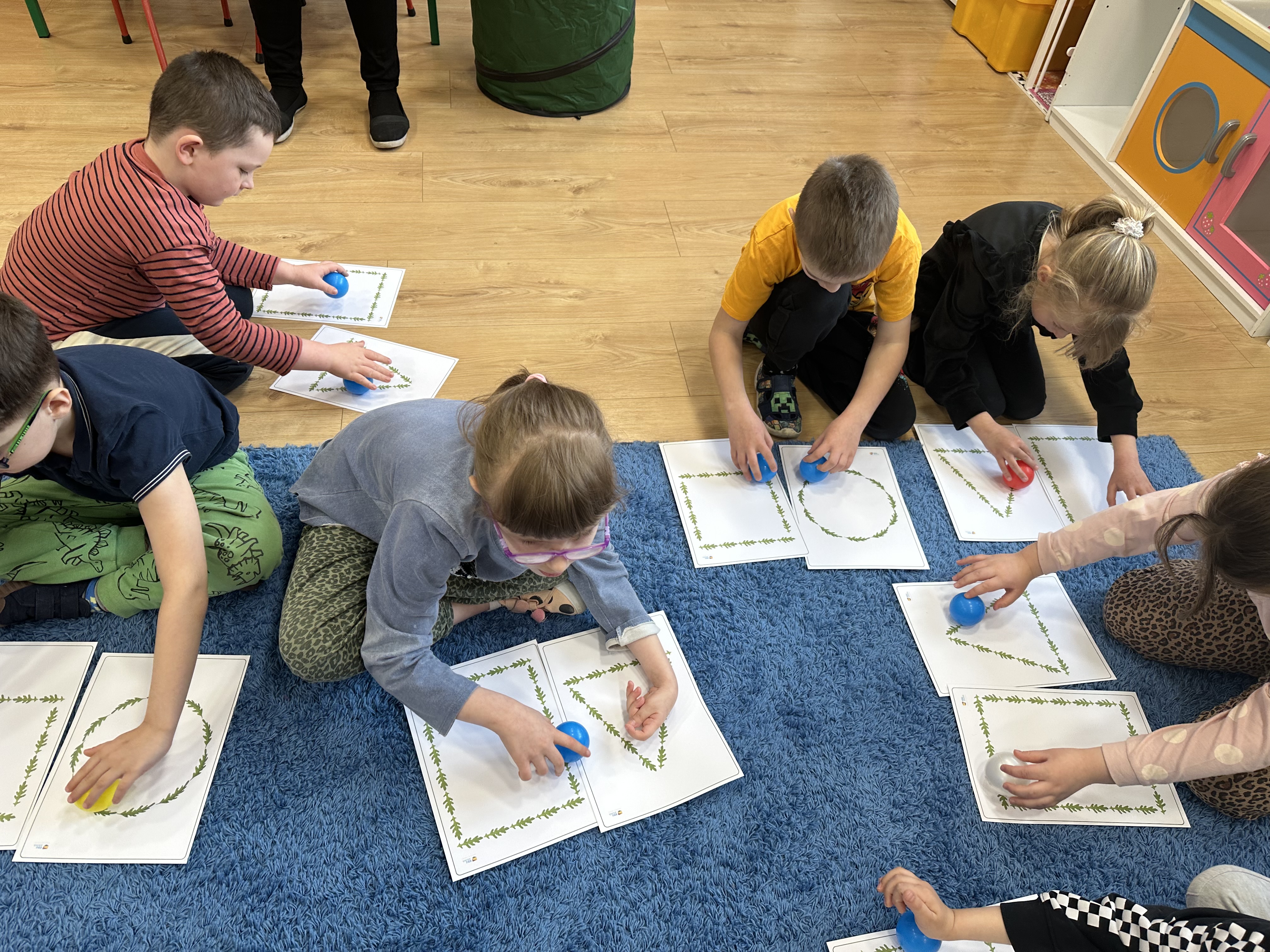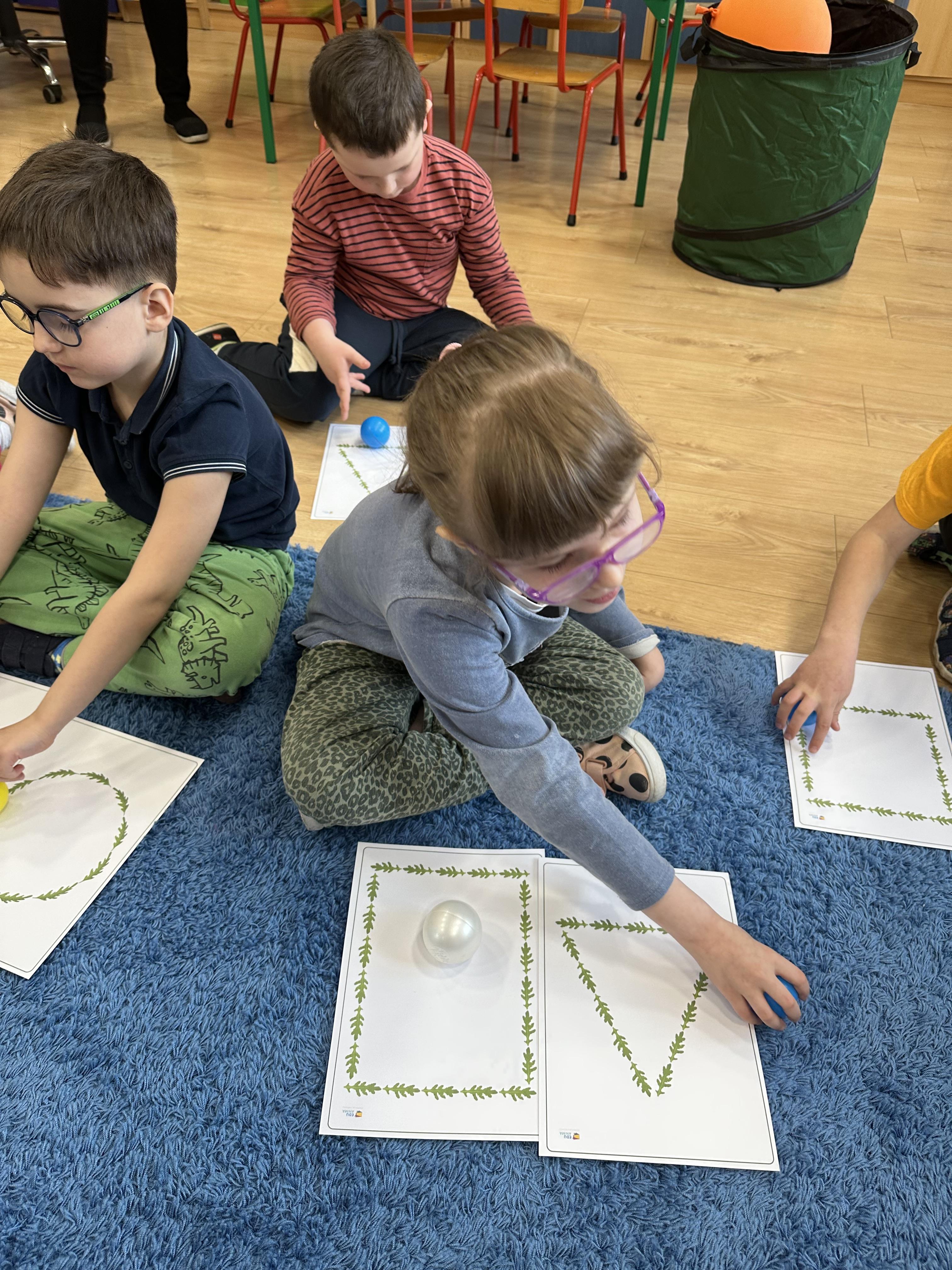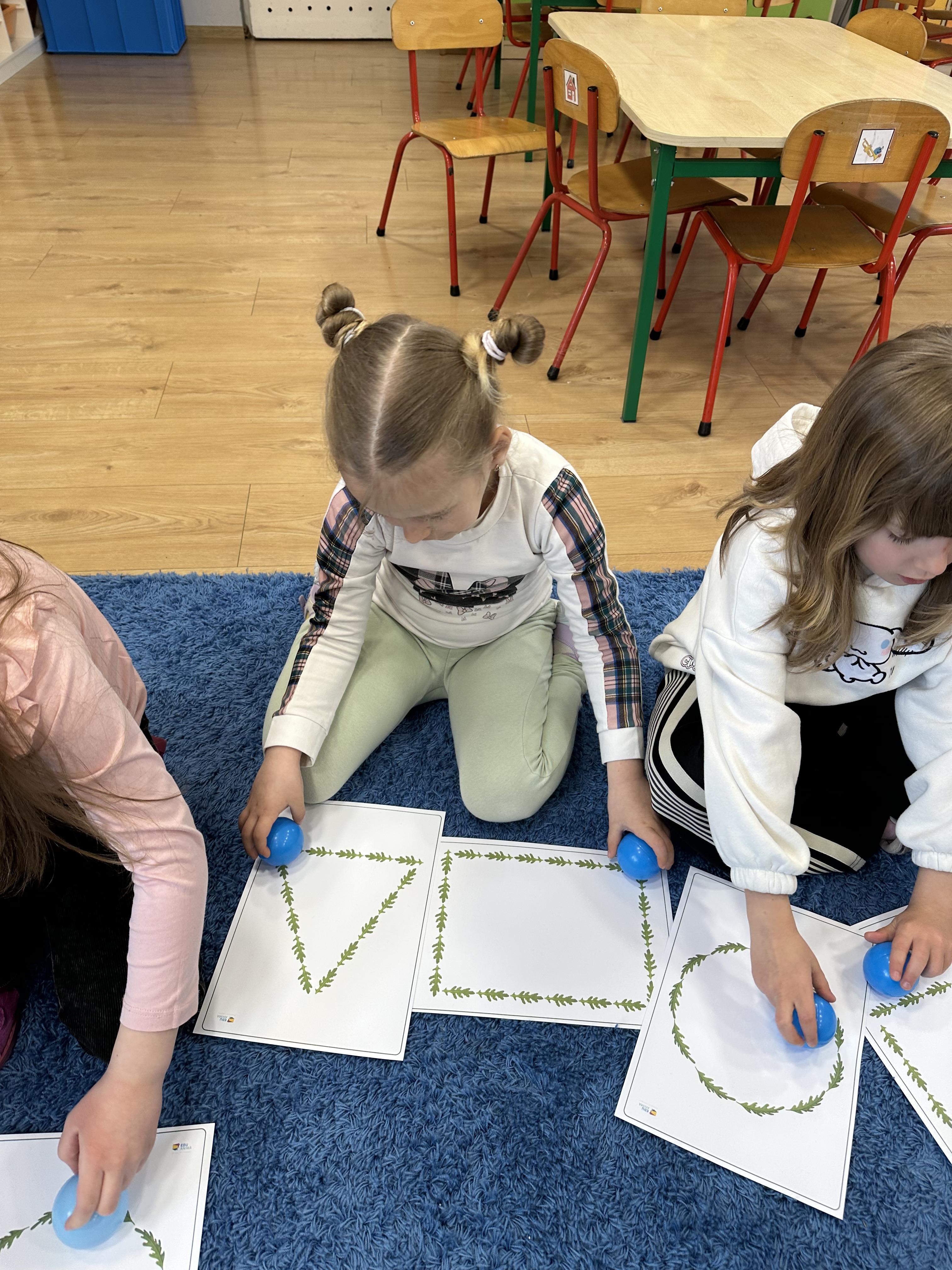 Podczas zajęć nie zabrakło również ćwiczeń rozwijających koordynację ruchową. Dzieci wykonywały zadanie wymagające współpracy obu rąk - jednocześnie toczyły dwie piłeczki po wyznaczonych kształtach figur geometrycznych na planszach.