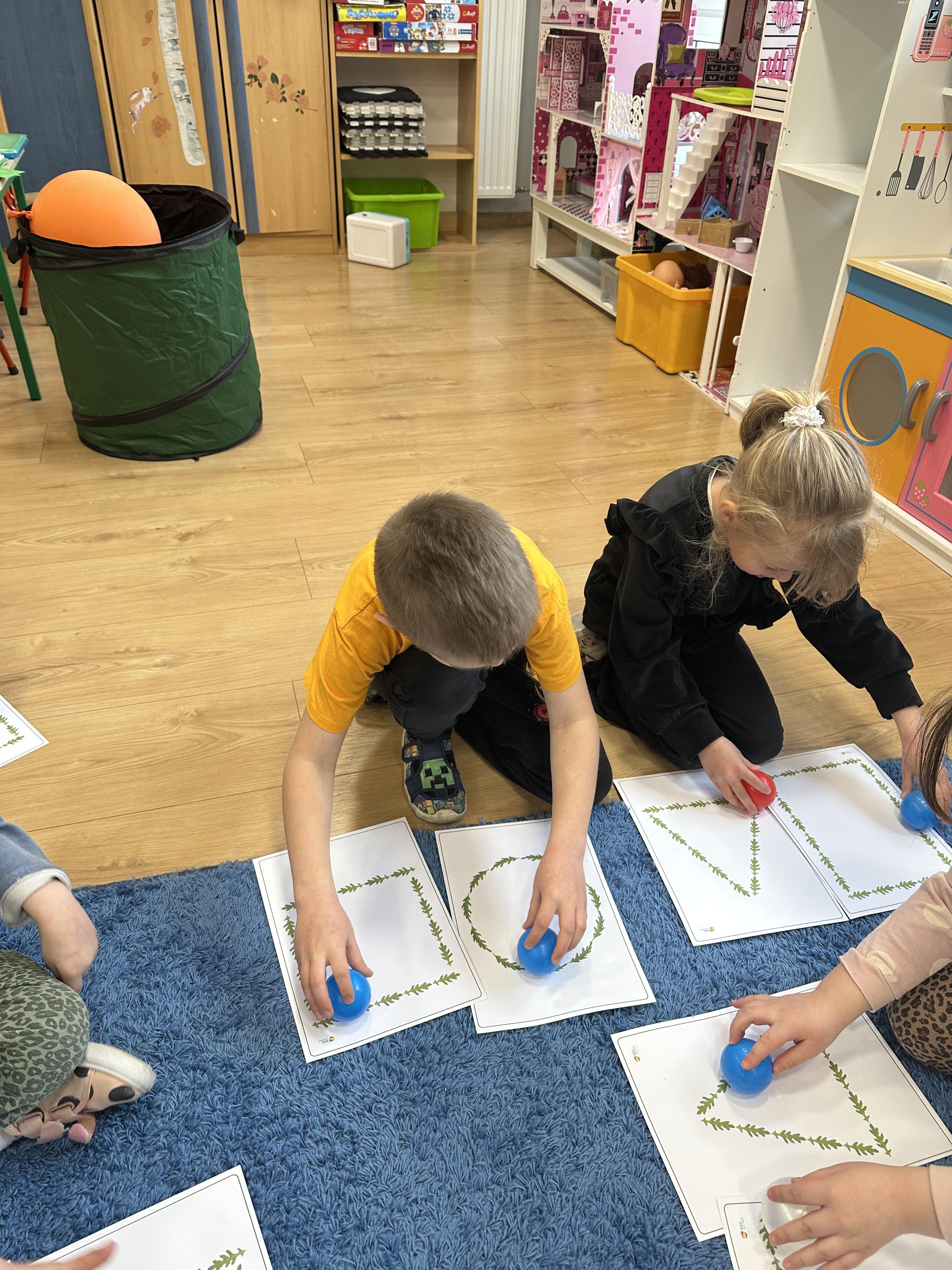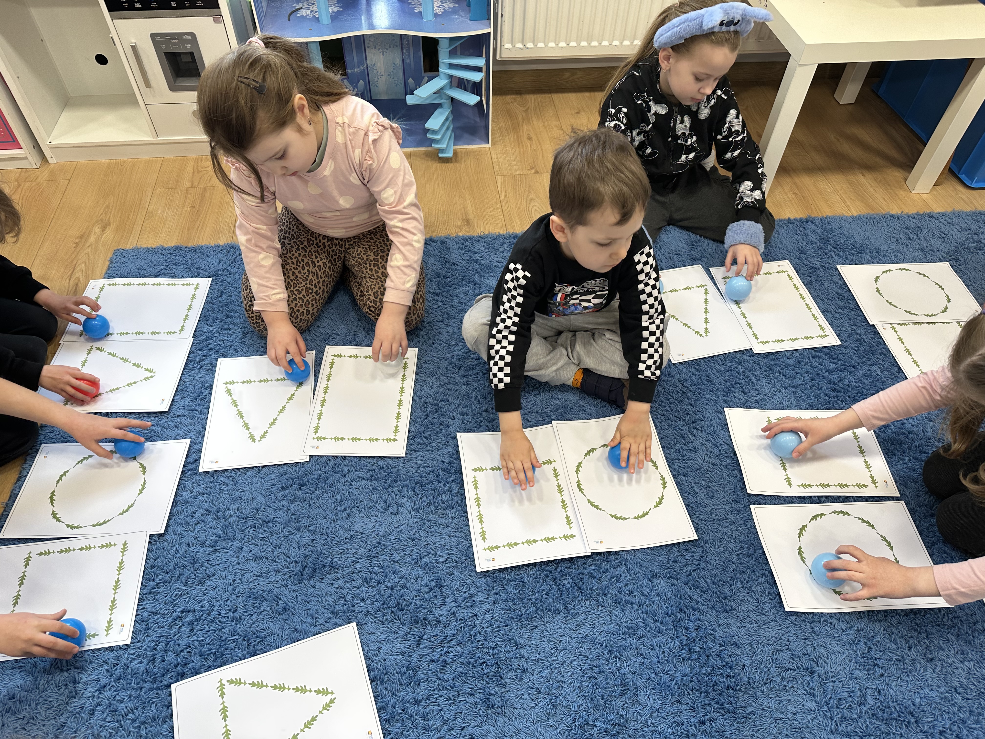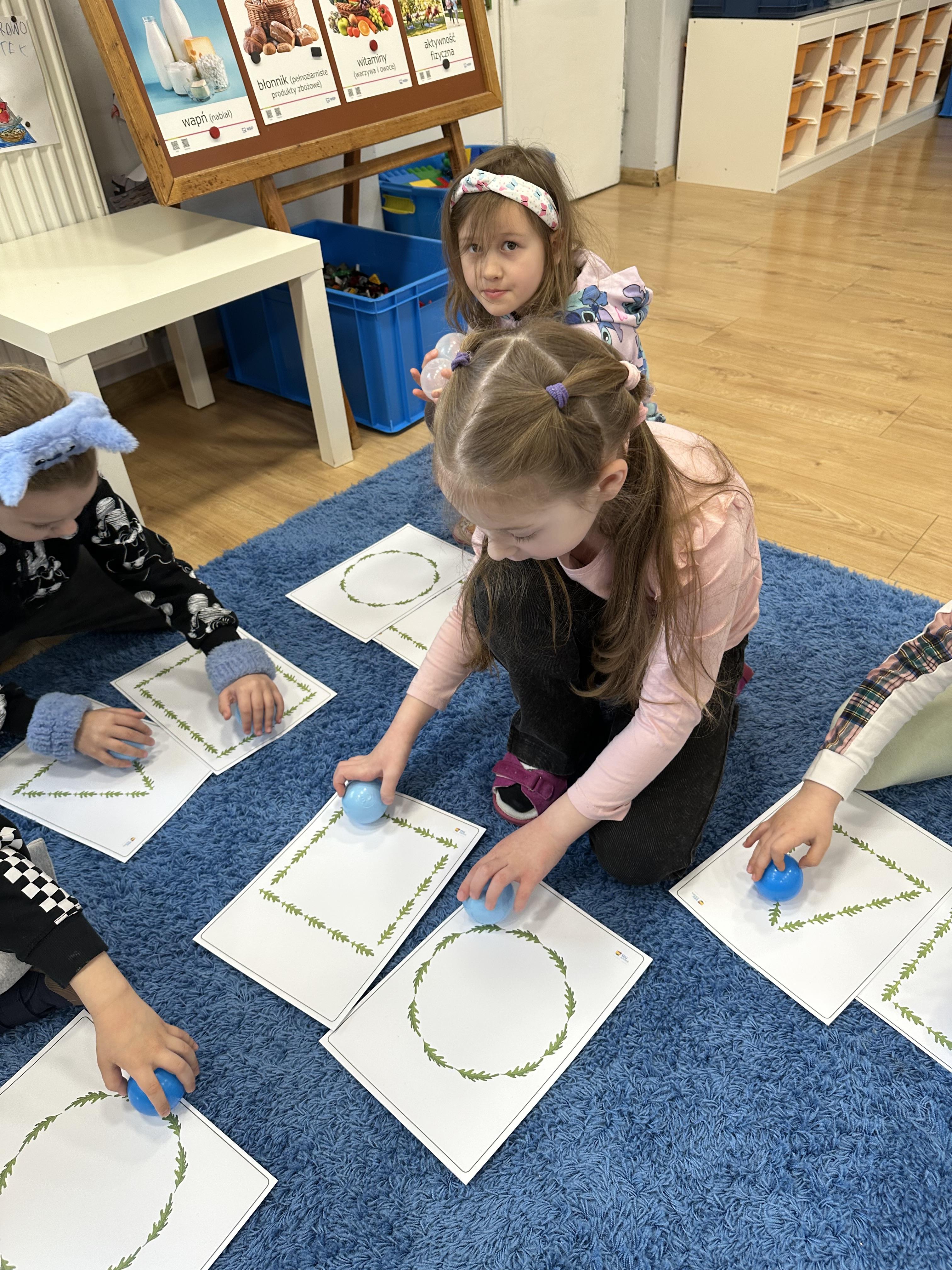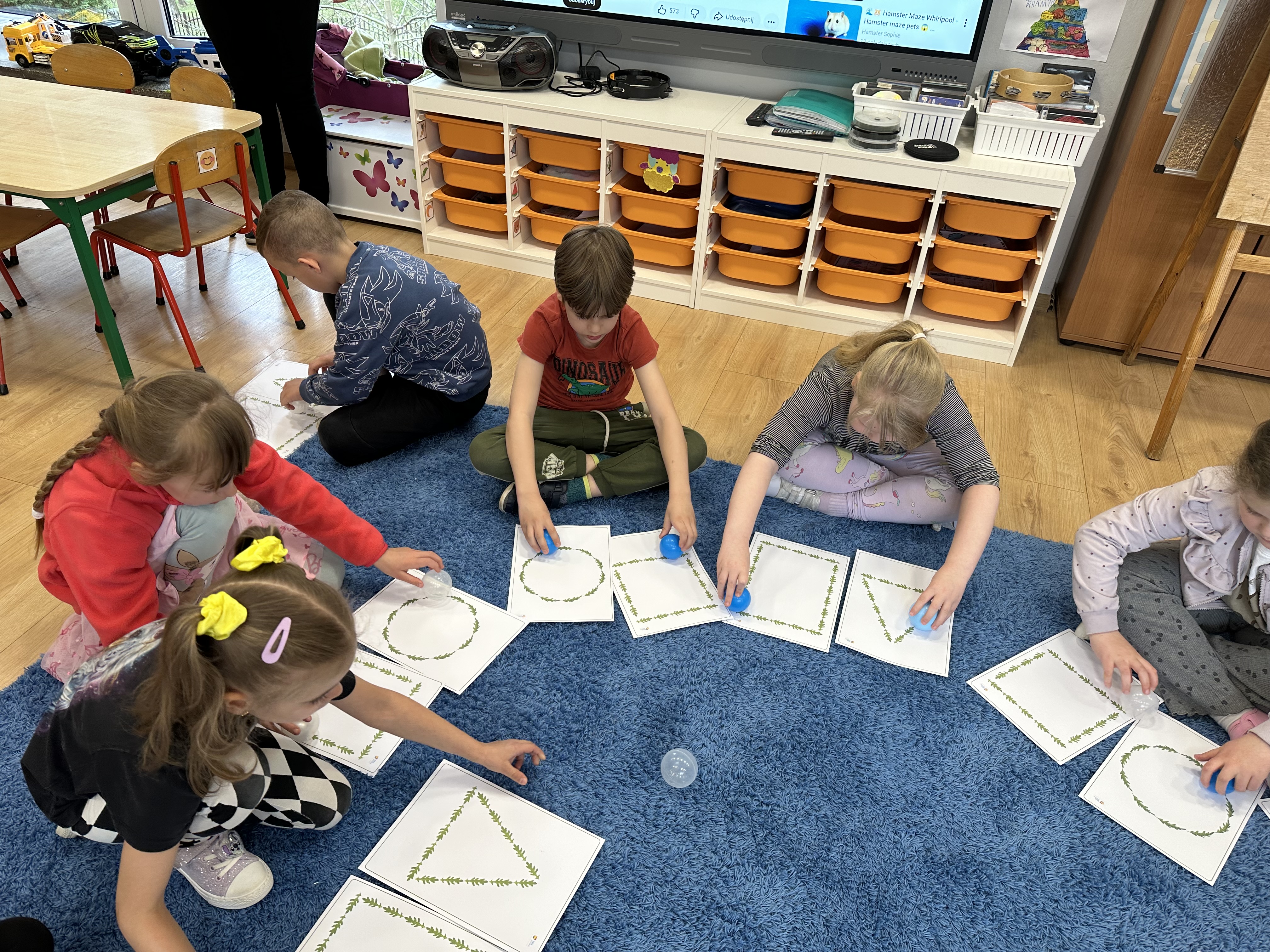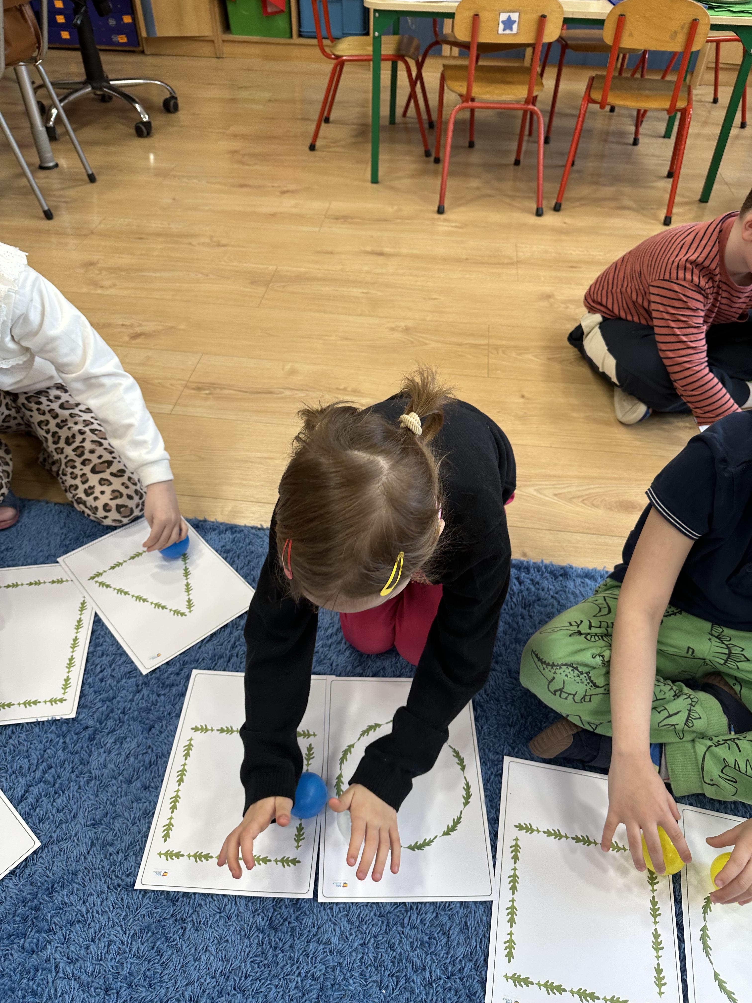 Podczas zajęć nie zabrakło również ćwiczeń rozwijających koordynację ruchową. Dzieci wykonywały zadanie wymagające współpracy obu rąk - jednocześnie toczyły dwie piłeczki po wyznaczonych kształtach figur geometrycznych na planszach.