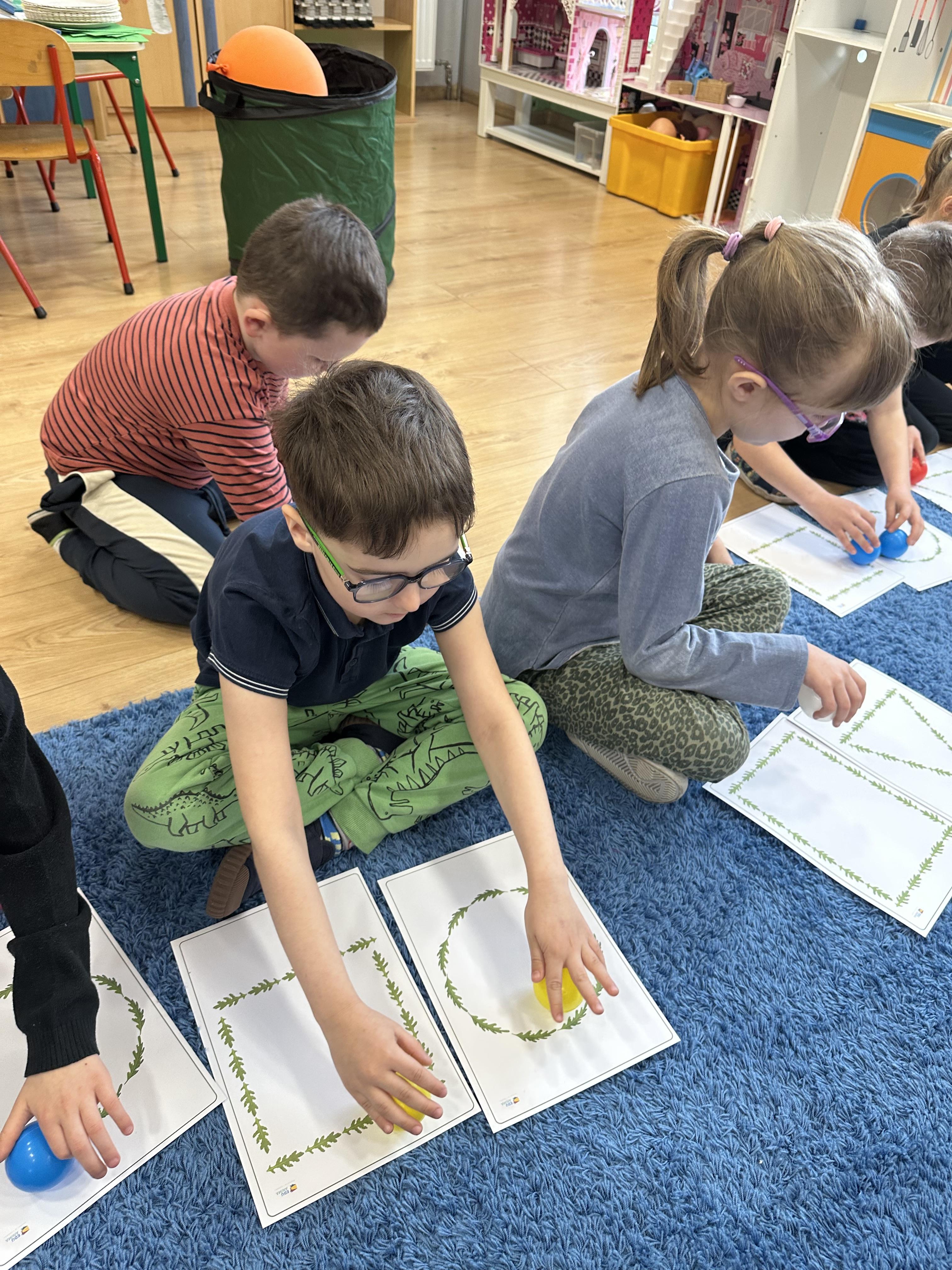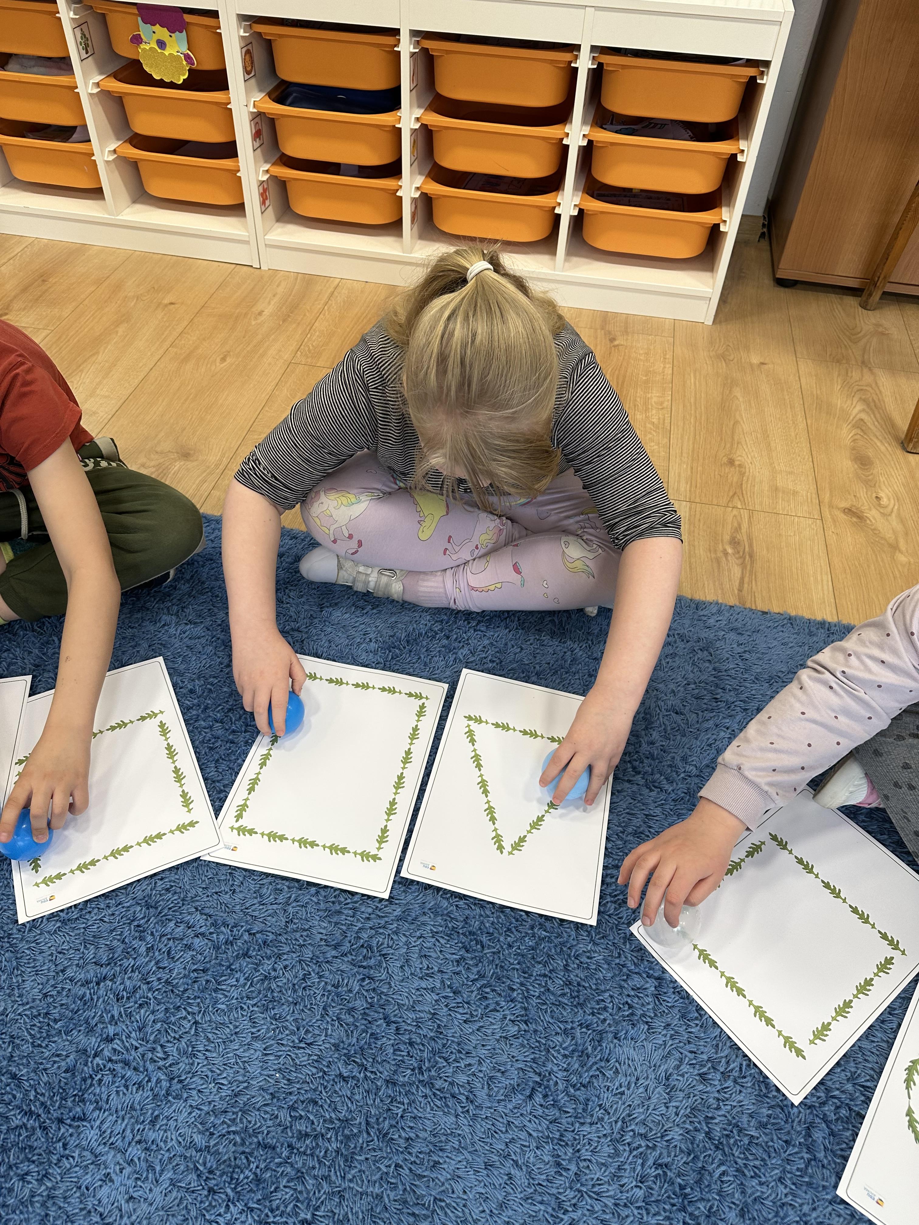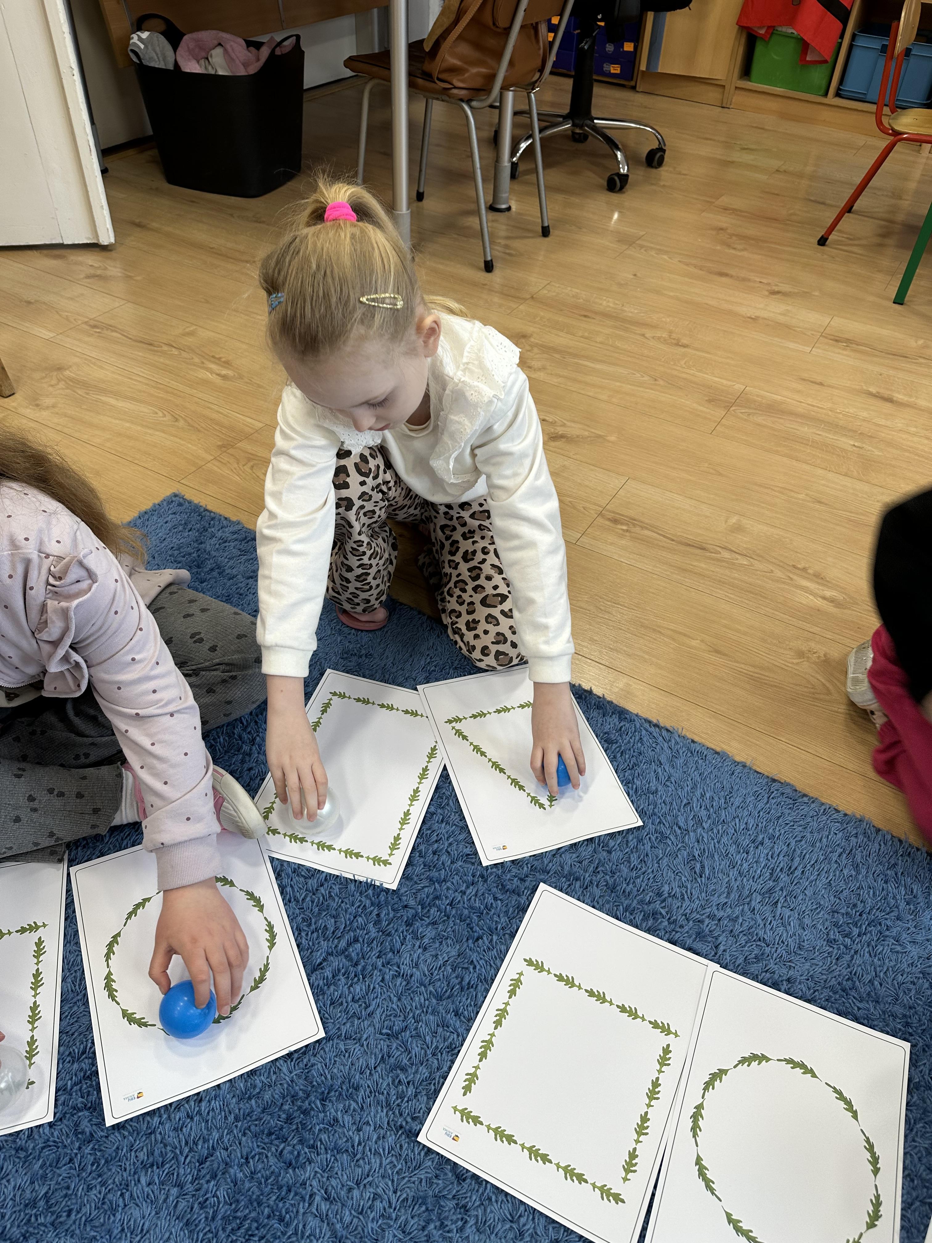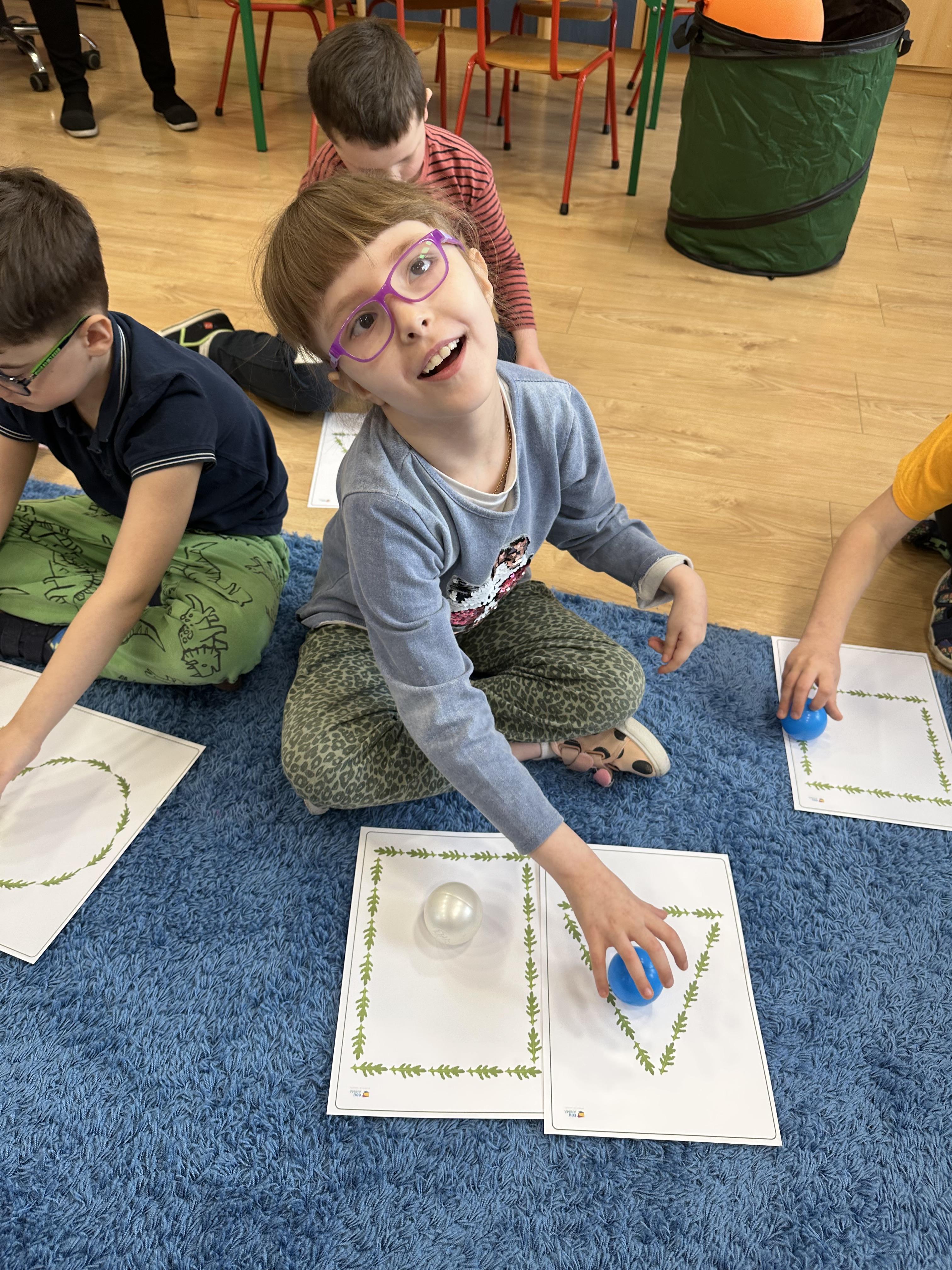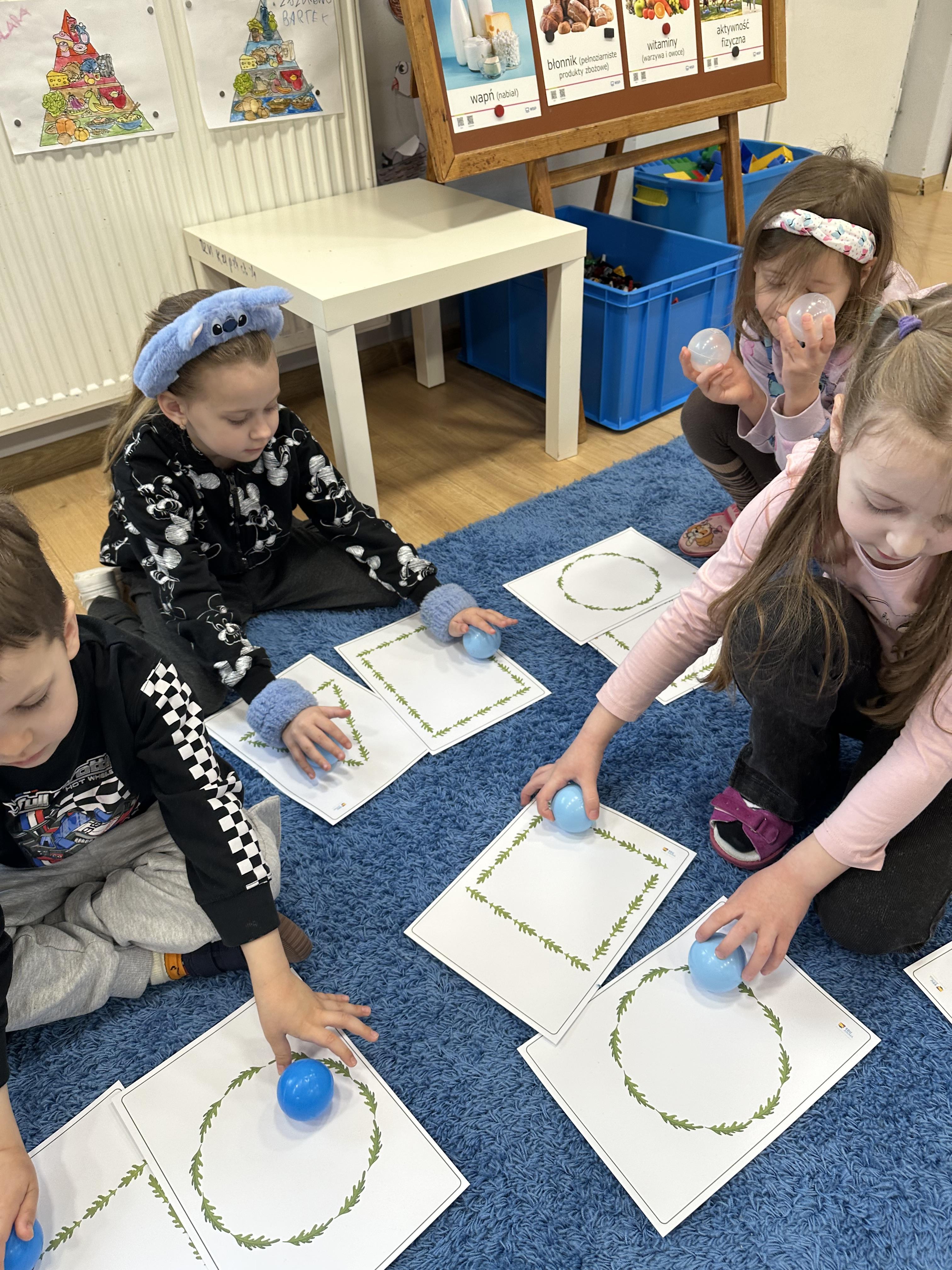 Podczas zajęć nie zabrakło również ćwiczeń rozwijających koordynację ruchową. Dzieci wykonywały zadanie wymagające współpracy obu rąk - jednocześnie toczyły dwie piłeczki po wyznaczonych kształtach figur geometrycznych na planszach.