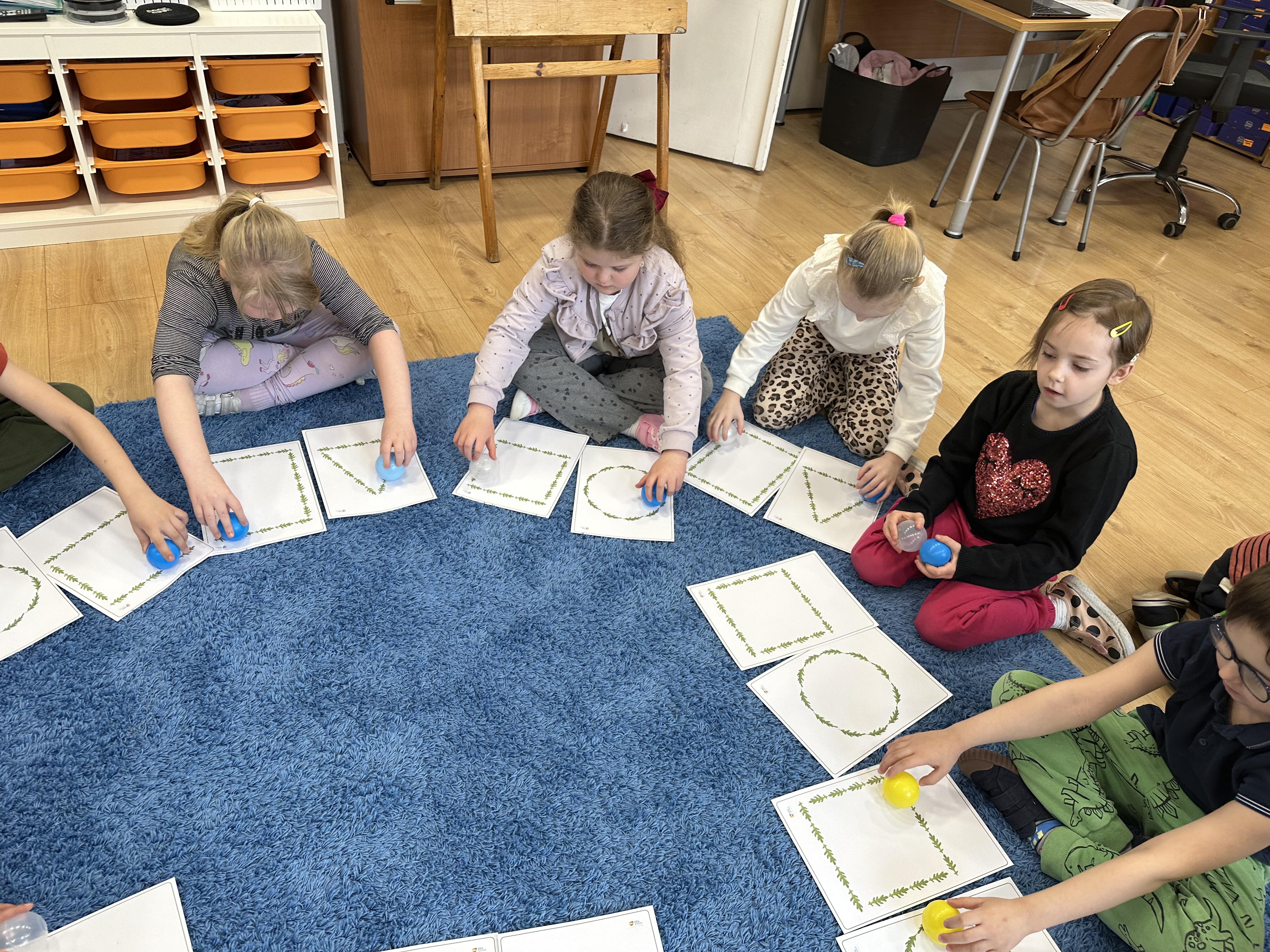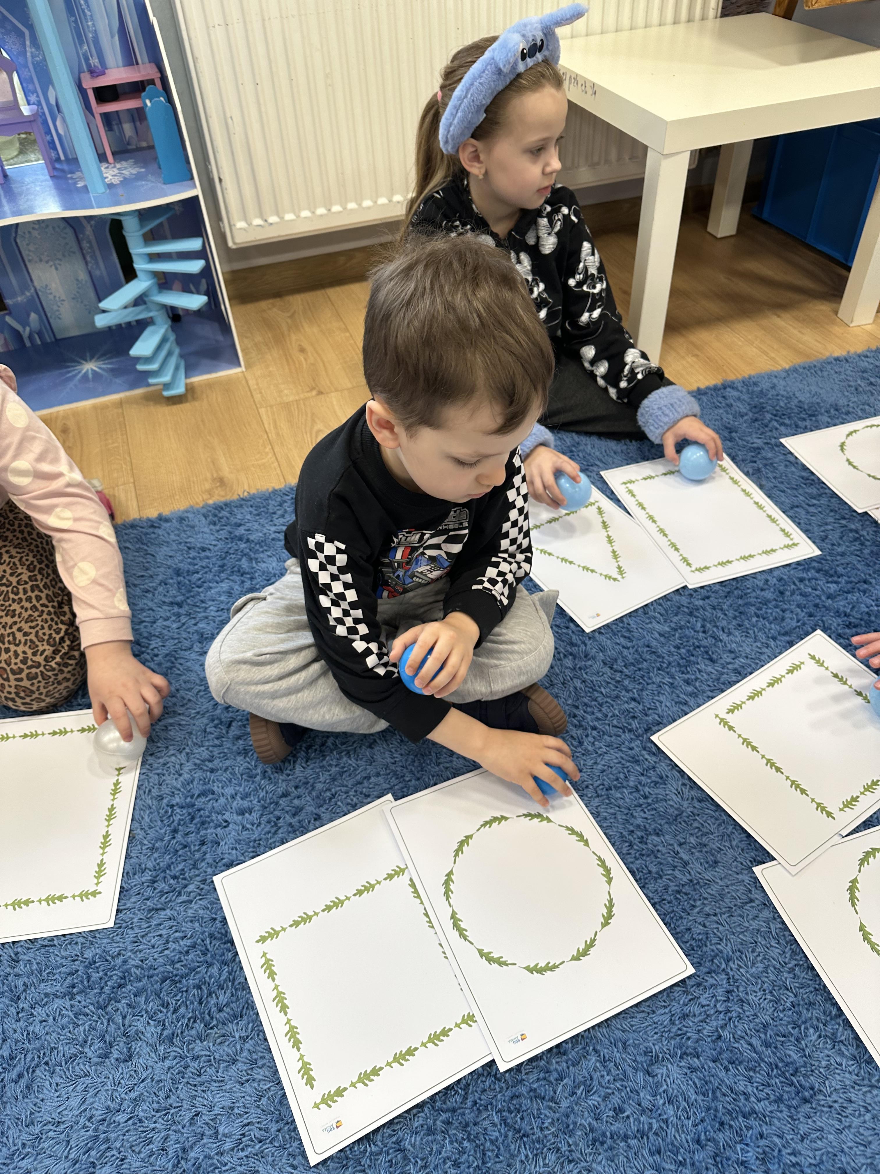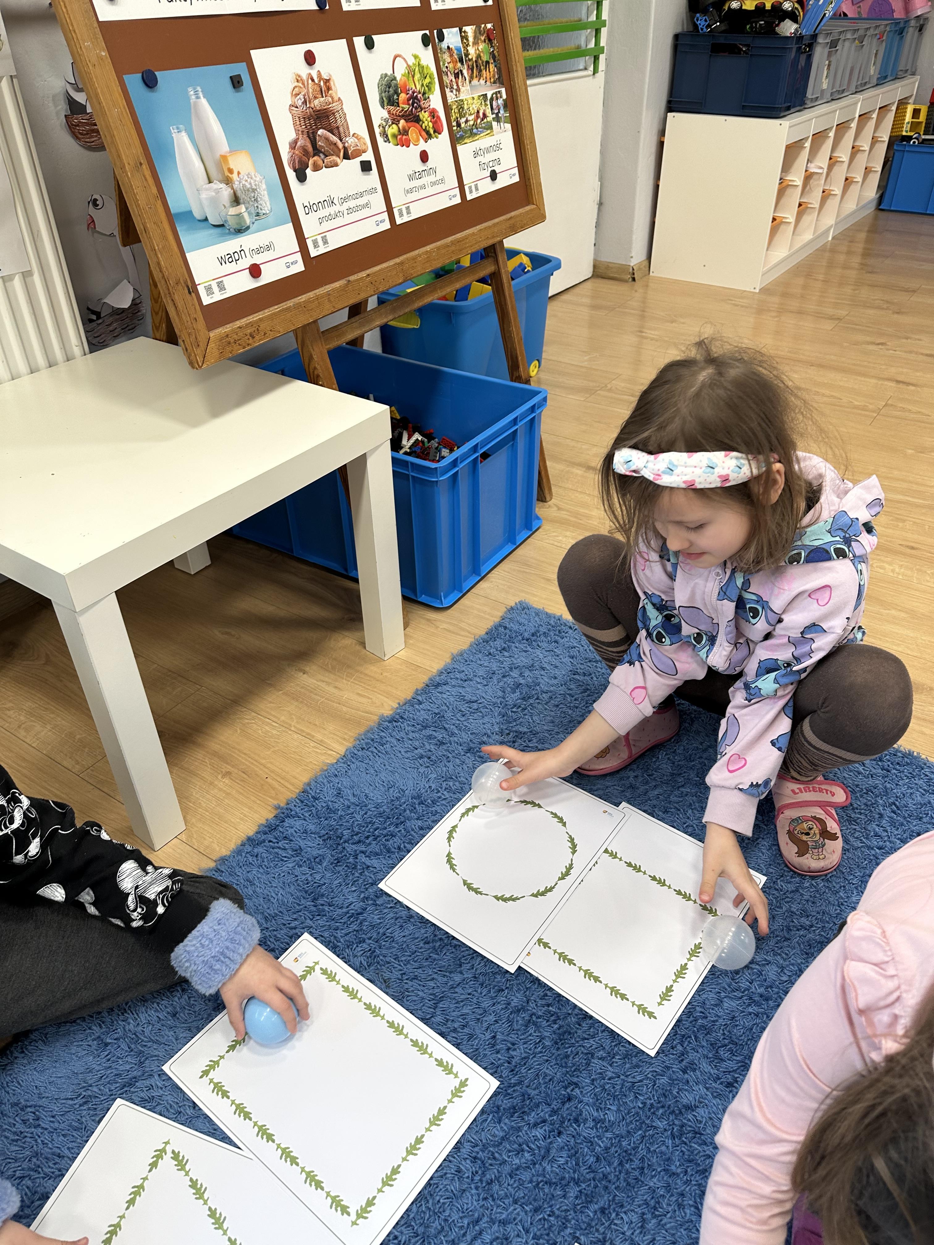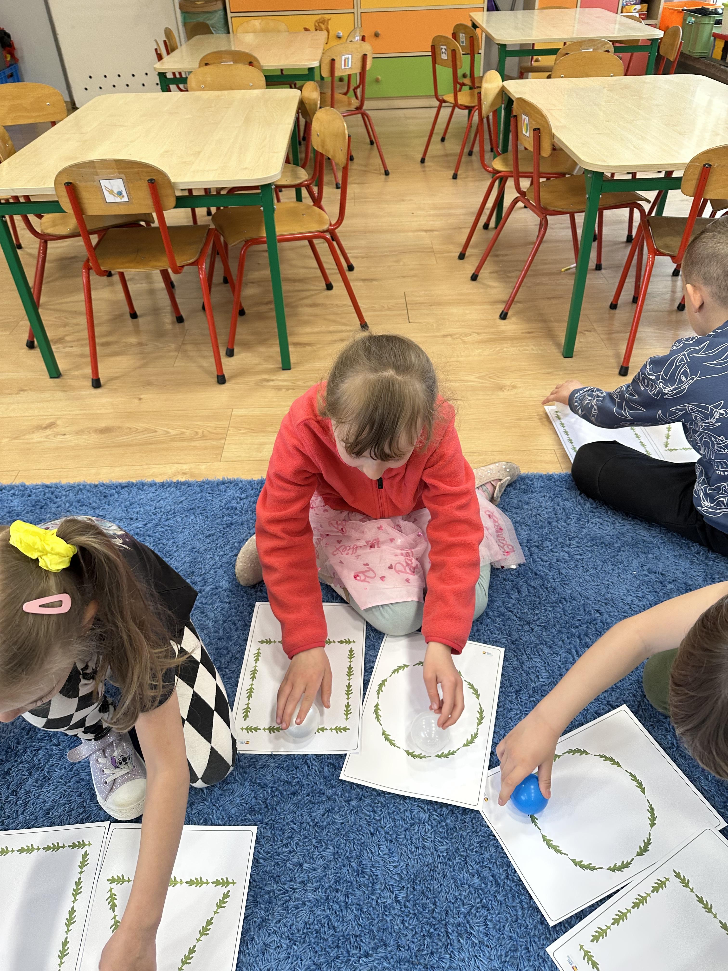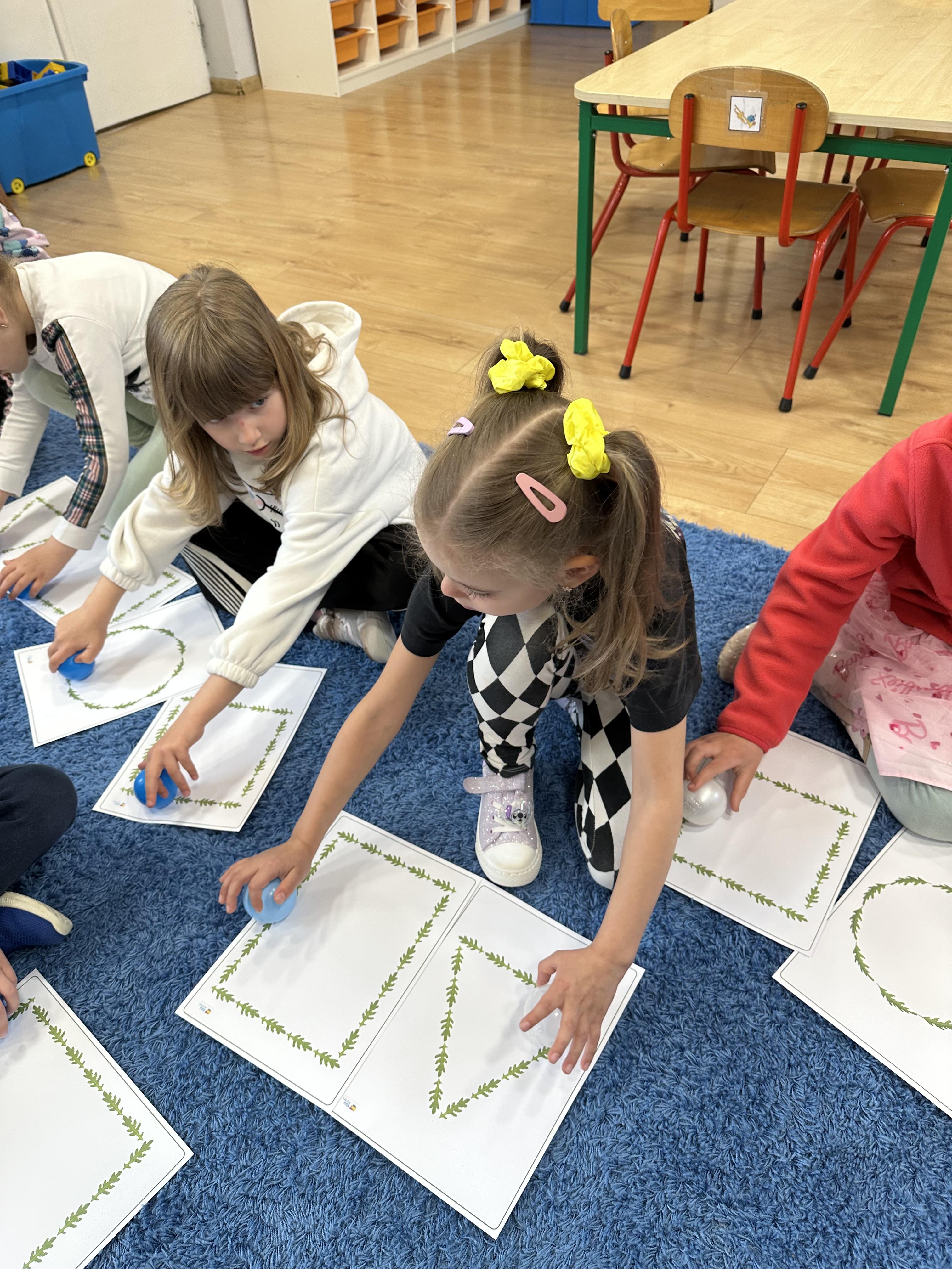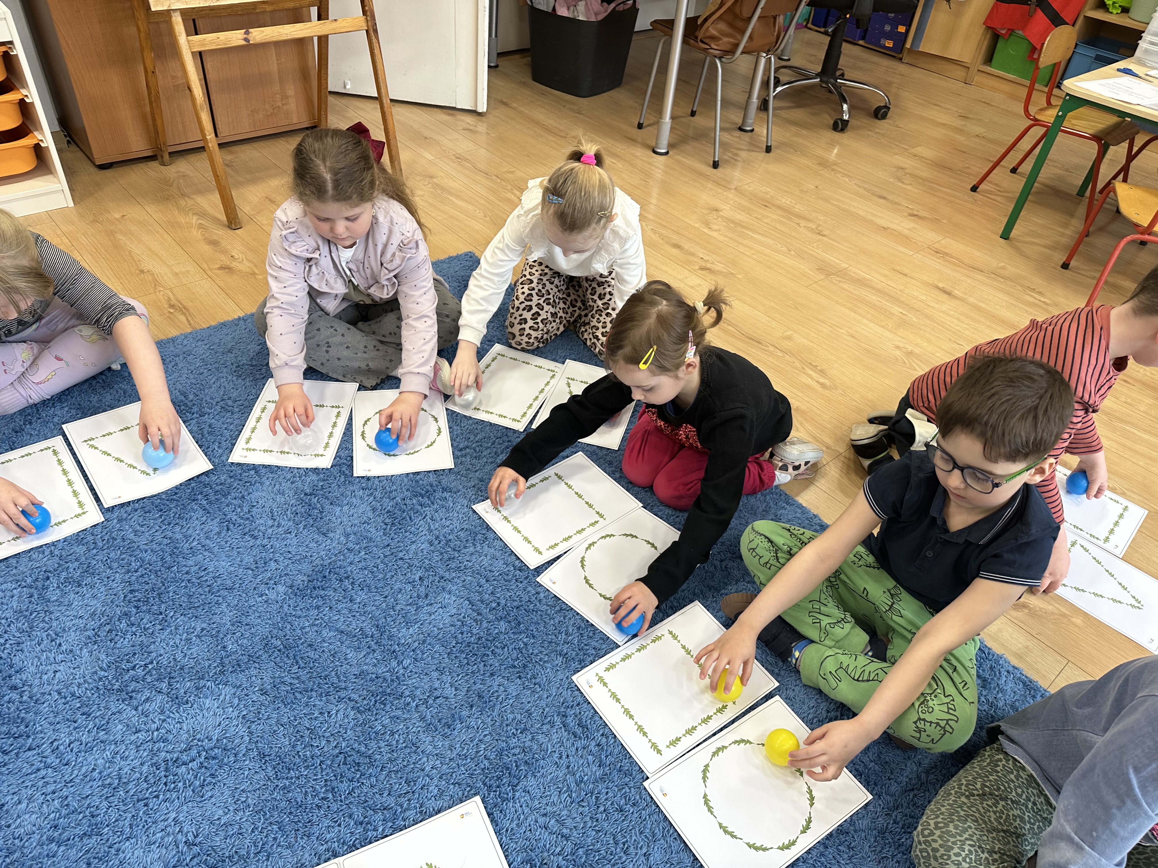Podczas zajęć nie zabrakło również ćwiczeń rozwijających koordynację ruchową. Dzieci wykonywały zadanie wymagające współpracy obu rąk - jednocześnie toczyły dwie piłeczki po wyznaczonych kształtach figur geometrycznych na planszach.