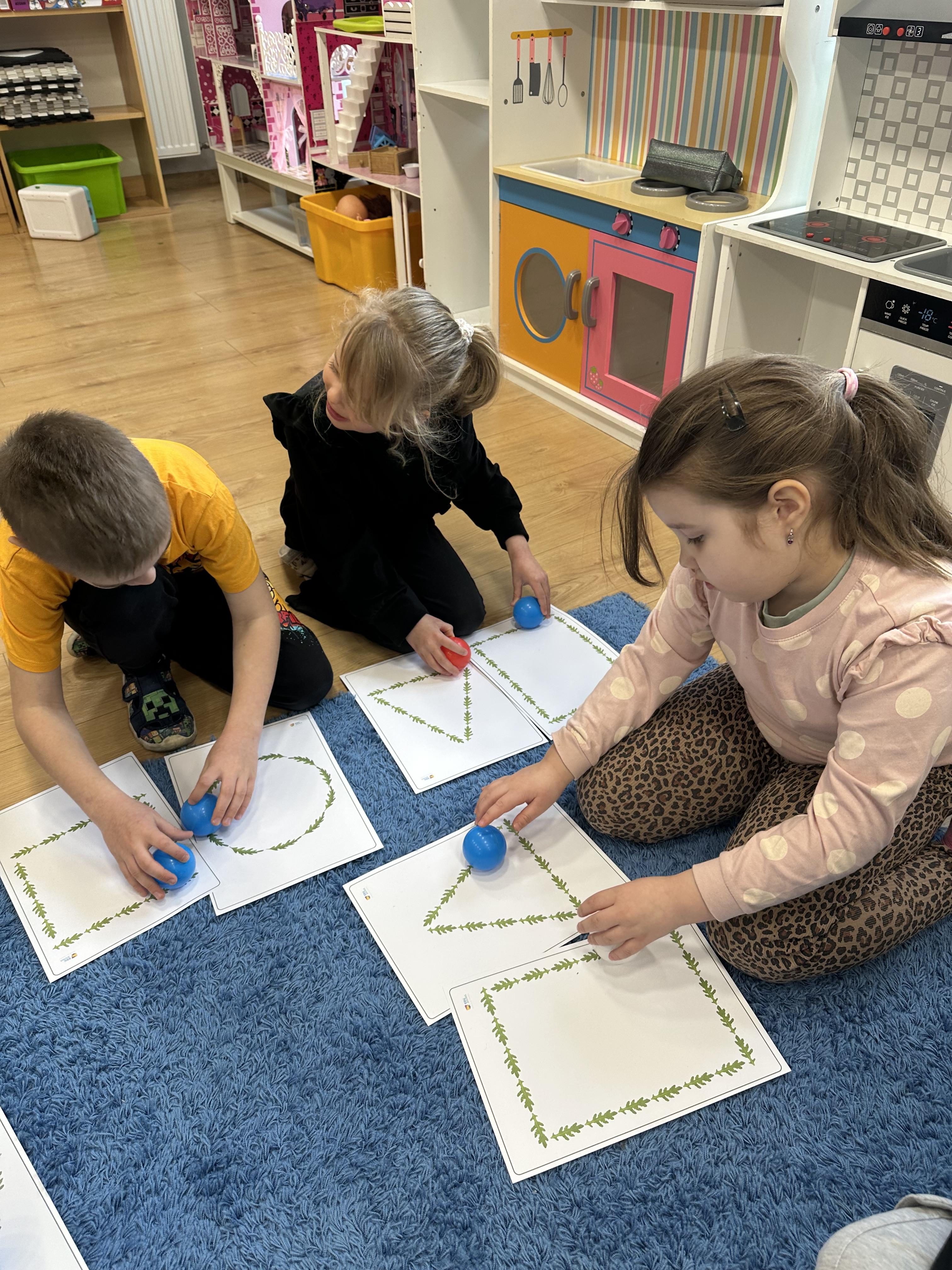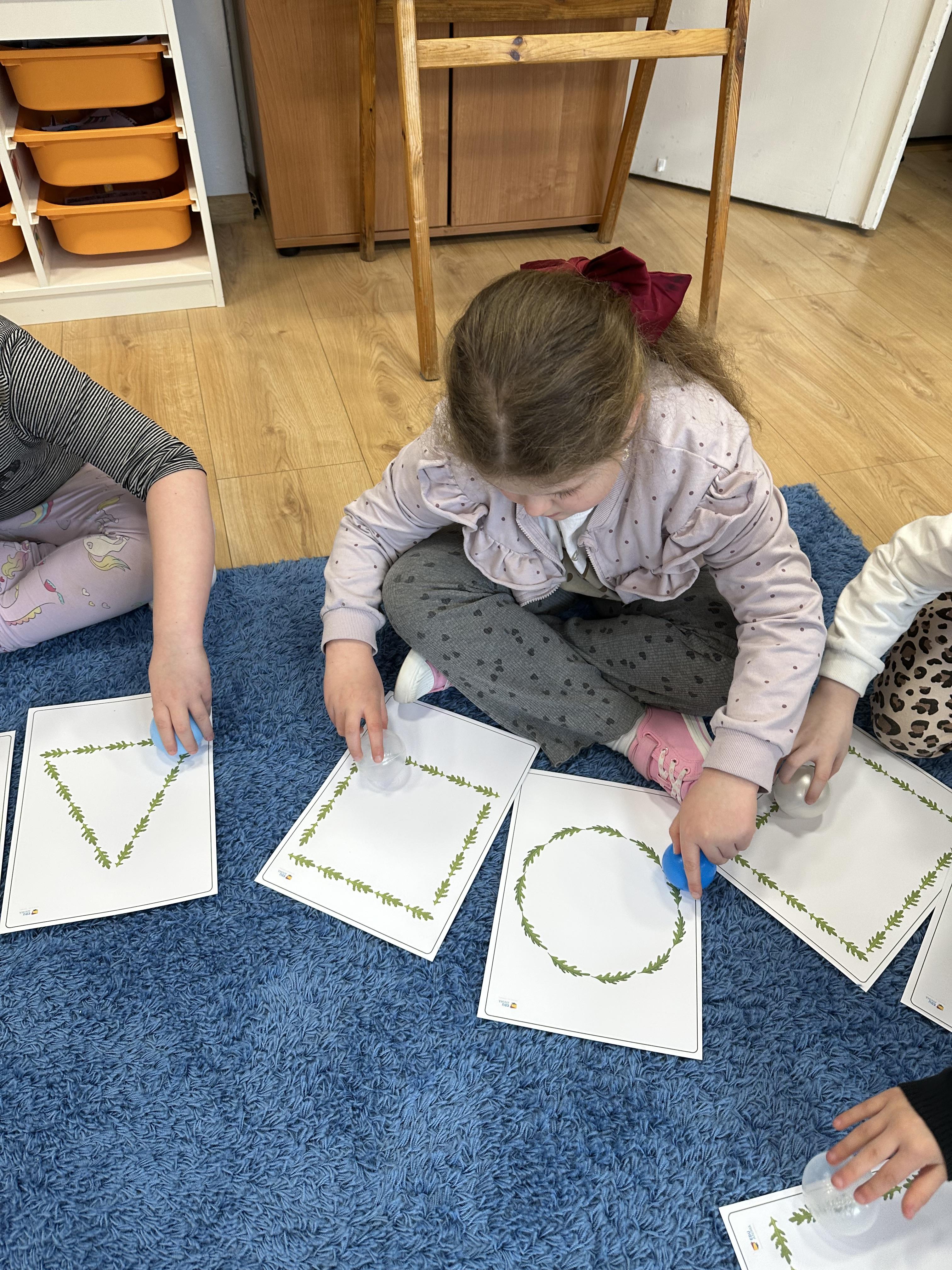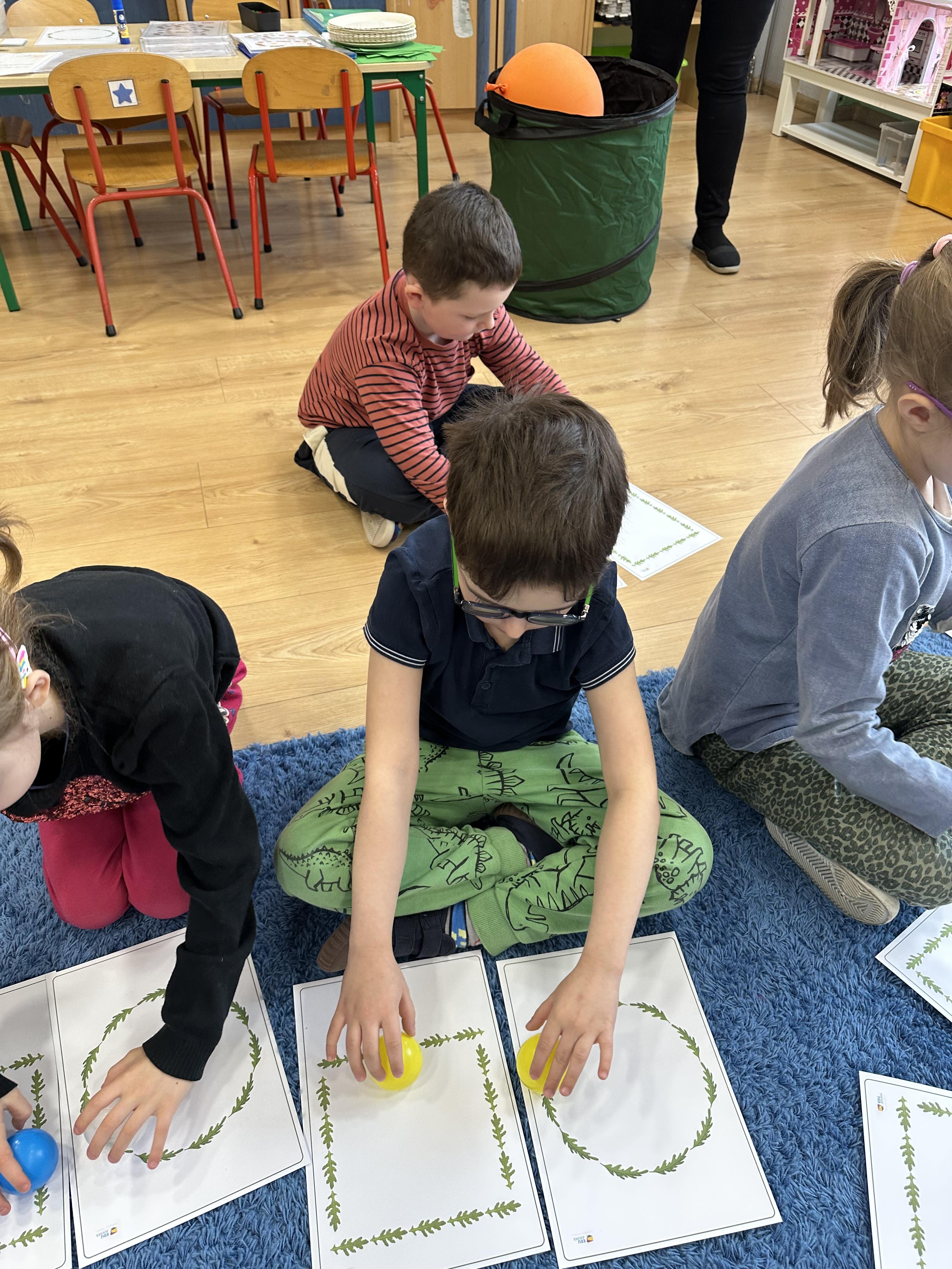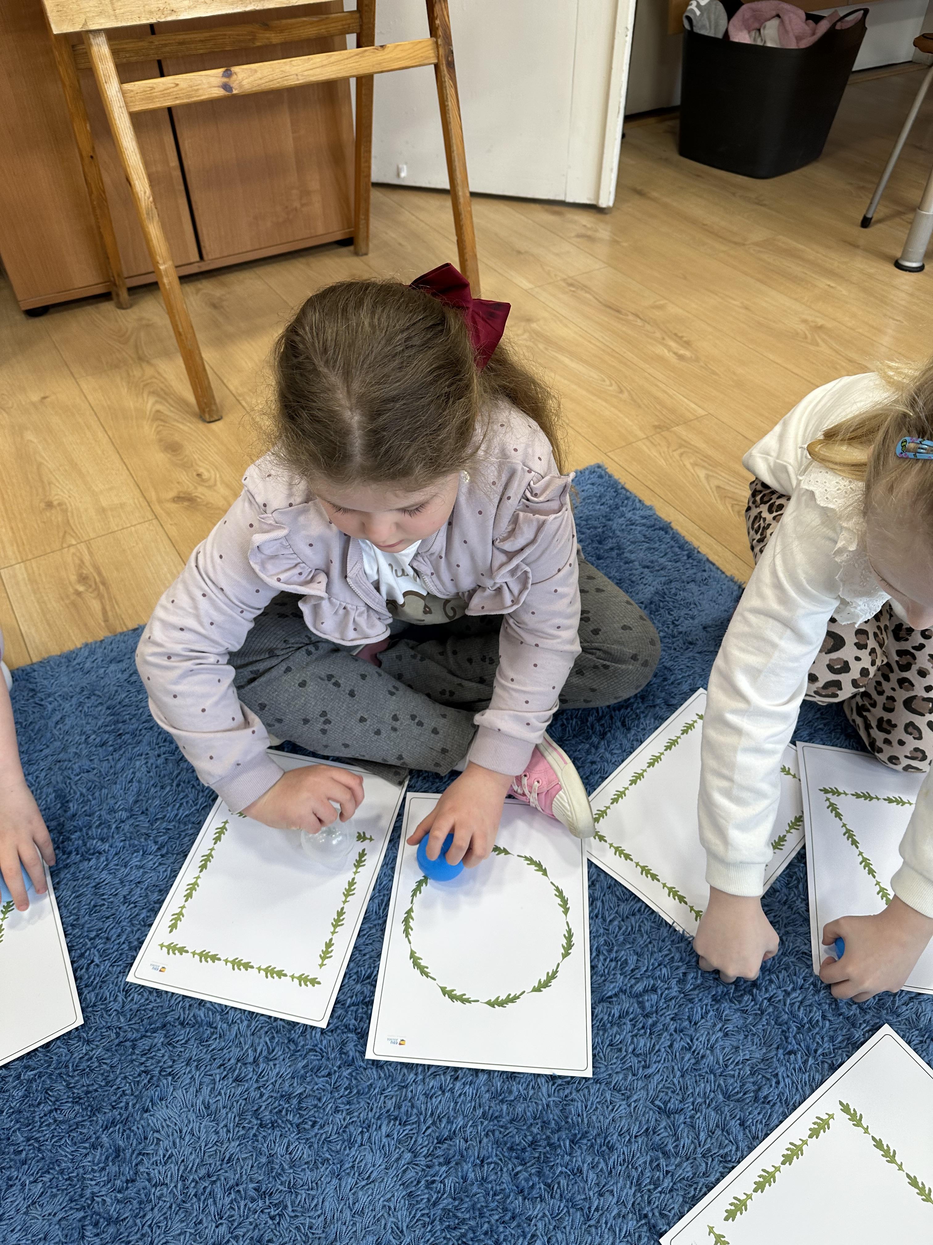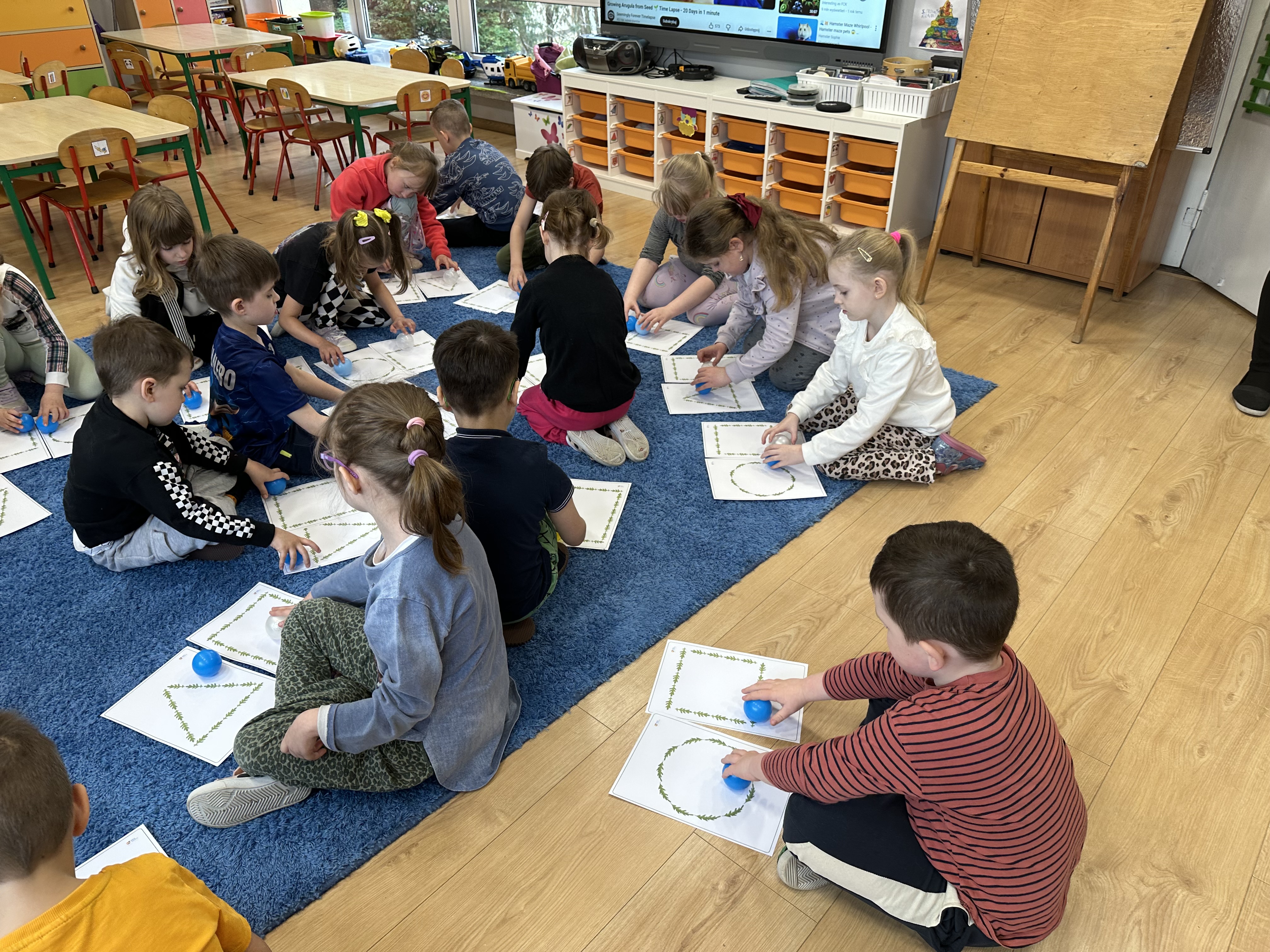 Podczas zajęć nie zabrakło również ćwiczeń rozwijających koordynację ruchową. Dzieci wykonywały zadanie wymagające współpracy obu rąk - jednocześnie toczyły dwie piłeczki po wyznaczonych kształtach figur geometrycznych na planszach.