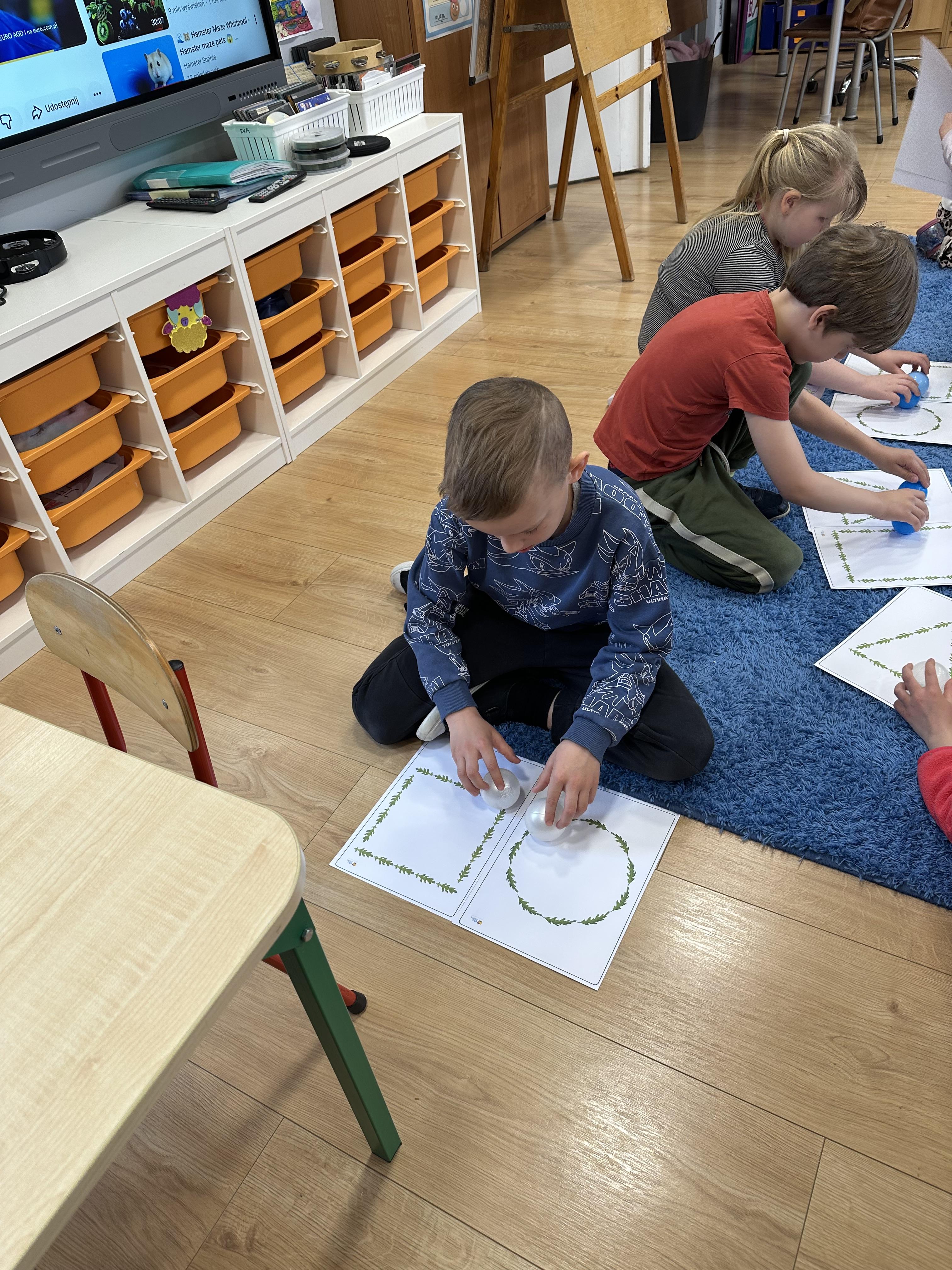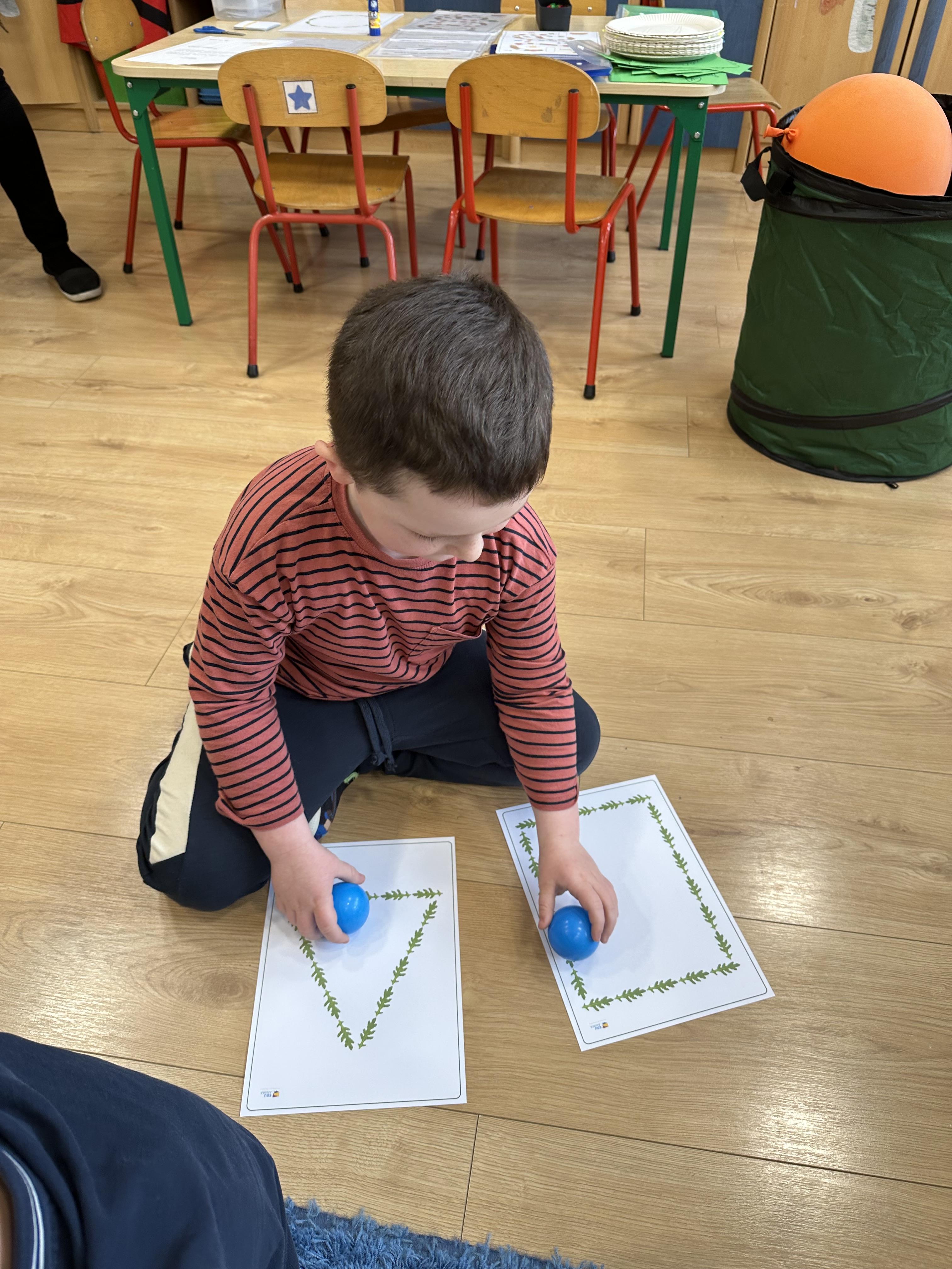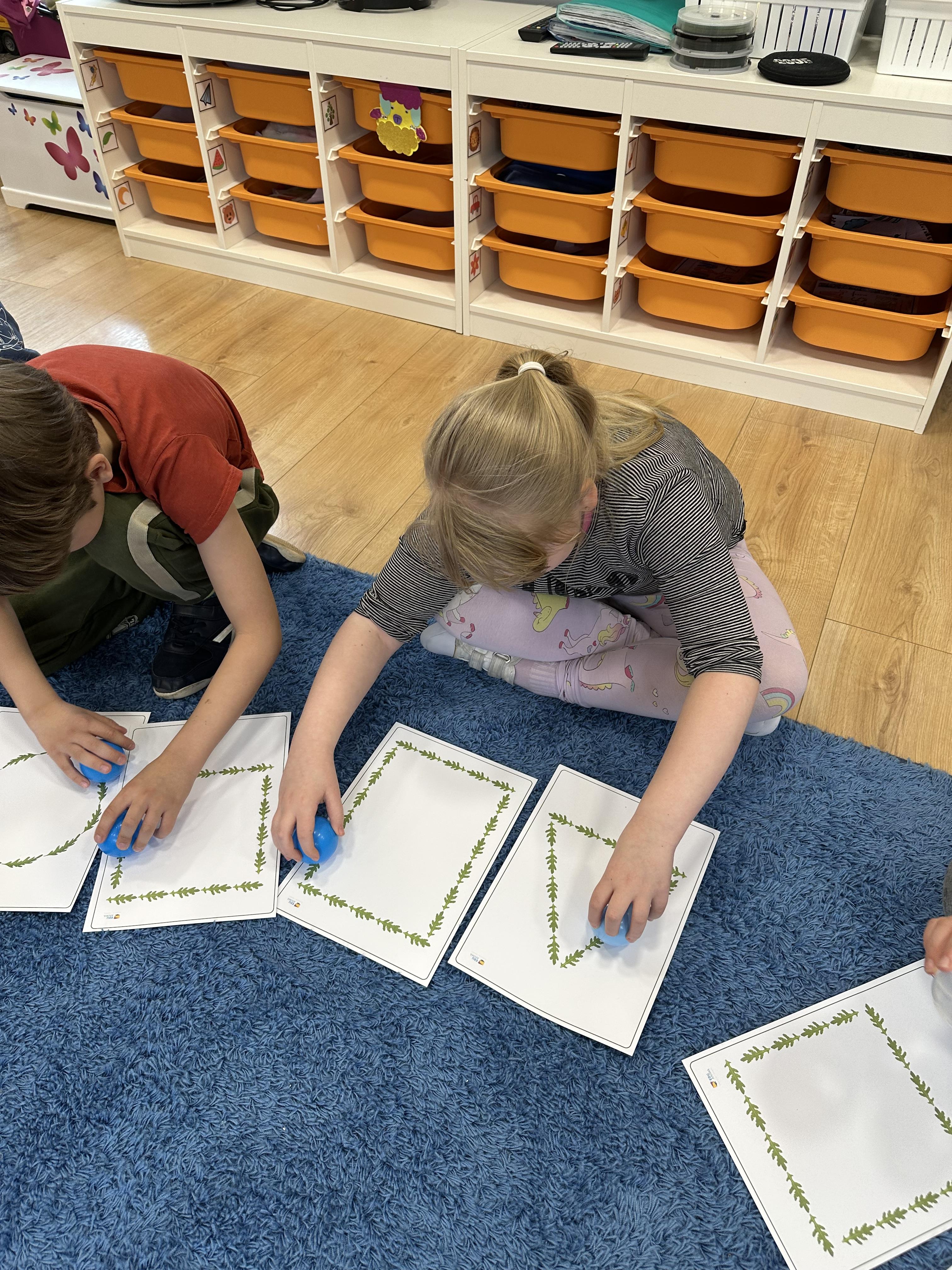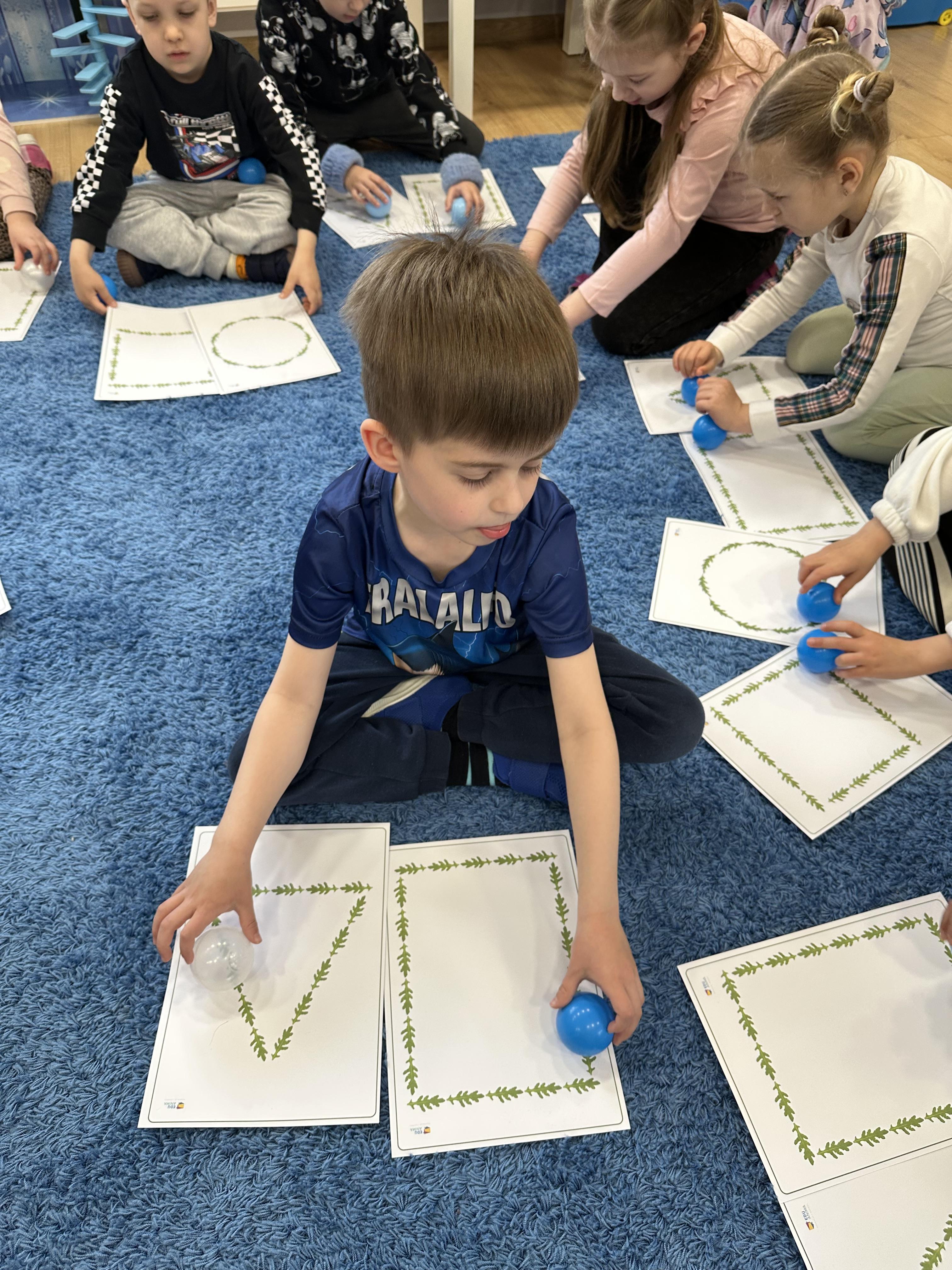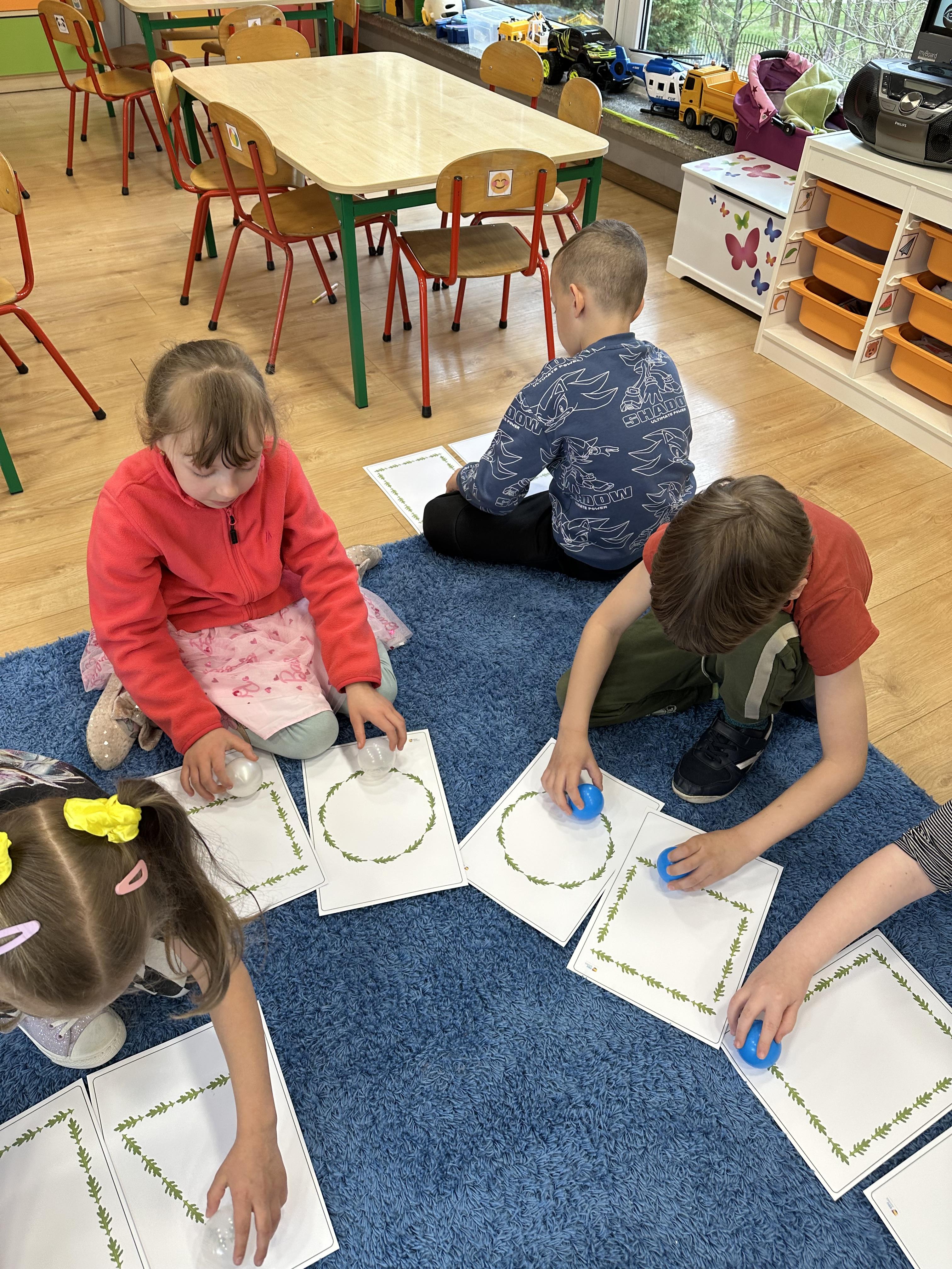 Podczas zajęć nie zabrakło również ćwiczeń rozwijających koordynację ruchową. Dzieci wykonywały zadanie wymagające współpracy obu rąk - jednocześnie toczyły dwie piłeczki po wyznaczonych kształtach figur geometrycznych na planszach.