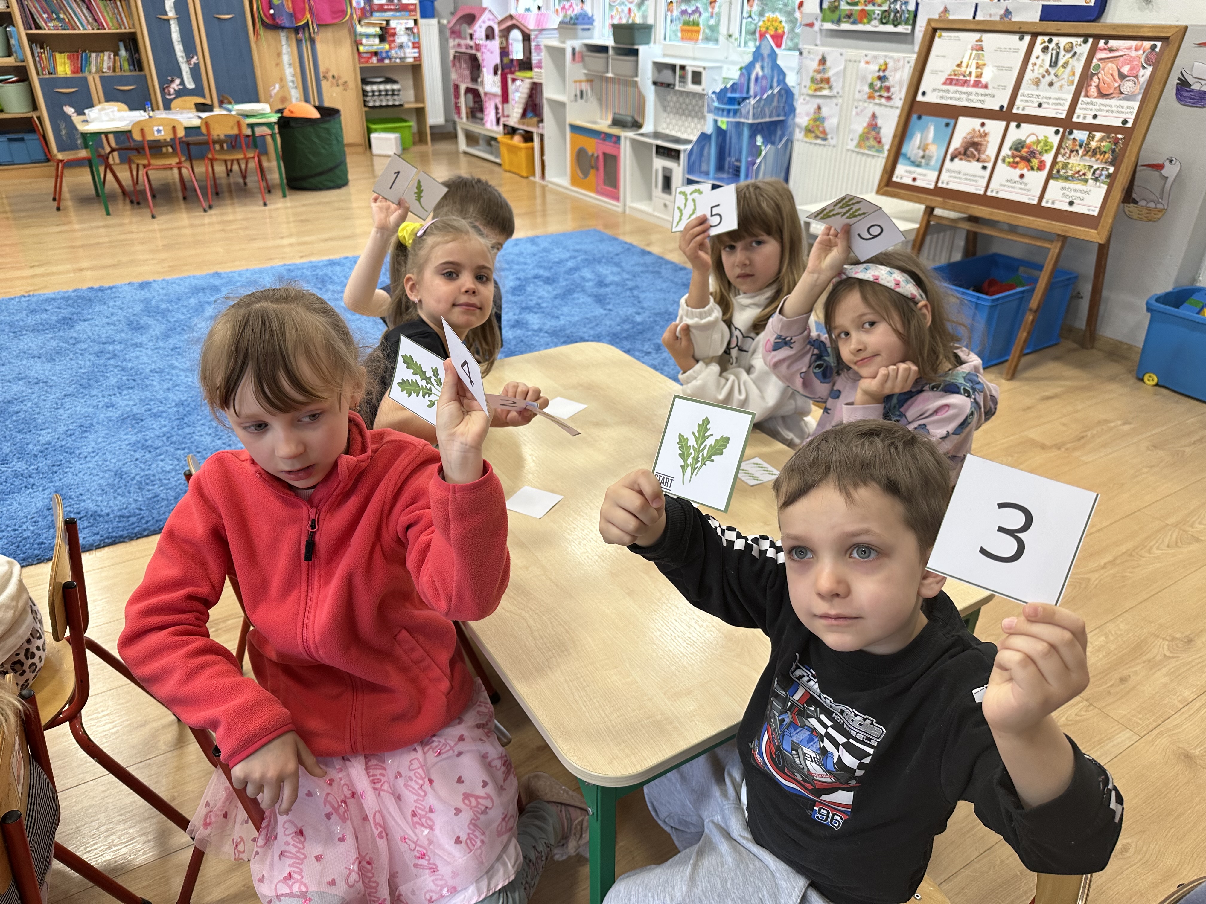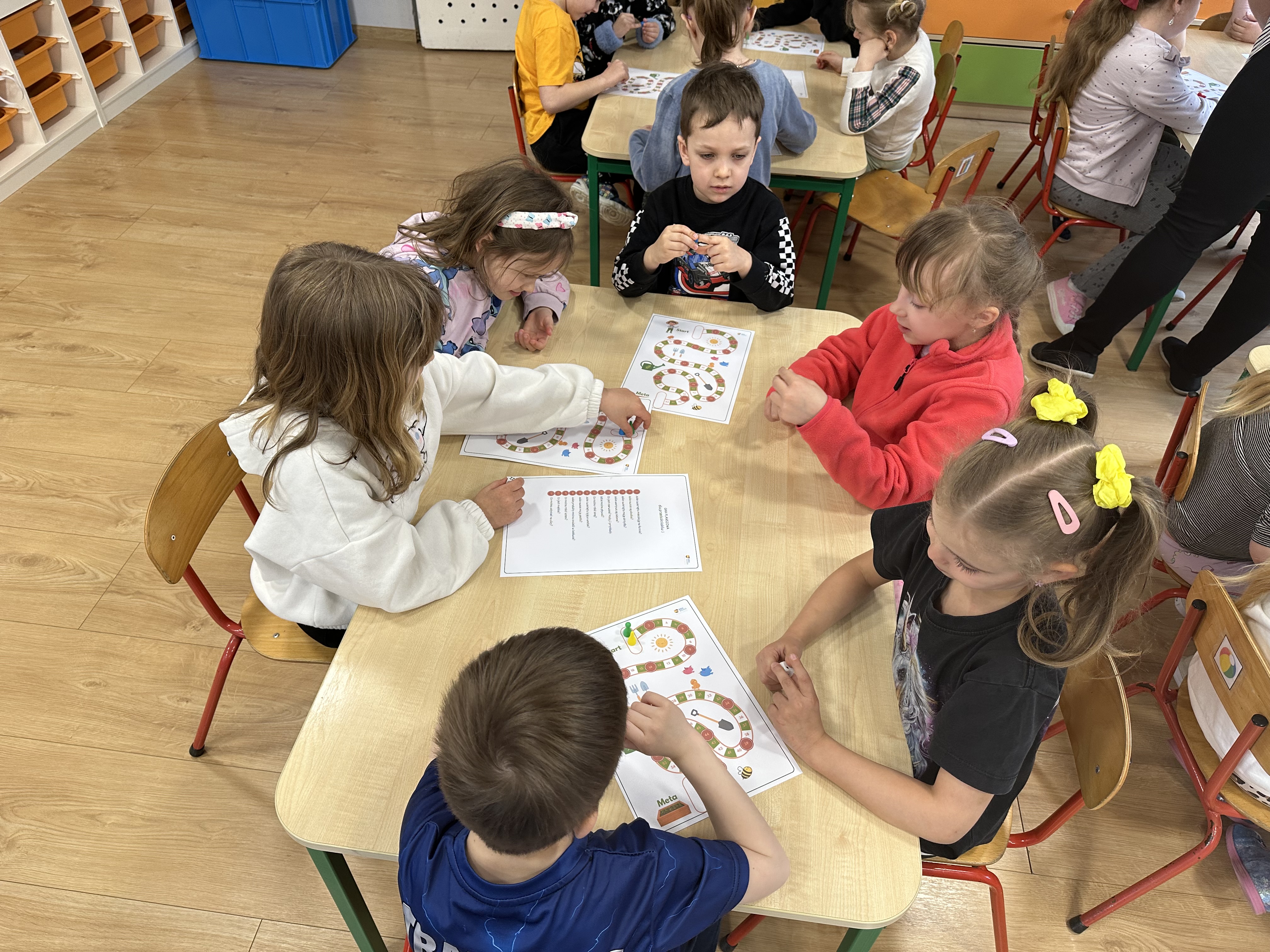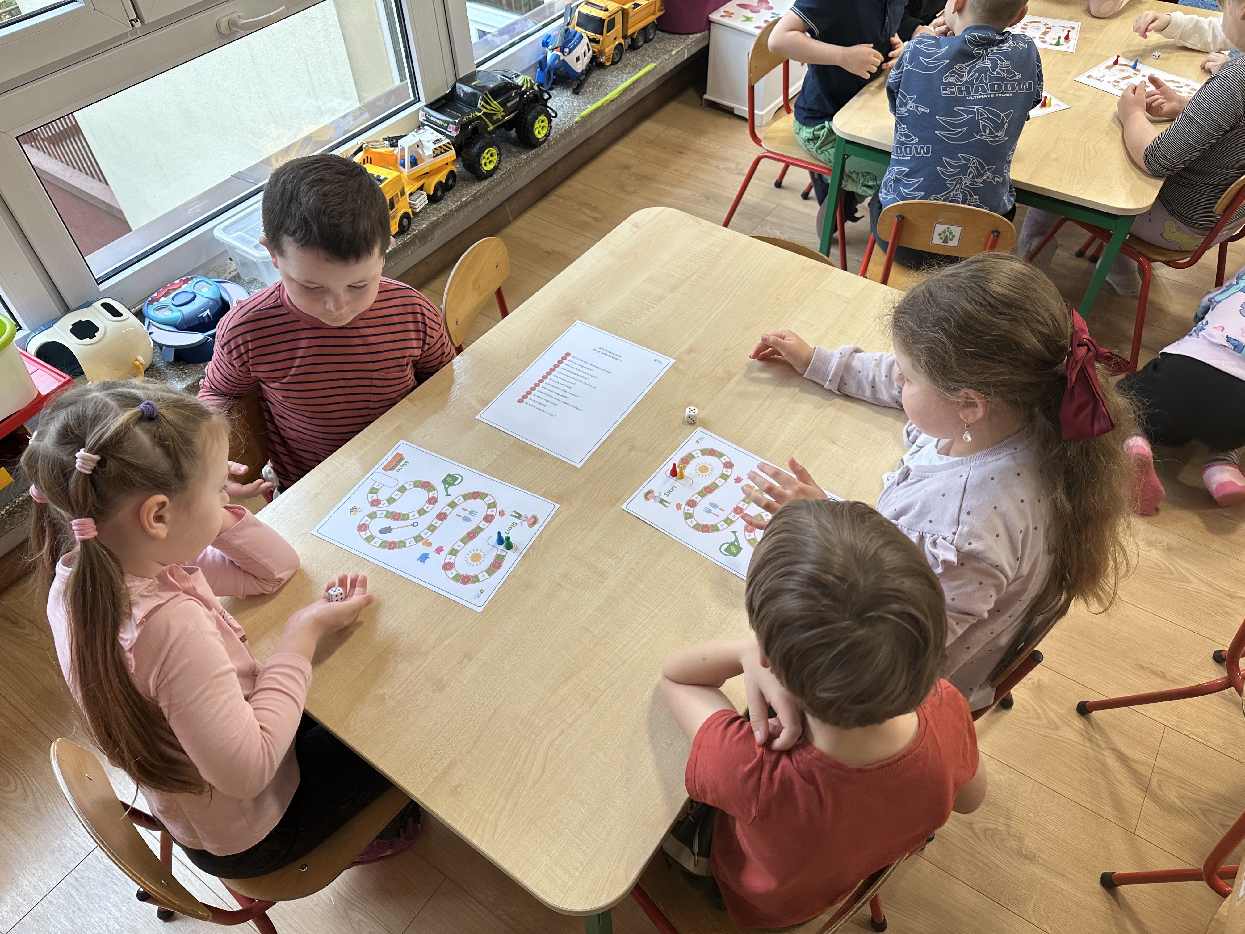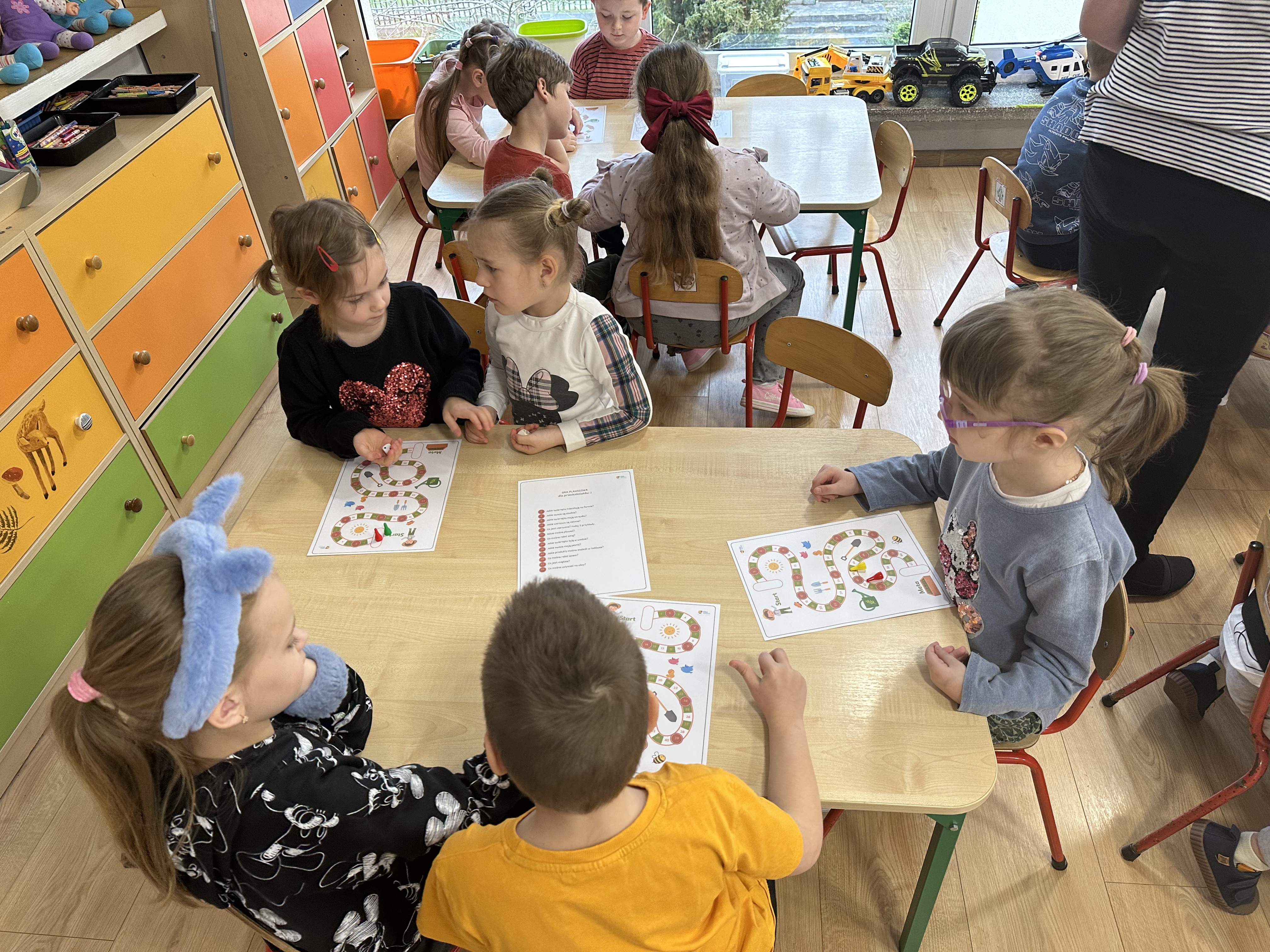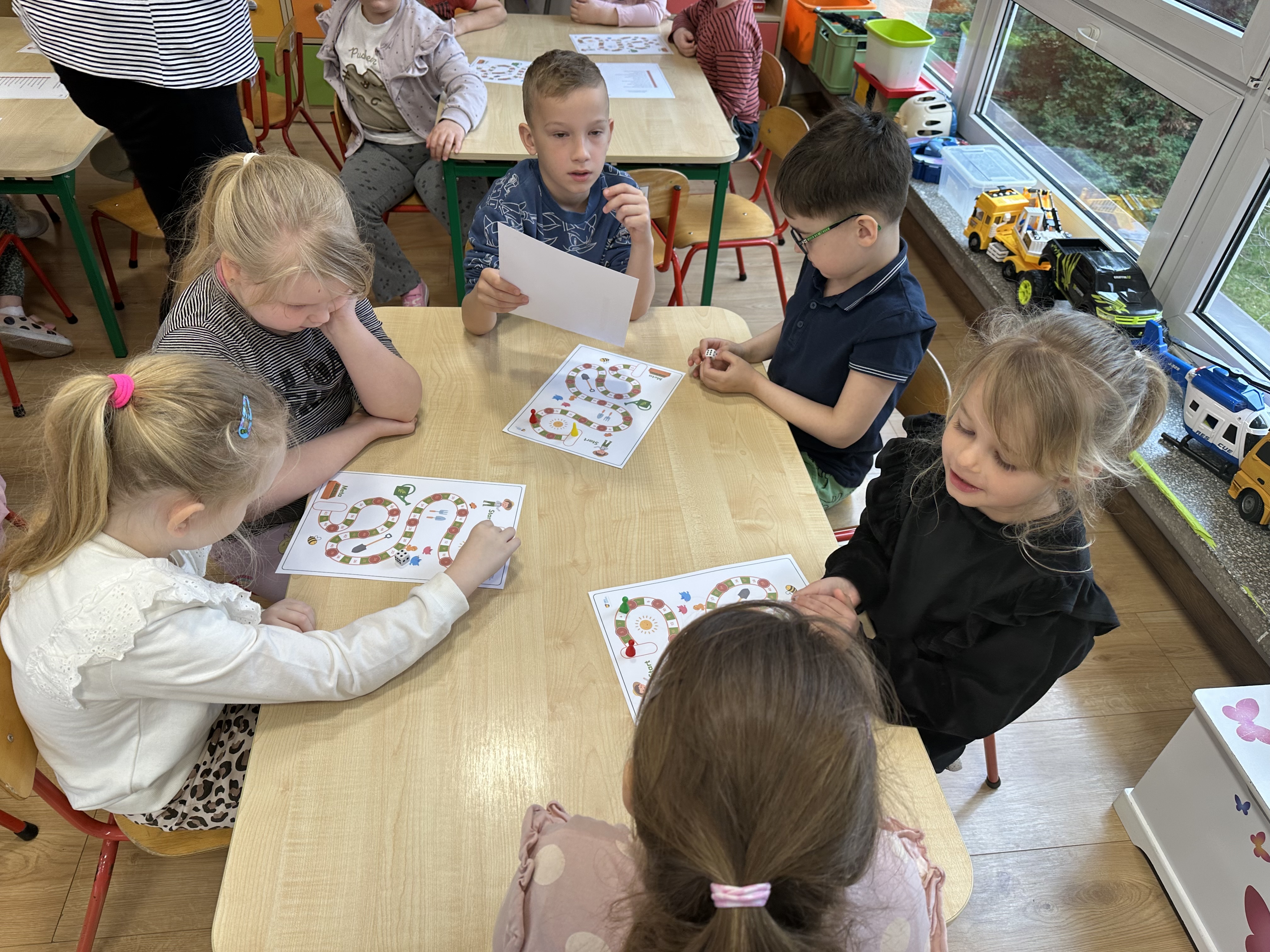 Dzieci rozwijały także kompetencje matematyczne, biorąc udział w grze w domino, w której dopasowywały obrazki rukoli do odpowiednich cyfr w zakresie 0-10. Dużym zainteresowaniem cieszyła się również gra planszowa, której celem było doprowadzenie ogrodnika do jego uprawy rukoli - emocji nie brakowało!