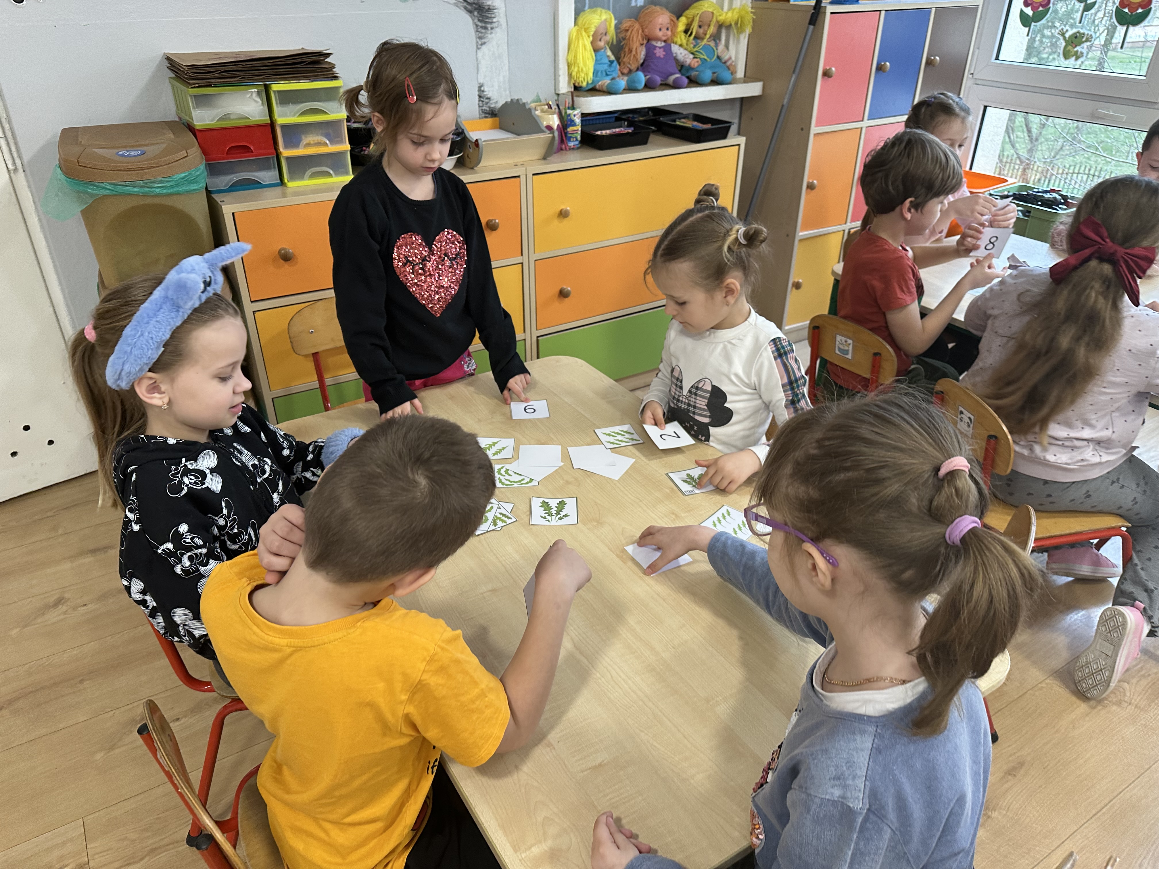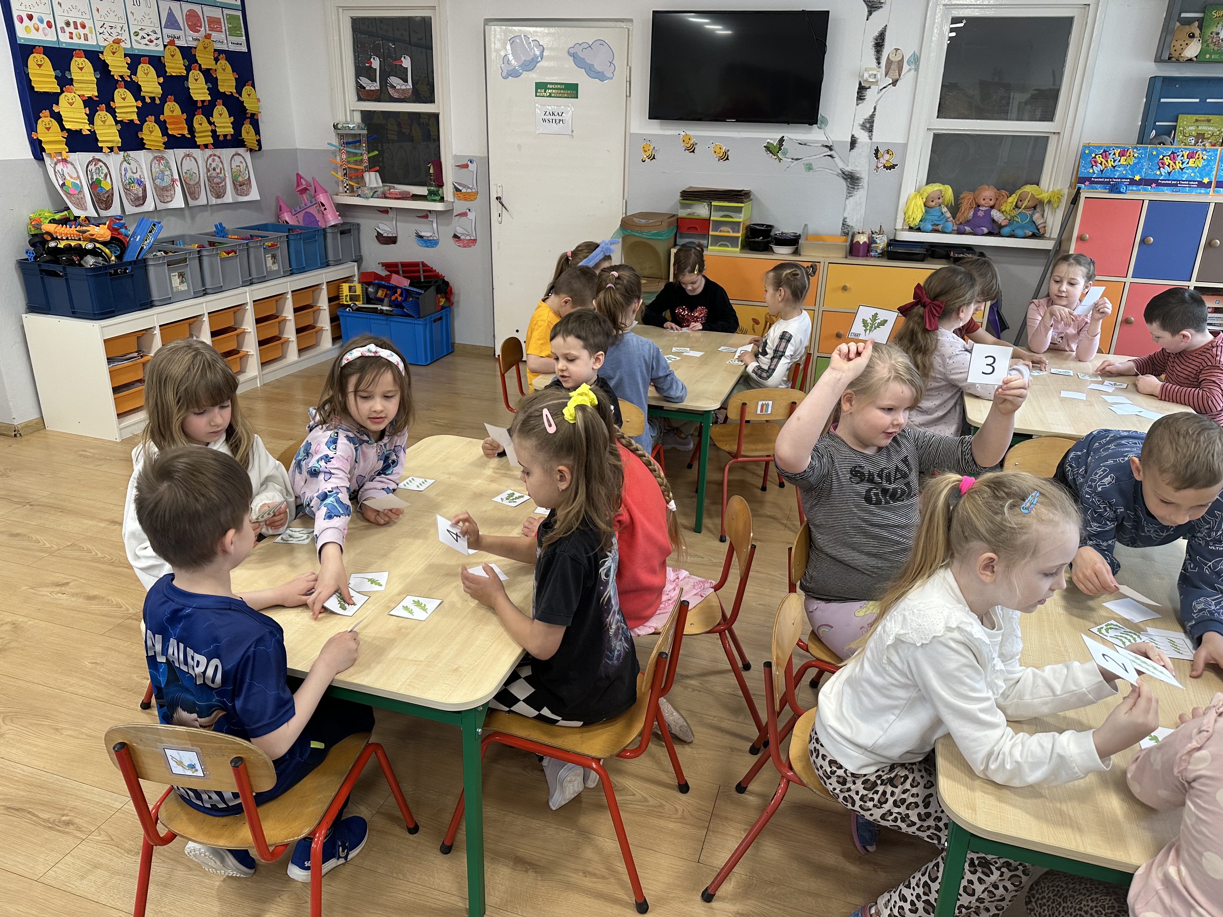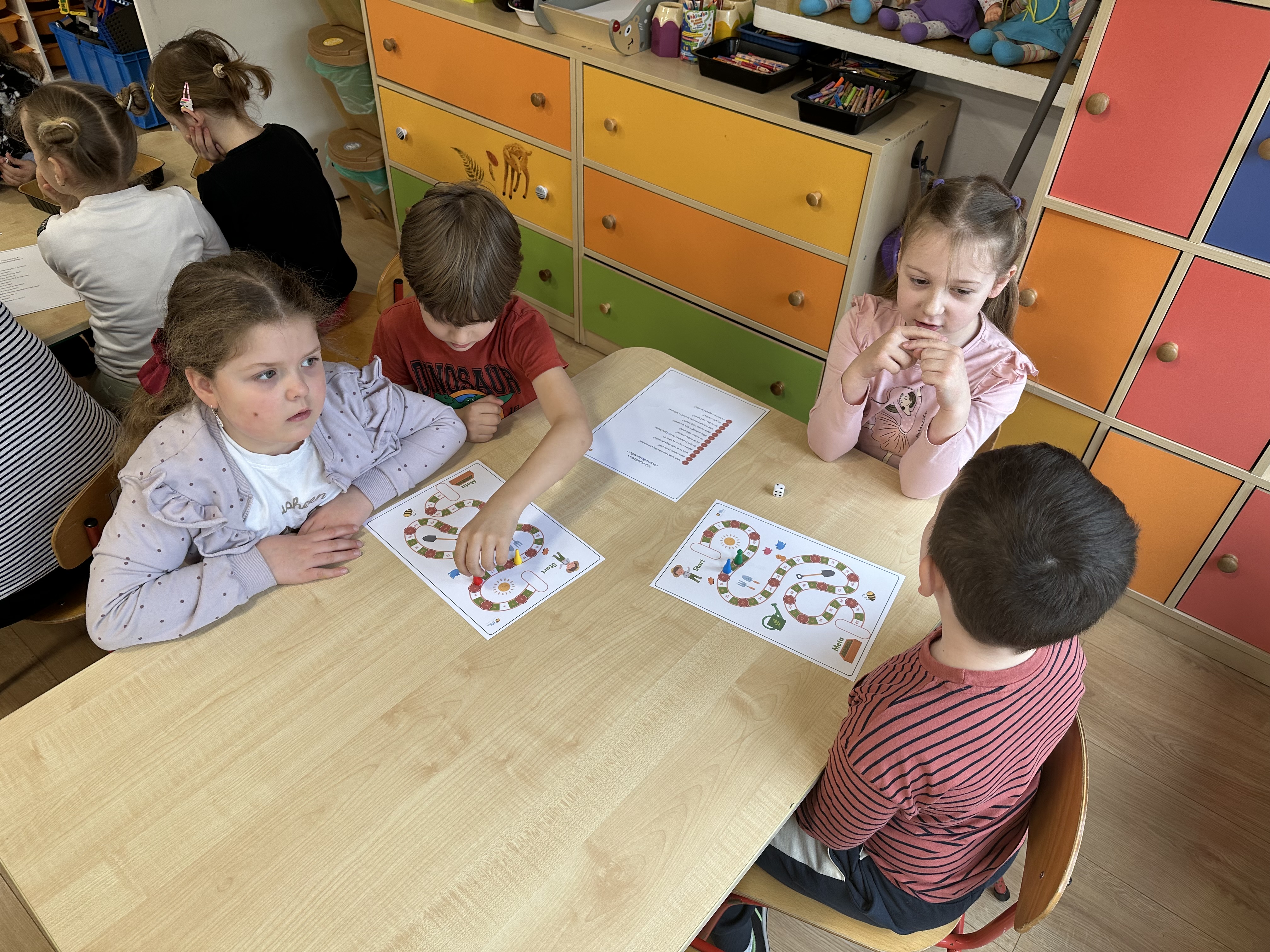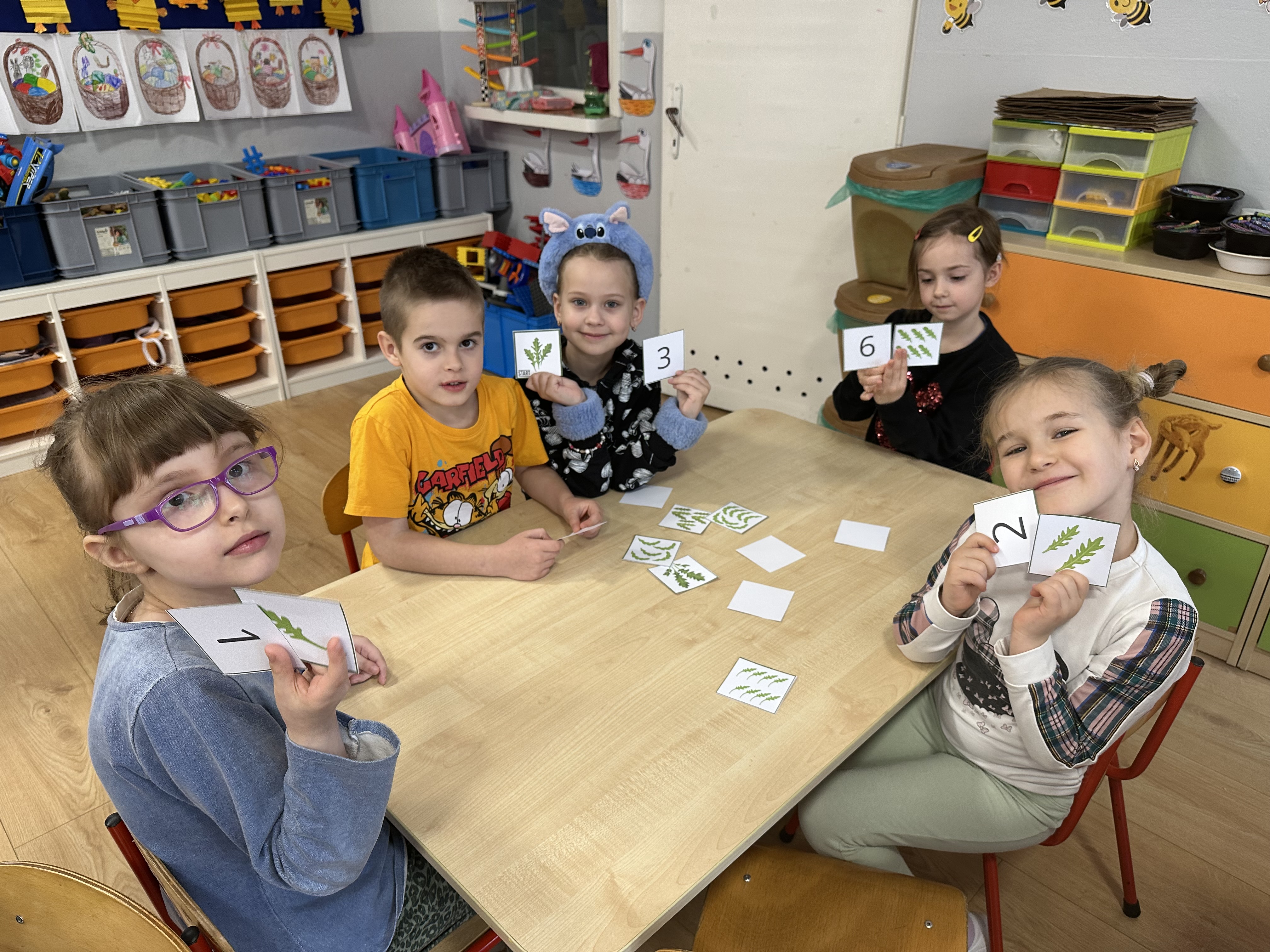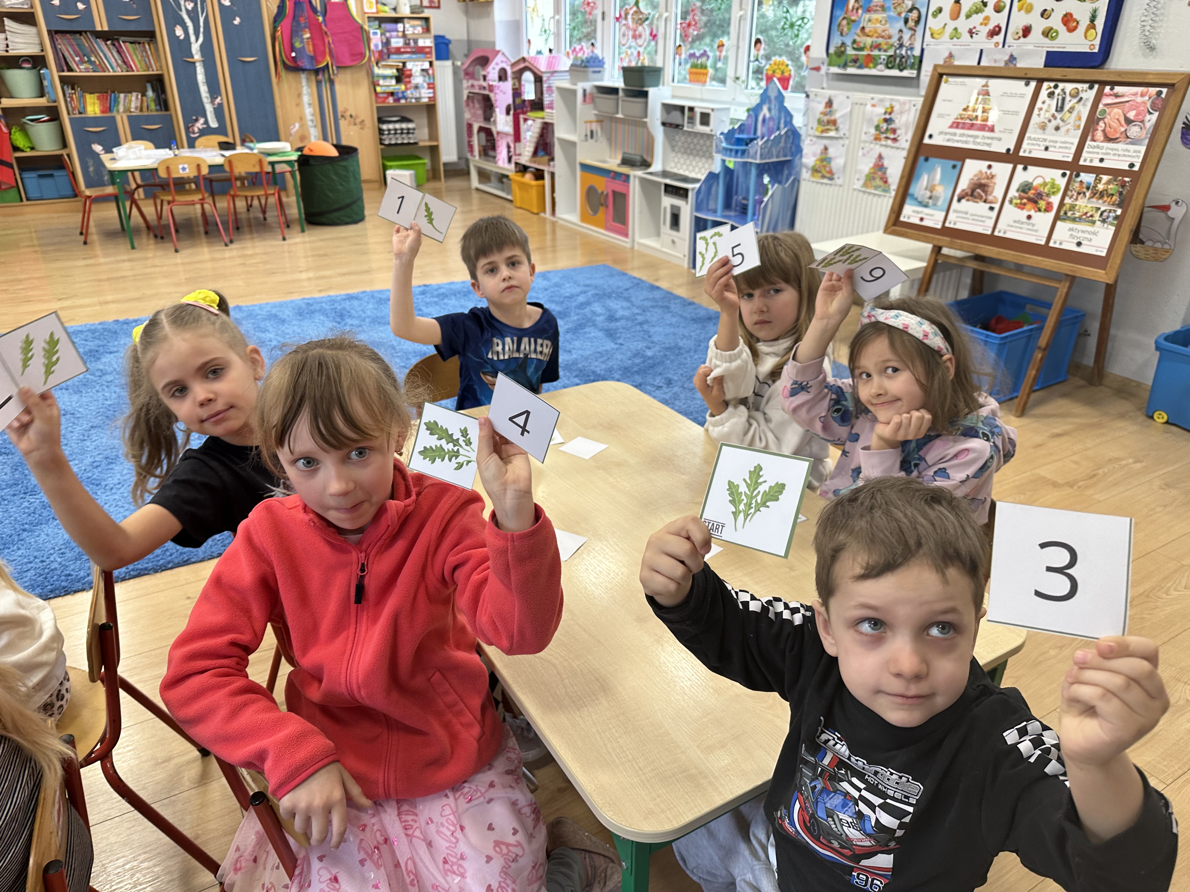 Dzieci rozwijały także kompetencje matematyczne, biorąc udział w grze w domino, w której dopasowywały obrazki rukoli do odpowiednich cyfr w zakresie 0-10. Dużym zainteresowaniem cieszyła się również gra planszowa, której celem było doprowadzenie ogrodnika do jego uprawy rukoli - emocji nie brakowało!