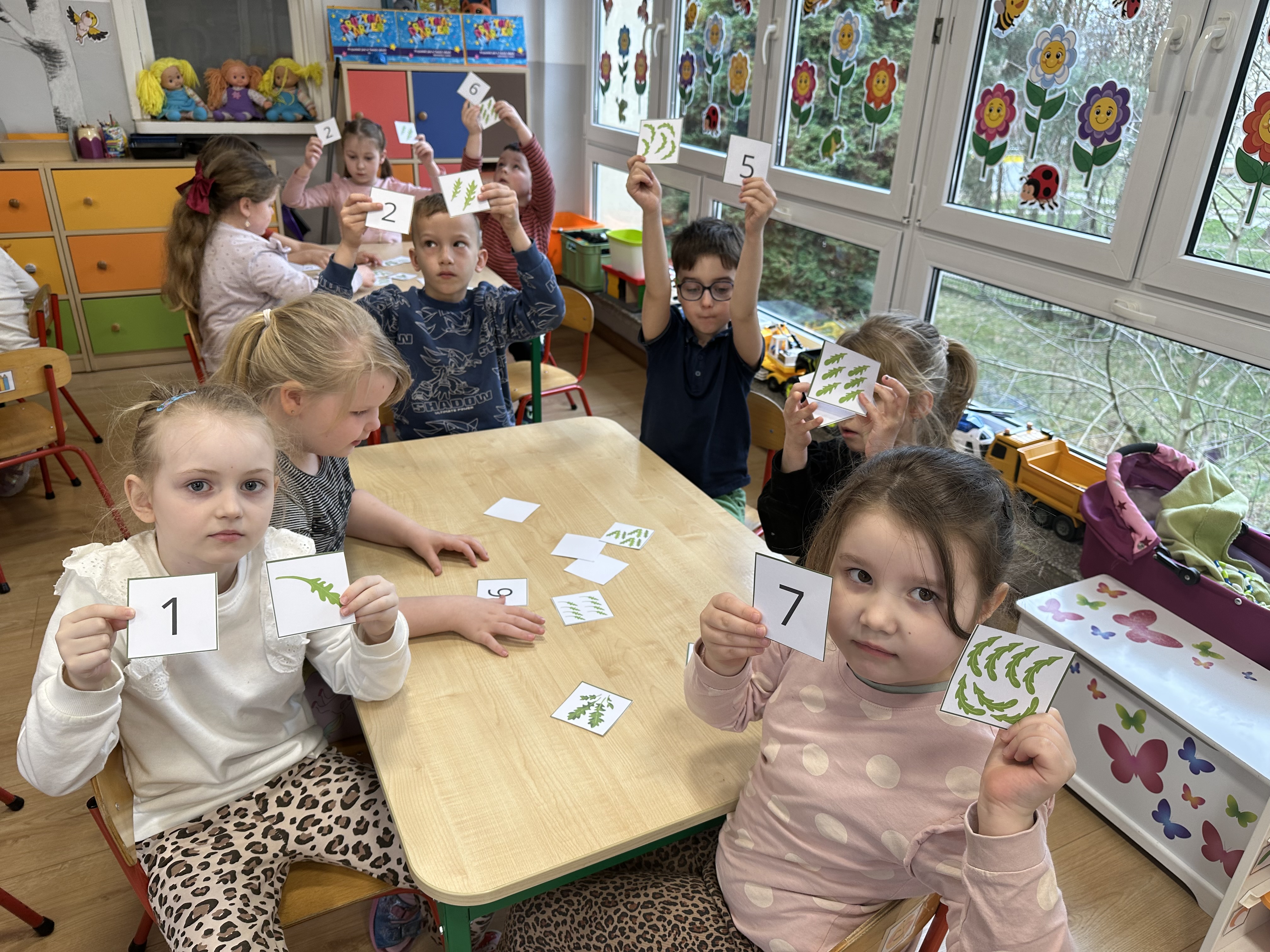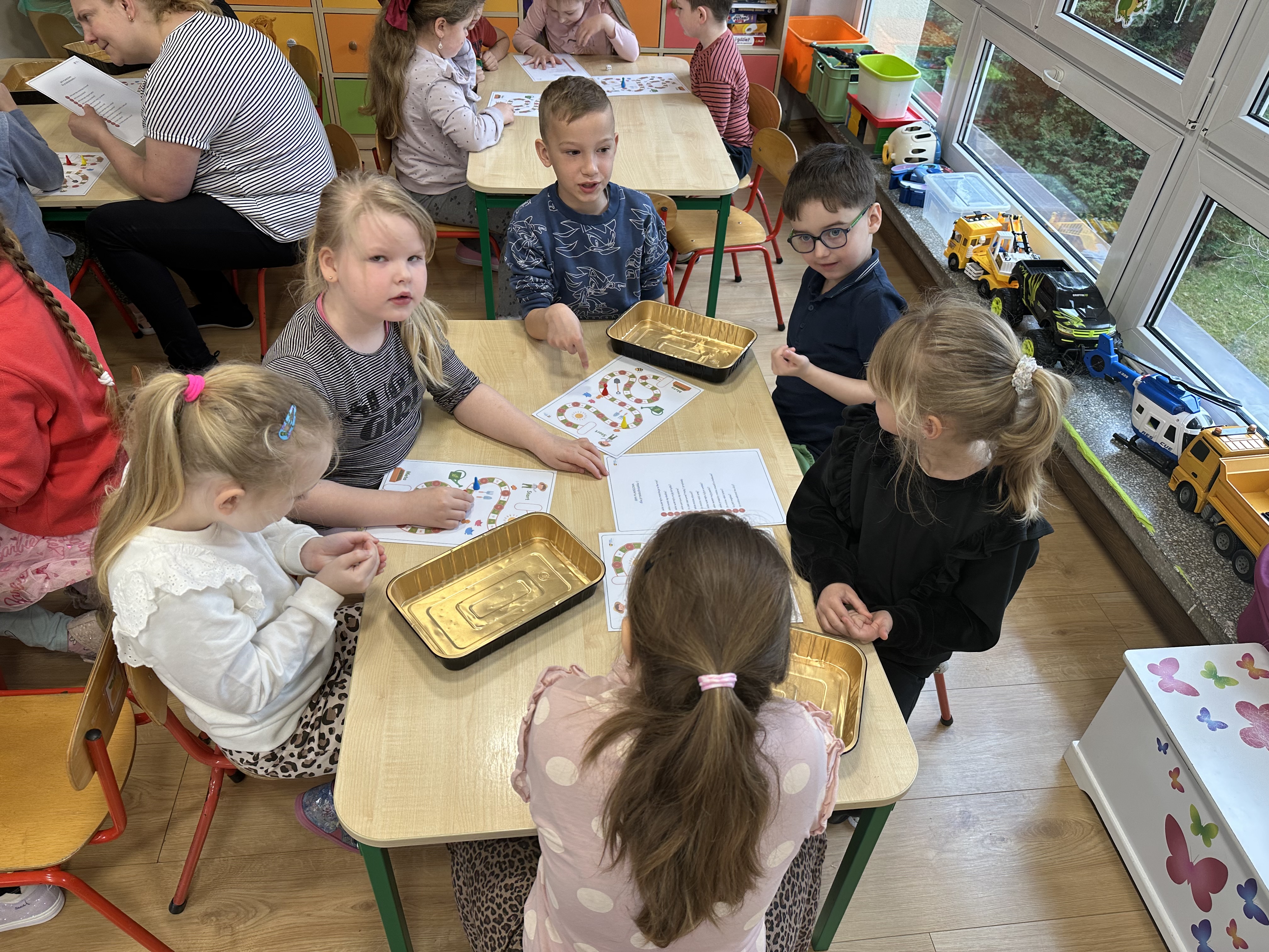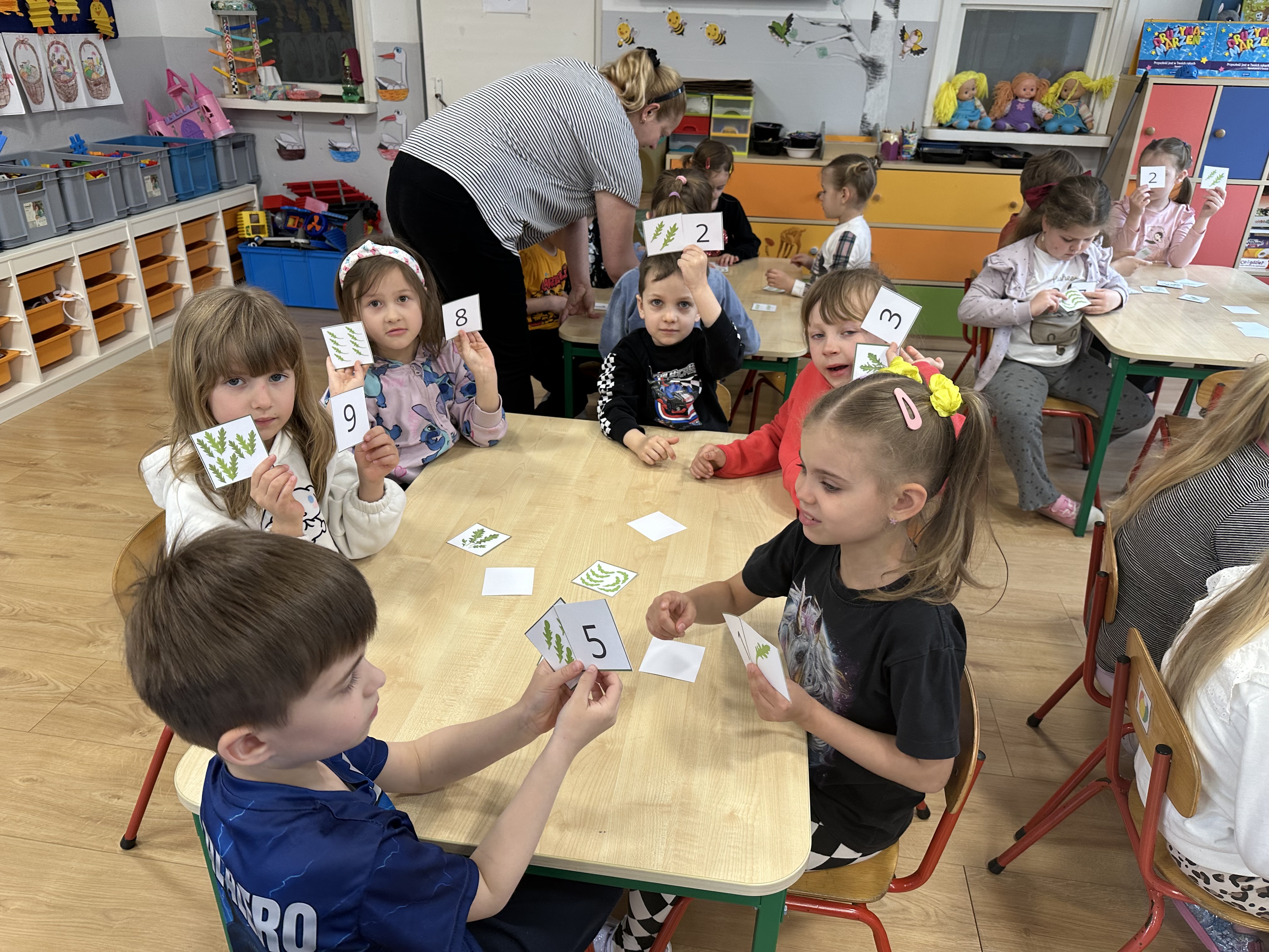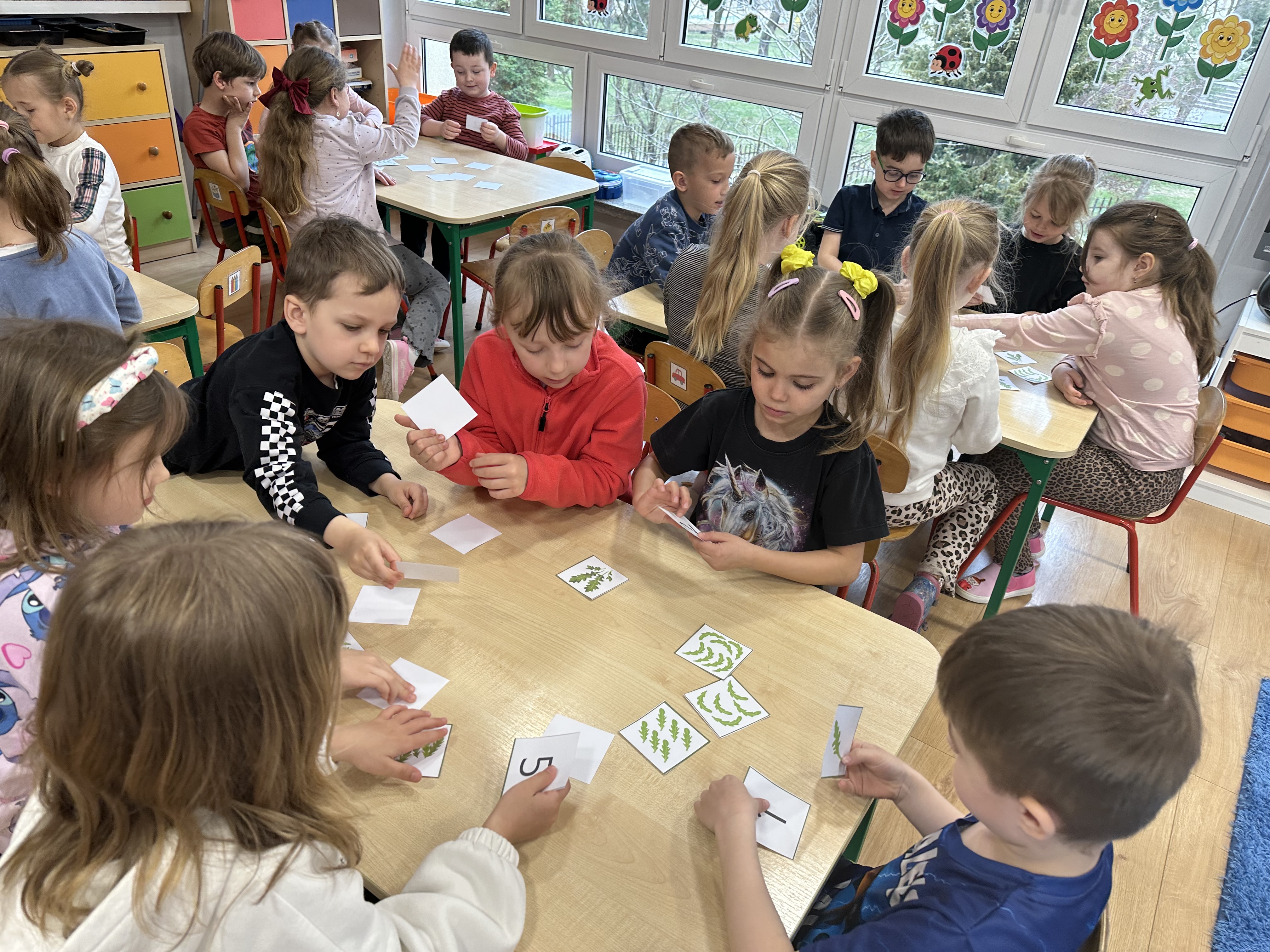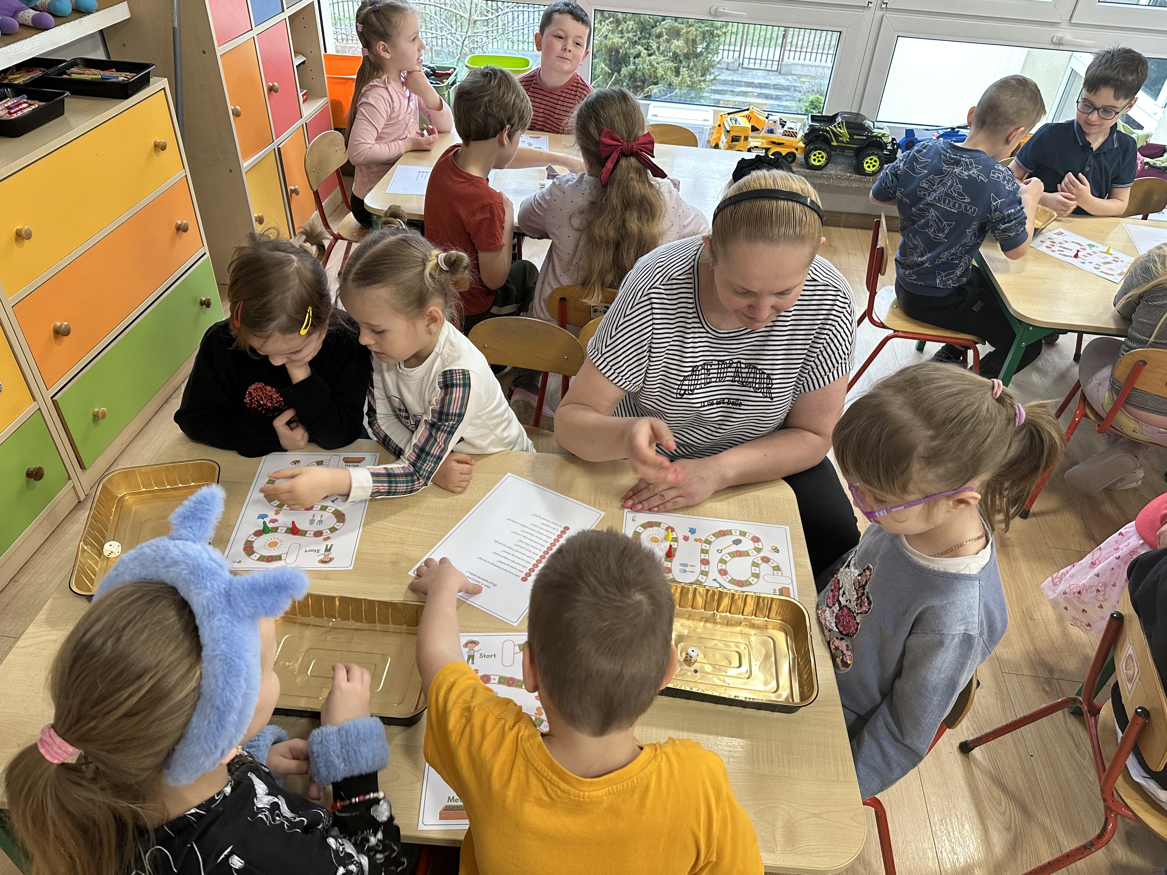 Dzieci rozwijały także kompetencje matematyczne, biorąc udział w grze w domino, w której dopasowywały obrazki rukoli do odpowiednich cyfr w zakresie 0-10. Dużym zainteresowaniem cieszyła się również gra planszowa, której celem było doprowadzenie ogrodnika do jego uprawy rukoli - emocji nie brakowało!