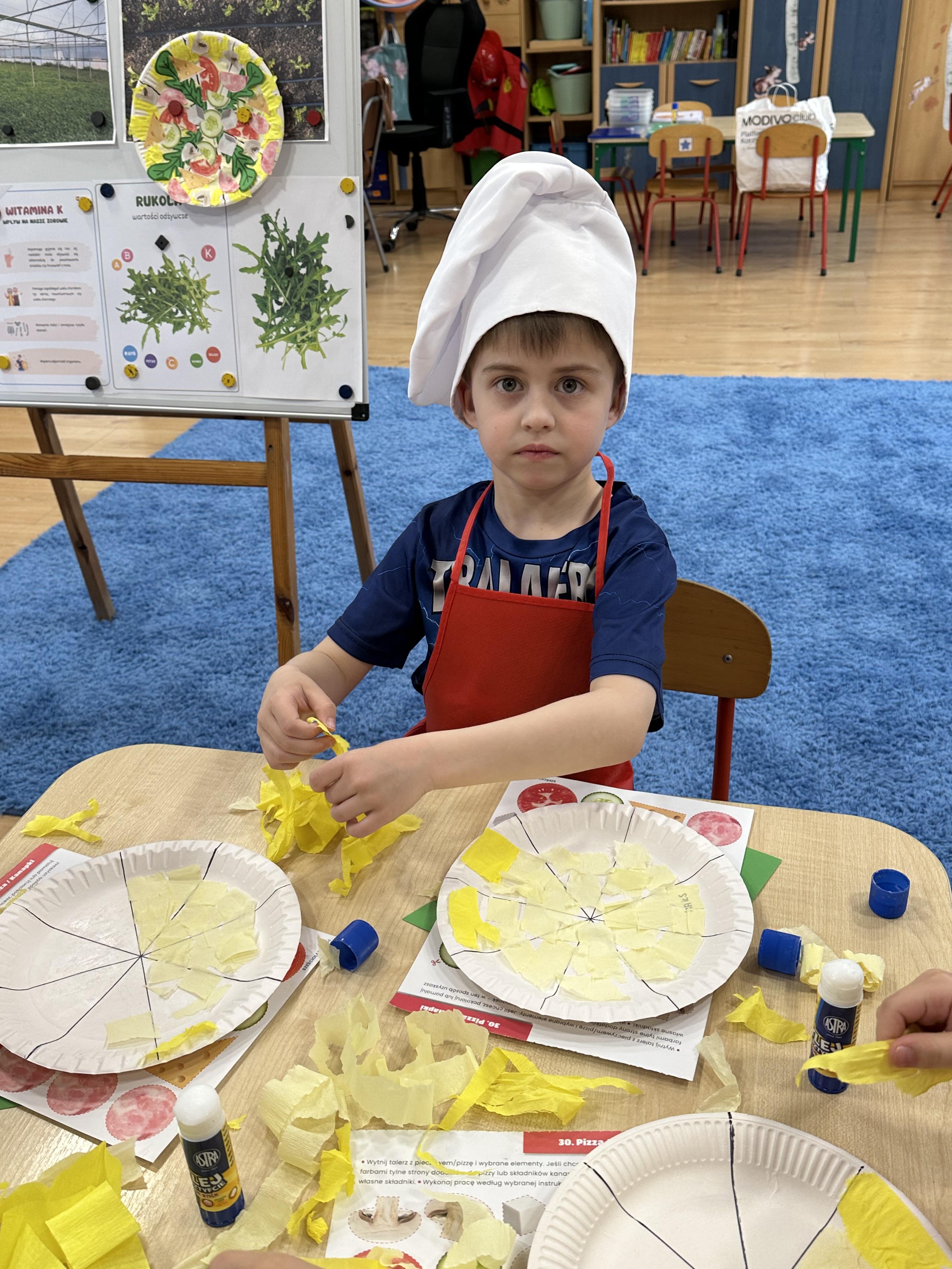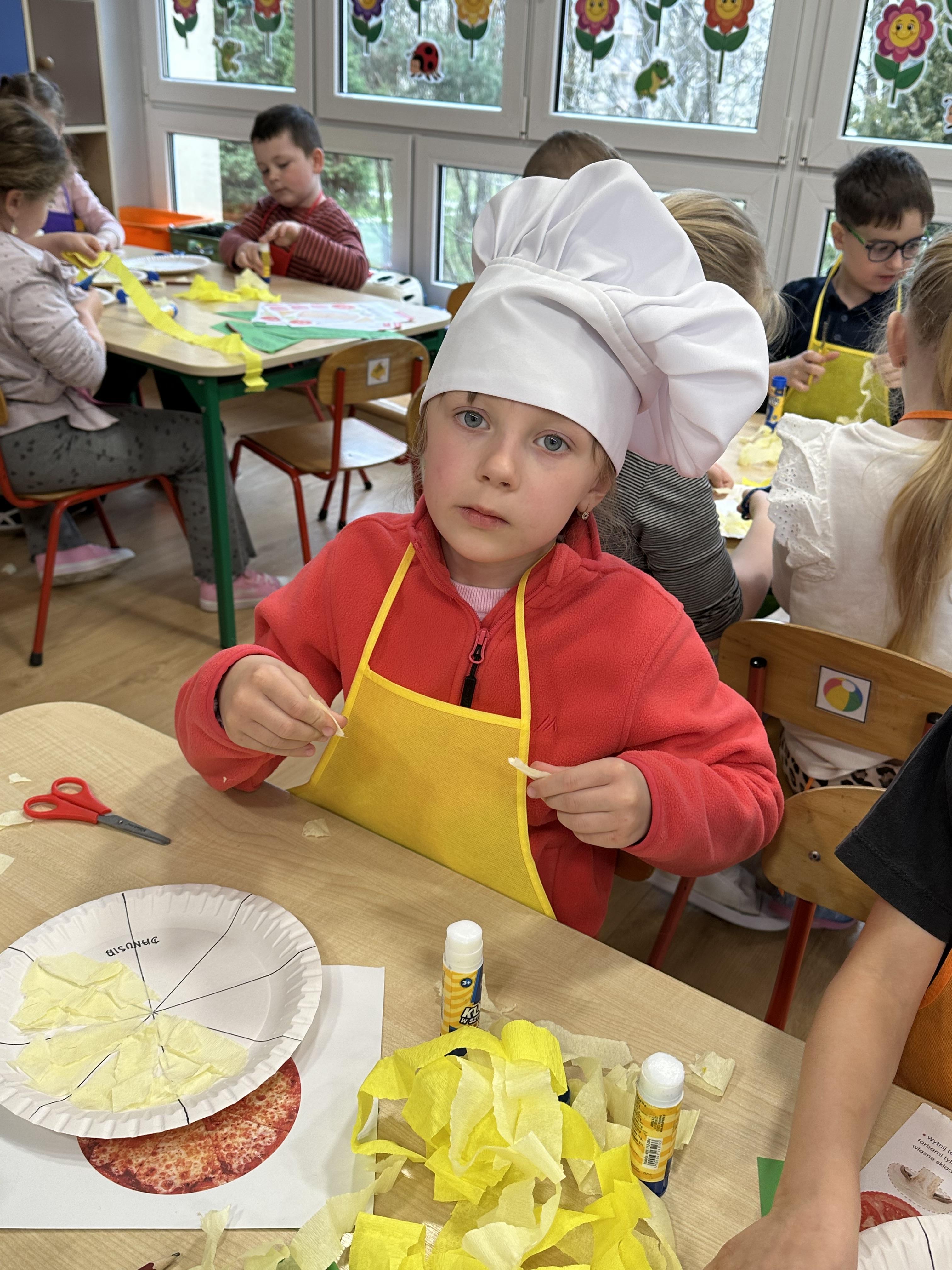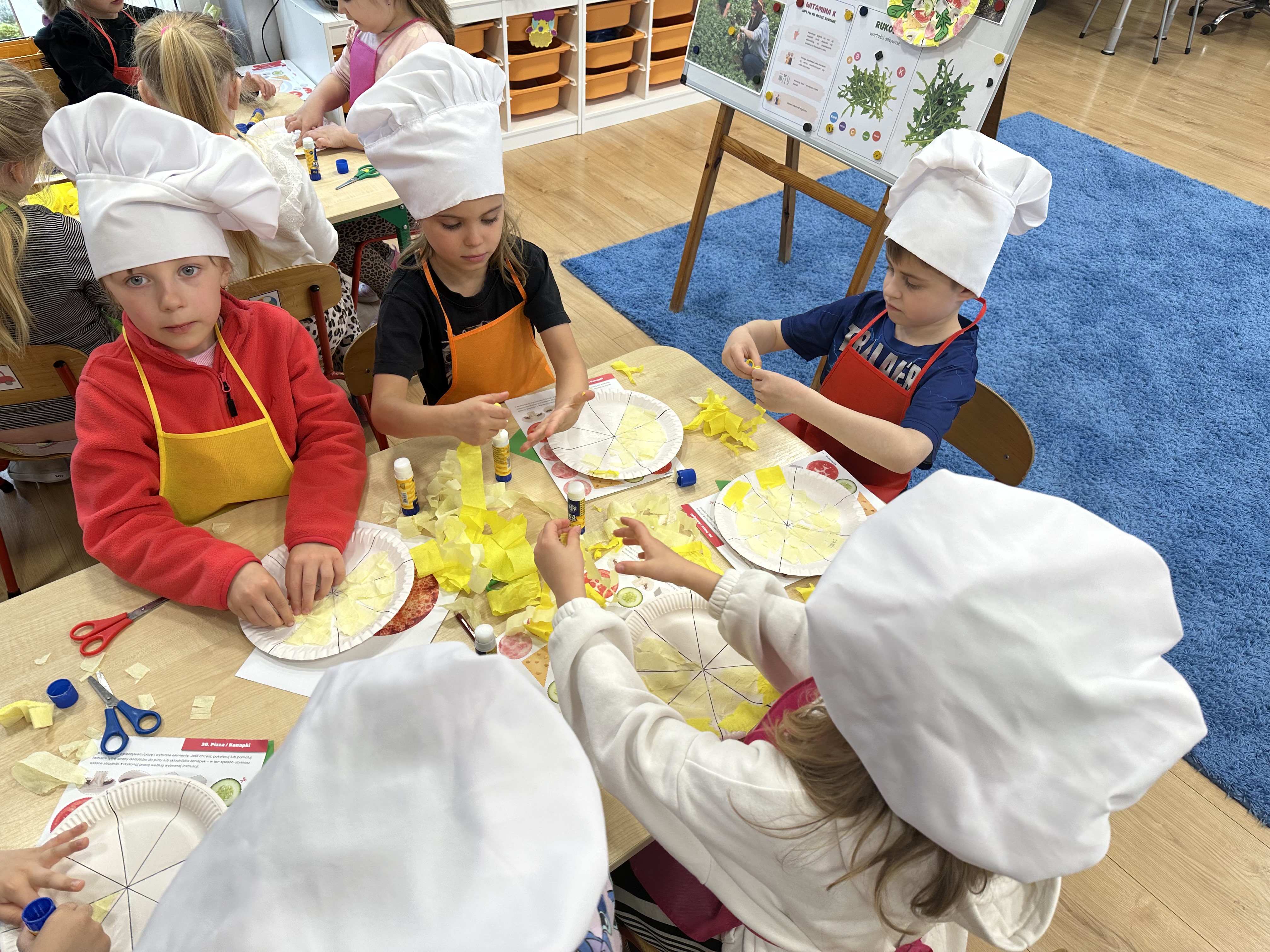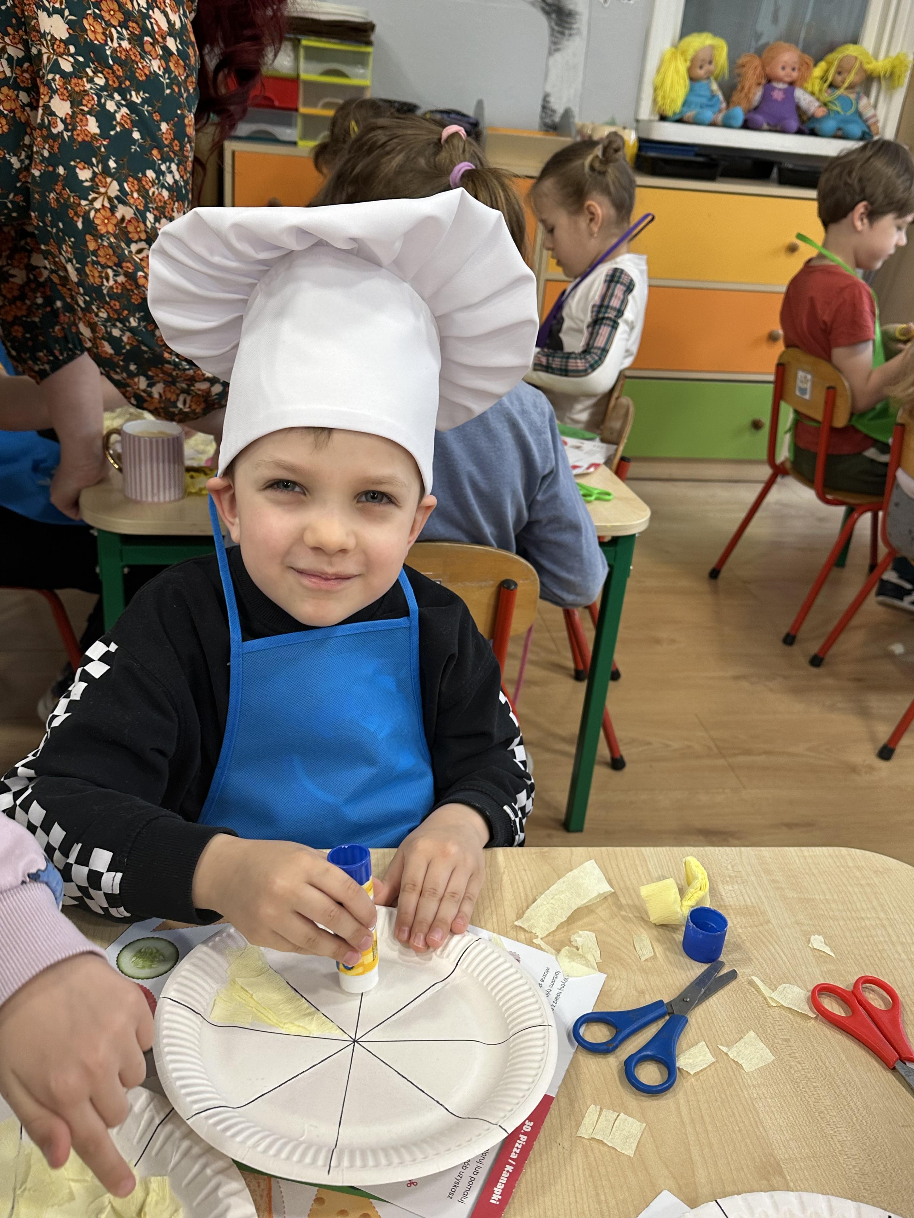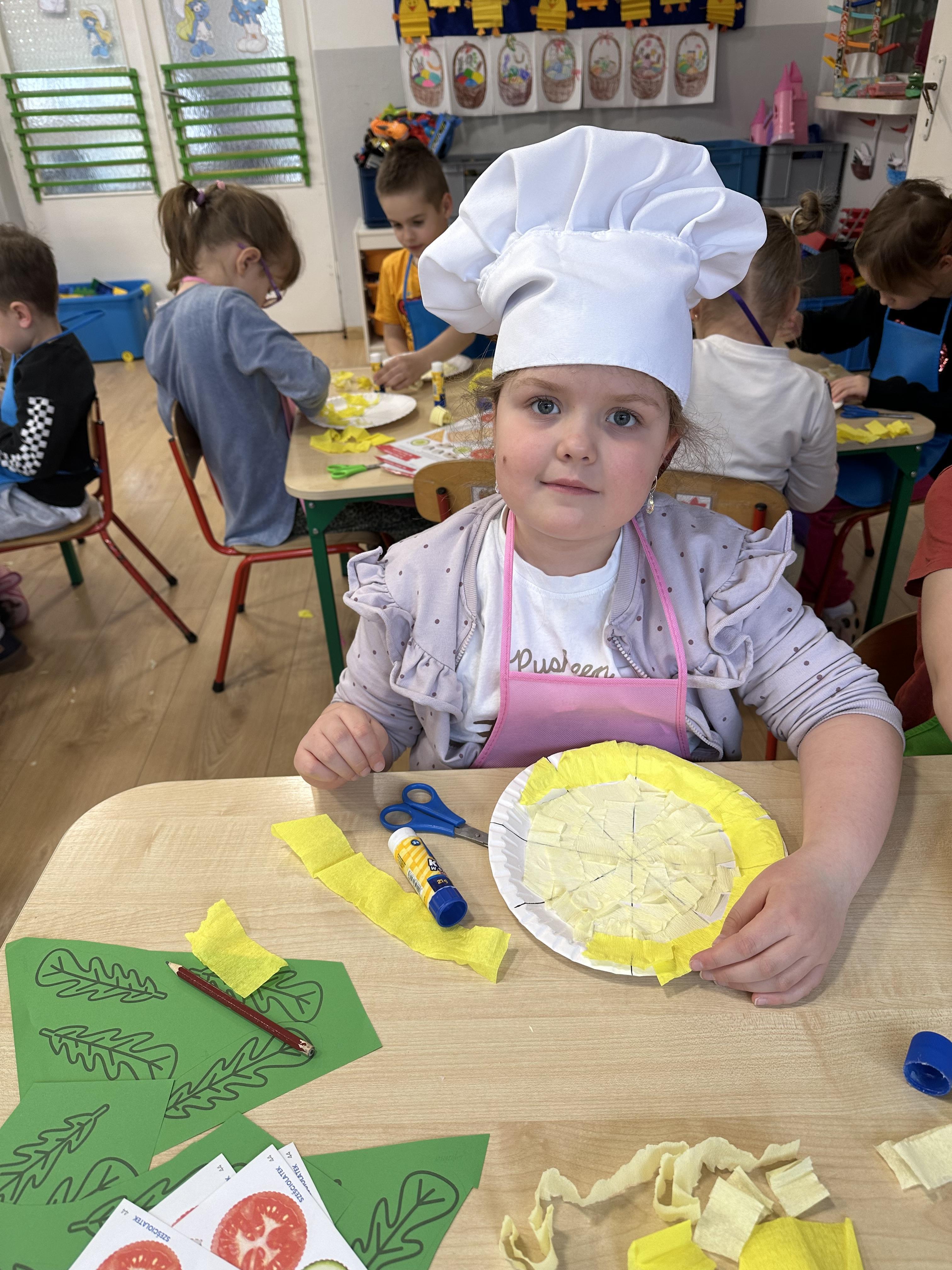 W trakcie zabawy tematycznej „Restauracja” dzieci wcieliły się w rolę kucharzy. Efektem ich pracy była kreatywna praca plastyczna - pizza z rukolą. Była to doskonała okazja do rozwijania wyobraźni oraz zainteresowania zdrowym odżywianiem.