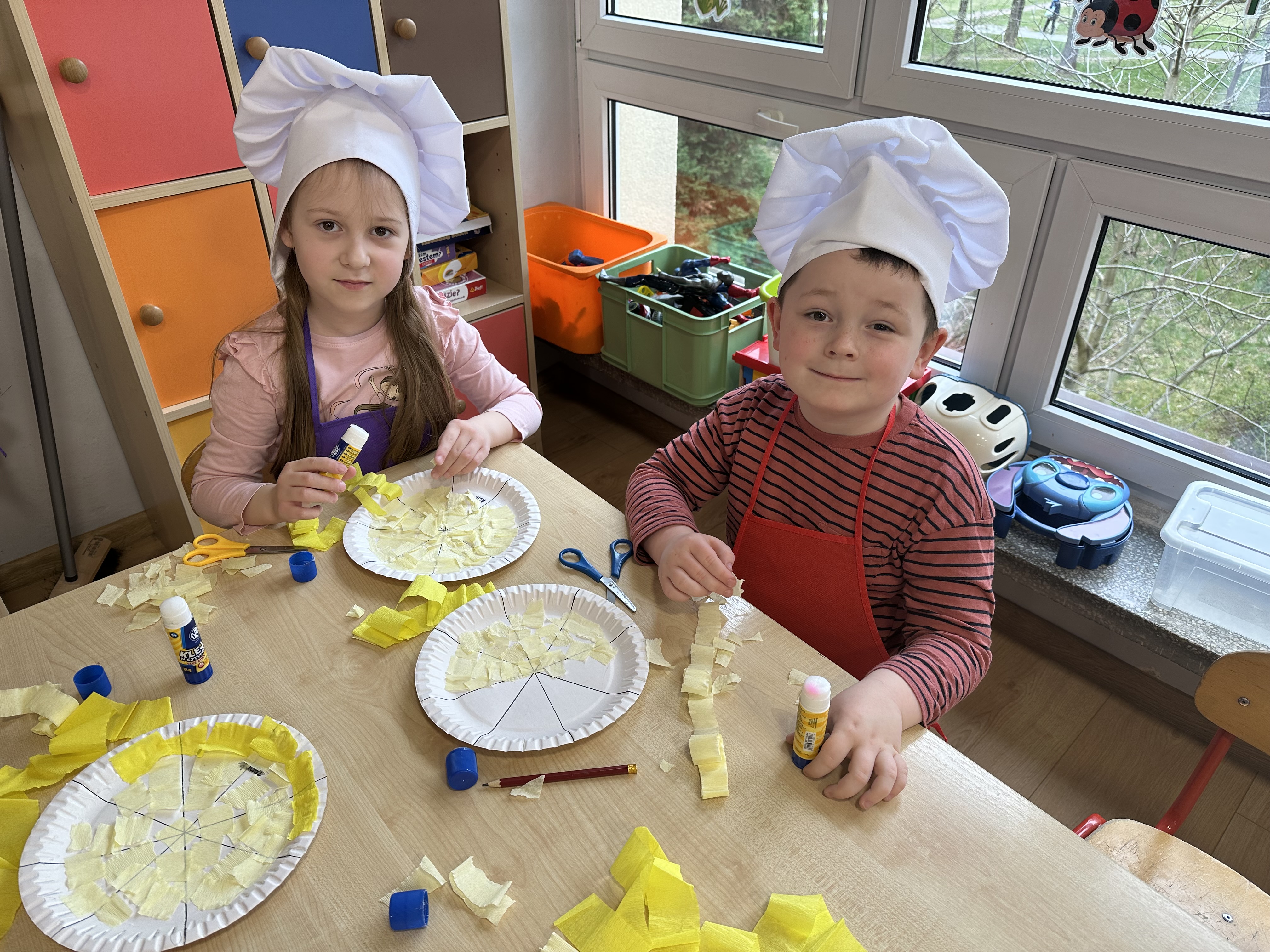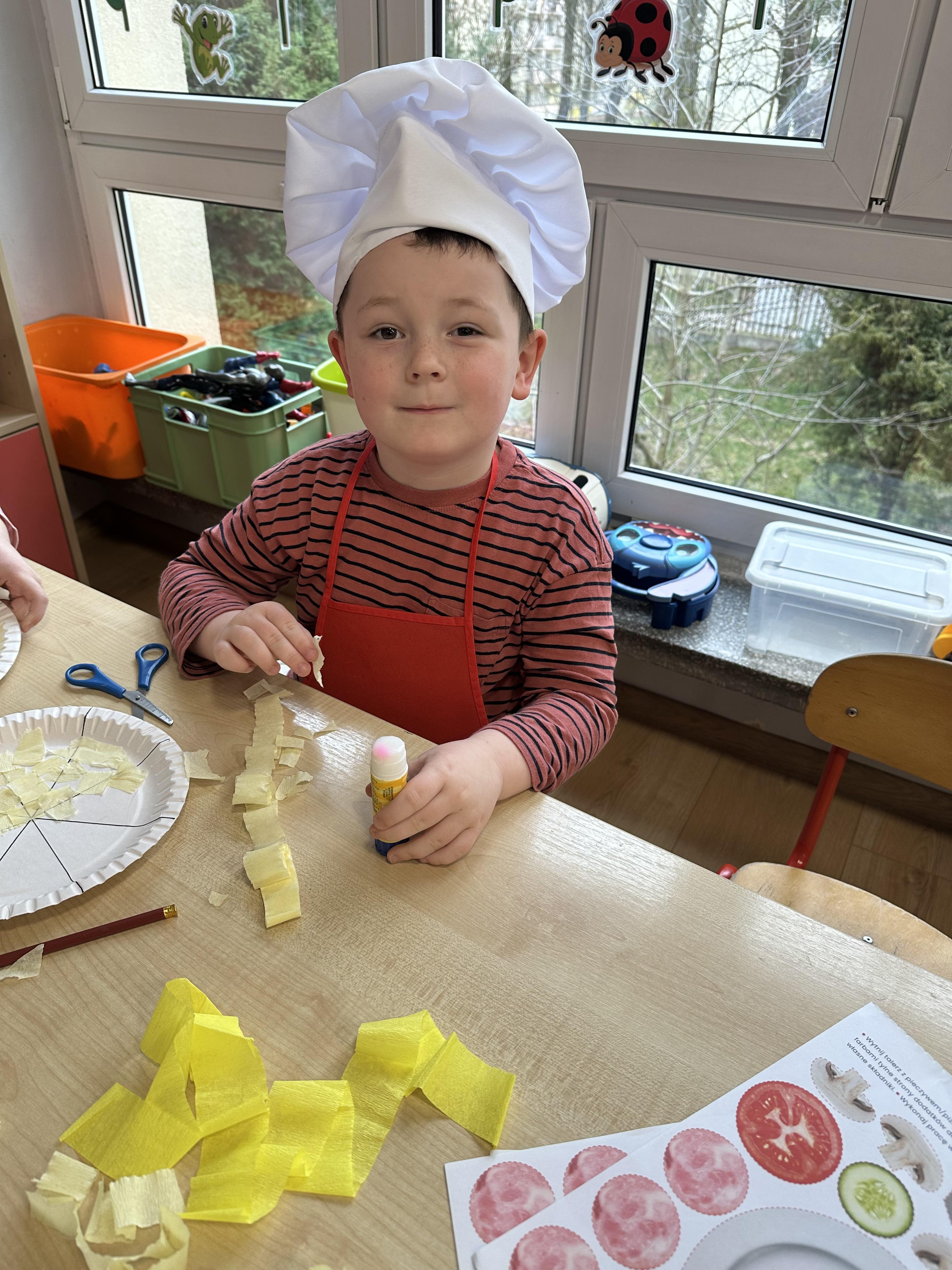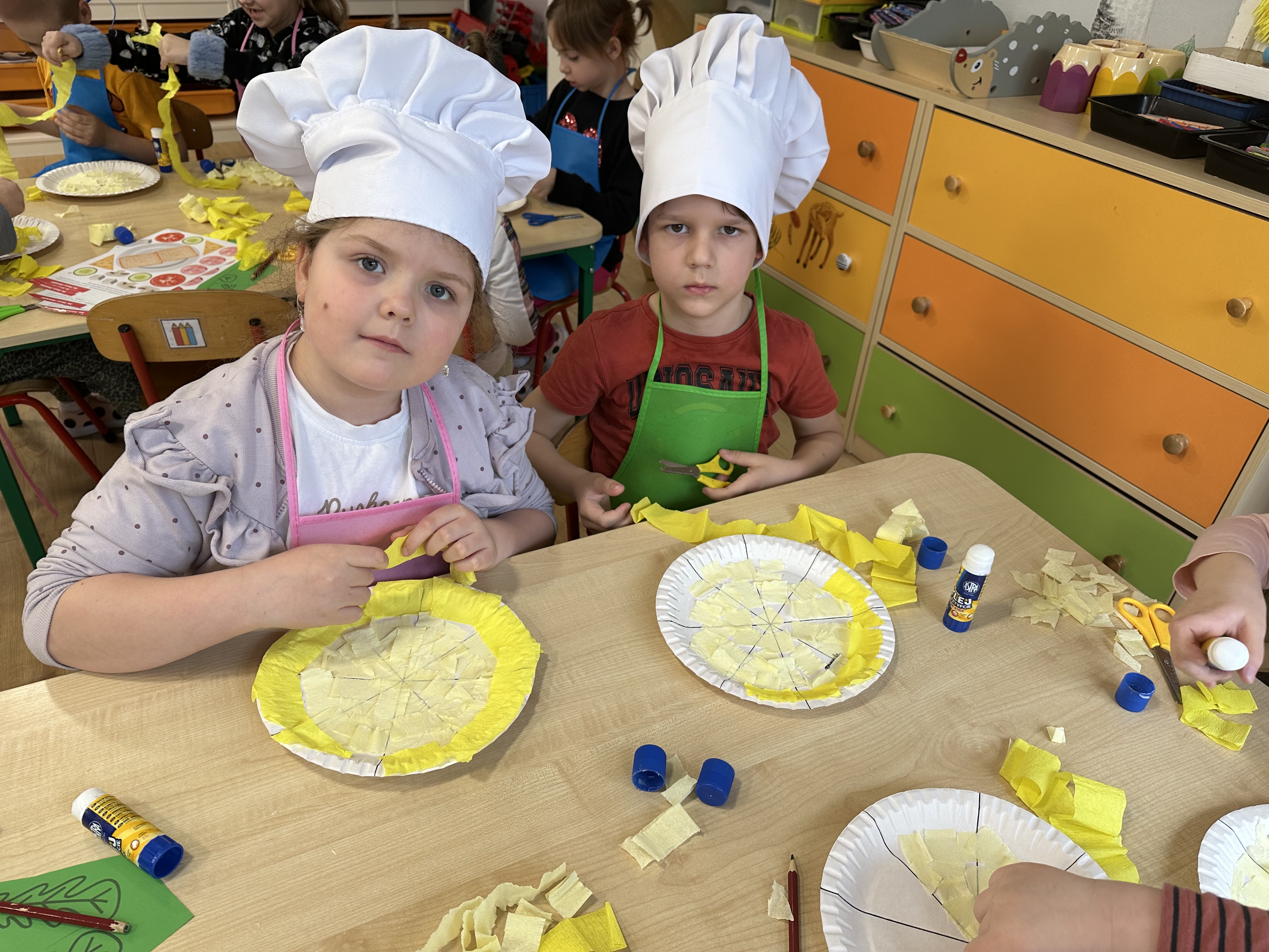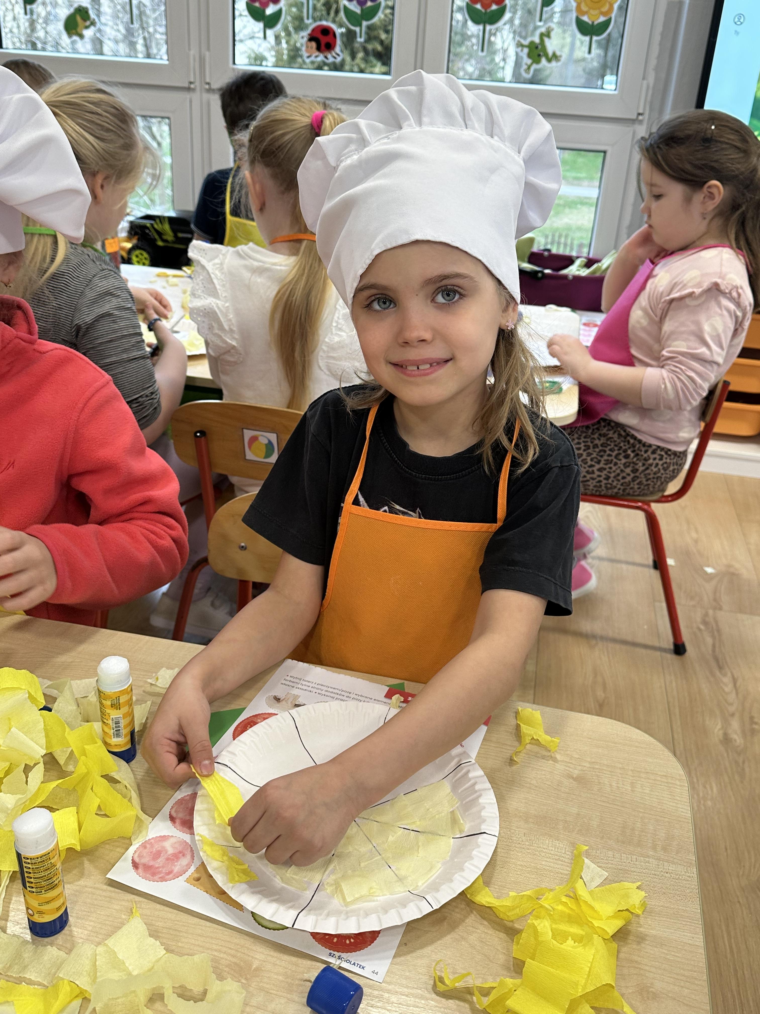 W trakcie zabawy tematycznej „Restauracja” dzieci wcieliły się w rolę kucharzy. Efektem ich pracy była kreatywna praca plastyczna - pizza z rukolą. Była to doskonała okazja do rozwijania wyobraźni oraz zainteresowania zdrowym odżywianiem.