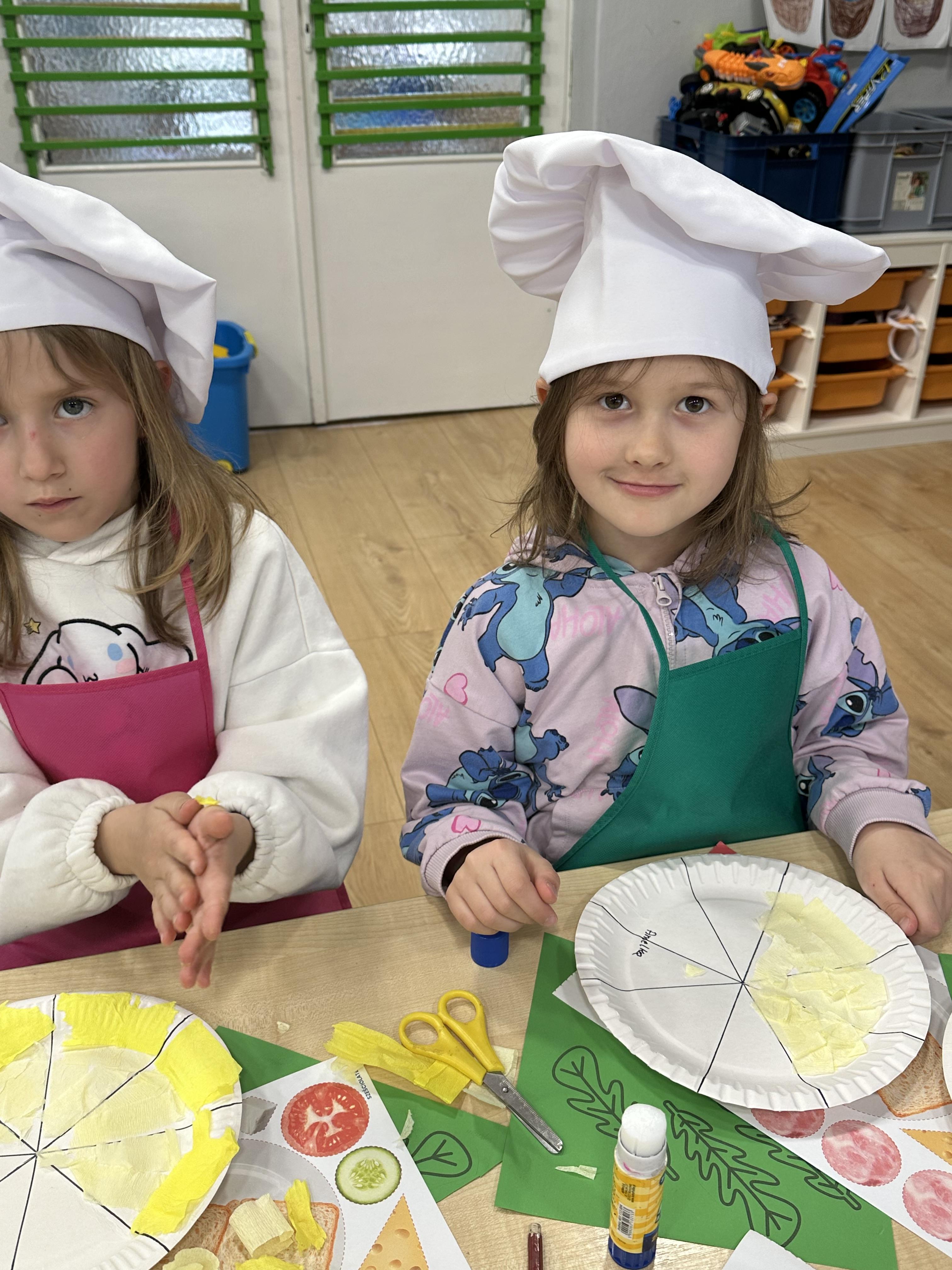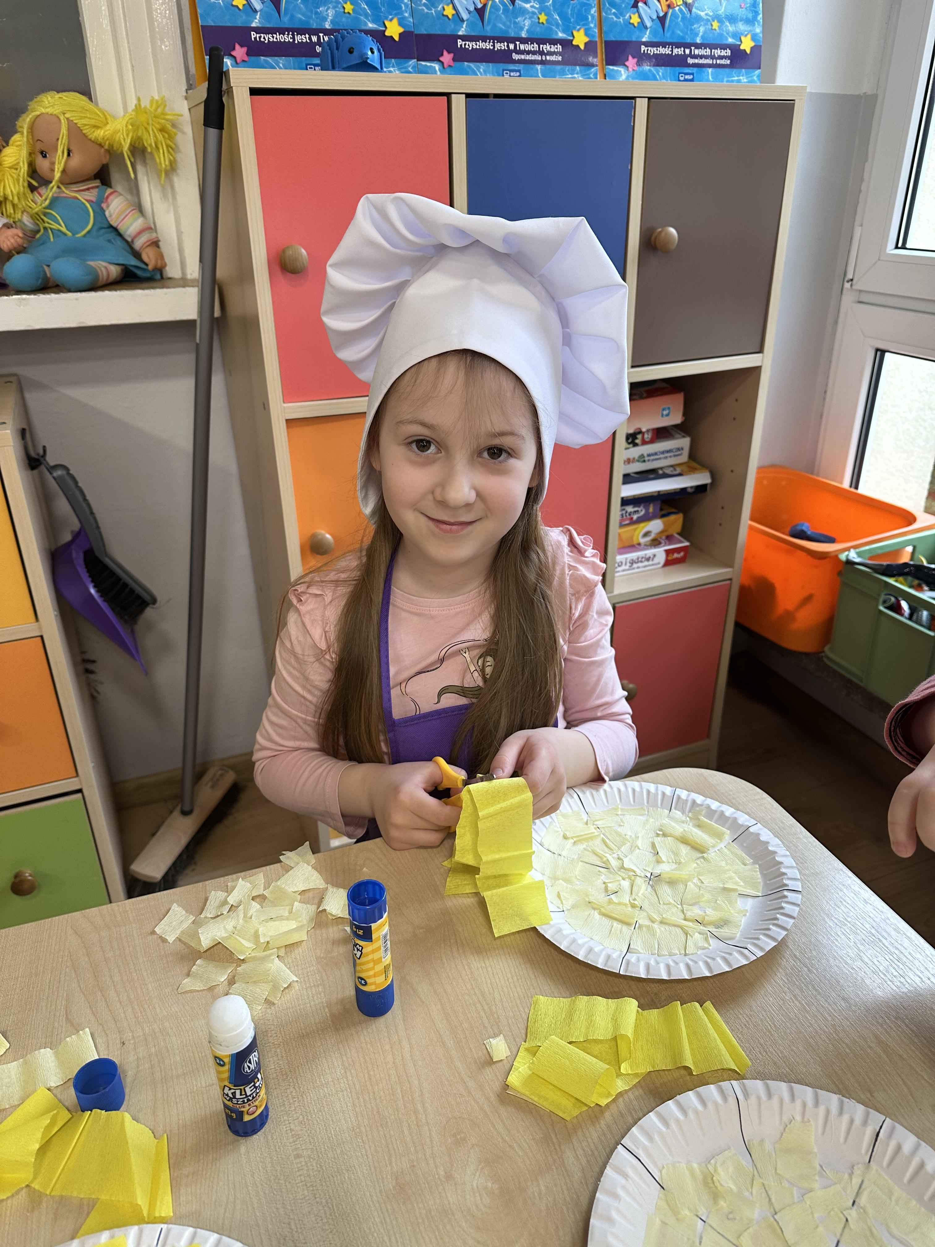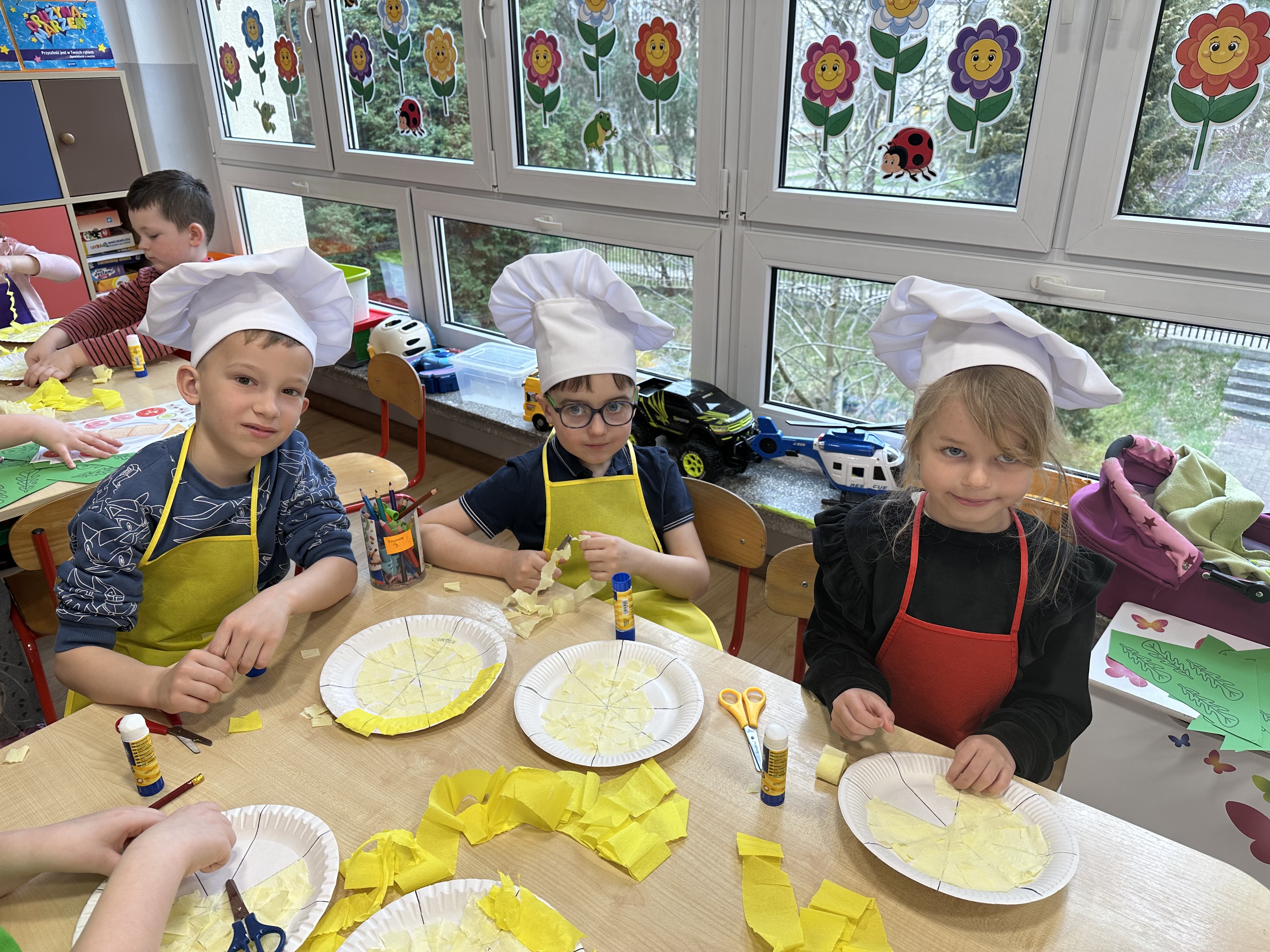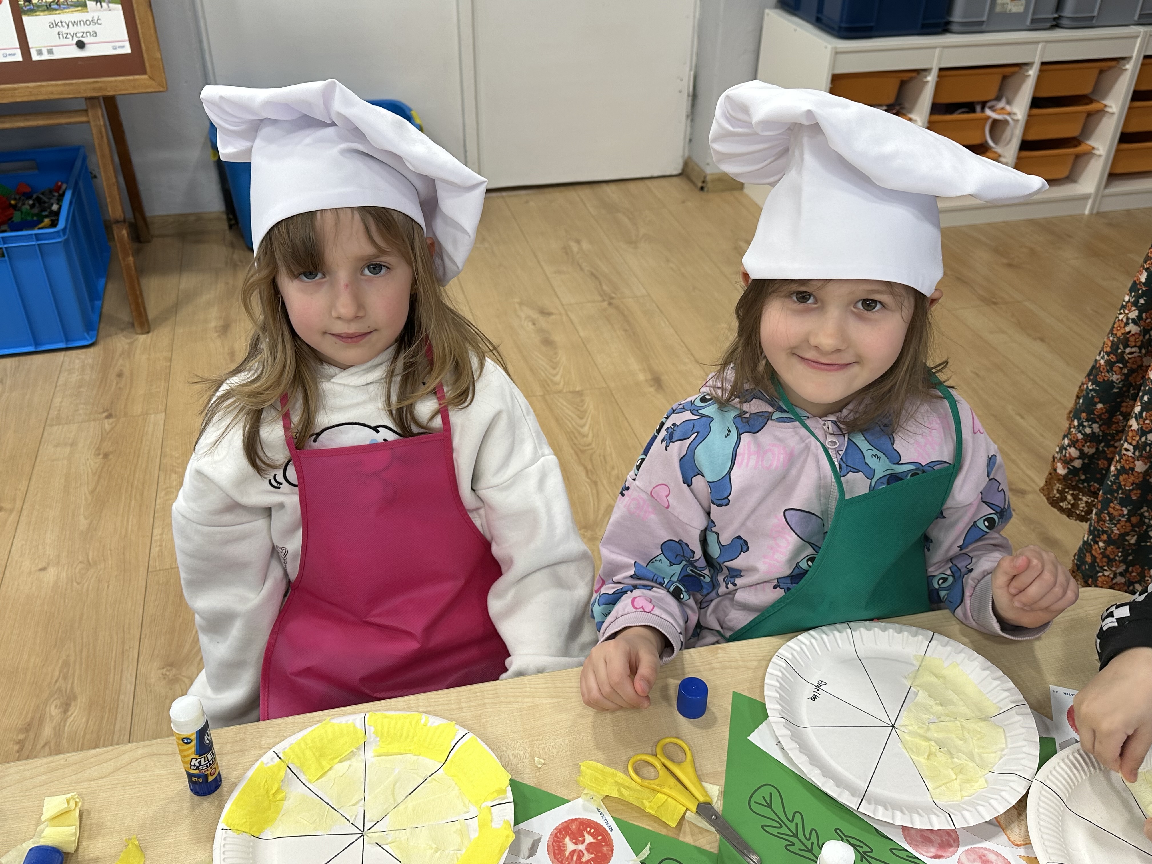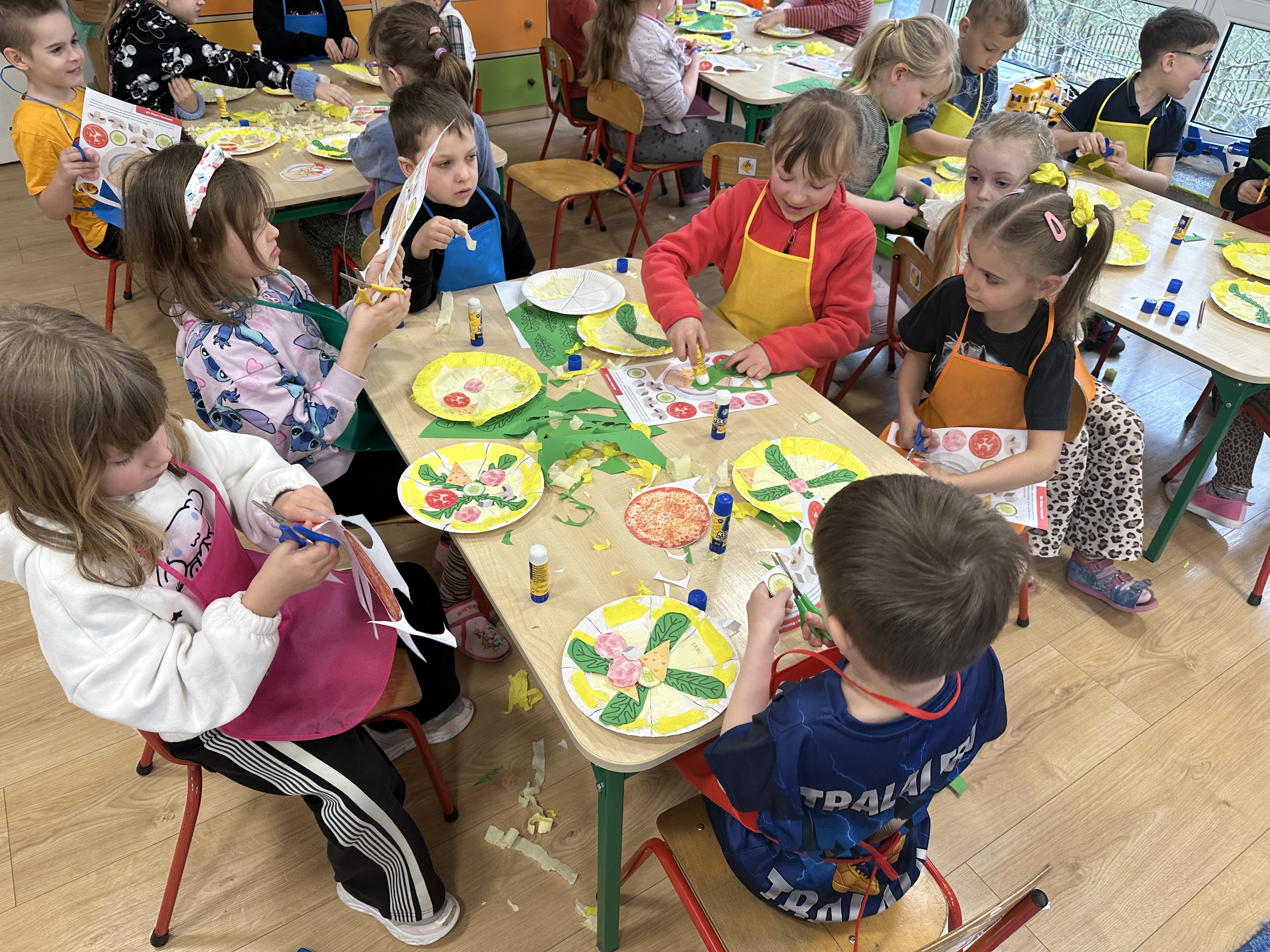 W trakcie zabawy tematycznej „Restauracja” dzieci wcieliły się w rolę kucharzy. Efektem ich pracy była kreatywna praca plastyczna - pizza z rukolą. Była to doskonała okazja do rozwijania wyobraźni oraz zainteresowania zdrowym odżywianiem.