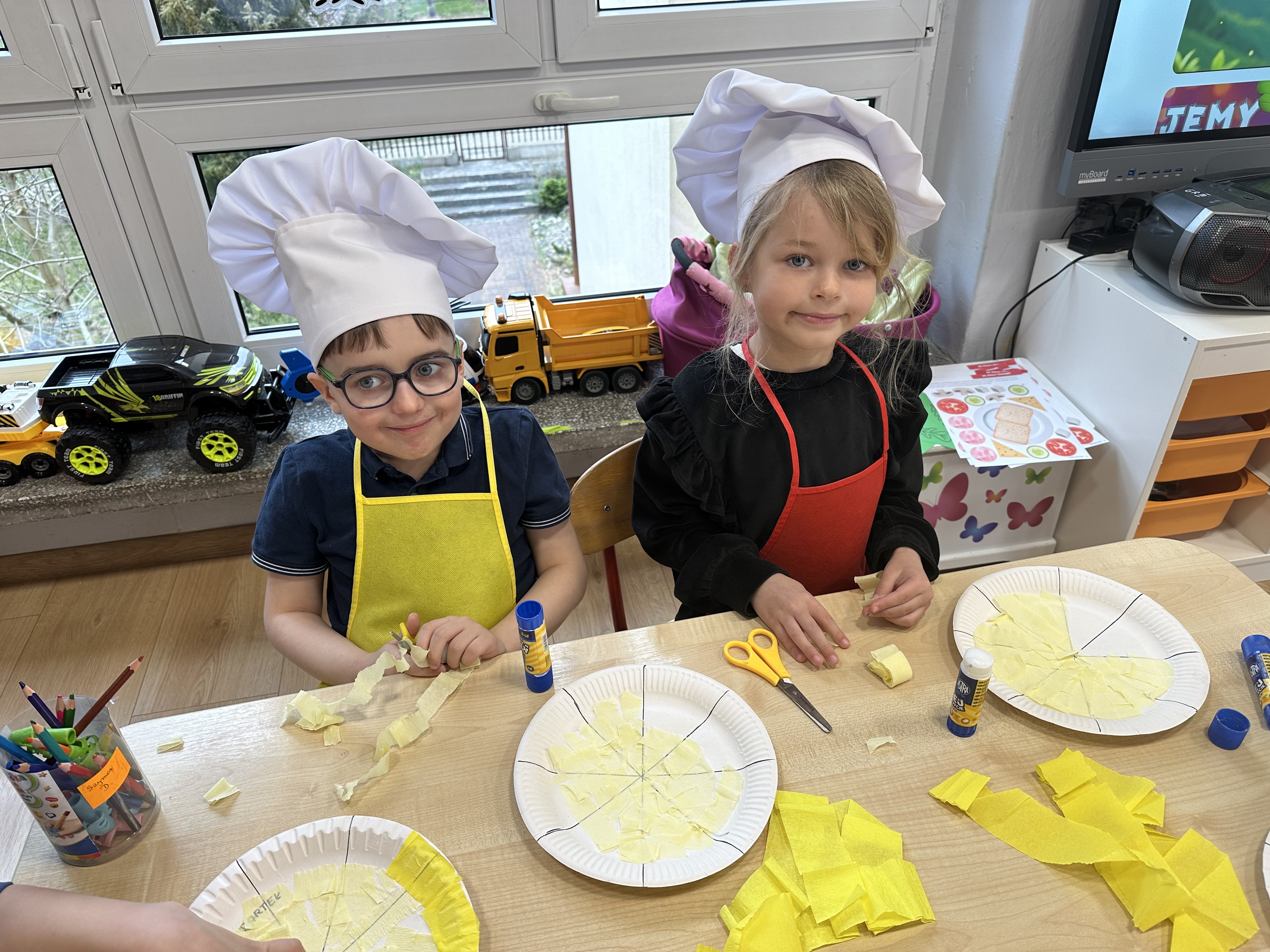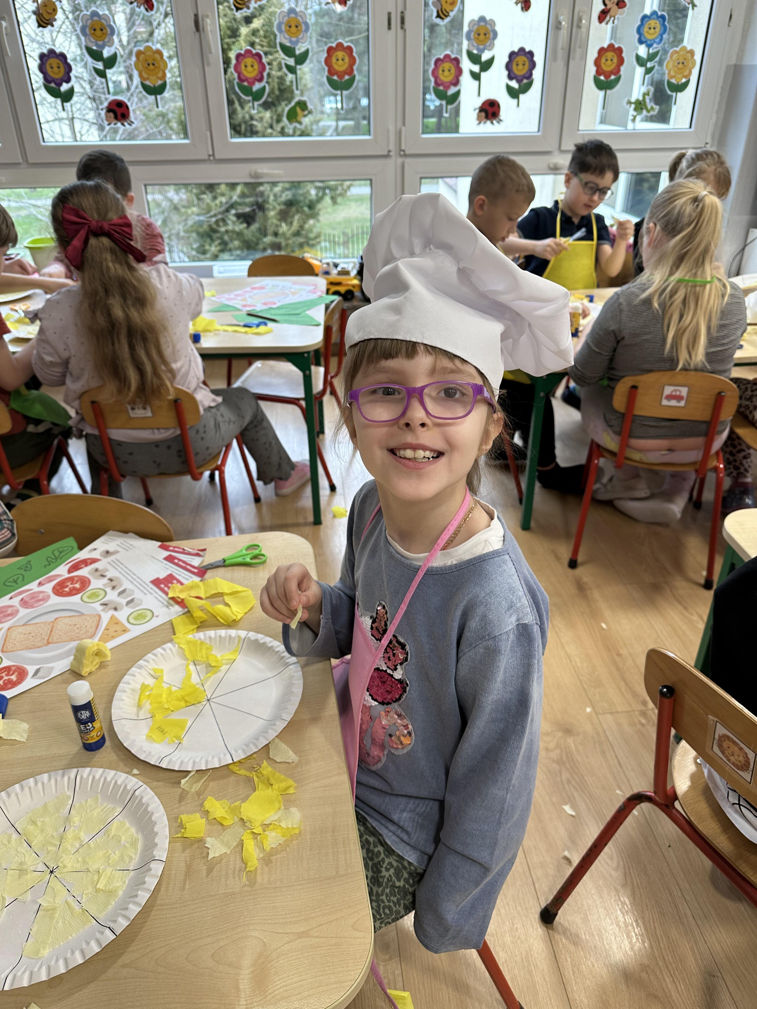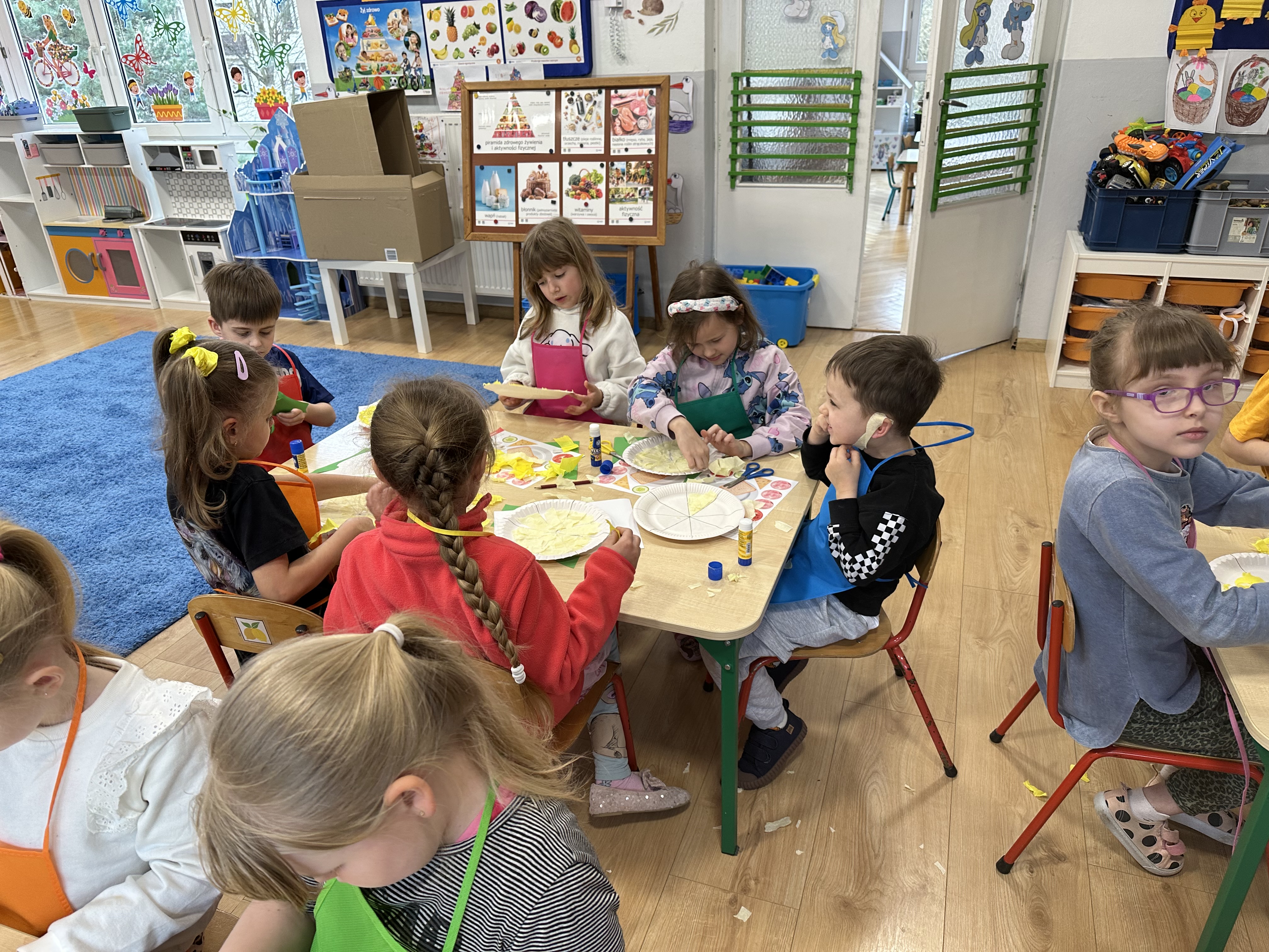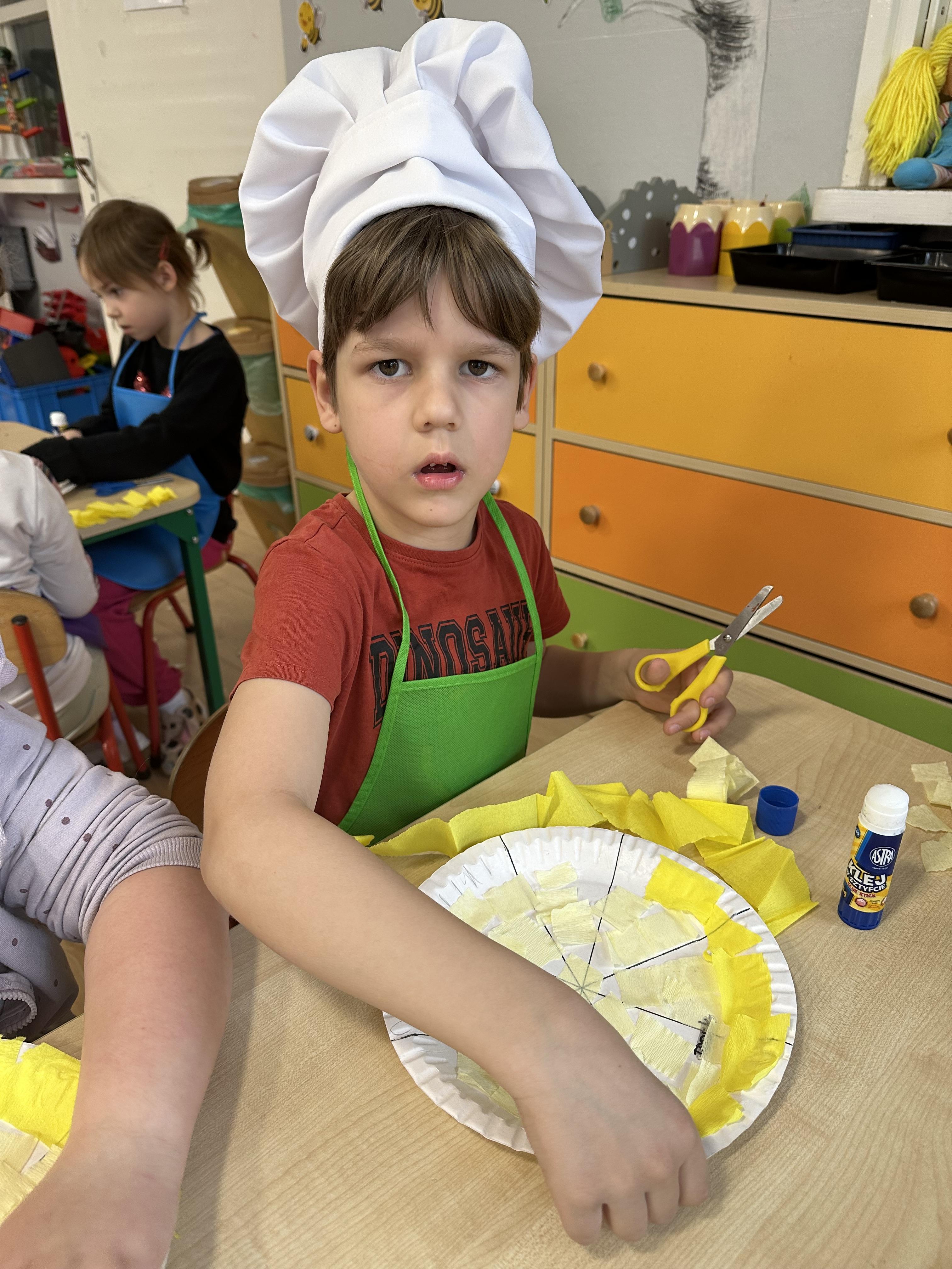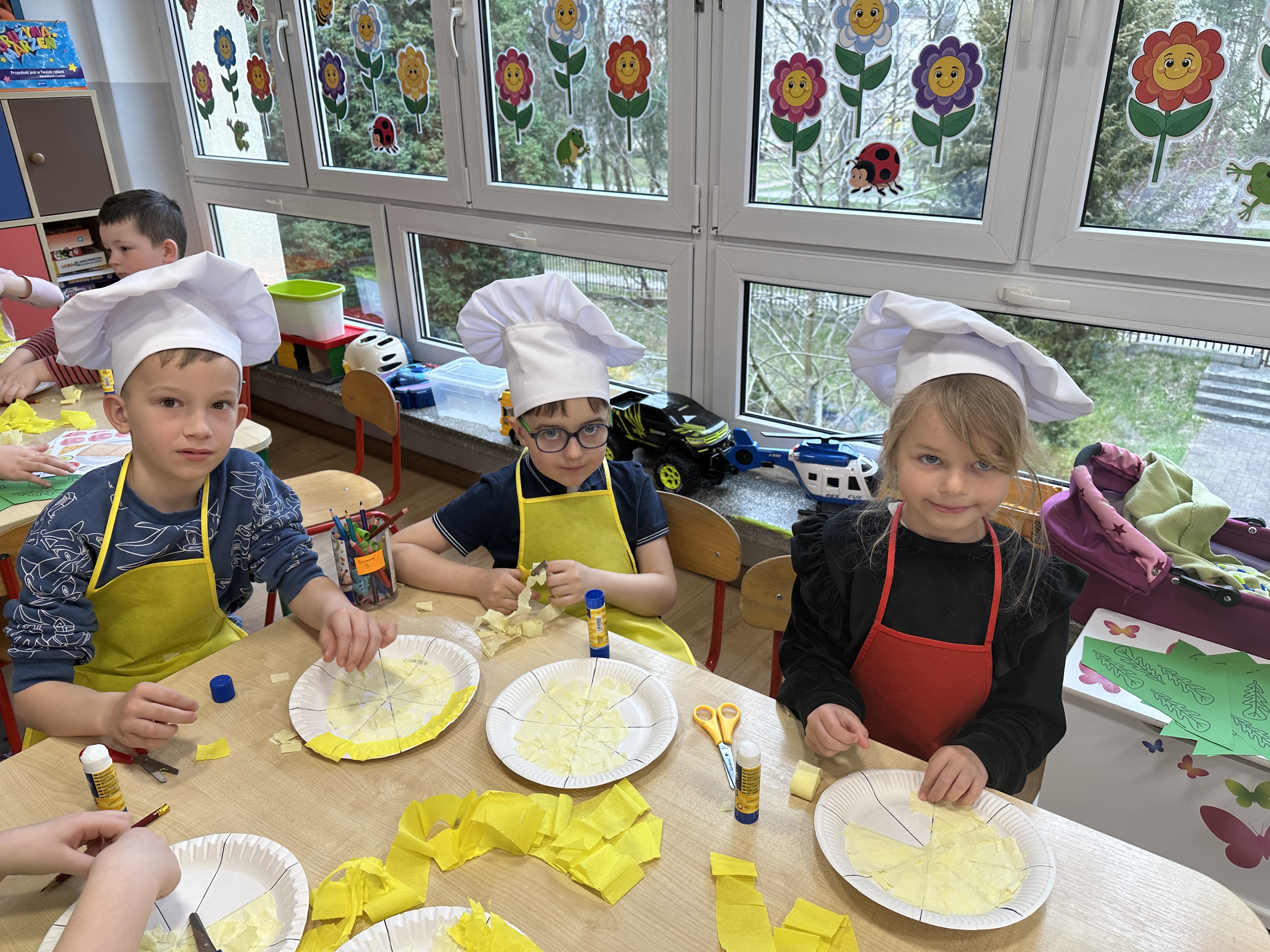 W trakcie zabawy tematycznej „Restauracja” dzieci wcieliły się w rolę kucharzy. Efektem ich pracy była kreatywna praca plastyczna - pizza z rukolą. Była to doskonała okazja do rozwijania wyobraźni oraz zainteresowania zdrowym odżywianiem.