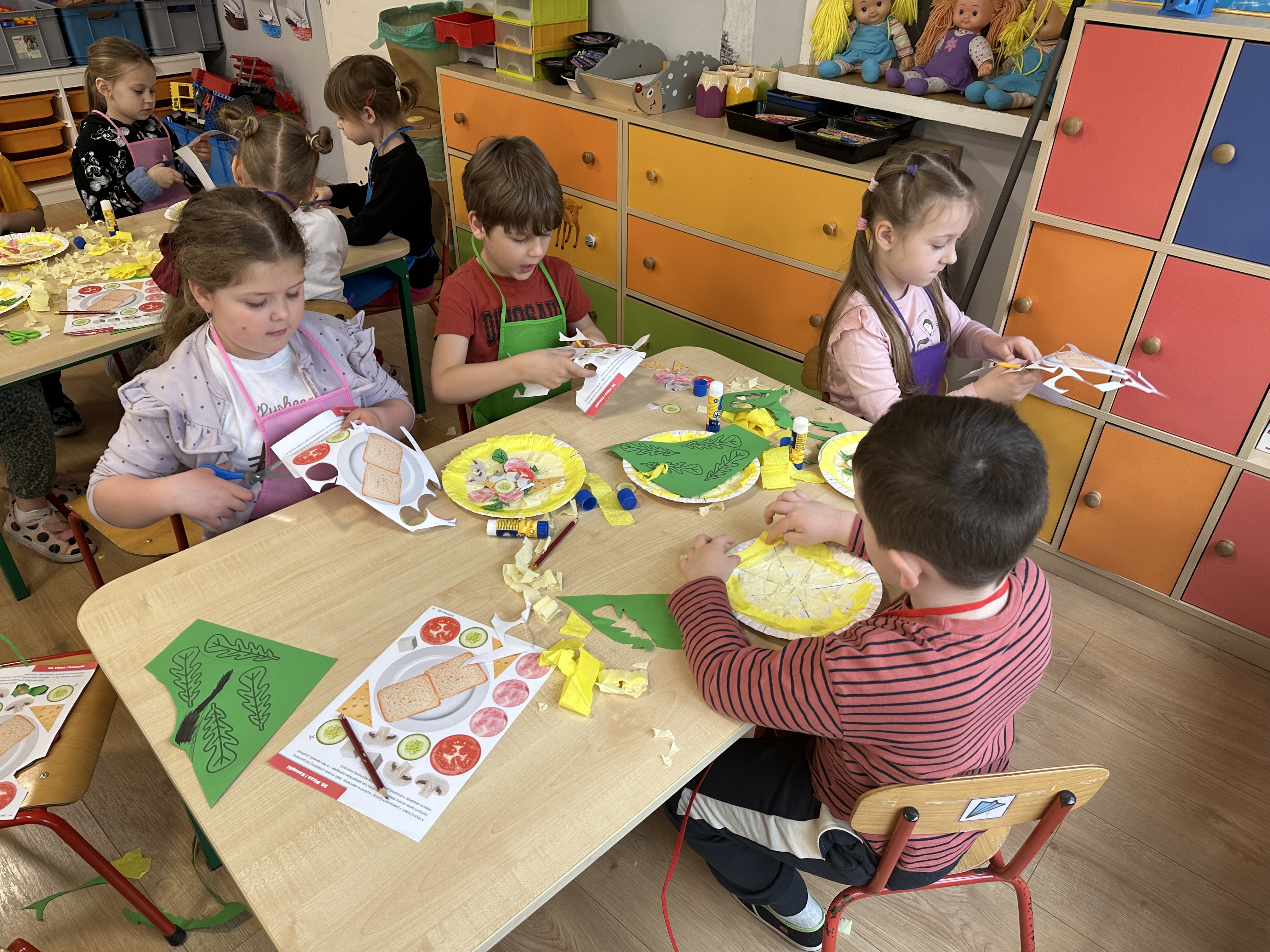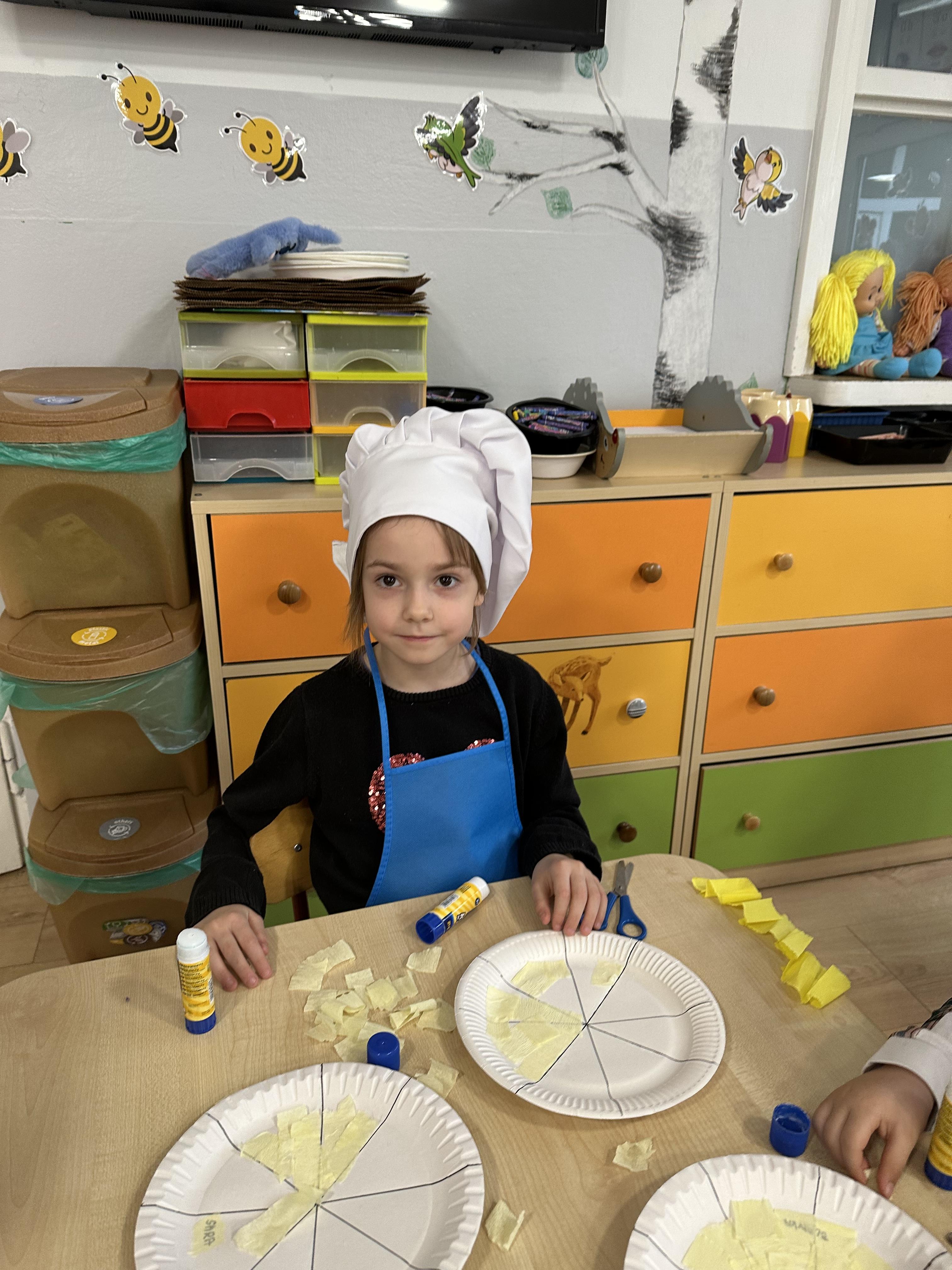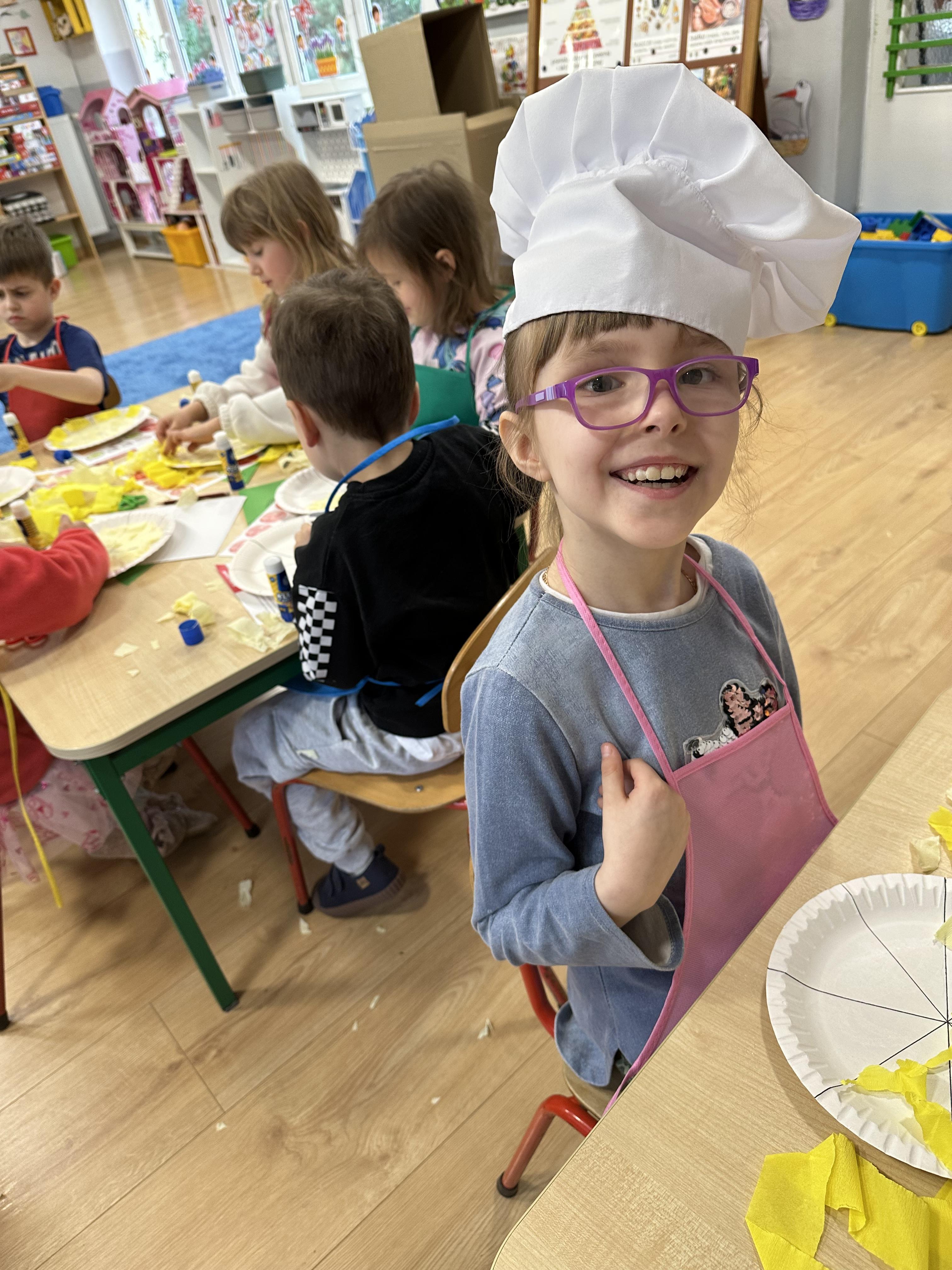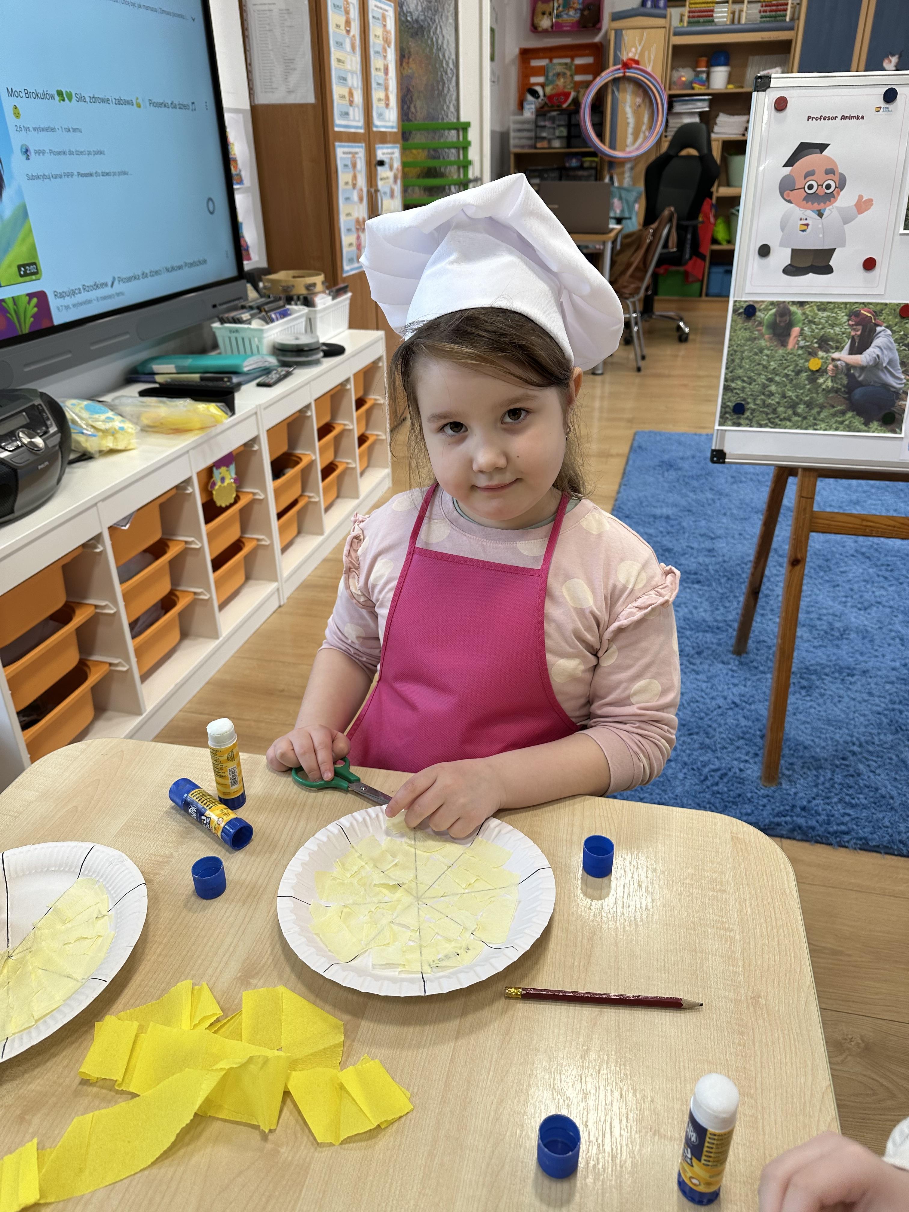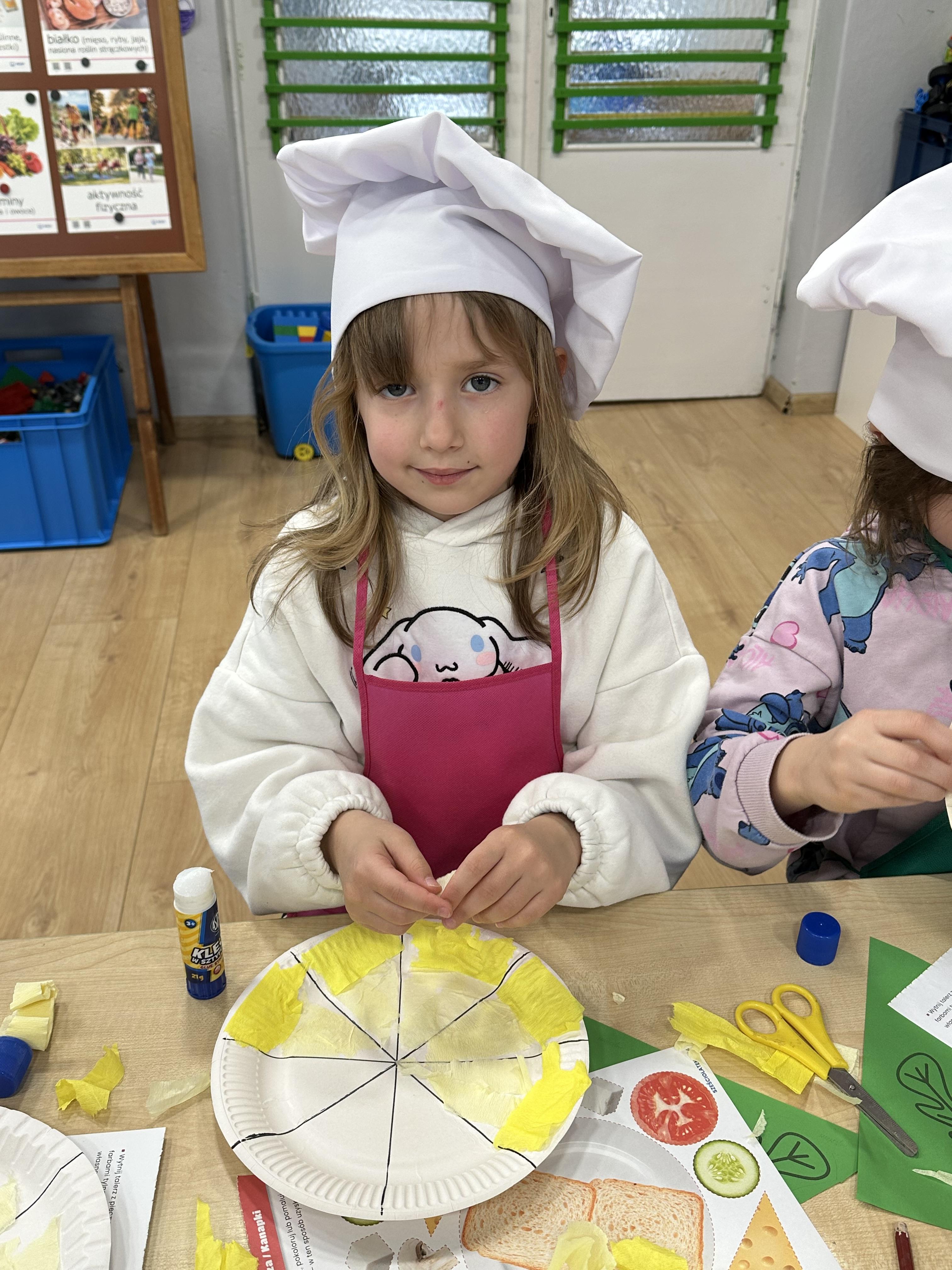 W trakcie zabawy tematycznej „Restauracja” dzieci wcieliły się w rolę kucharzy. Efektem ich pracy była kreatywna praca plastyczna - pizza z rukolą. Była to doskonała okazja do rozwijania wyobraźni oraz zainteresowania zdrowym odżywianiem.