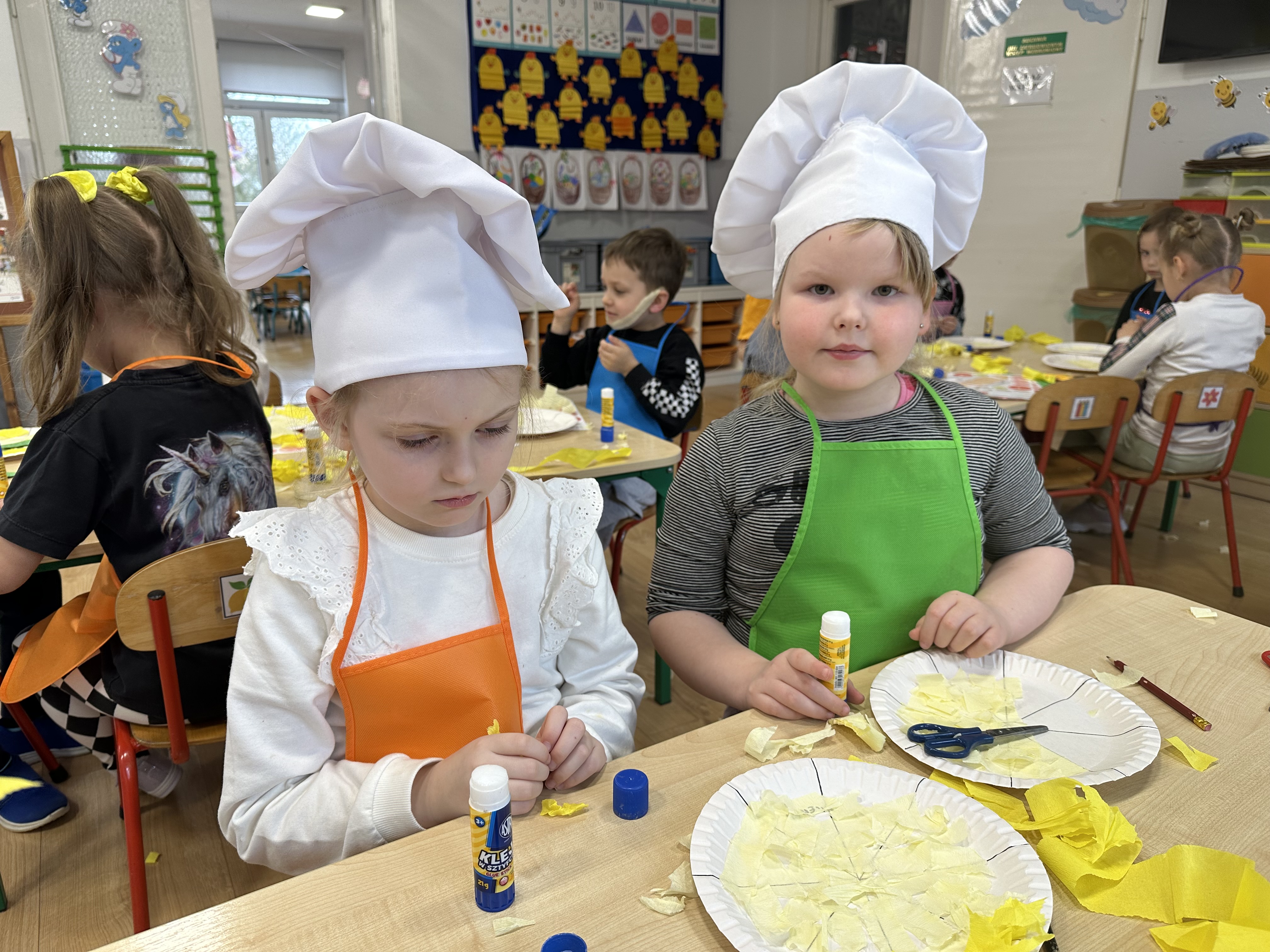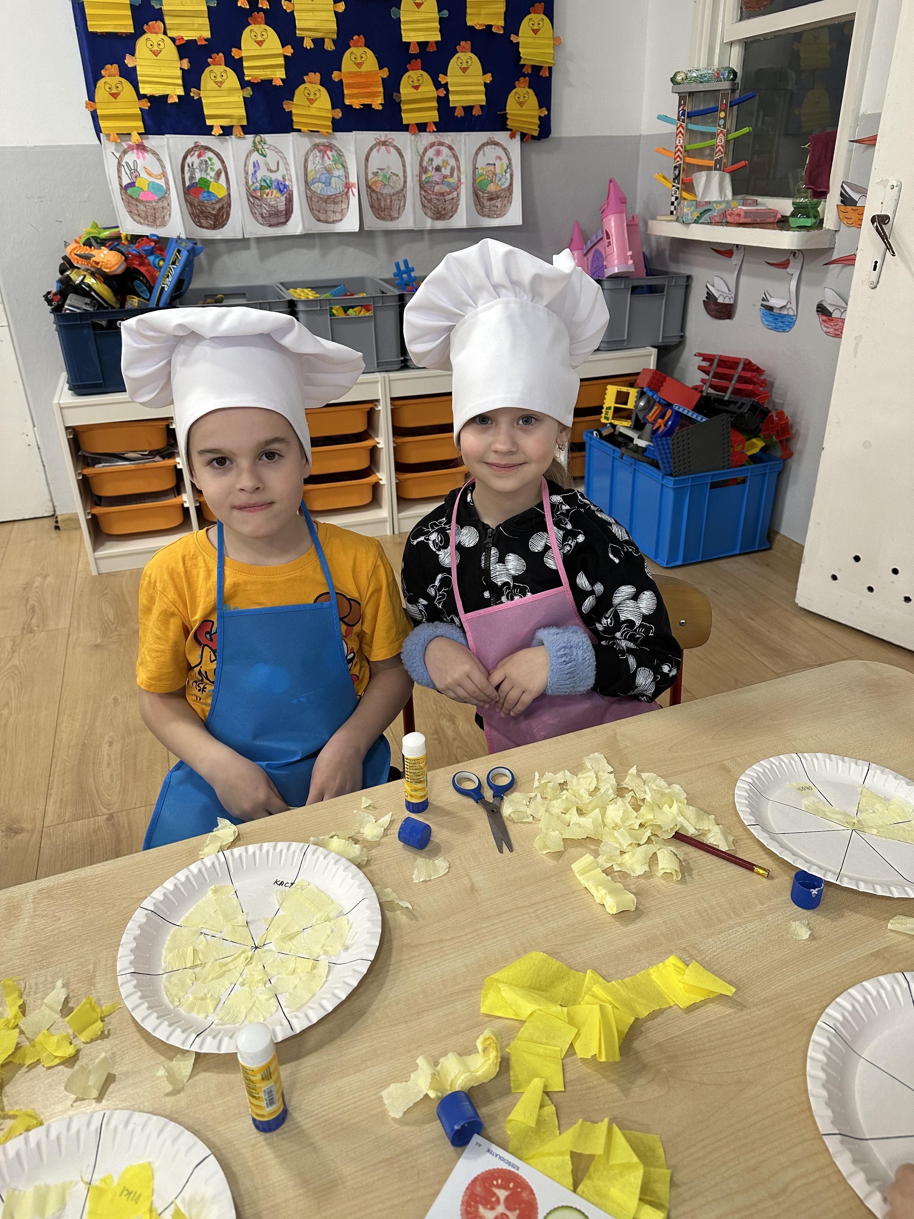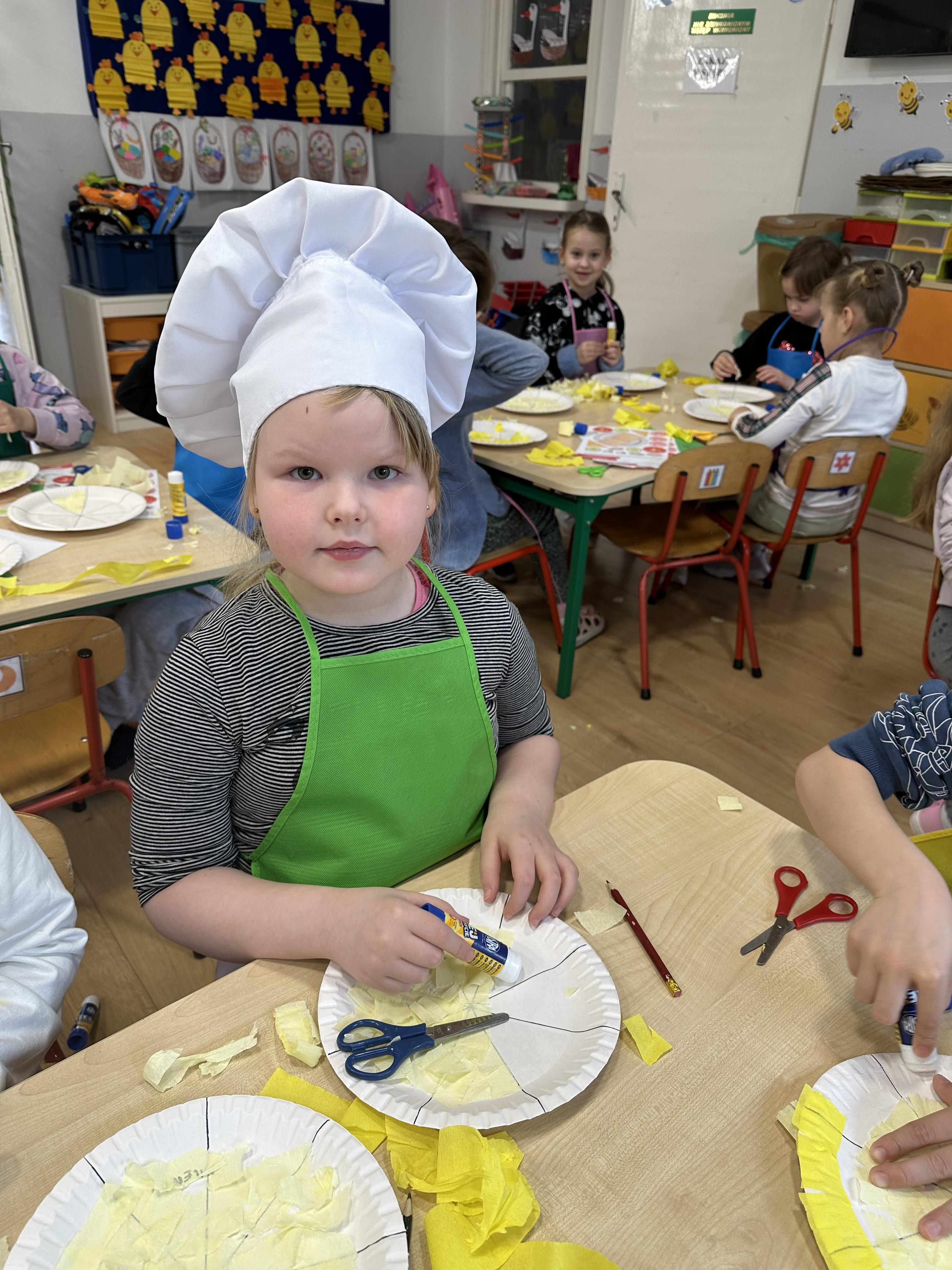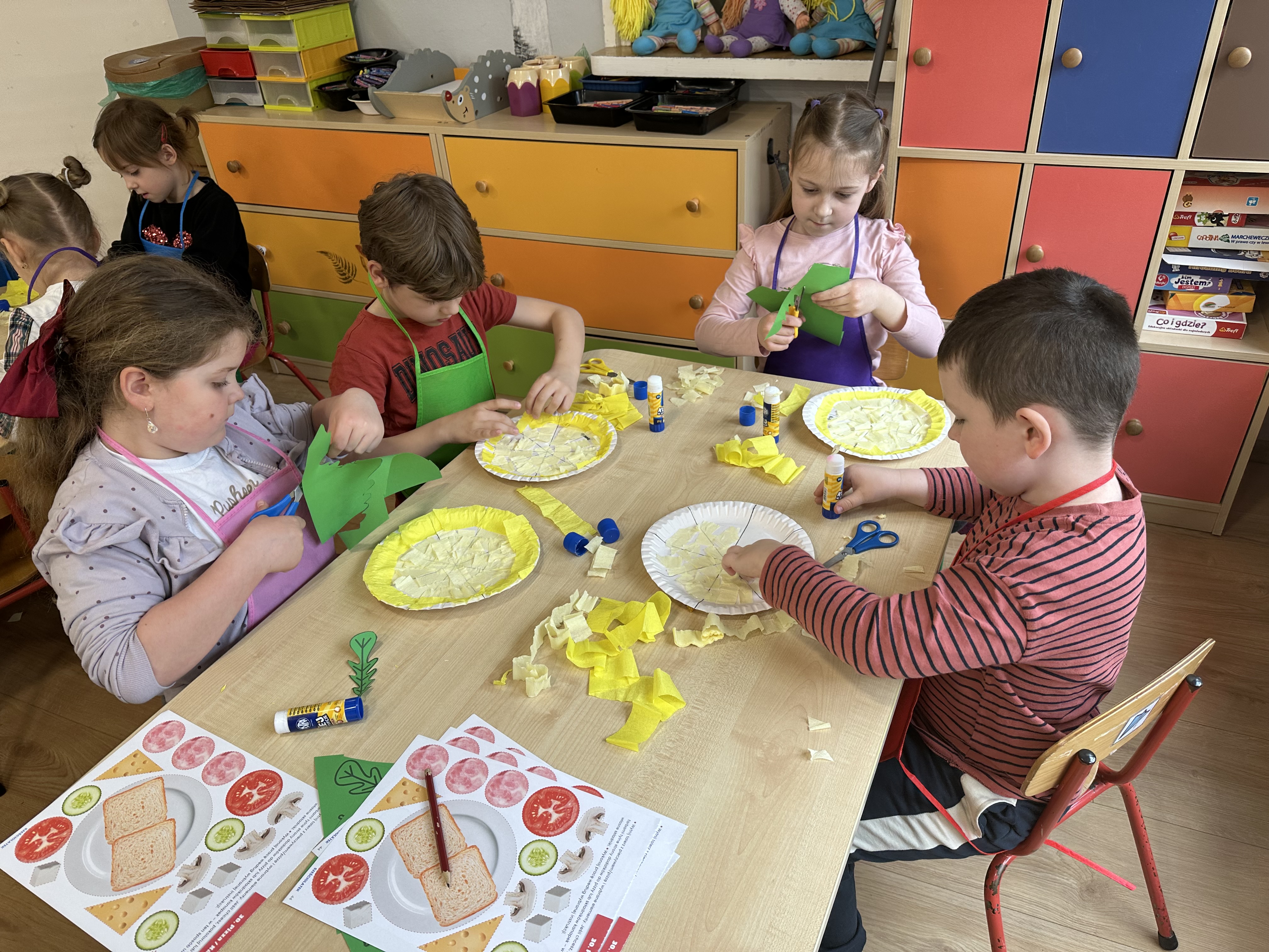 W trakcie zabawy tematycznej „Restauracja” dzieci wcieliły się w rolę kucharzy. Efektem ich pracy była kreatywna praca plastyczna - pizza z rukolą. Była to doskonała okazja do rozwijania wyobraźni oraz zainteresowania zdrowym odżywianiem.