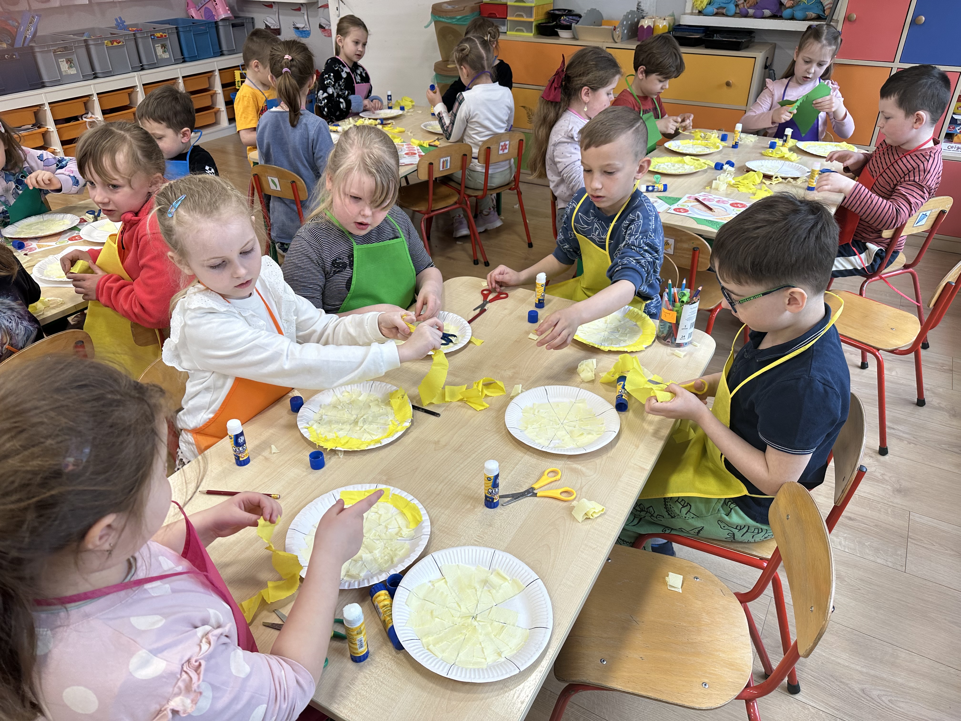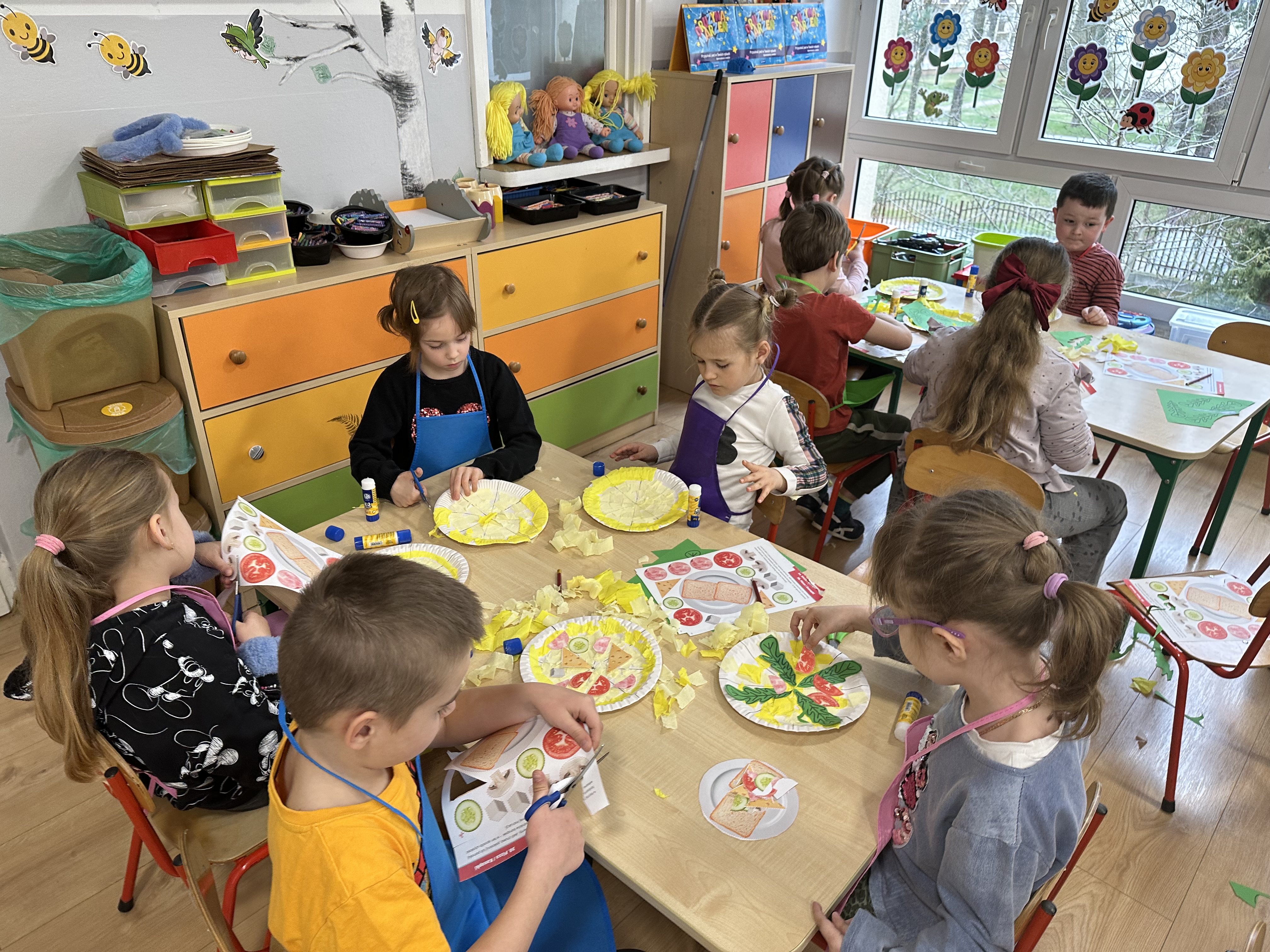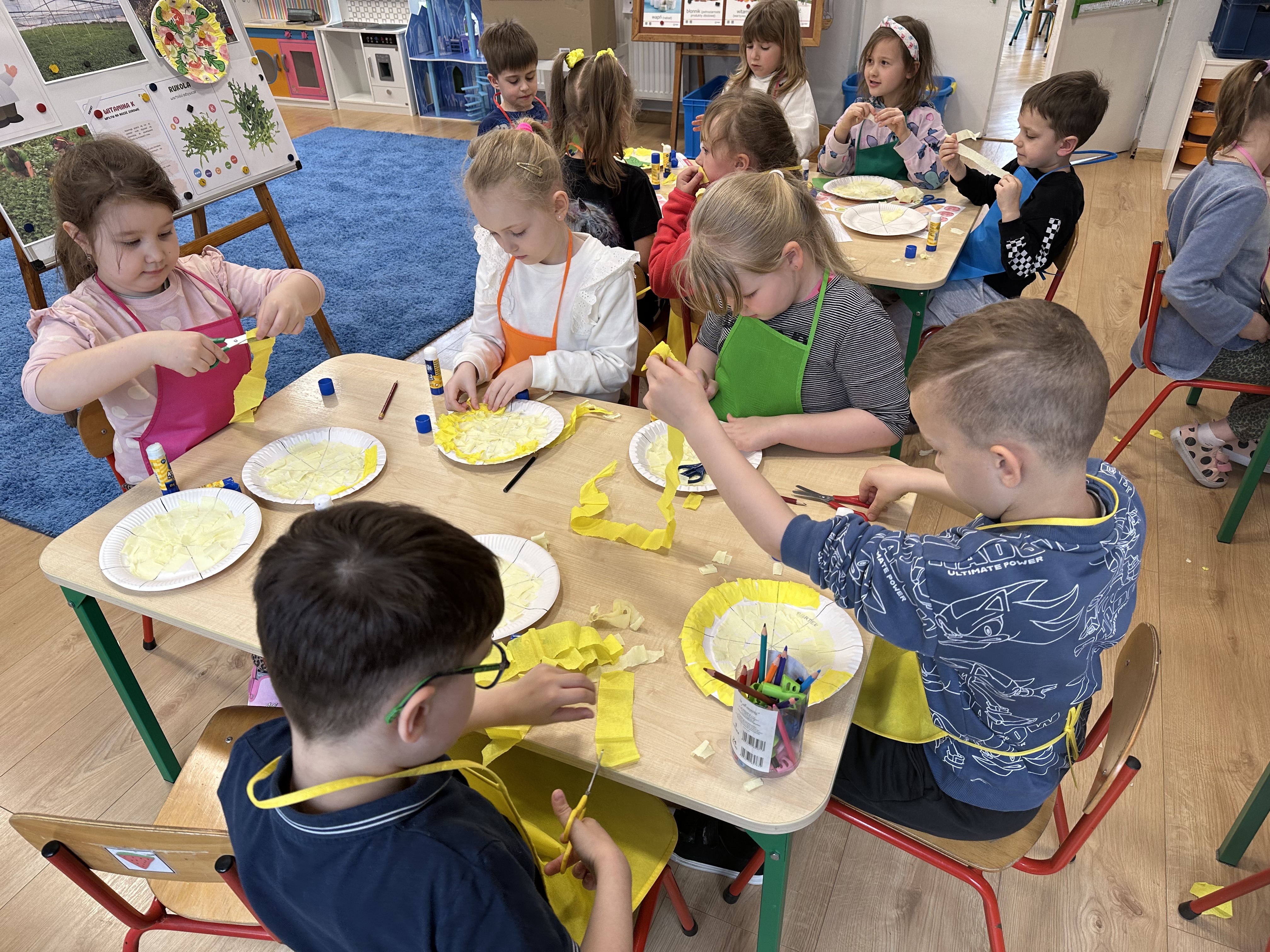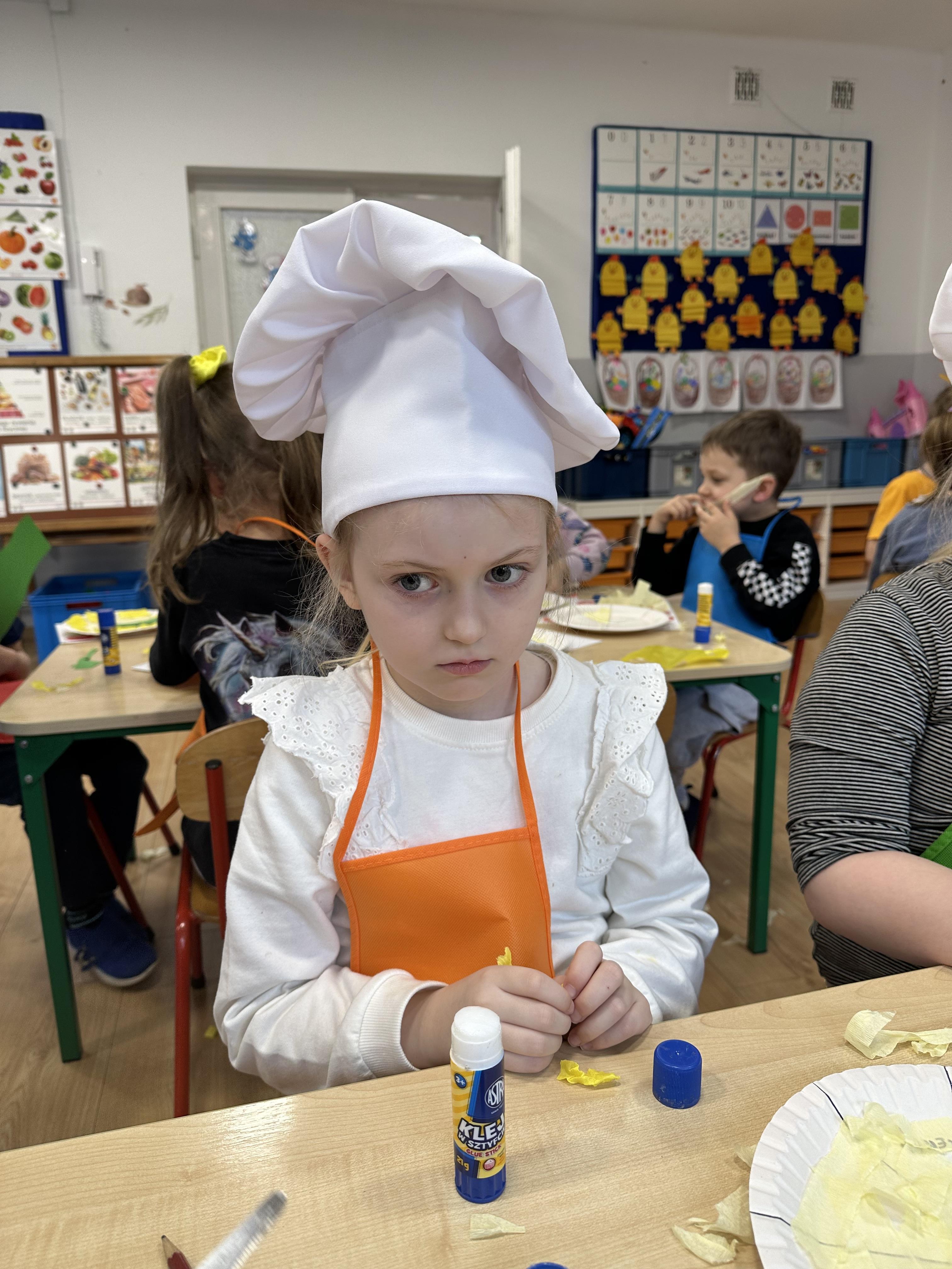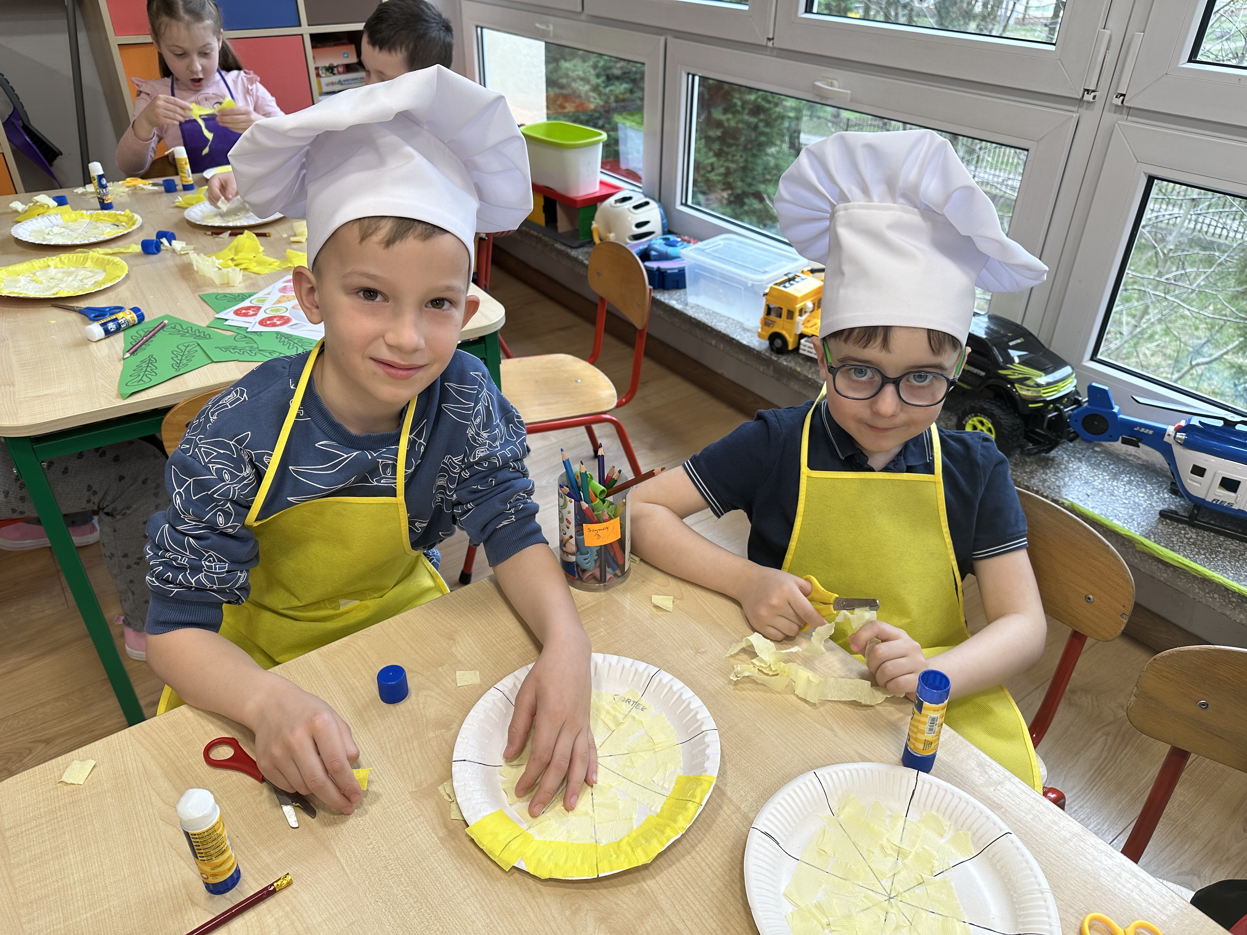 W trakcie zabawy tematycznej „Restauracja” dzieci wcieliły się w rolę kucharzy. Efektem ich pracy była kreatywna praca plastyczna - pizza z rukolą. Była to doskonała okazja do rozwijania wyobraźni oraz zainteresowania zdrowym odżywianiem.