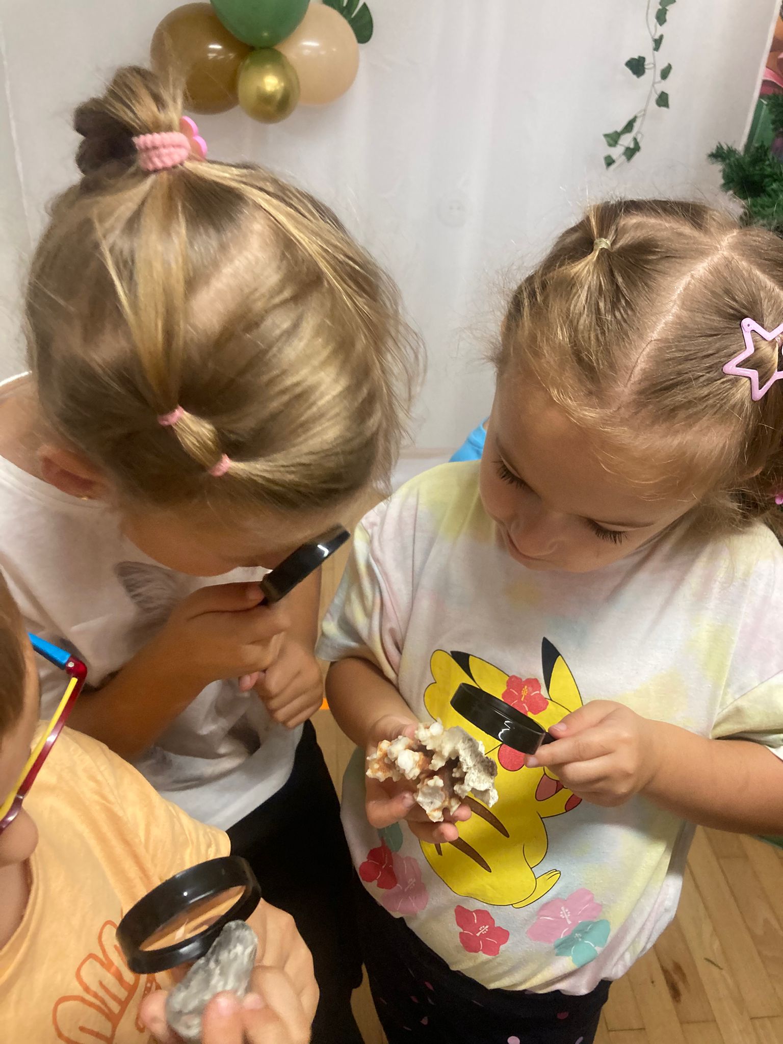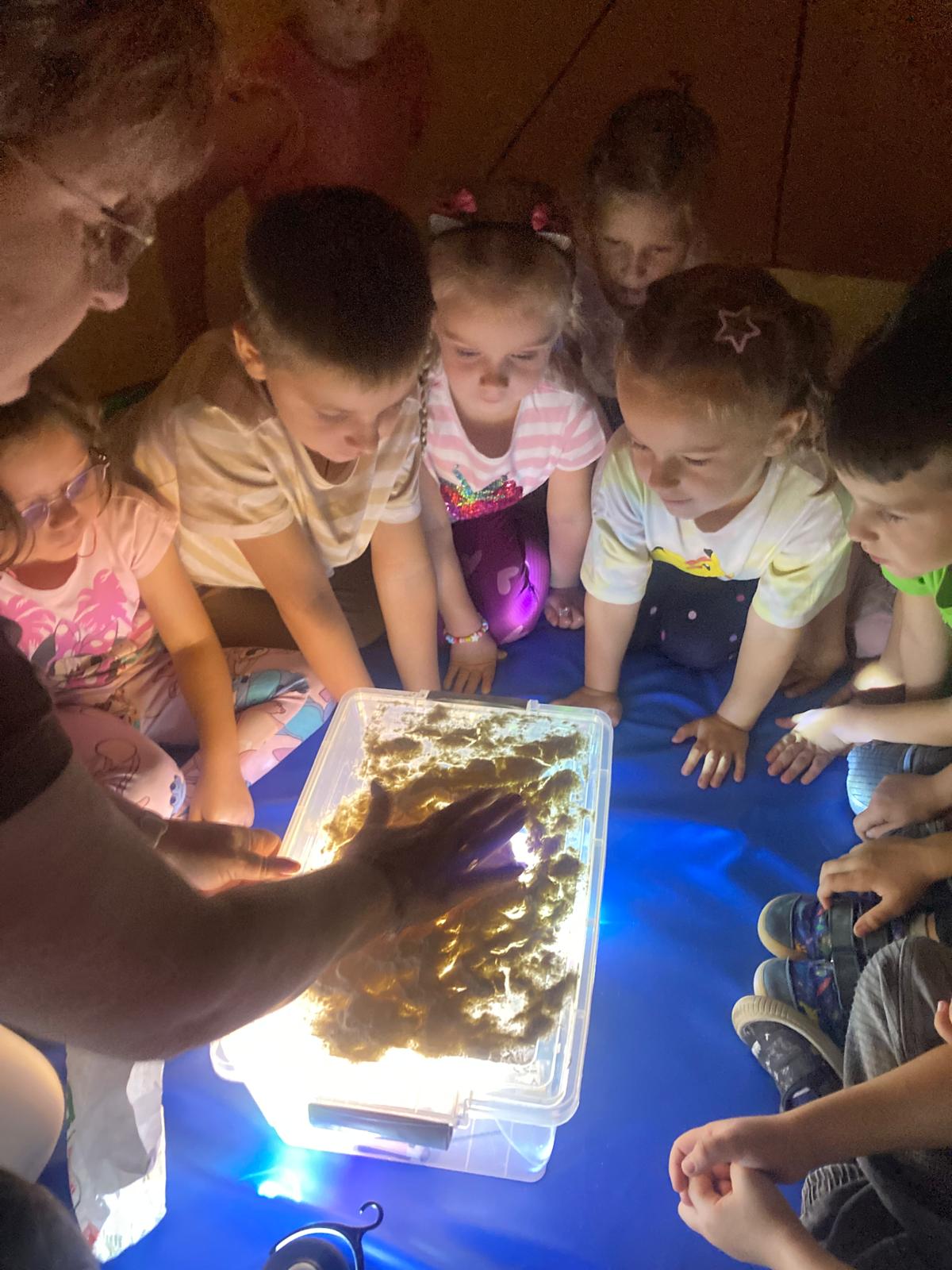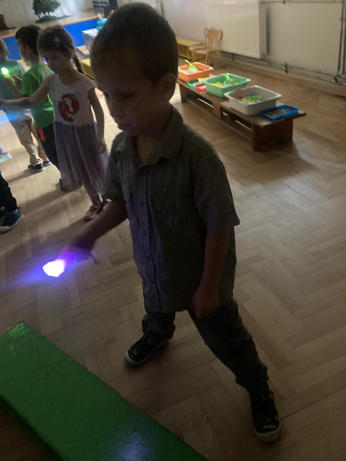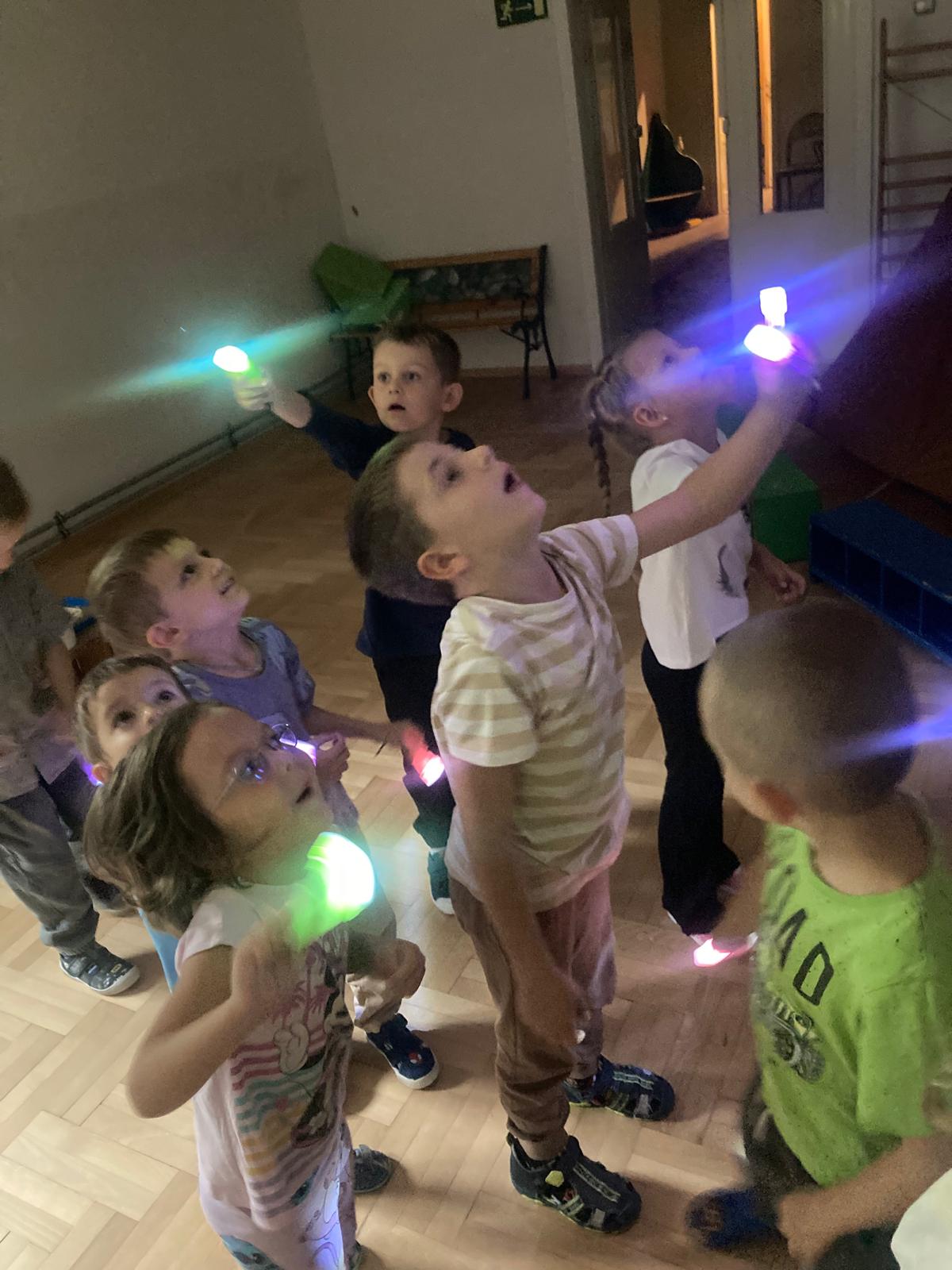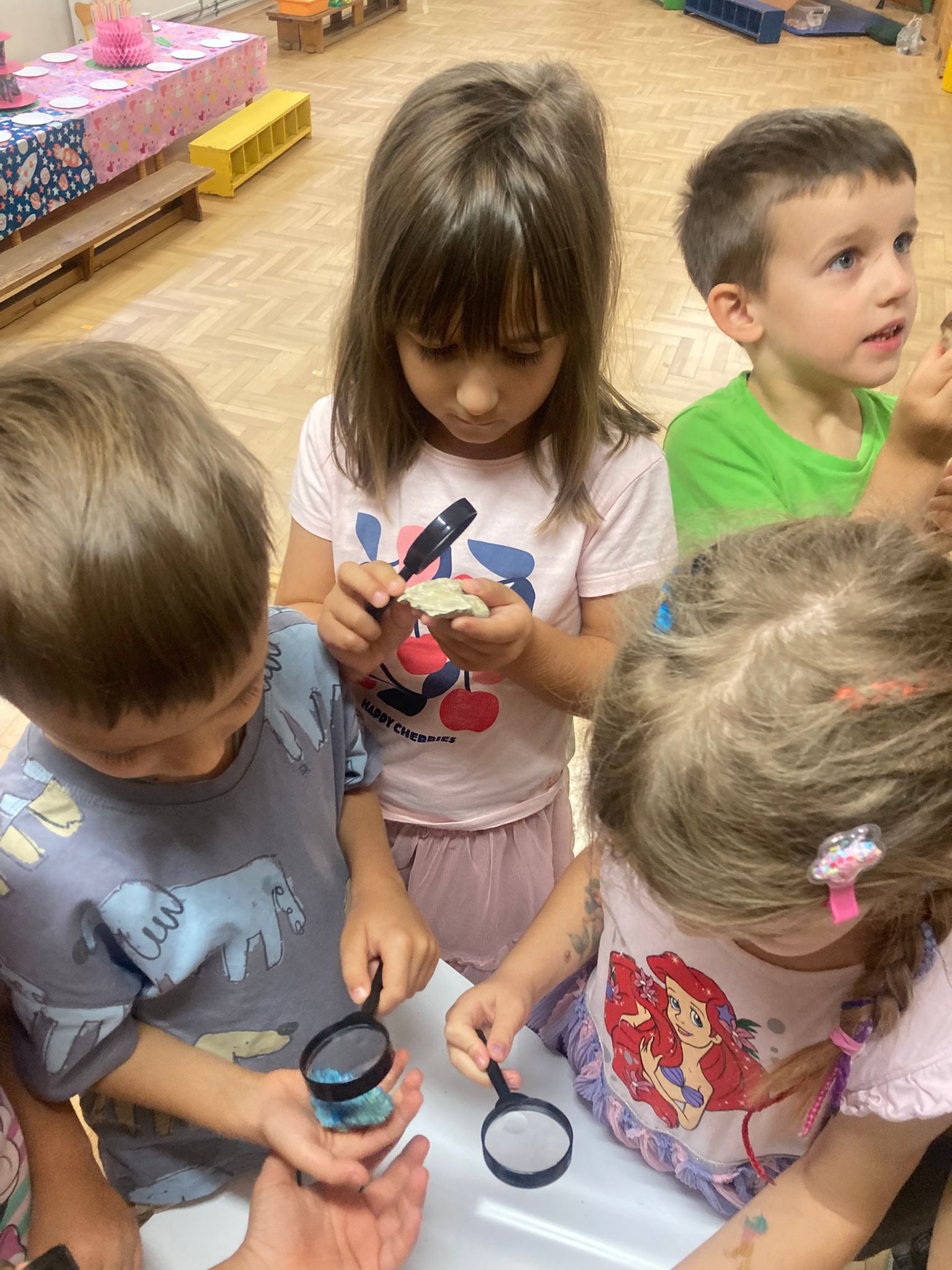 Ten dzień był pełen ciekawych zdarzeń. Pani Dyrektor pasowala dzieciaki na prawdziwych przedszkolakóŵ z grupy ODKRYWCY! Jak nazwa mówi odkrywlismy dziś świat wielozmysłowo sensorycznie.Ogladaliśmy skalne okazy przez lupę, odzyskiwalismy cząsteczki "złota"z piasku,bawiliśmy się światłem, puszczaliśmy zajączki na ścianie , tworzyliśmy obrazy na podświetlanym stoliku svhowani w namiocie.W leśnej scenografii szukaliśmy skarbu do ktorego doprowadziły nas zabawy z leśnymi zwierzątkami.Urodziny grupy ODKRYWCÓW uczcliśmy słodkosciami za które dziękujemy kochanym Rodzicom.Oczywiście nie brakło pamiątkowych fotek do których oglądania serdecznie zapraszamy.