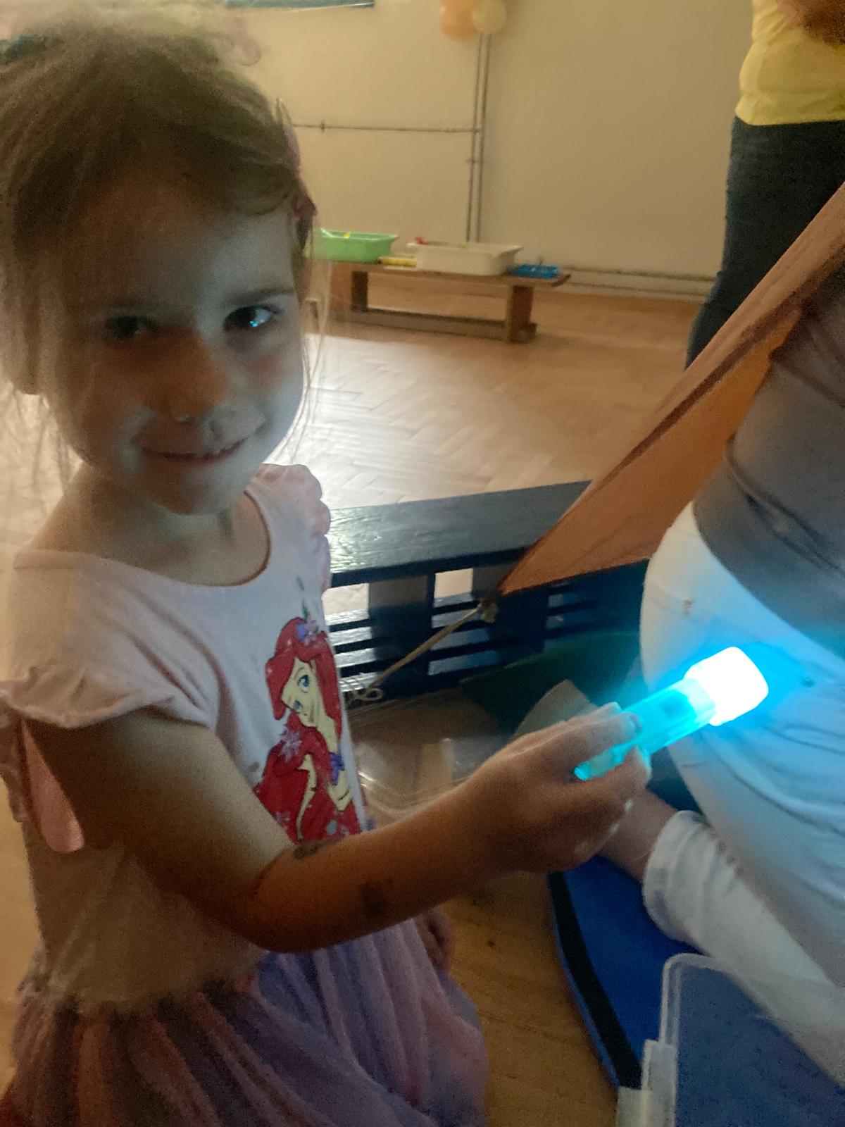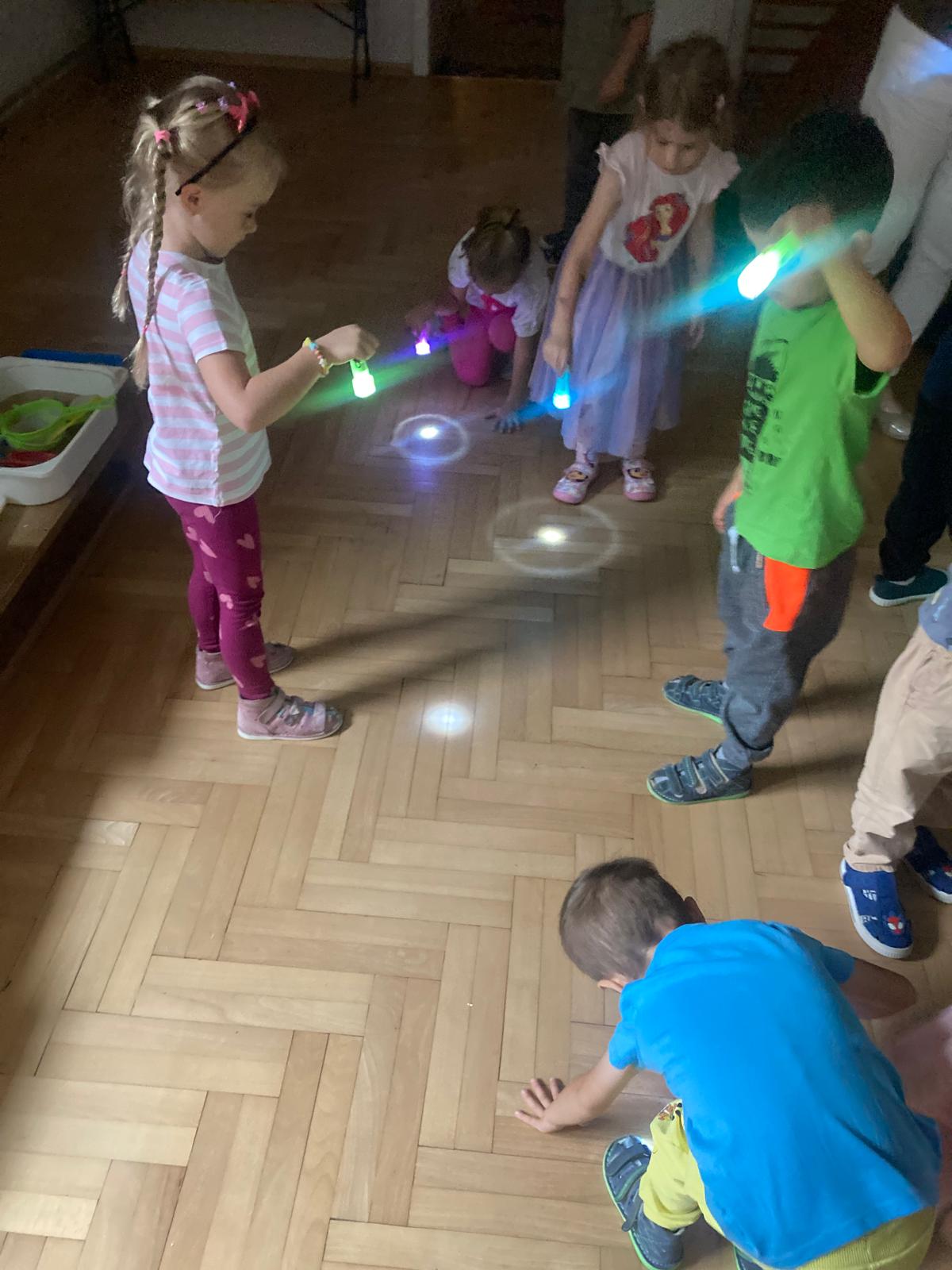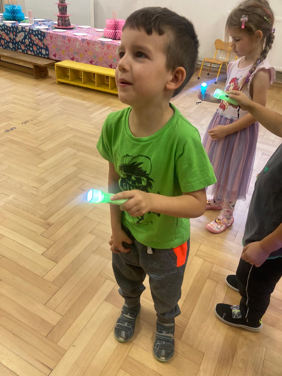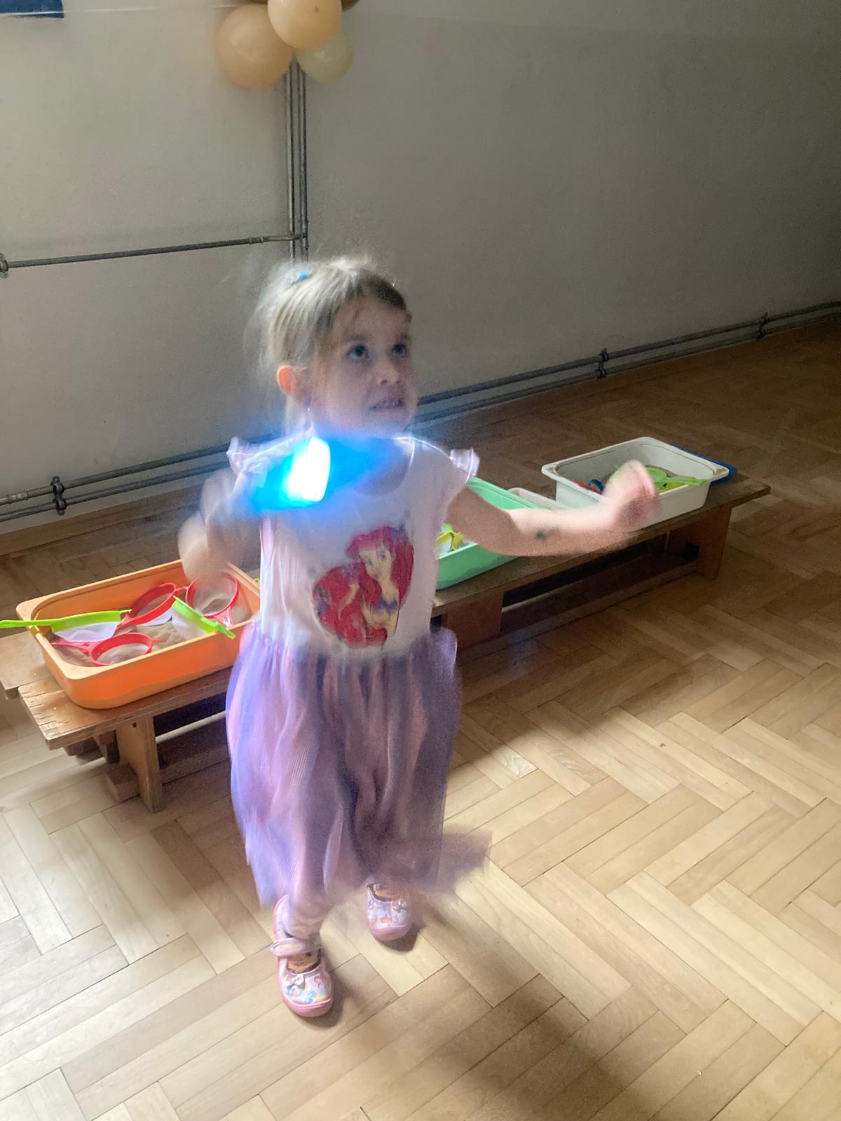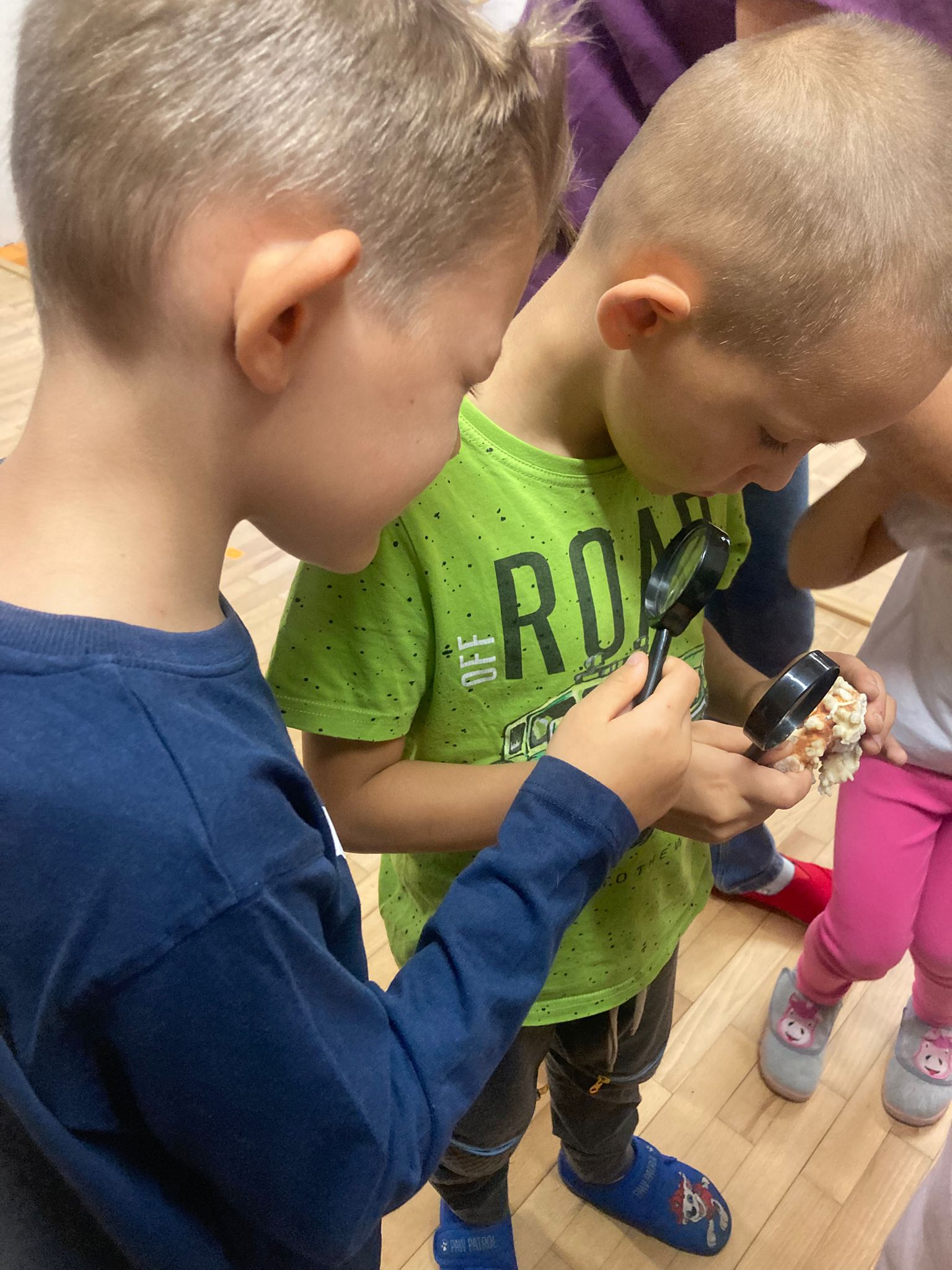 Ten dzień był pełen ciekawych zdarzeń. Pani Dyrektor pasowala dzieciaki na prawdziwych przedszkolakóŵ z grupy ODKRYWCY! Jak nazwa mówi odkrywlismy dziś świat wielozmysłowo sensorycznie.Ogladaliśmy skalne okazy przez lupę, odzyskiwalismy cząsteczki "złota"z piasku,bawiliśmy się światłem, puszczaliśmy zajączki na ścianie , tworzyliśmy obrazy na podświetlanym stoliku svhowani w namiocie.W leśnej scenografii szukaliśmy skarbu do ktorego doprowadziły nas zabawy z leśnymi zwierzątkami.Urodziny grupy ODKRYWCÓW uczcliśmy słodkosciami za które dziękujemy kochanym Rodzicom.Oczywiście nie brakło pamiątkowych fotek do których oglądania serdecznie zapraszamy.