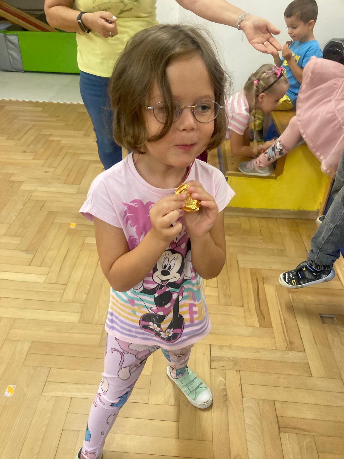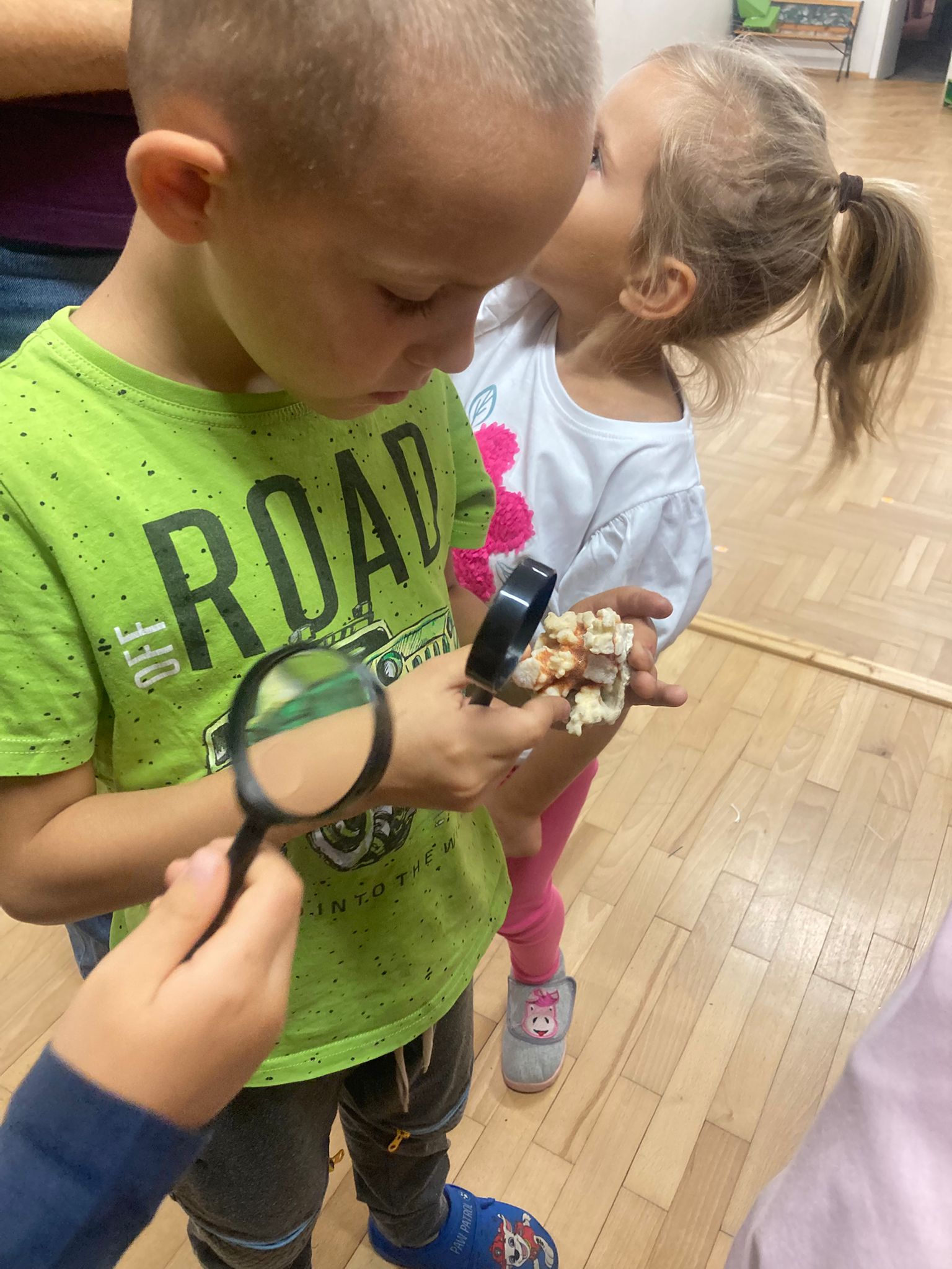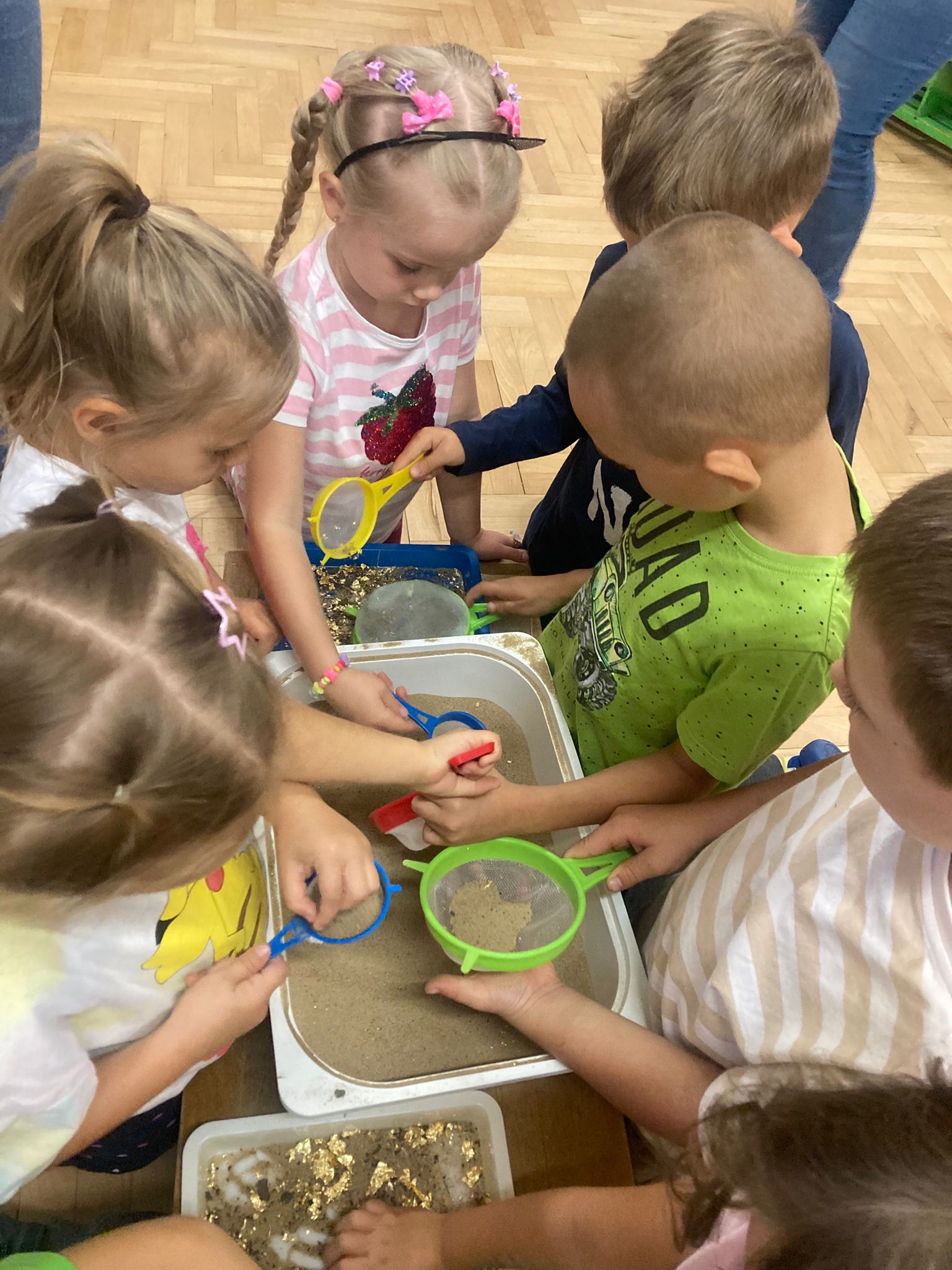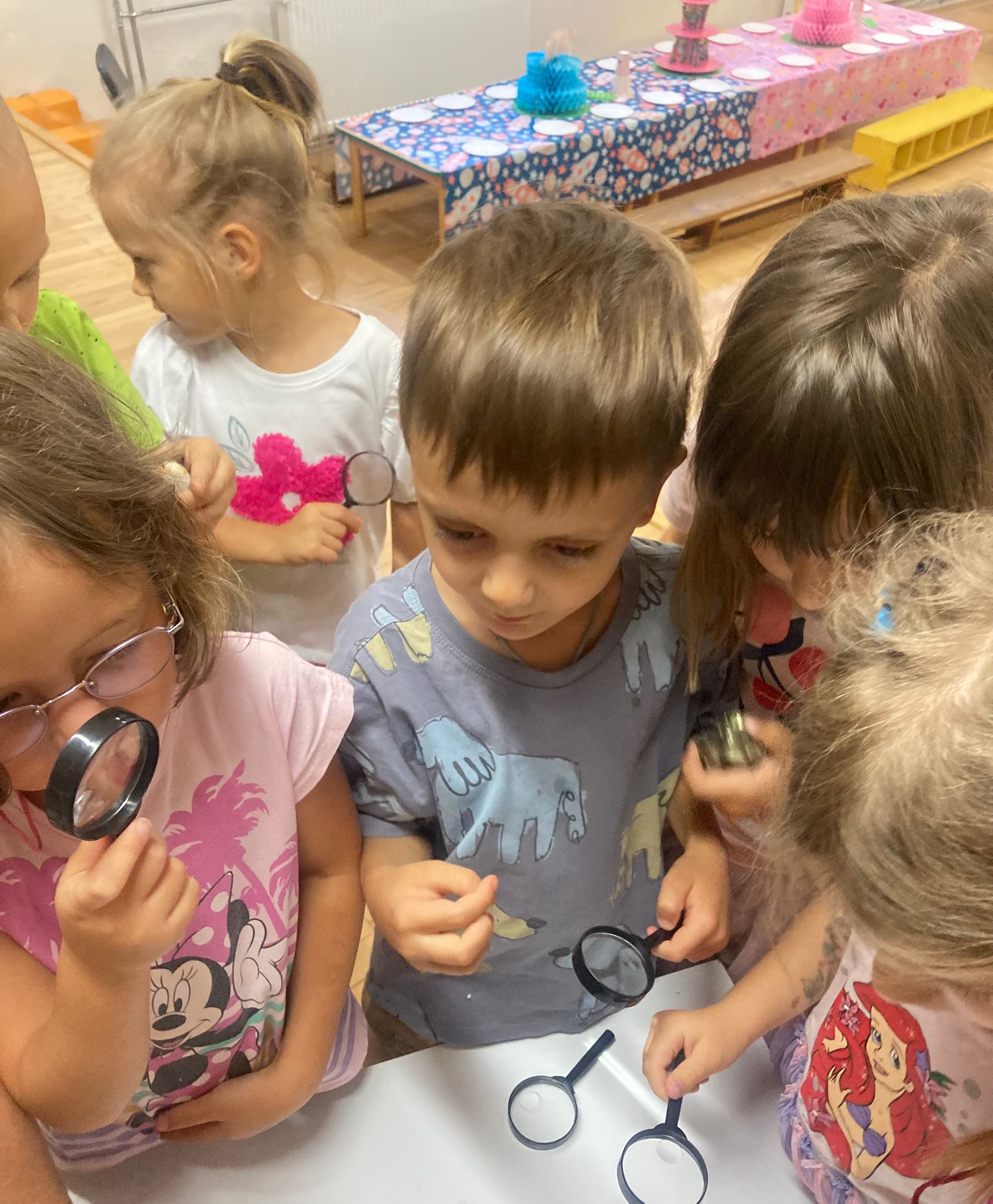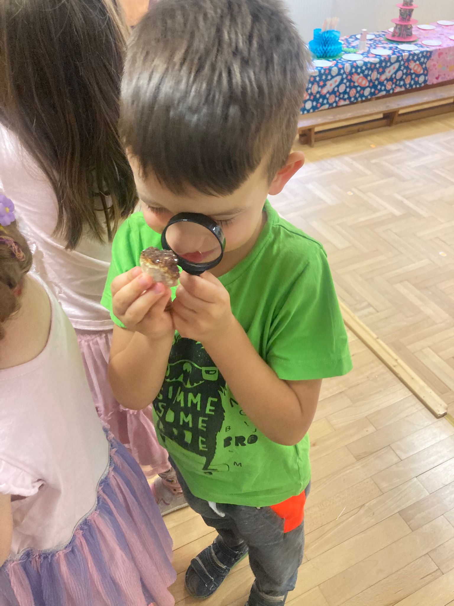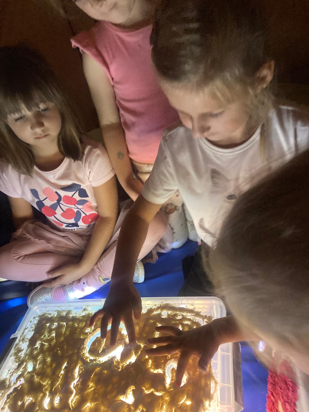 Ten dzień był pełen ciekawych zdarzeń. Pani Dyrektor pasowala dzieciaki na prawdziwych przedszkolakóŵ z grupy ODKRYWCY! Jak nazwa mówi odkrywlismy dziś świat wielozmysłowo sensorycznie.Ogladaliśmy skalne okazy przez lupę, odzyskiwalismy cząsteczki "złota"z piasku,bawiliśmy się światłem, puszczaliśmy zajączki na ścianie , tworzyliśmy obrazy na podświetlanym stoliku svhowani w namiocie.W leśnej scenografii szukaliśmy skarbu do ktorego doprowadziły nas zabawy z leśnymi zwierzątkami.Urodziny grupy ODKRYWCÓW uczcliśmy słodkosciami za które dziękujemy kochanym Rodzicom.Oczywiście nie brakło pamiątkowych fotek do których oglądania serdecznie zapraszamy.