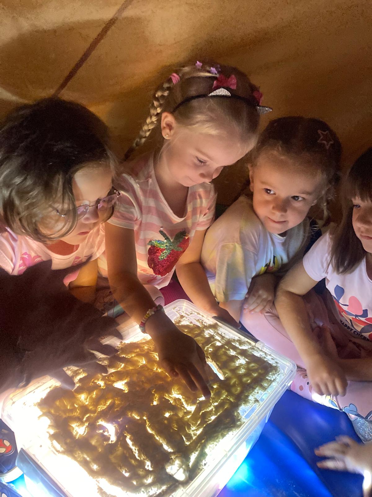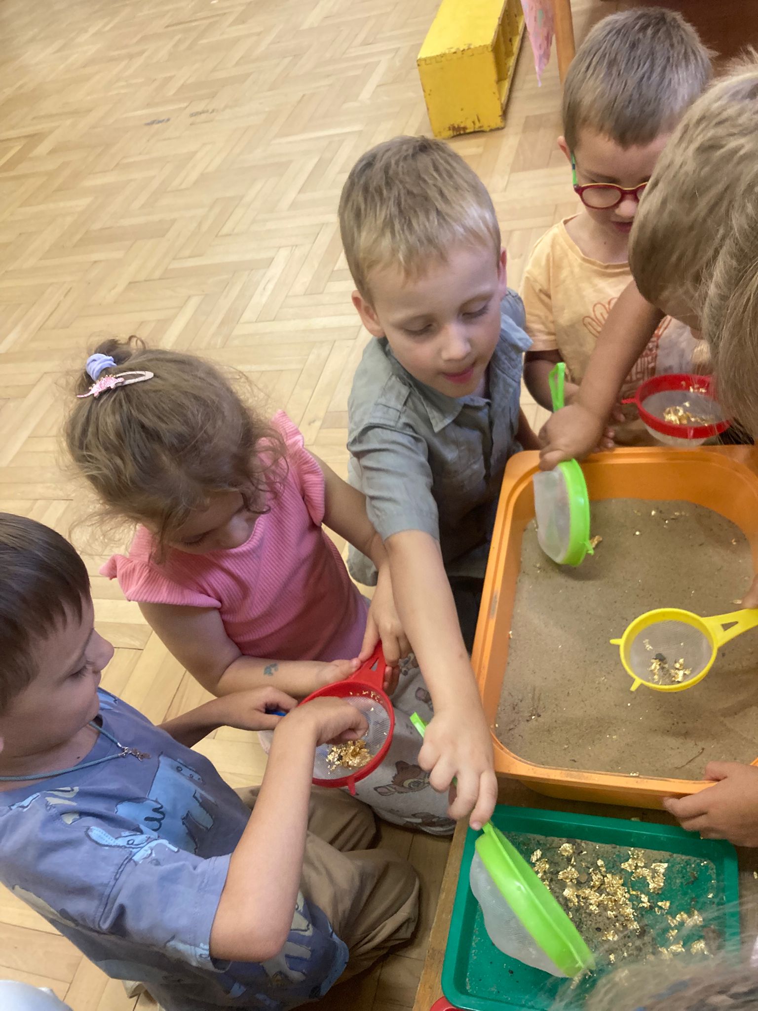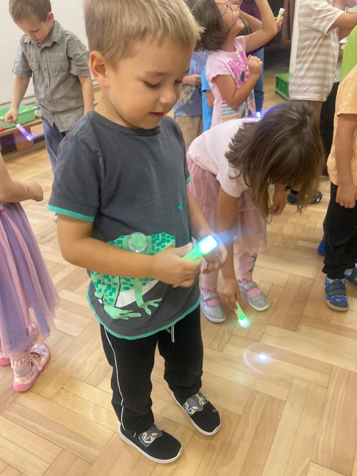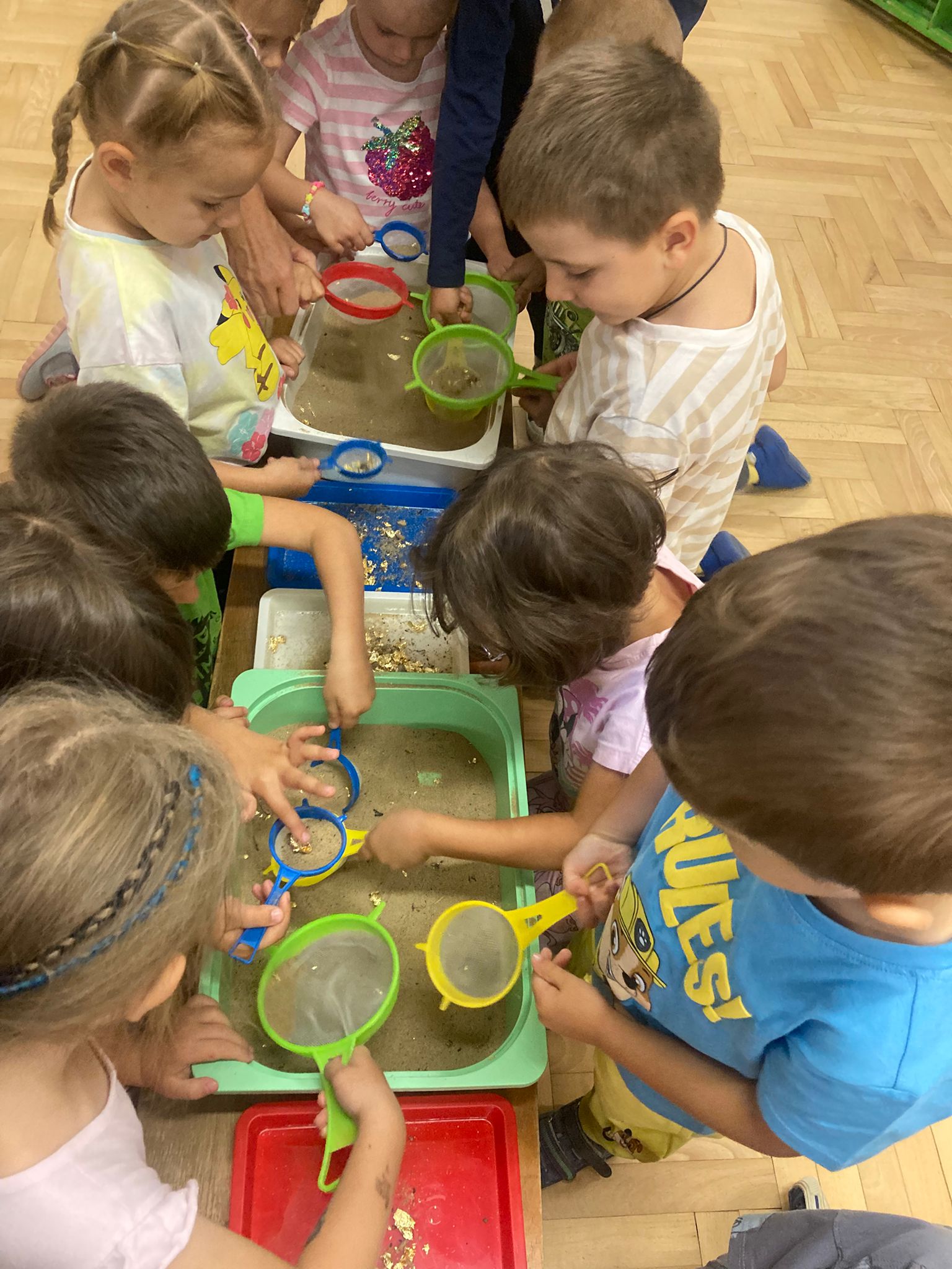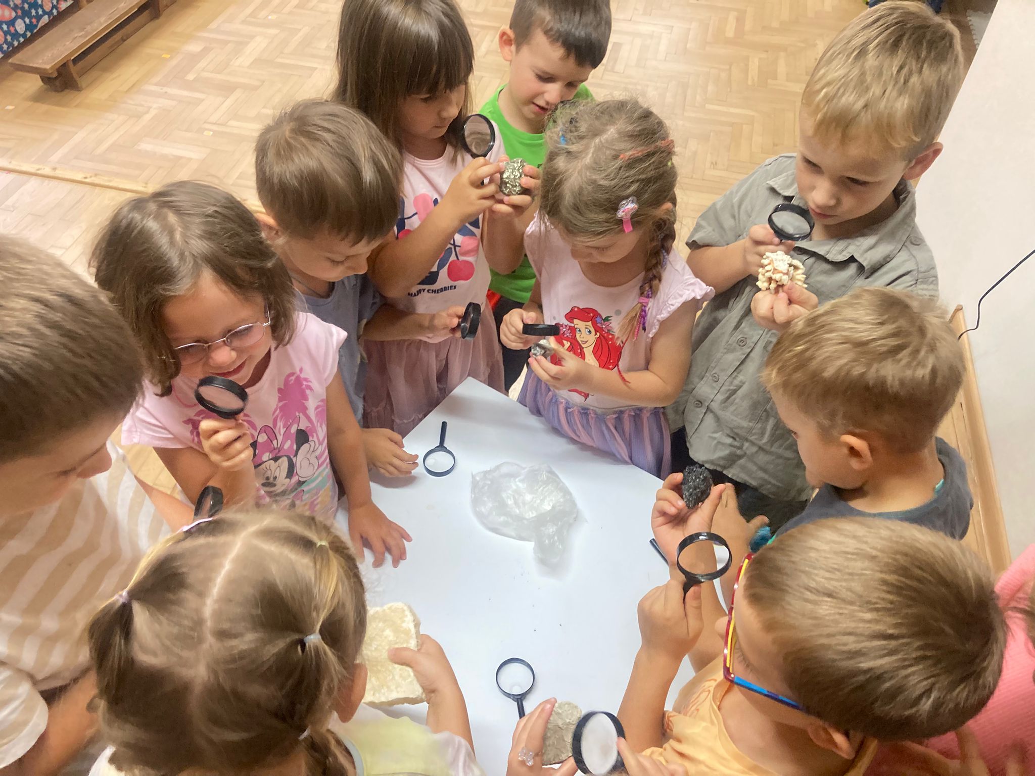 Ten dzień był pełen ciekawych zdarzeń. Pani Dyrektor pasowala dzieciaki na prawdziwych przedszkolakóŵ z grupy ODKRYWCY! Jak nazwa mówi odkrywlismy dziś świat wielozmysłowo sensorycznie.Ogladaliśmy skalne okazy przez lupę, odzyskiwalismy cząsteczki "złota"z piasku,bawiliśmy się światłem, puszczaliśmy zajączki na ścianie , tworzyliśmy obrazy na podświetlanym stoliku svhowani w namiocie.W leśnej scenografii szukaliśmy skarbu do ktorego doprowadziły nas zabawy z leśnymi zwierzątkami.Urodziny grupy ODKRYWCÓW uczcliśmy słodkosciami za które dziękujemy kochanym Rodzicom.Oczywiście nie brakło pamiątkowych fotek do których oglądania serdecznie zapraszamy.