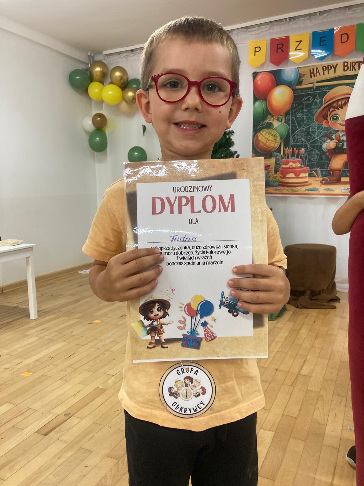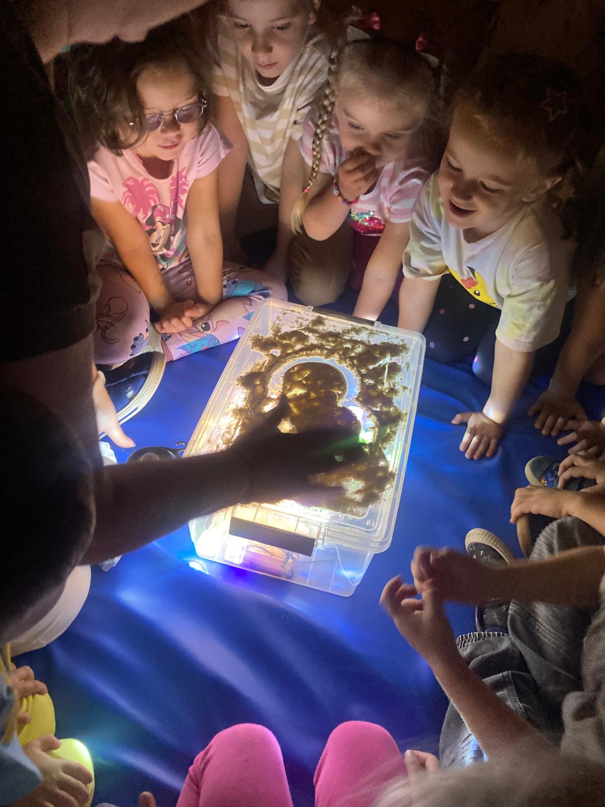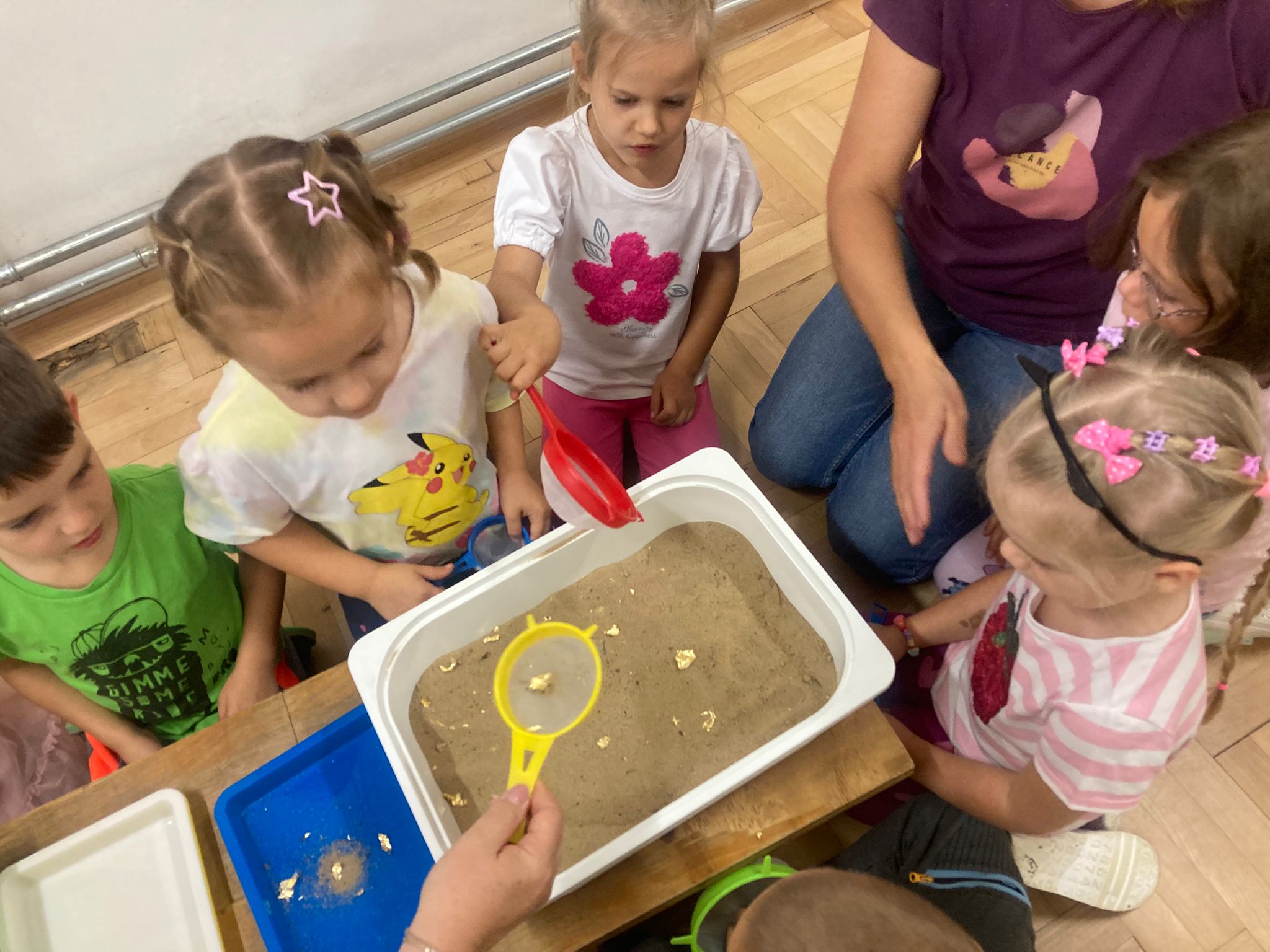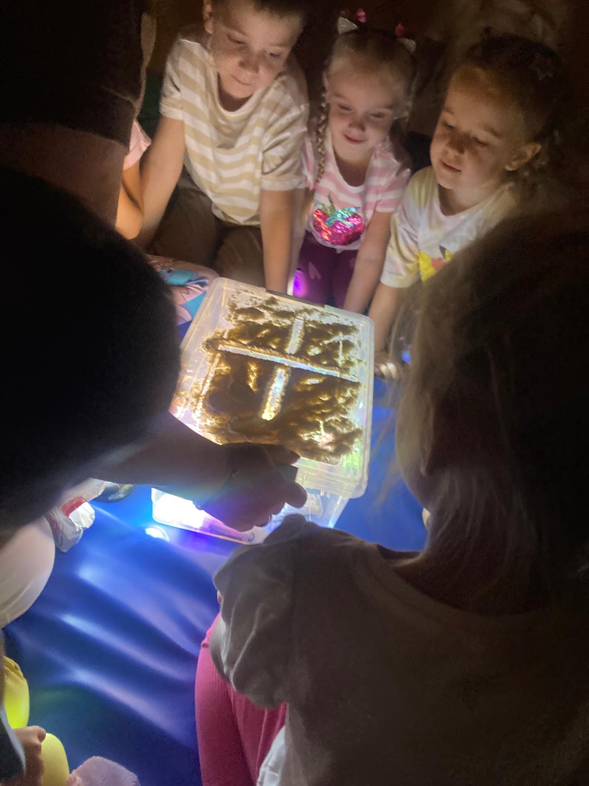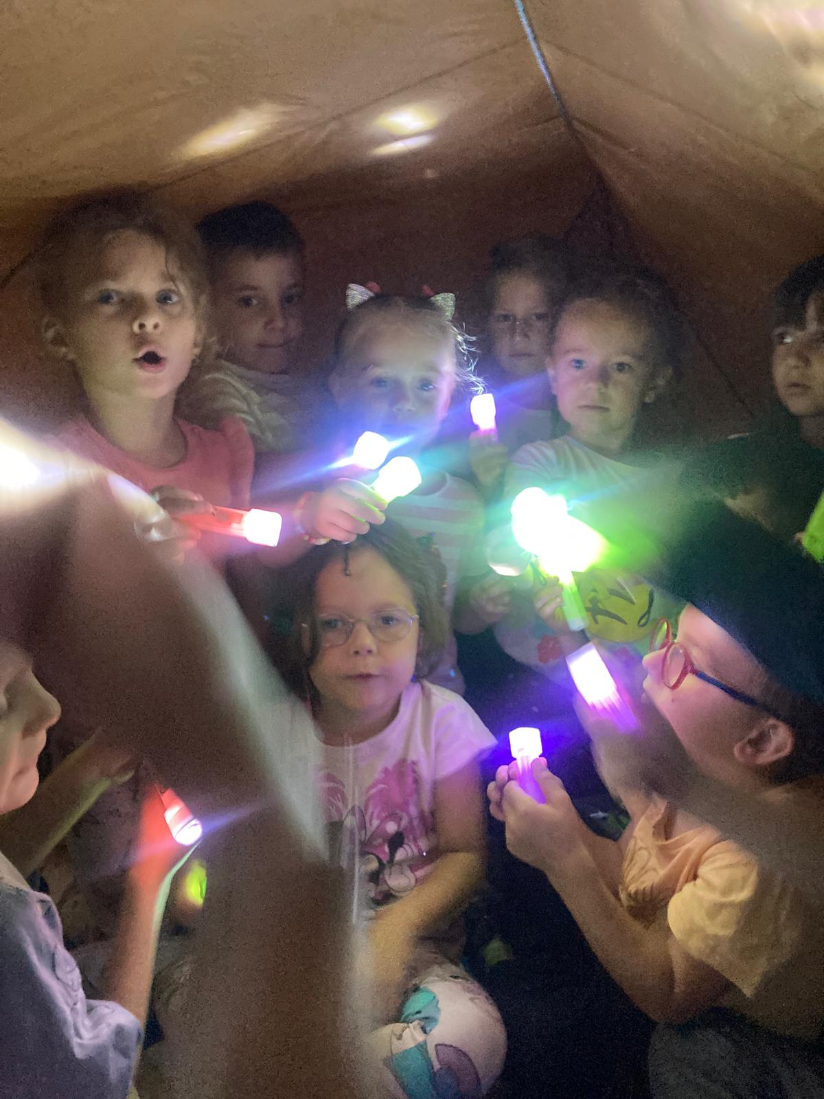 Ten dzień był pełen ciekawych zdarzeń. Pani Dyrektor pasowala dzieciaki na prawdziwych przedszkolakóŵ z grupy ODKRYWCY! Jak nazwa mówi odkrywlismy dziś świat wielozmysłowo sensorycznie.Ogladaliśmy skalne okazy przez lupę, odzyskiwalismy cząsteczki "złota"z piasku,bawiliśmy się światłem, puszczaliśmy zajączki na ścianie , tworzyliśmy obrazy na podświetlanym stoliku svhowani w namiocie.W leśnej scenografii szukaliśmy skarbu do ktorego doprowadziły nas zabawy z leśnymi zwierzątkami.Urodziny grupy ODKRYWCÓW uczcliśmy słodkosciami za które dziękujemy kochanym Rodzicom.Oczywiście nie brakło pamiątkowych fotek do których oglądania serdecznie zapraszamy.