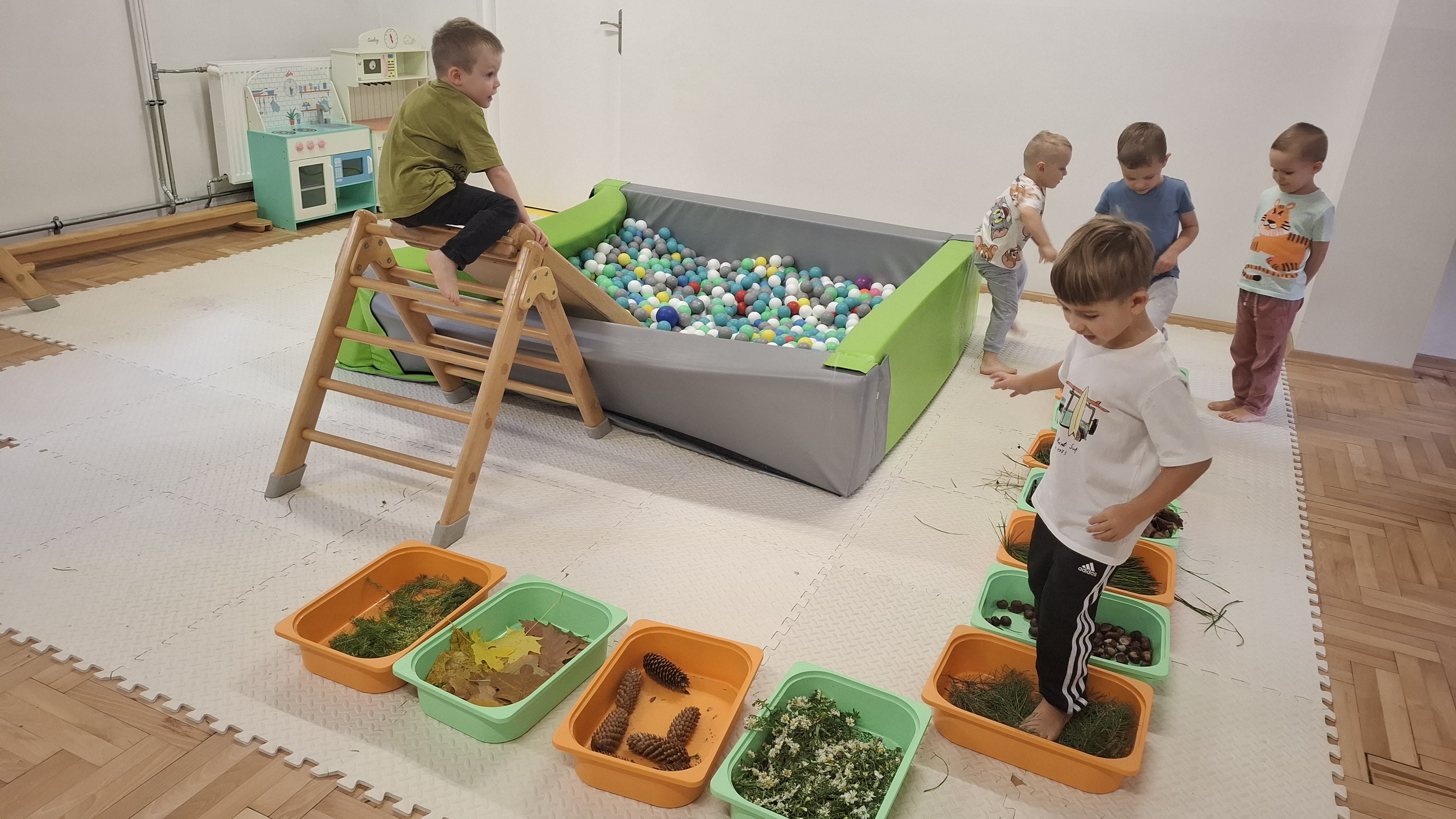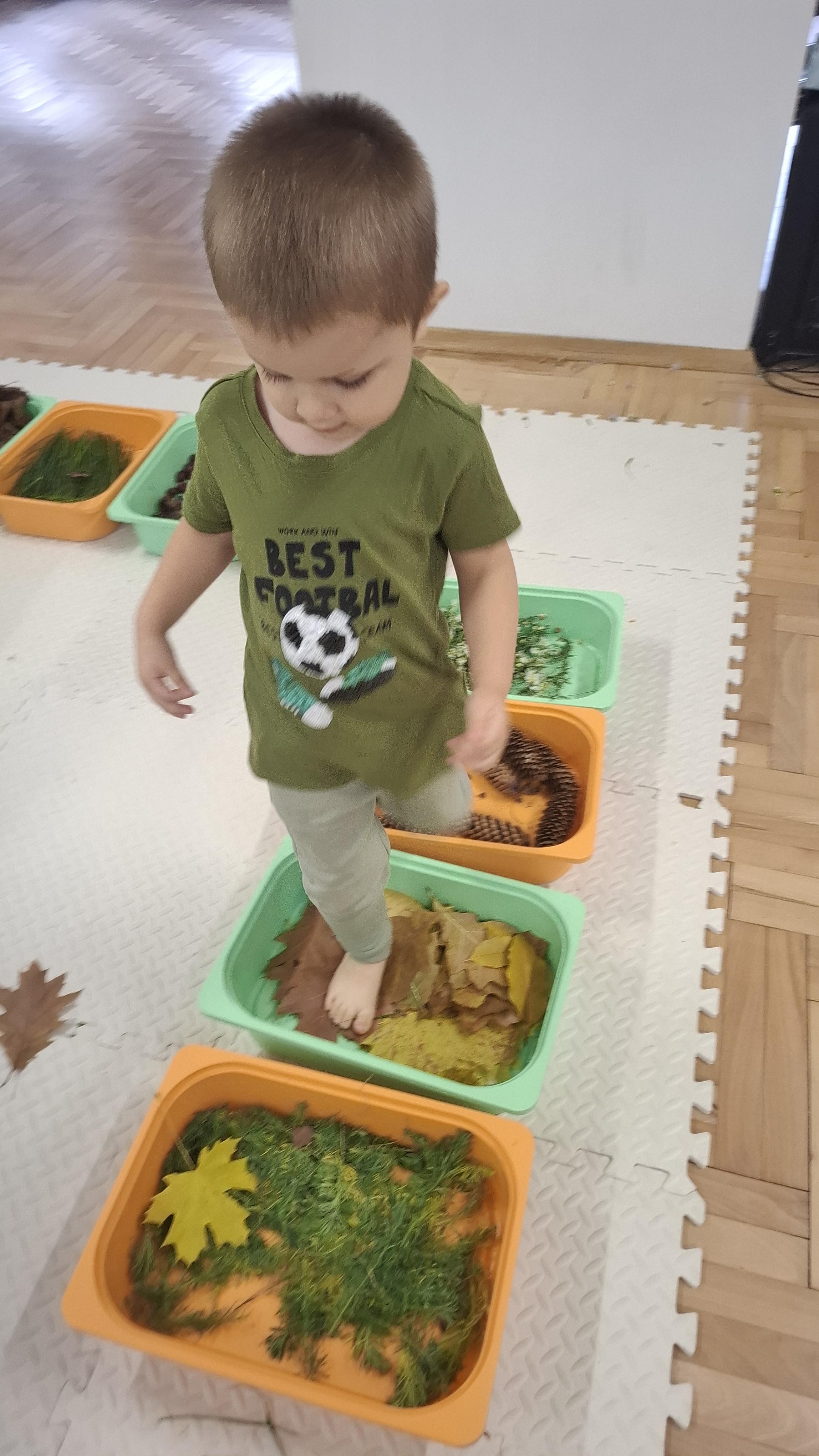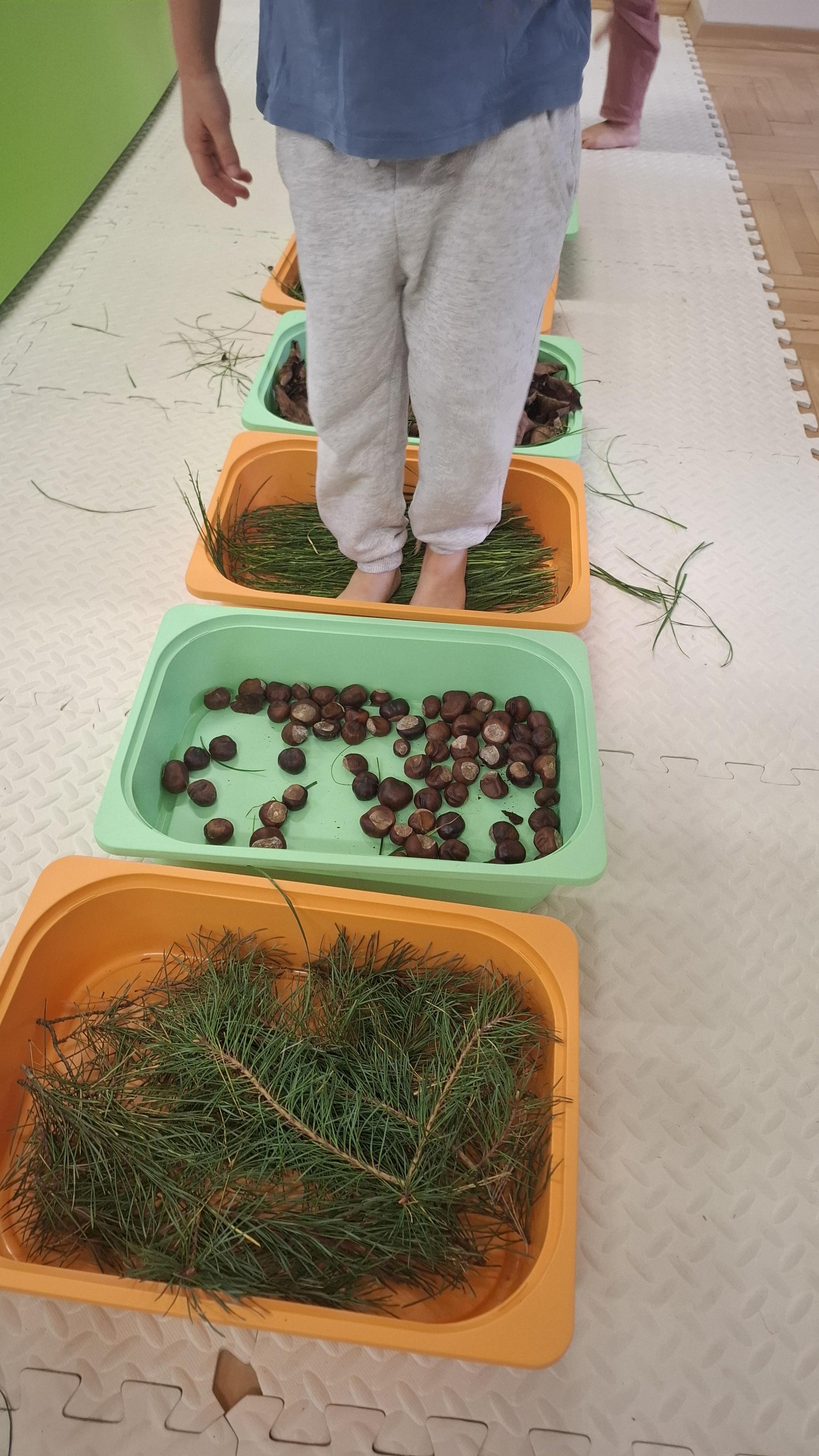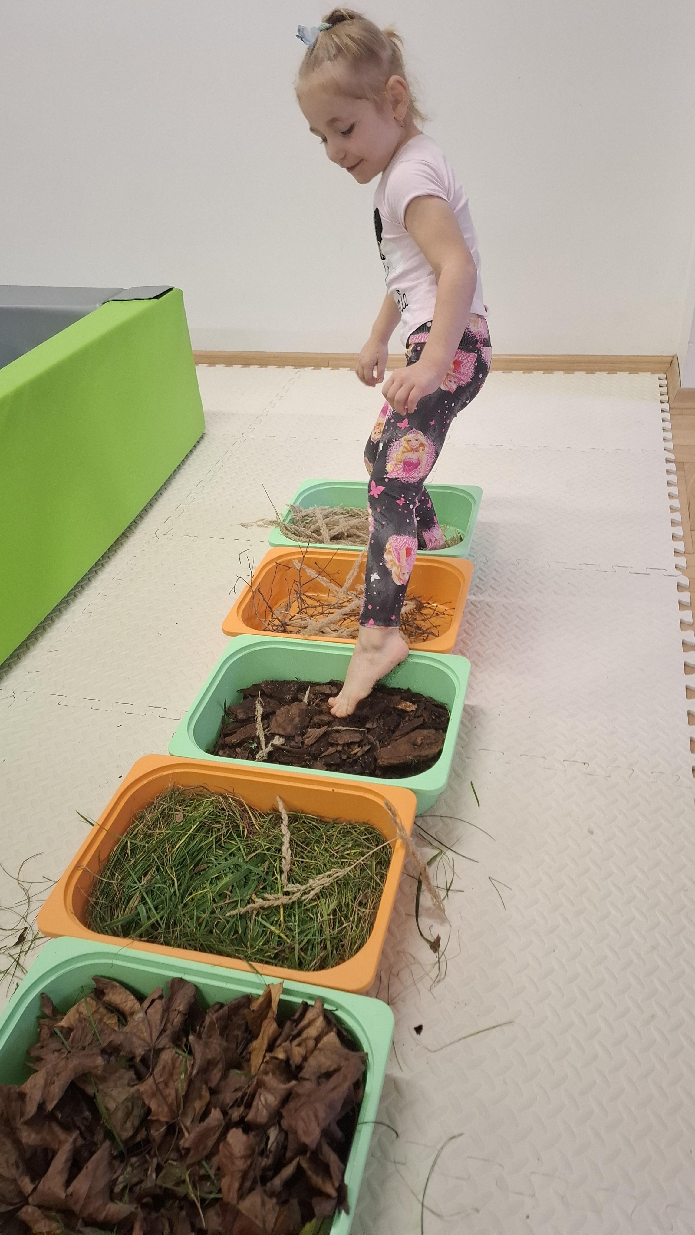 W październiku przedszkolaki zrealizowały pierwsze zadanie projektu – „Jesienną ścieżkę sensoryczną”. Podczas zajęć dzieci miały okazję przemierzyć ścieżkę przygotowaną z naturalnych, jesiennych materiałów, takich jak: patyczki, kasztany, szyszki, suche i świeże liście, trawa, kora drzew oraz wiele innych skarbów przyrody.