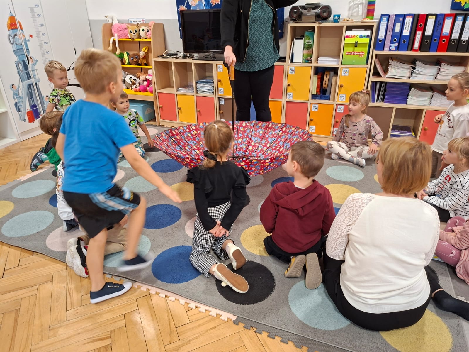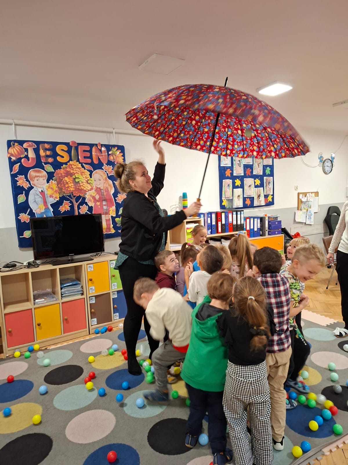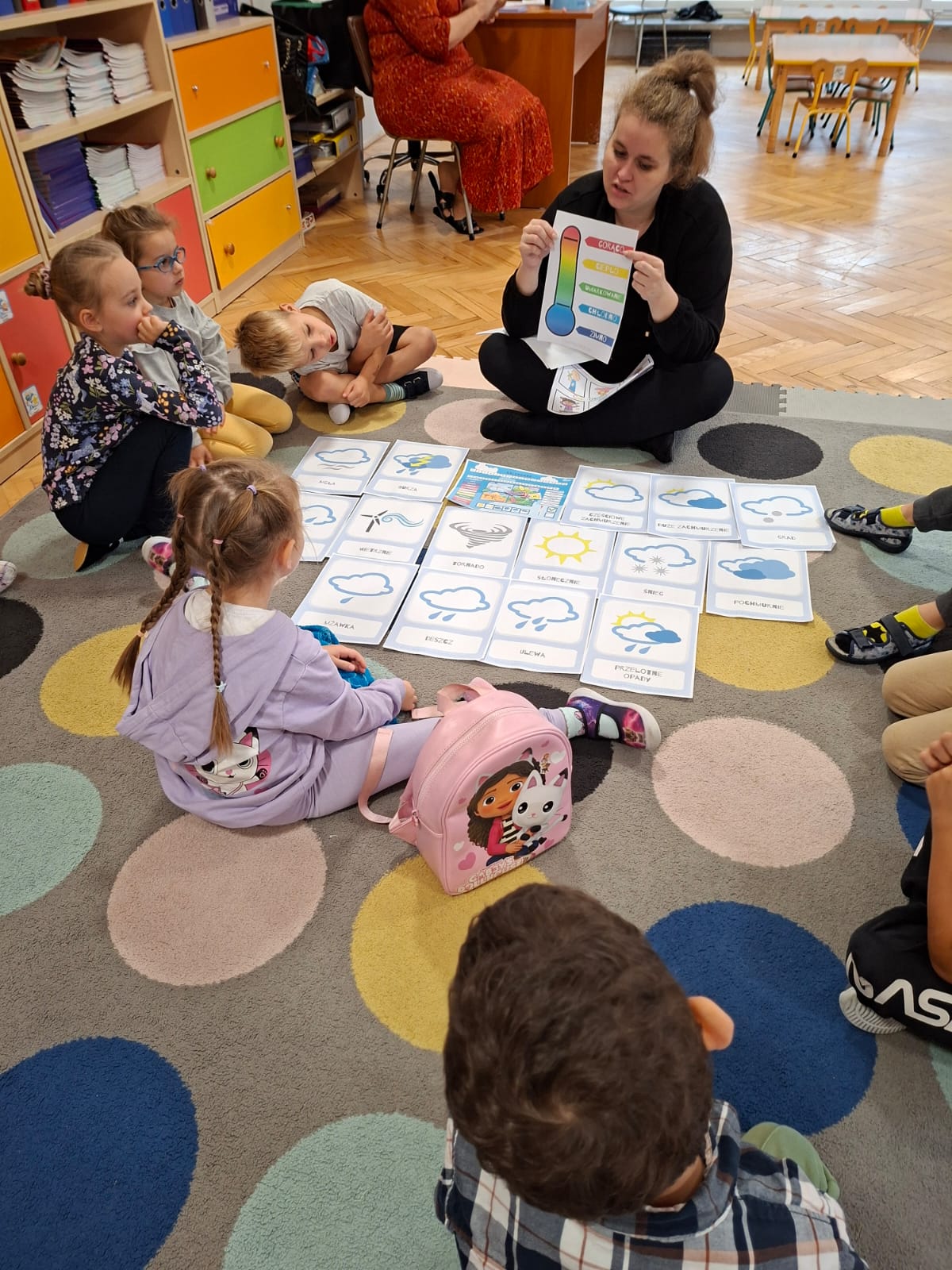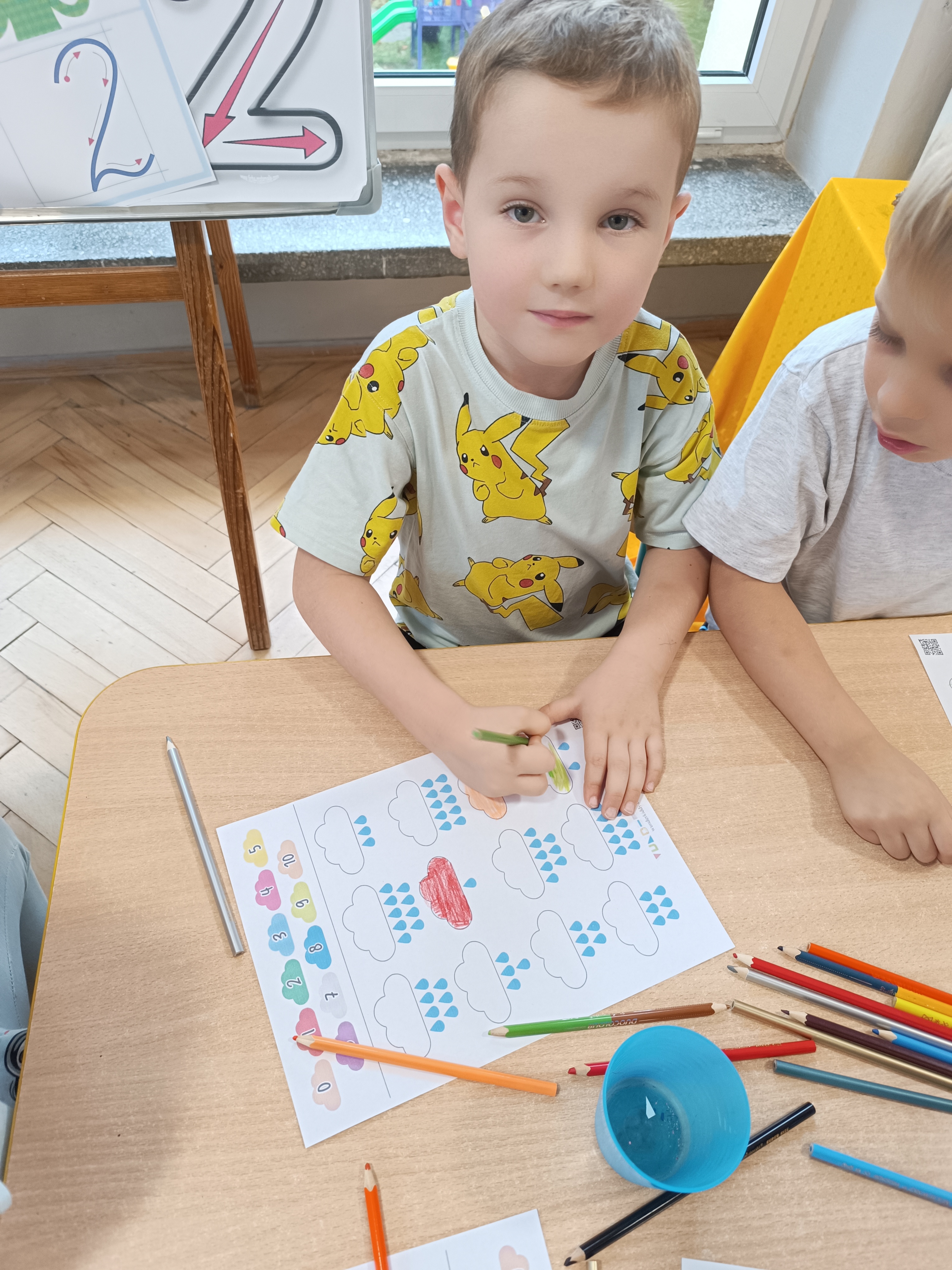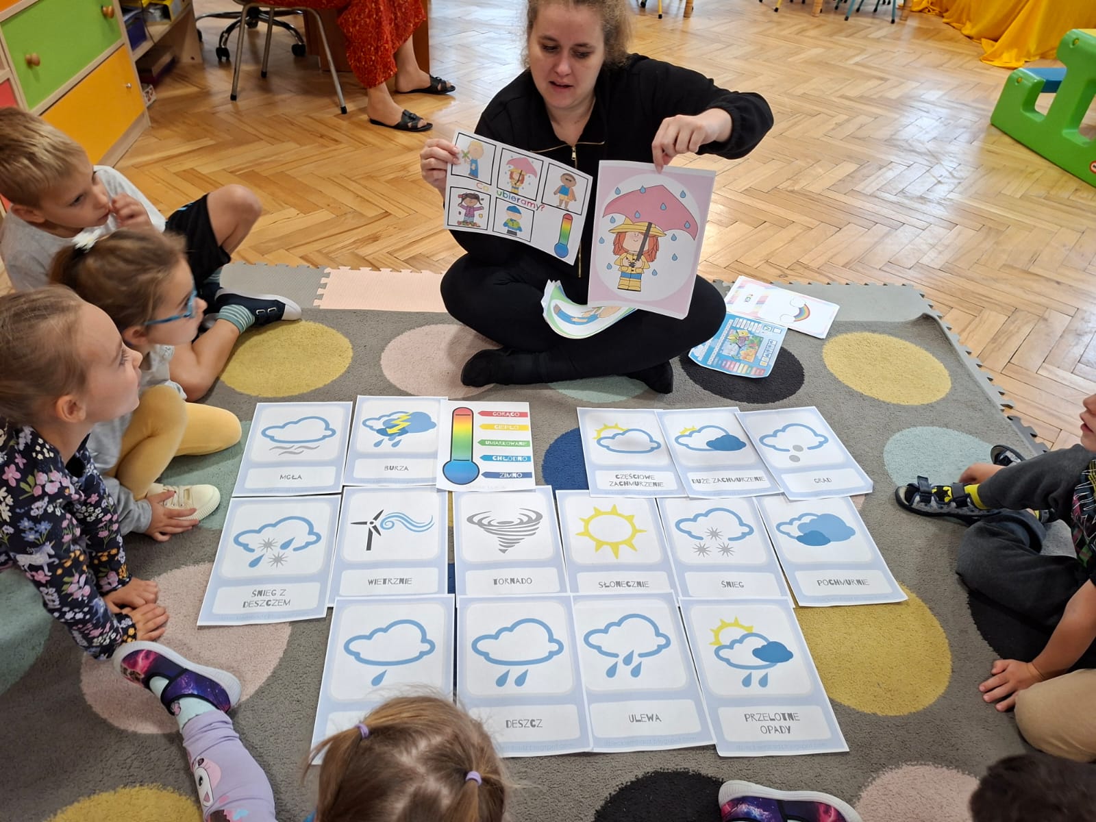 W minionych tygodniach dzieci zgłębiały tematy dotyczące pogody, jej uwarunkowań czy wahań pogodowych. Poznały nazwy zjawisk atmosferycznych. Nauczyły się piosenki "Pada, pada deszczyk..."