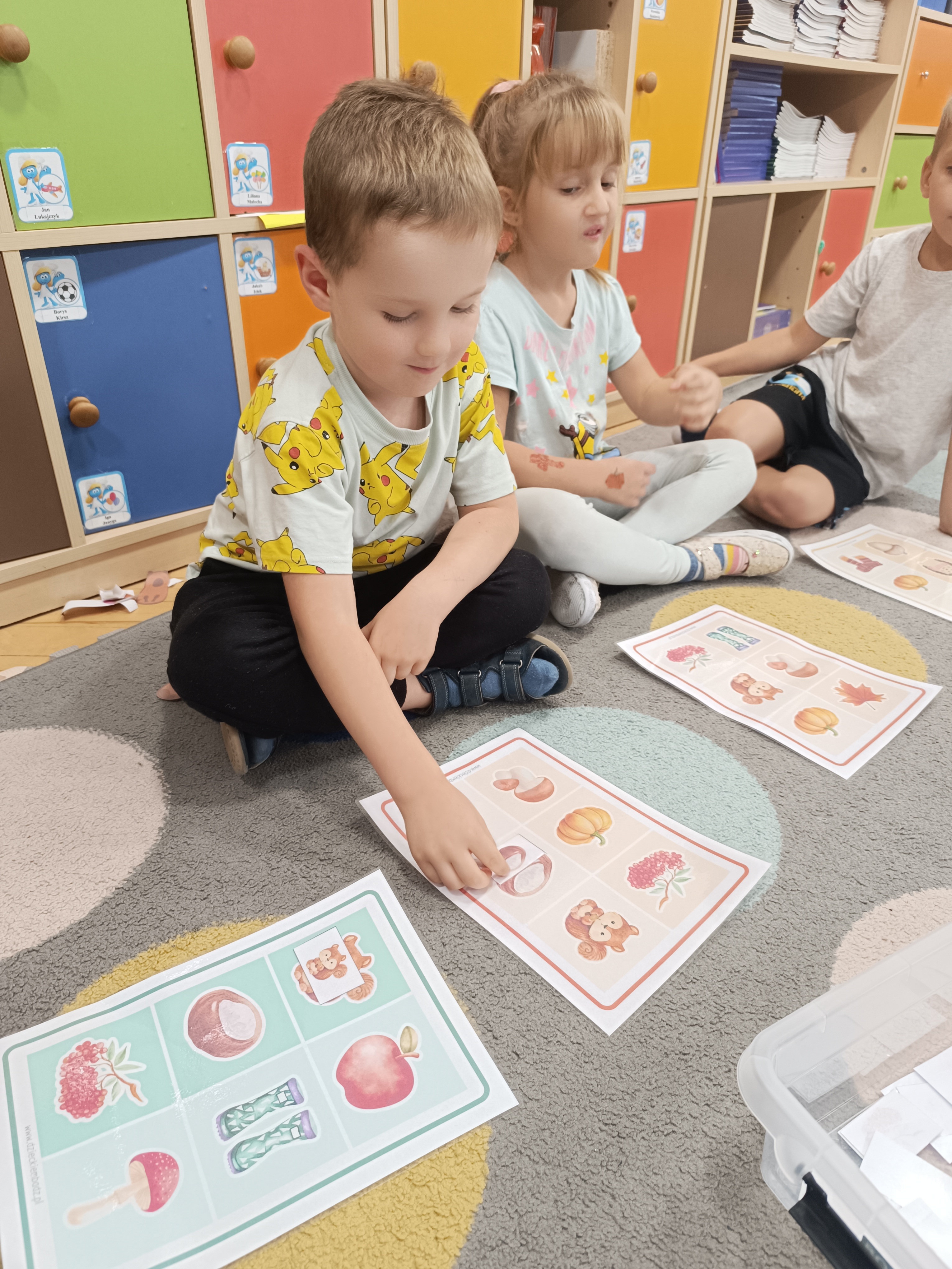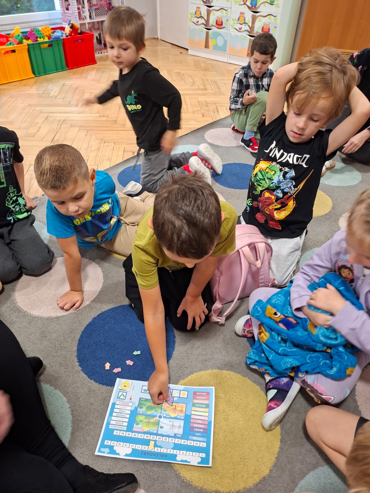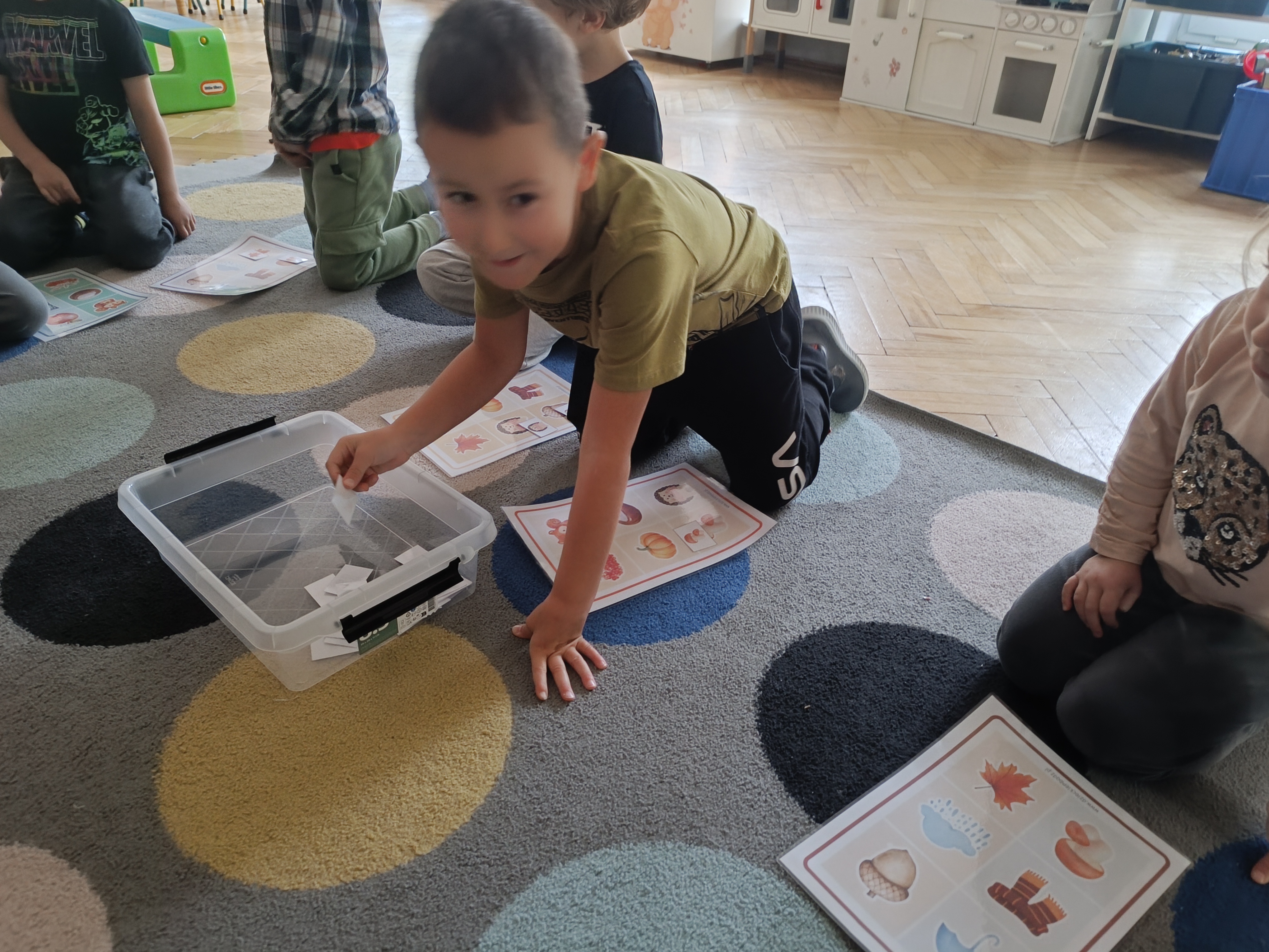 Przy okazji omawiania różnych zawirowań pogodowych, okazało się, że dzieciom w czasie tzw. załamania pogody, czyli wtedy kiedy przez dłuższy czas pada deszcz, dzieciom często doskwiera nuda. Nasze przedszkolaki poznały wiele sposobów na szybkie pozbycie się owej nudy. Wykonały różne doświadczenia. Nauczyły się różnych zabaw, poznały nowe gry dywanowe - min. Bingo jesienne, "Ja mam kasztana... Kto ma dynie? - ja mam dynie... Kto ma żołędzia?"
