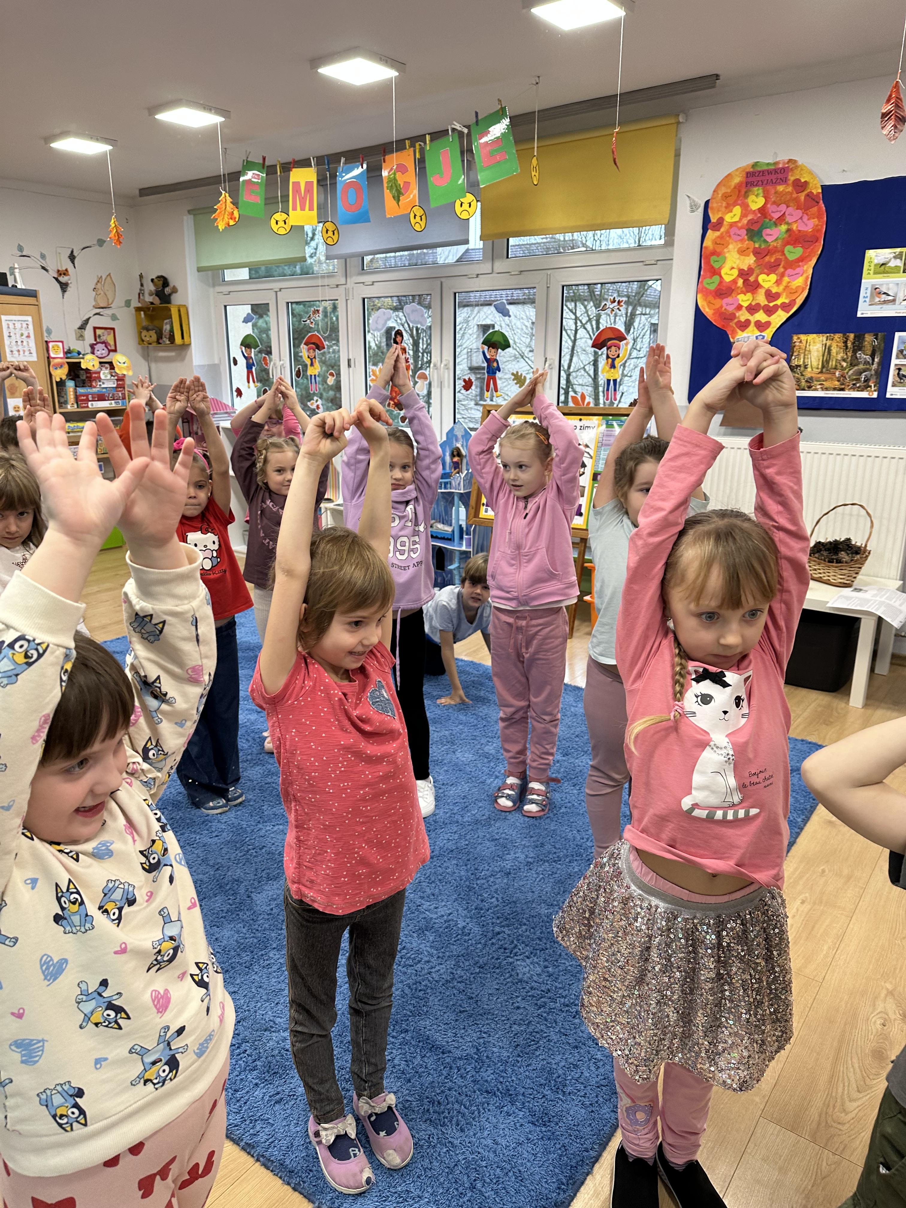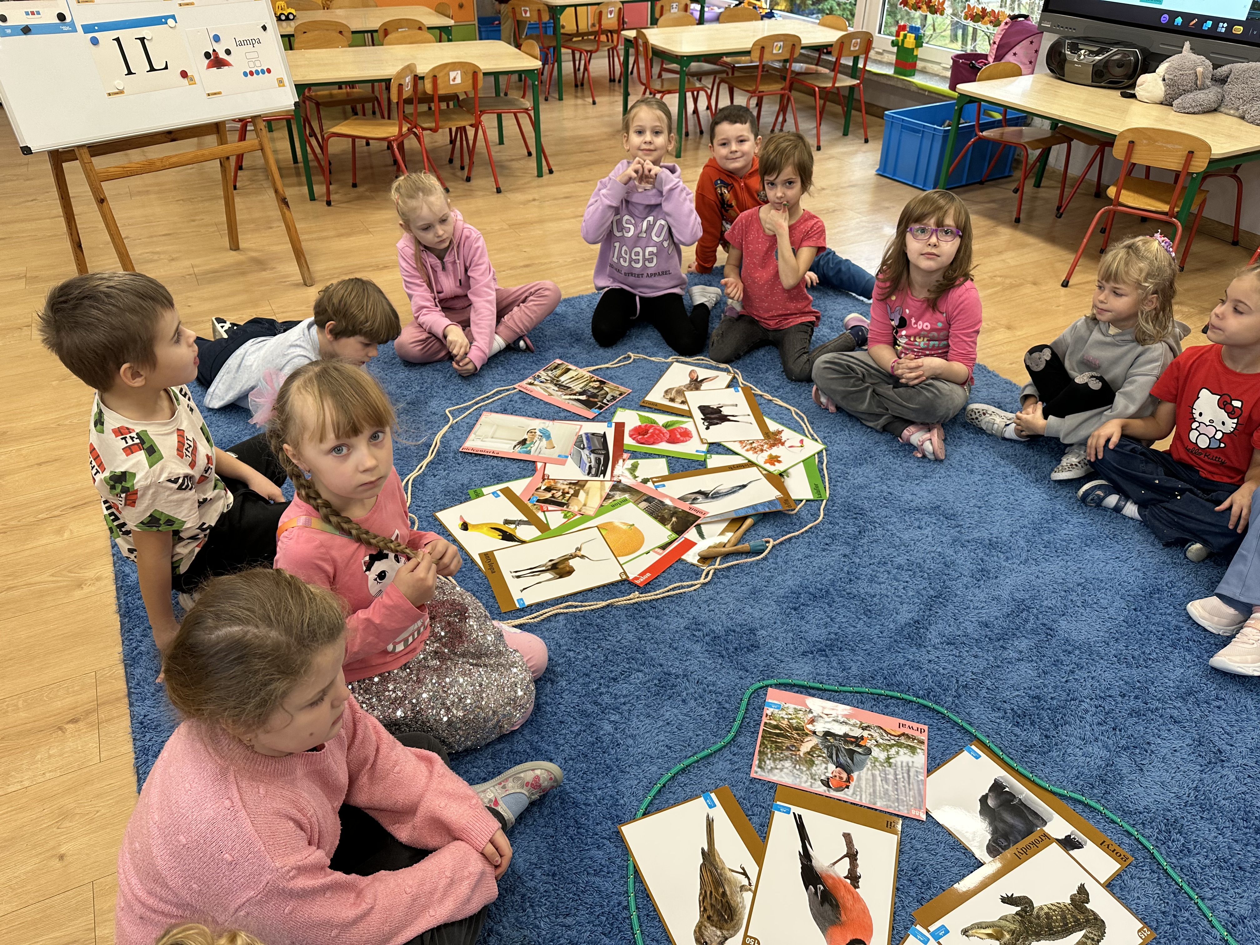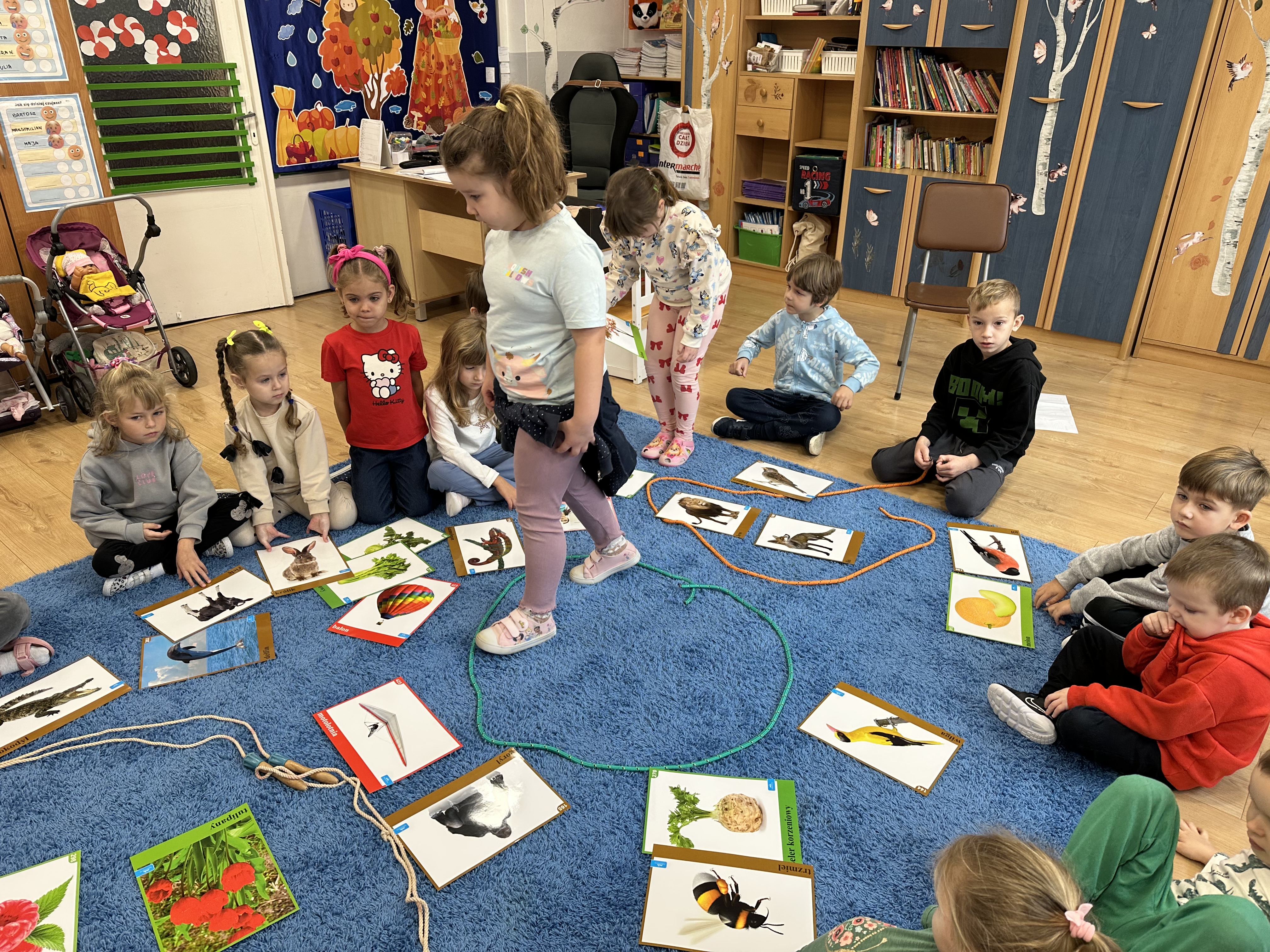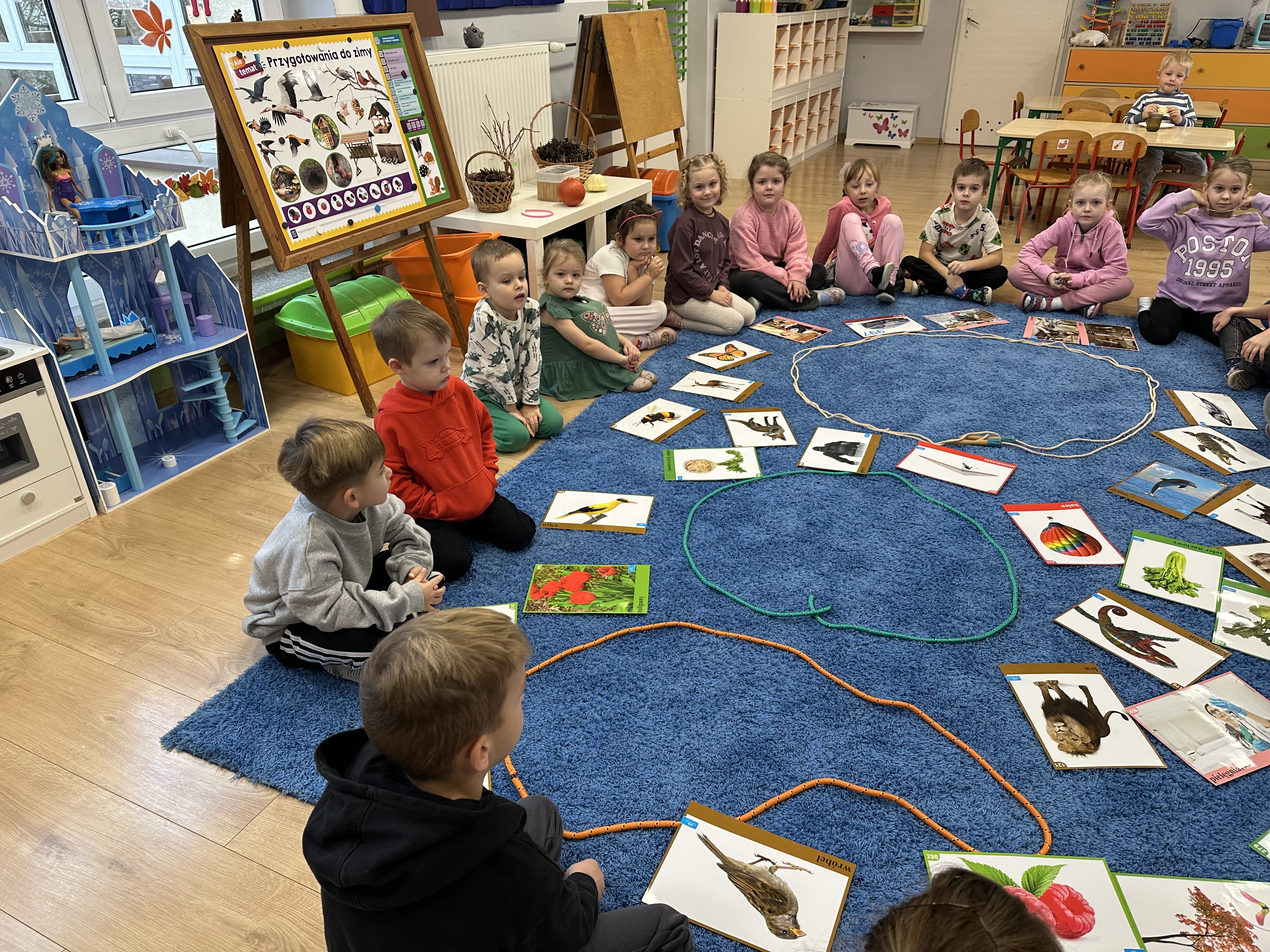 W poniedziałek przedszkolaki wysłuchały opowiadania ,,Odpoczynek zimowy”, które stało się punktem wyjścia do wspólnej rozmowy o tym, jak ważny jest sen dla zachowania zdrowia. Przedszkolaki uświadomiły sobie, że wszyscy mają prawo do odpoczynku i jest on potrzebny każdej istocie. Podczas zabawy „Niedźwiedzi sen” dowiedziały się, dlaczego niedźwiedź śpi całą zimę, rozwijały swoją wiedzę przyrodniczą dotyczącą hibernacji zwierząt i pobudzały ciekawość poznawczą. Nie brakowało w tym dniu zabaw ruchowych – sześciolatki skakały, udając żaby, prawidłowo reagowały ruchem na umówiony sygnał oraz wykonywały skłony. W trakcie zabawy „Czy sen jest ważny?” dzieliły się swoimi przemyśleniami dotyczącymi snu. Zdały sobie sprawę, że niewyspanie się wywołuje niezadowolenie i rozdrażnienie. Dzień zakończyły wykonaniem pracy plastycznej z wykorzystaniem kół. We wtorek dzieci poznały literę l, L, układały jej schemat graficzny i kreśliły jej wzór w powietrzu. Podczas zabaw rozwijały swoje kompetencje językowe, wyróżniały głoski w nagłosie, śródgłosie i wygłosie, dokonywały analizy i syntezy słuchowej słowa ,,las”, reagowały ruchowo na głoskę l. Podczas zabaw ruchowych „Jeśli l, zróbcie las” i „Ułóż małe l” utrwalały zdobytą wiedzę. W drugiej części dnia dzieci wybrały się do lasu na spacer. Obserwowały, jakie zwierzęta i rośliny można znaleźć w lesie i rozbudzały w sobie zainteresowanie przyrodą. Po powrocie do przedszkola narysowały je, a następnie rozwiązywały zagadki językowe dotyczące nazw mieszkańców lasu. W środę dzieci poznały liczbę 7 w trzech aspektach: kardynalnym, porządkowym i miarowym. Podczas zabawy „Znajdź liczby w labiryncie” kształtowały umiejętność kodowania i rozwijały swoje kompetencje matematyczne. Słuchały wiersza ,,Konik polny i mrówka”, który stał się początkiem rozmowy o pracowitości. Dzieci uświadomiły sobie, że najpierw należy wykonać obowiązki, dopiero później jest czas na zabawę. Pogadanka ta stanowiła wprowadzenie do rozmowy o przygotowaniach zwierząt do zimy. Na dworze dzieci ćwiczyły umiejętność rzutu do celu oraz przeliczały do 7. Nie zabrakło w tym dniu zadań matematycznych. W trakcie zabaw „Zbieramy orzechy” i „7 kroków” przedszkolaki utrwalały zdobyte umiejętności matematyczne i kształtowały orientację w przestrzeni. W czwartek rano dzieci wykonały biżuterię z naturalnych, jesiennych przedmiotów, następnie wysłuchały wiersza, po którym rozmawiały na temat dbania o zwierzęta zimą. Kształtowały poczucie odpowiedzialności za los zwierząt zimą. Przedszkolaki czerpały radość ze wspólnej zabawy: biegały po sali, naśladując lot ptaków, rozpoznawały ptaki na obrazkach, brały udział w ćwiczeniach oddechowych, rozwijały umiejętność współpracy w grupie podczas budowania gniazda dla jemiołuszki oraz rozwijały ciekawość poznawczą, wysłuchując głosów ptaków. W trakcie zabawy „Śpią – nie śpią” sprawdzały swoją wiedzę dotyczącą hibernacji zwierząt. Piątkowe zajęcia były skupione na rozwijaniu świadomości ciała i kreatywności ruchowej dzieci podczas obcowania z muzyką klasyczną. Przedszkolaki wysłuchały muzyki z baletu Piotra Czajkowskiego ,,Jezioro łabędzie” oraz wykonały do niej inscenizację. Kształtowały motorykę małą i rozwijały zdolności planowania pracy własnej podczas tworzenia kolażu modowego. W trakcie zabawy „Dotknij” rozwijały świadomość sensoryczną. Na dworze wykonywały ćwiczenia kształtujące prawidłową postawę ciała. Po powrocie do przedszkola rozwiązywały ,,Quiz” i podsumowały wiedzę zebraną w całym tygodniu.