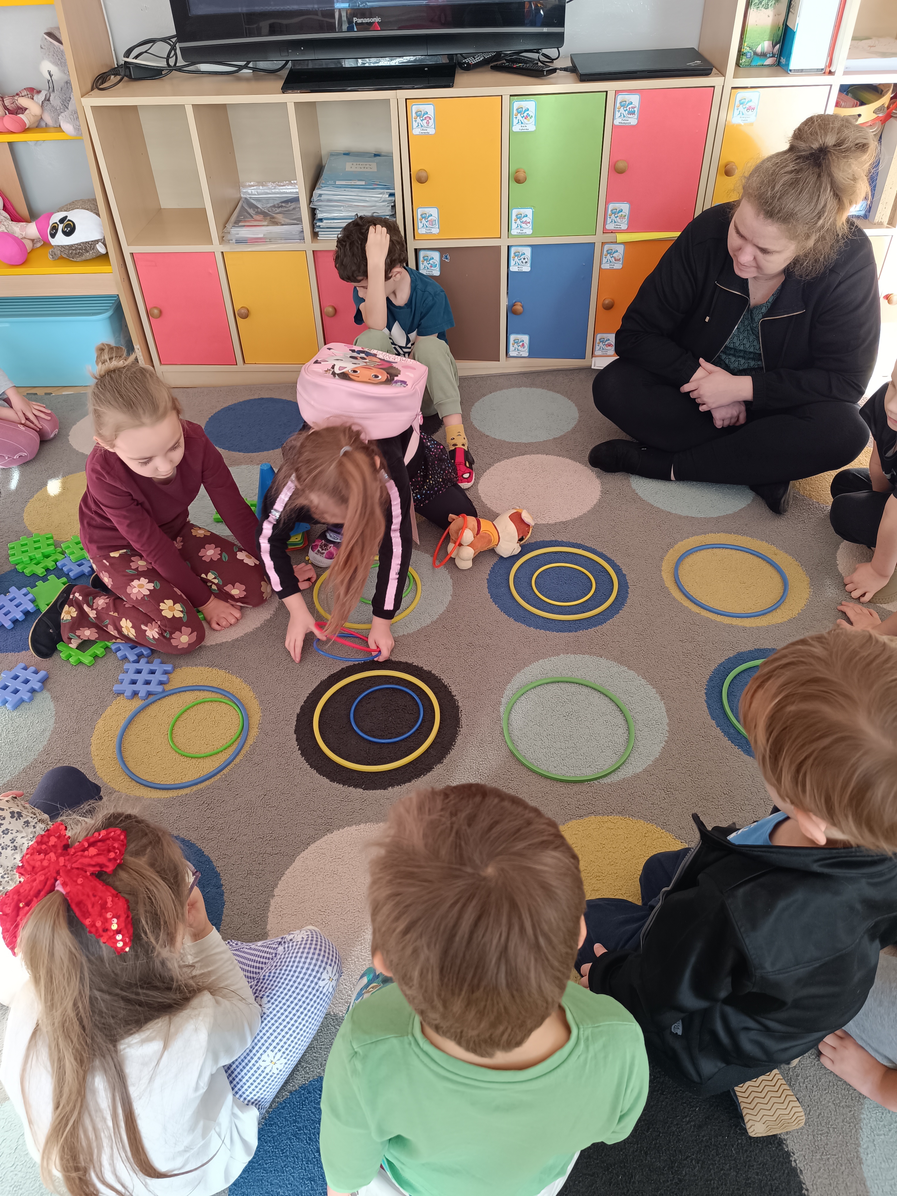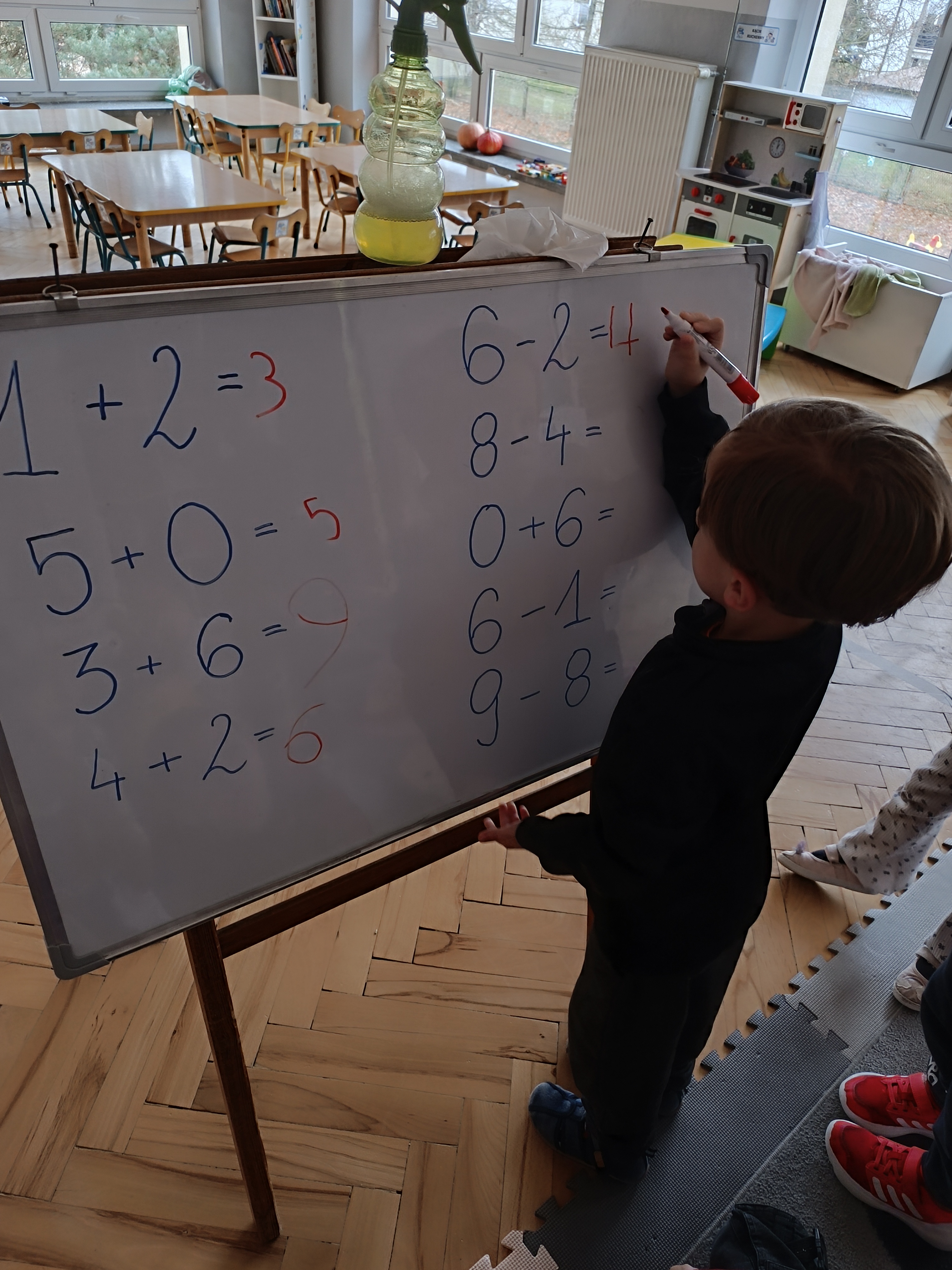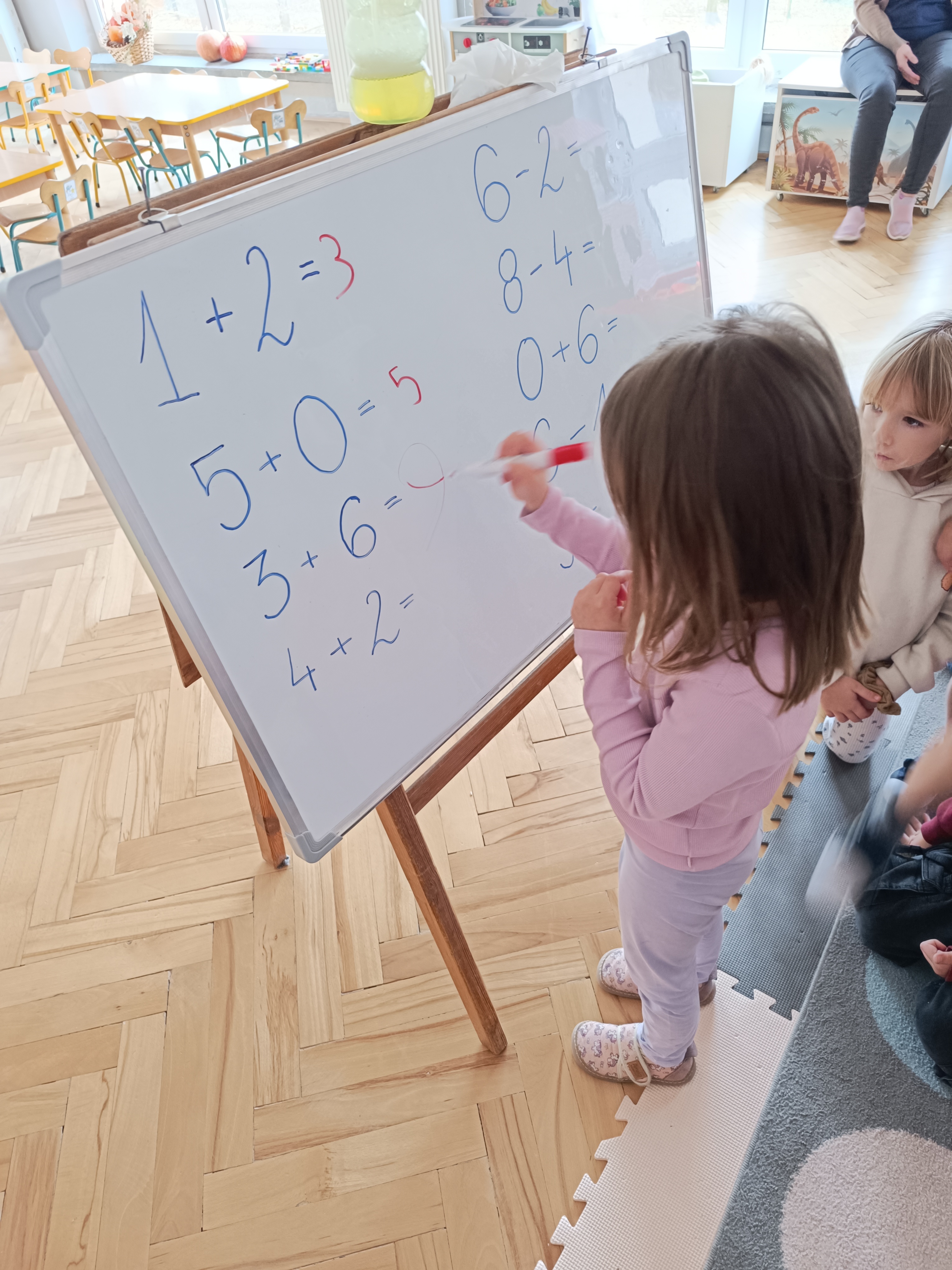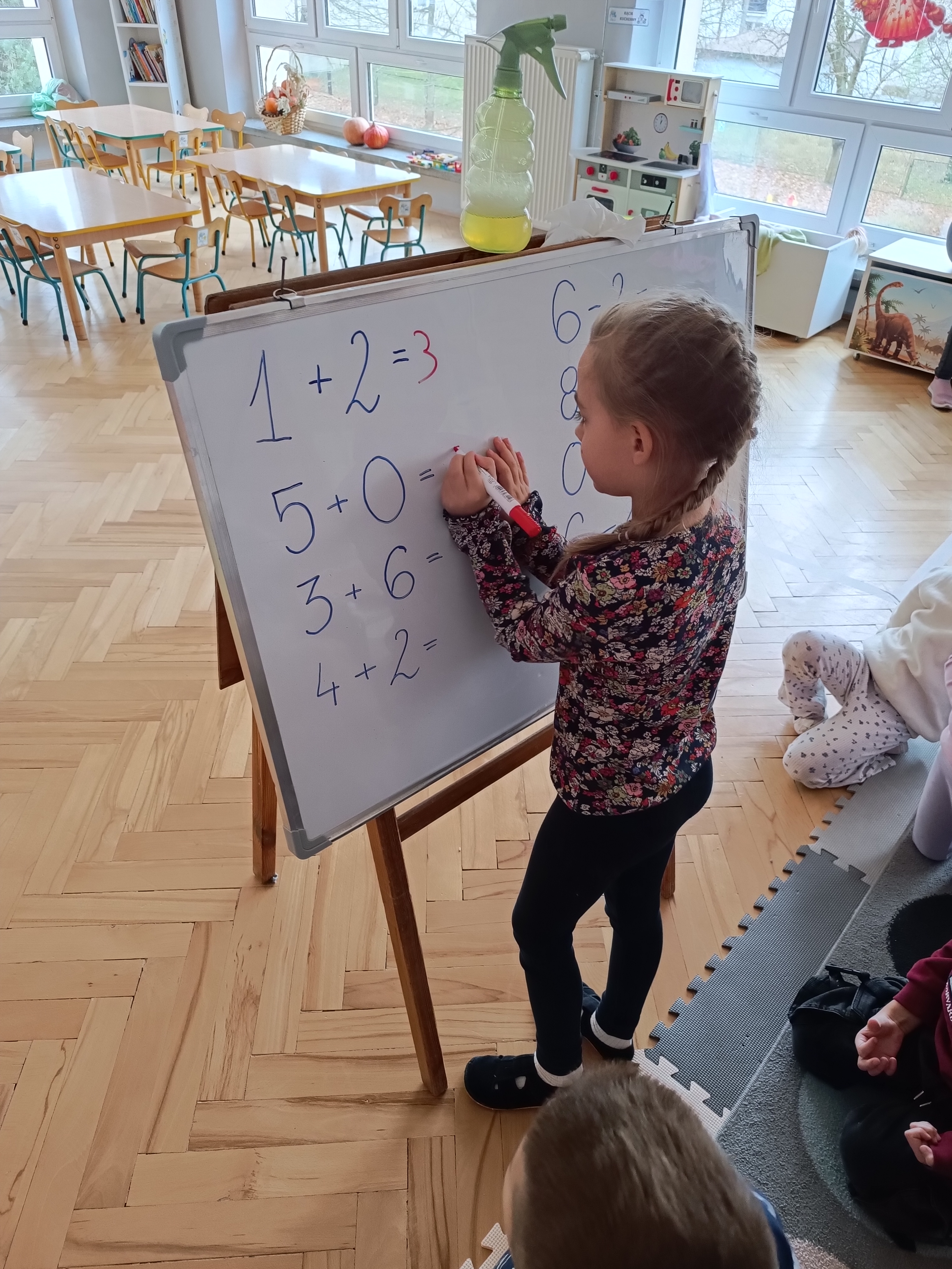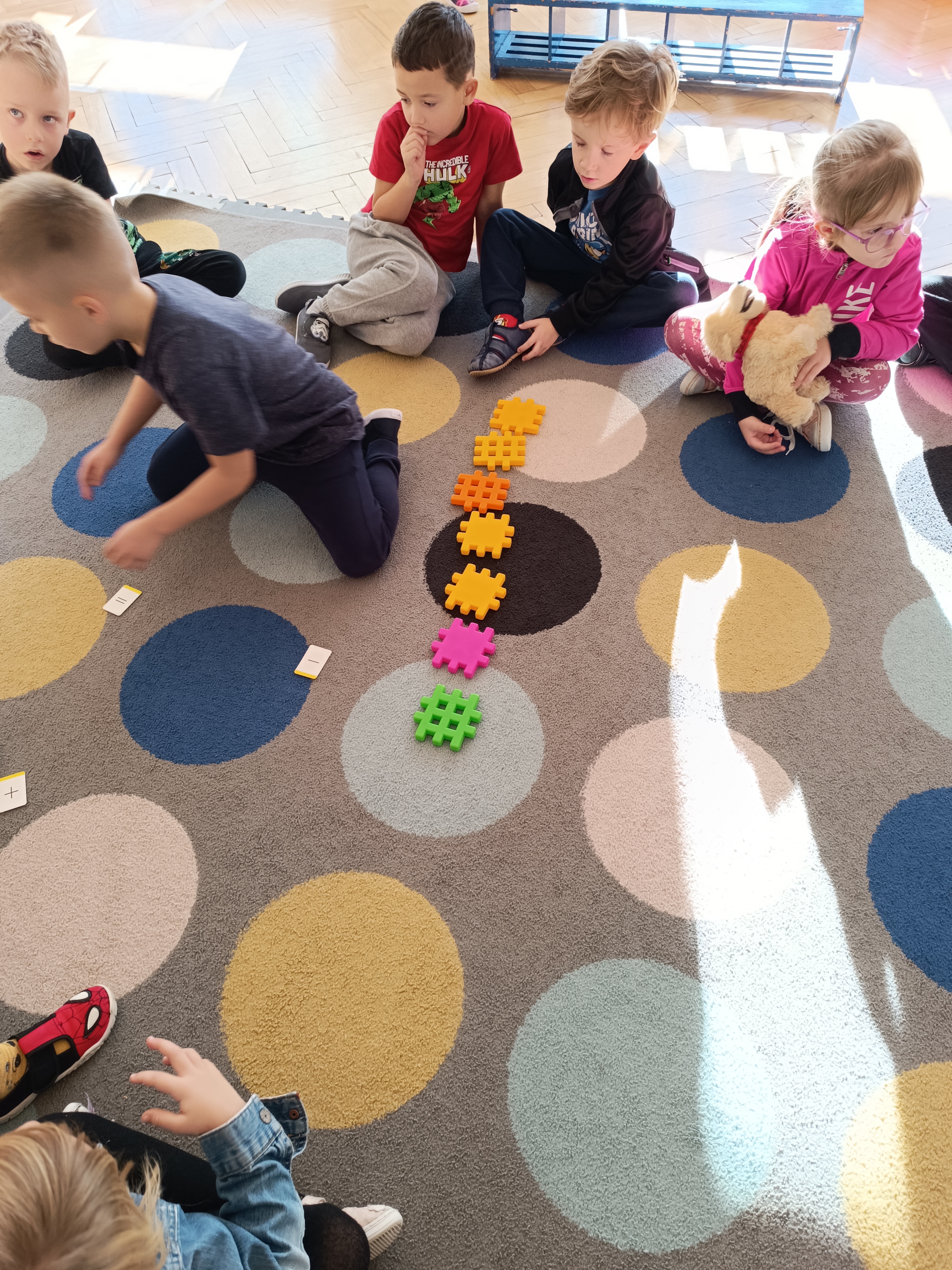 W tym tygodniu poznaliśmy również cyferkę 7 w aspekcie miarowym i porządkowym oraz jej zapis graficzny, uczestnicząc w zabawach matematycznych: " Czy schowałaś orzechy w pierwszej norce?" ; " Ile kołek zrobiła wiewiórka?"; " Jak wygląda siedem?" ; "Matematyczne ruchy".