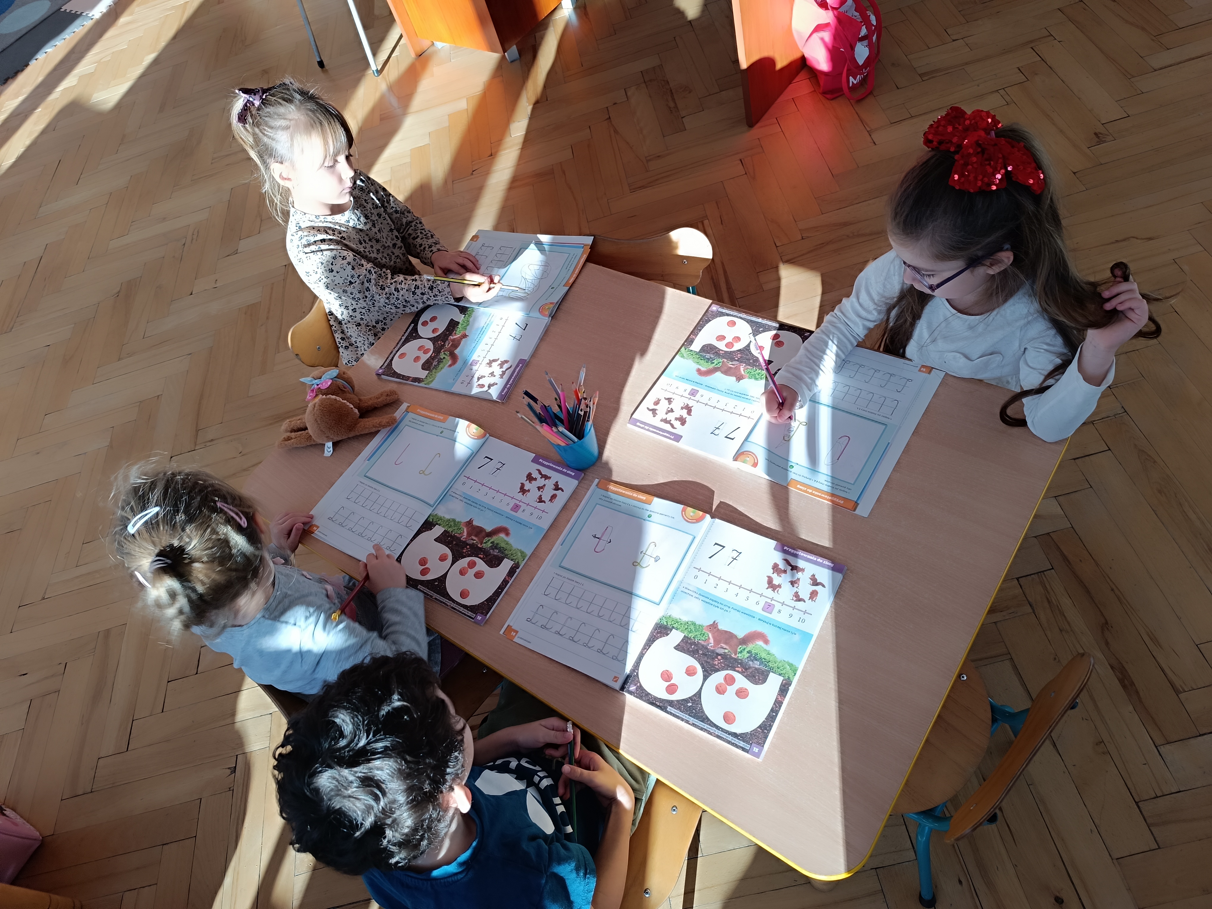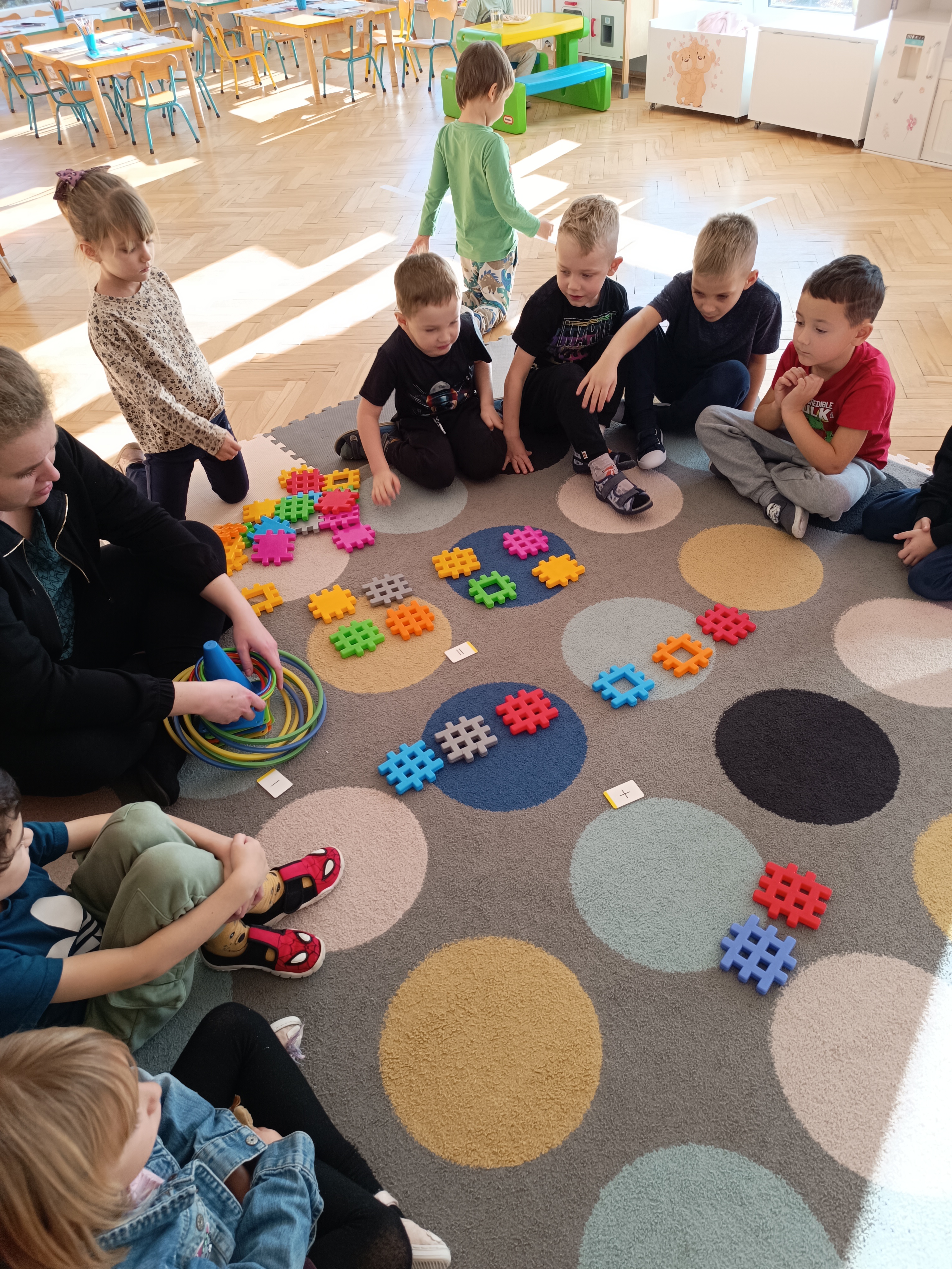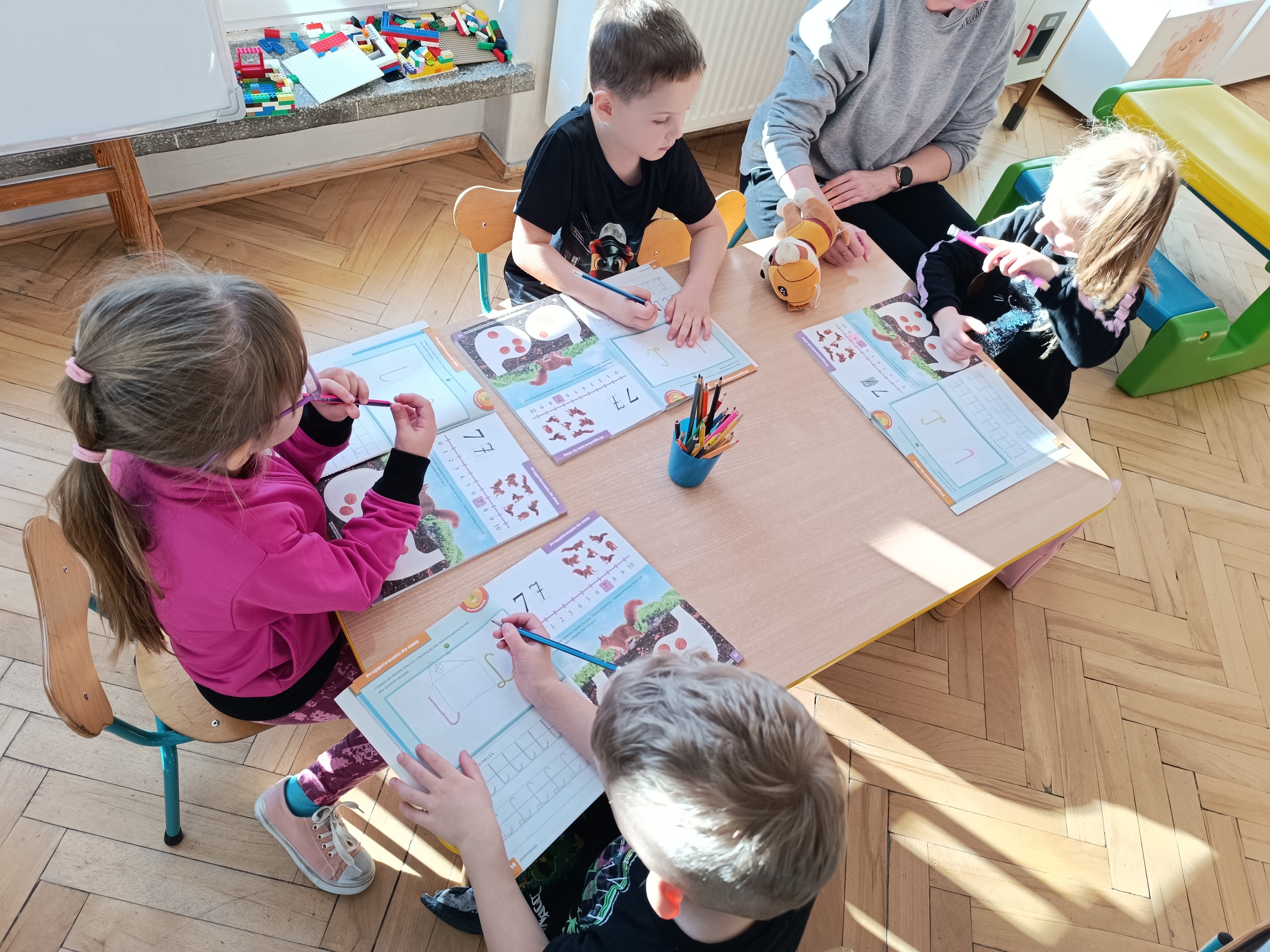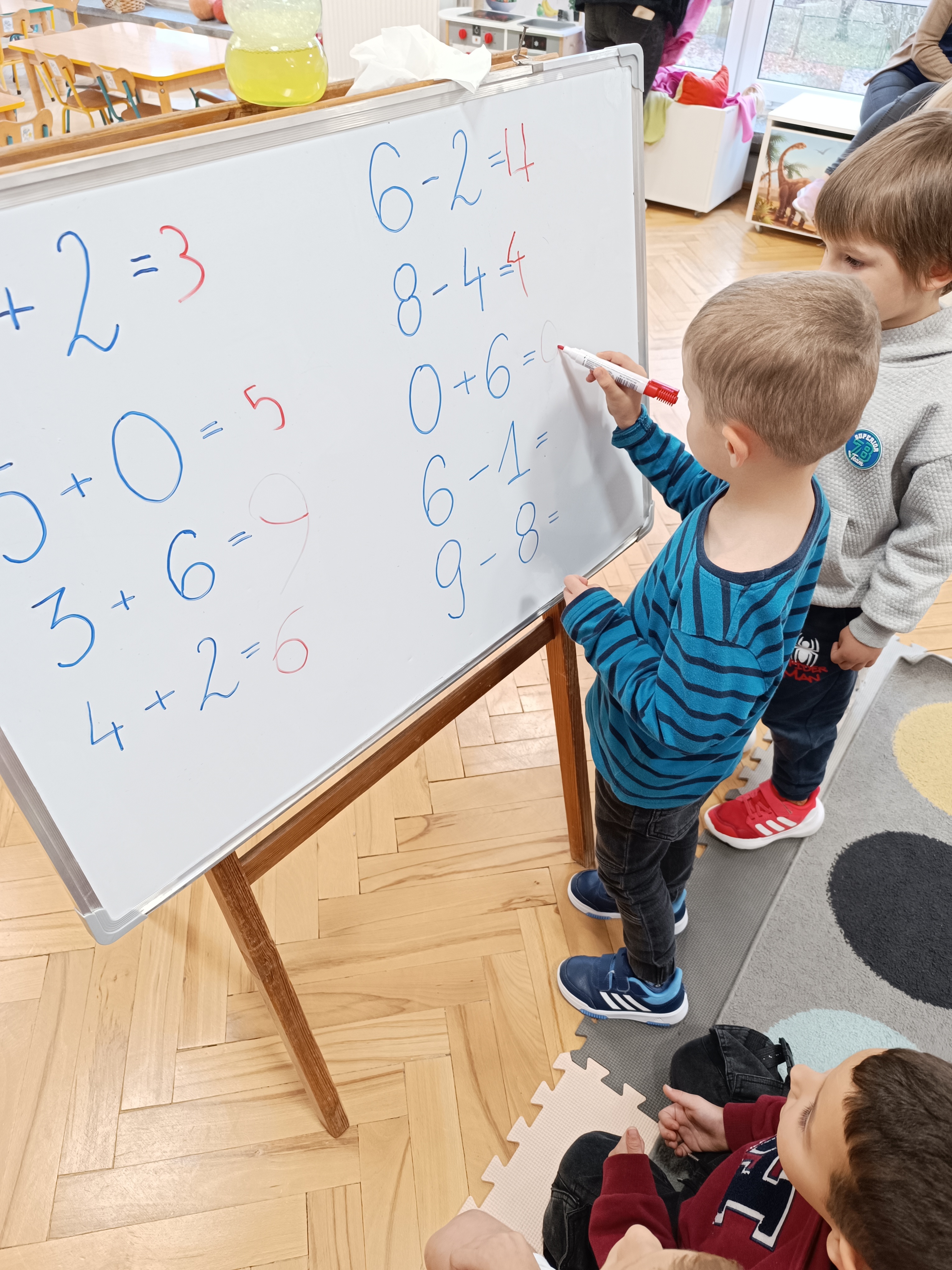 W tym tygodniu poznaliśmy również cyferkę 7 w aspekcie miarowym i porządkowym oraz jej zapis graficzny, uczestnicząc w zabawach matematycznych: " Czy schowałaś orzechy w pierwszej norce?" ; " Ile kołek zrobiła wiewiórka?"; " Jak wygląda siedem?" ; "Matematyczne ruchy".