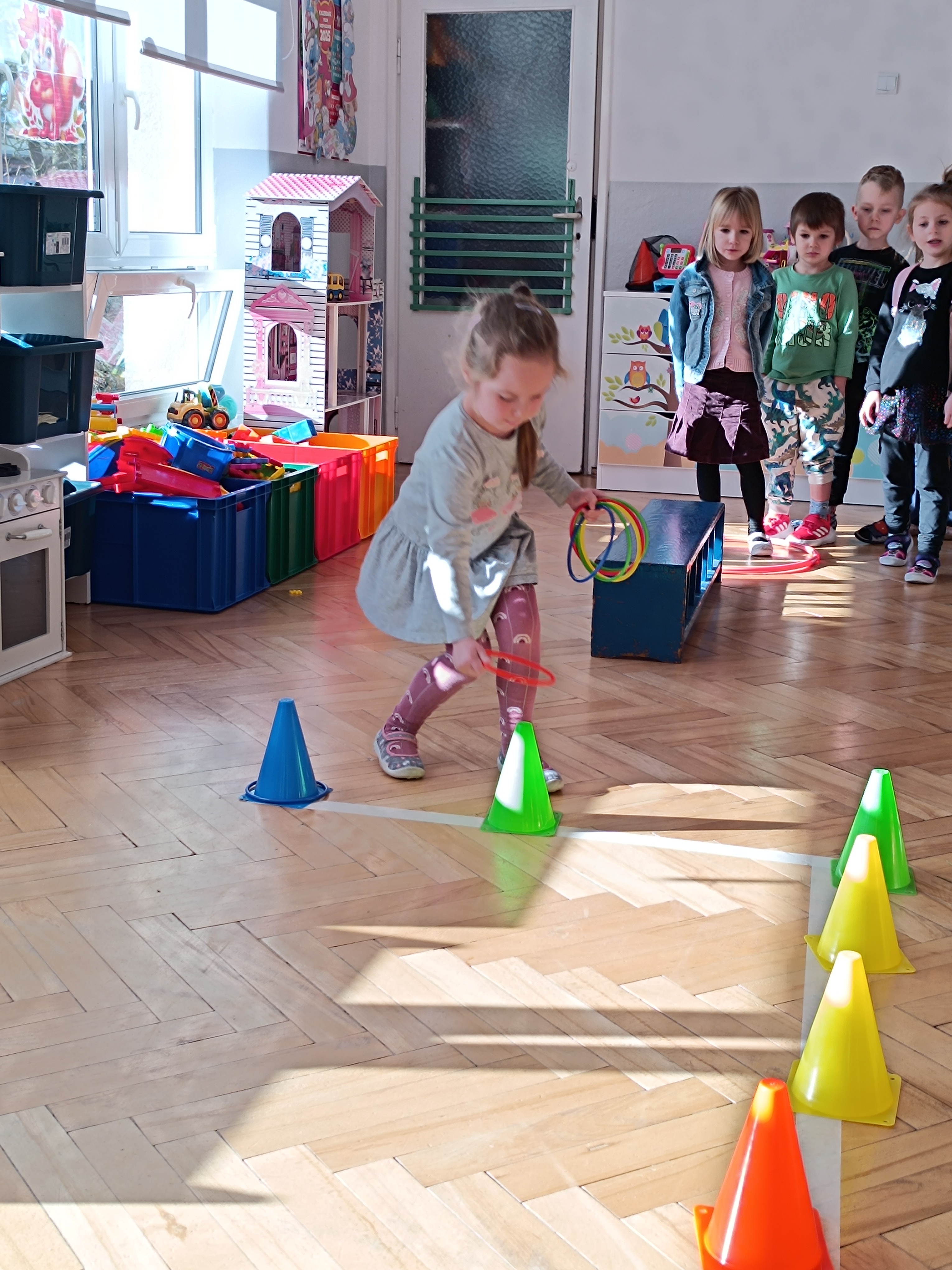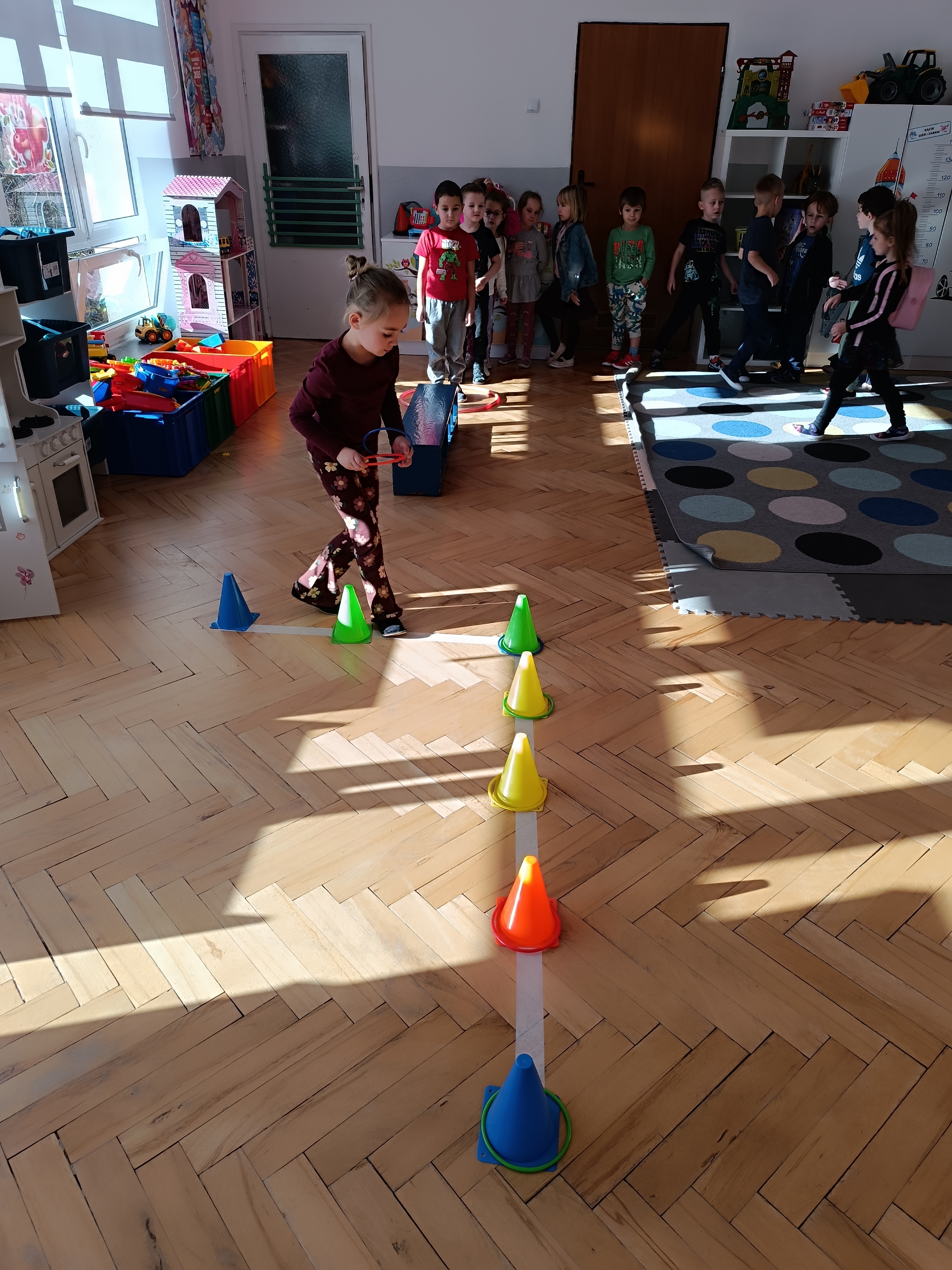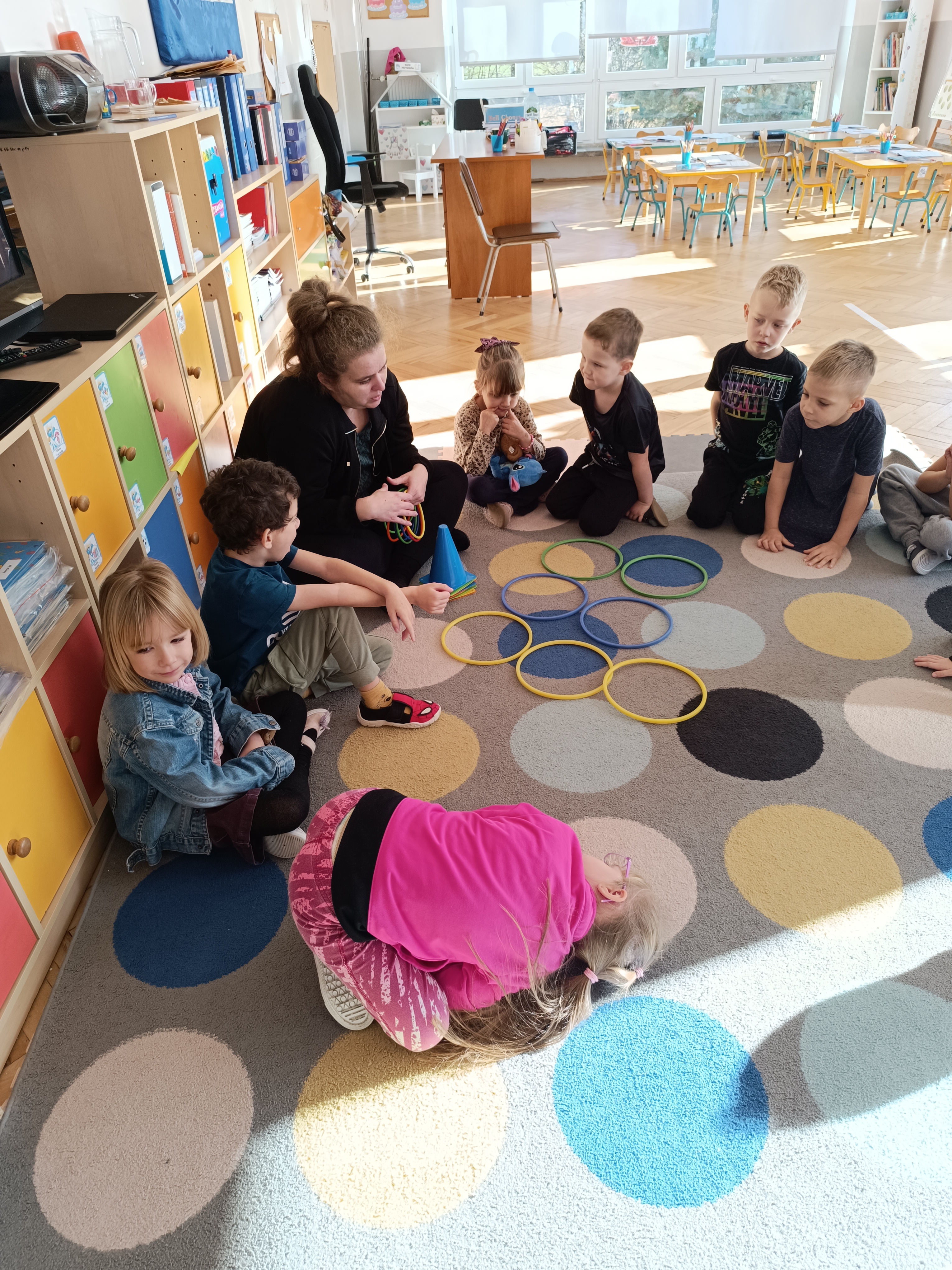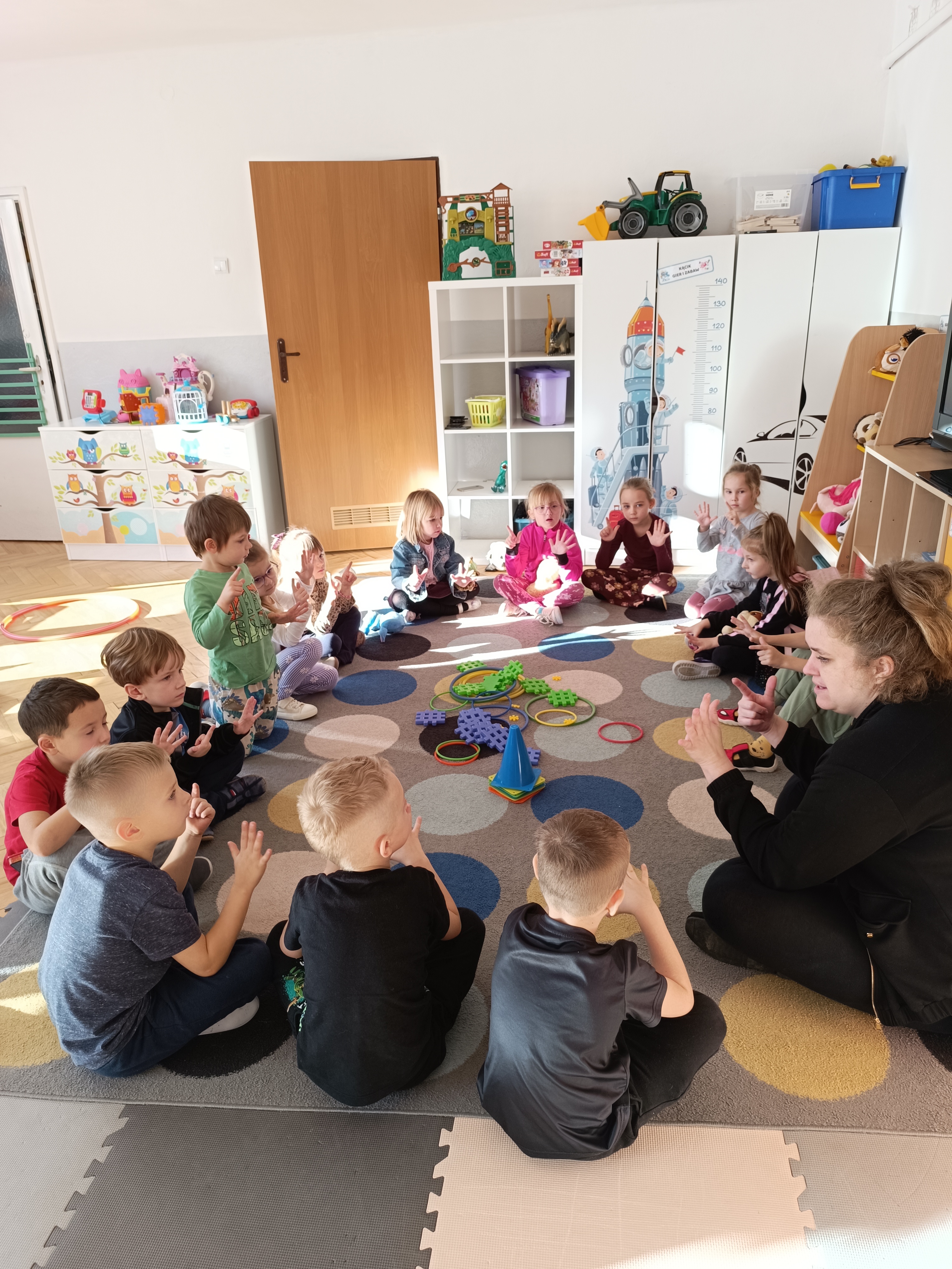 W tym tygodniu poznaliśmy również cyferkę 7 w aspekcie miarowym i porządkowym oraz jej zapis graficzny, uczestnicząc w zabawach matematycznych: " Czy schowałaś orzechy w pierwszej norce?" ; " Ile kołek zrobiła wiewiórka?"; " Jak wygląda siedem?" ; "Matematyczne ruchy".
