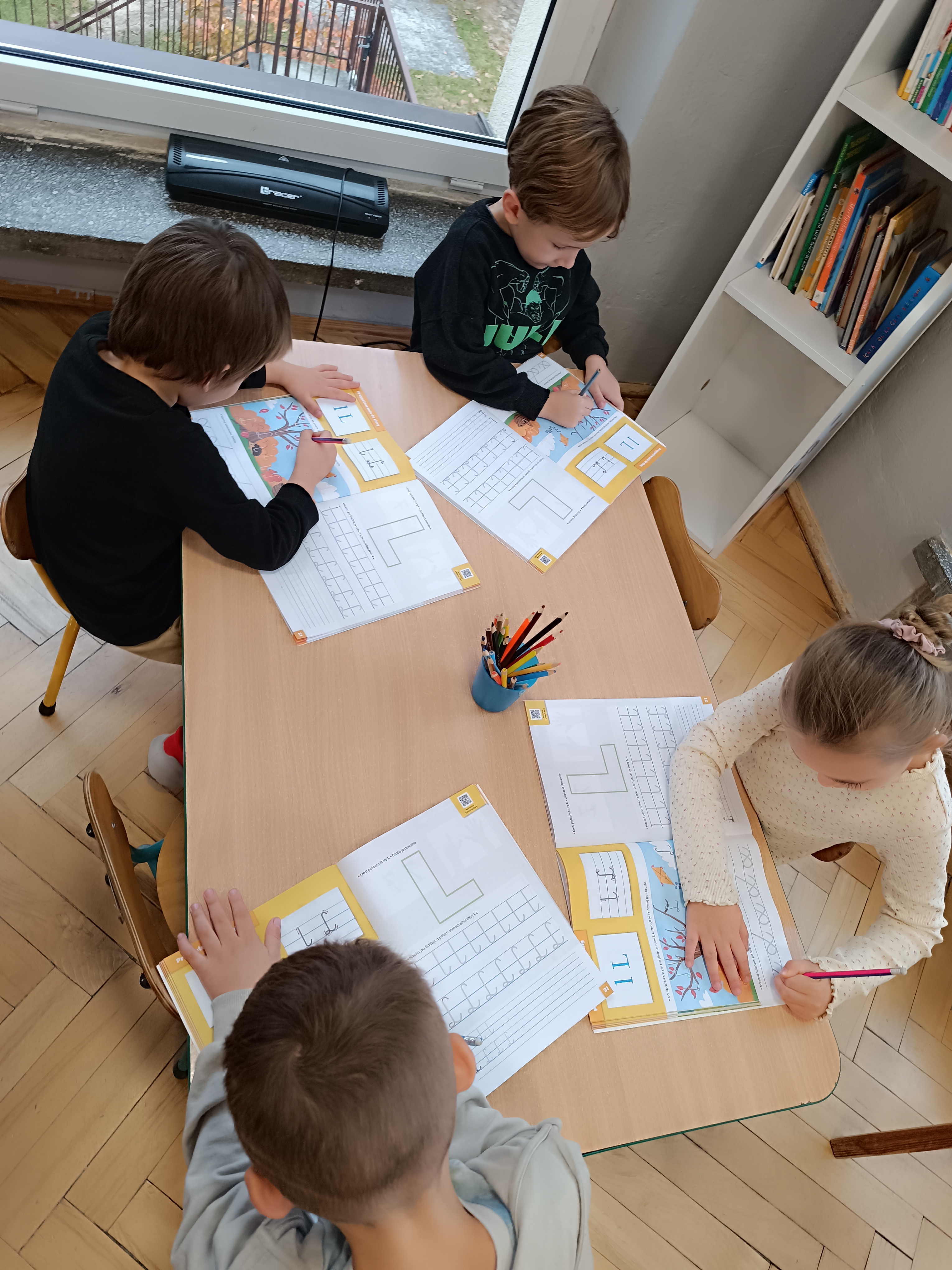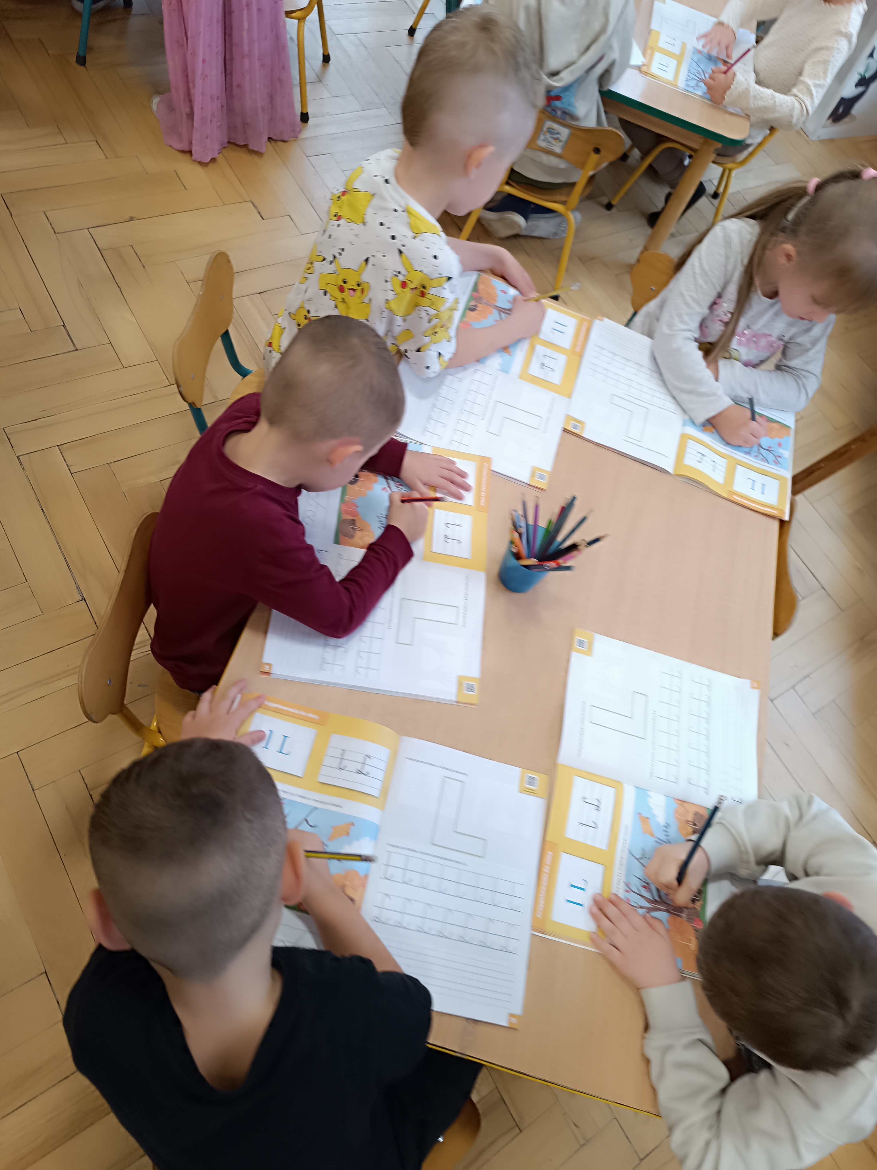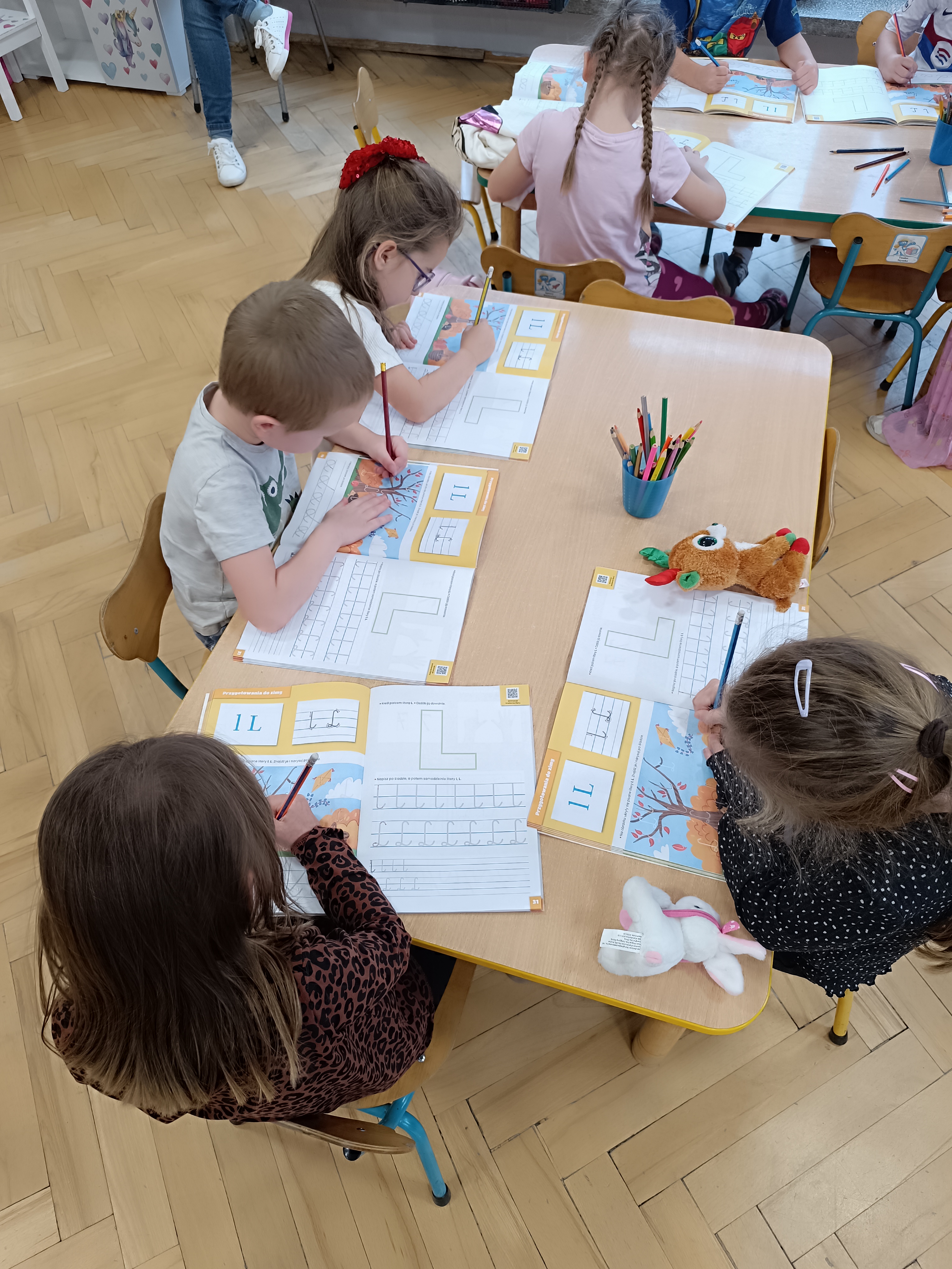 Poznaliśmy literkę L,l drukowaną oraz pisaną. Uczestniczyliśmy w zabawach ruchowych "Jeśli L, zróbcie las"; " Ułóż małe l".