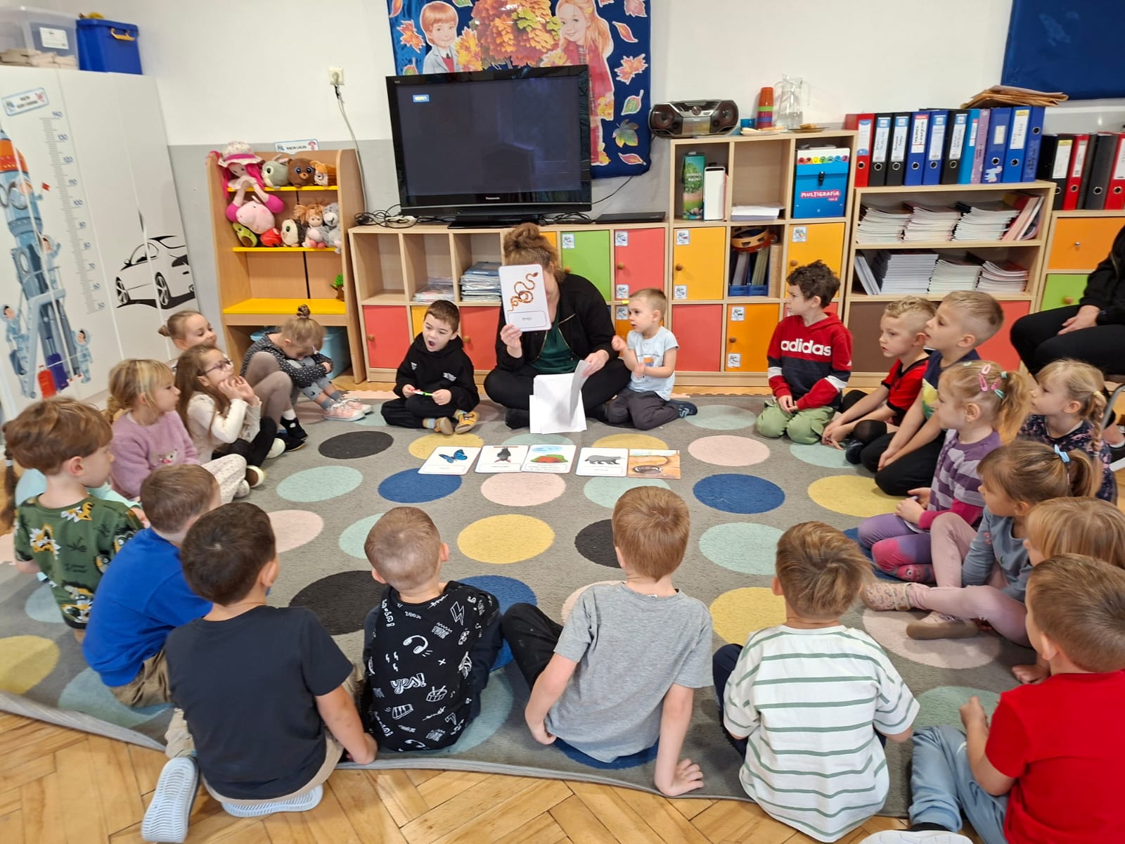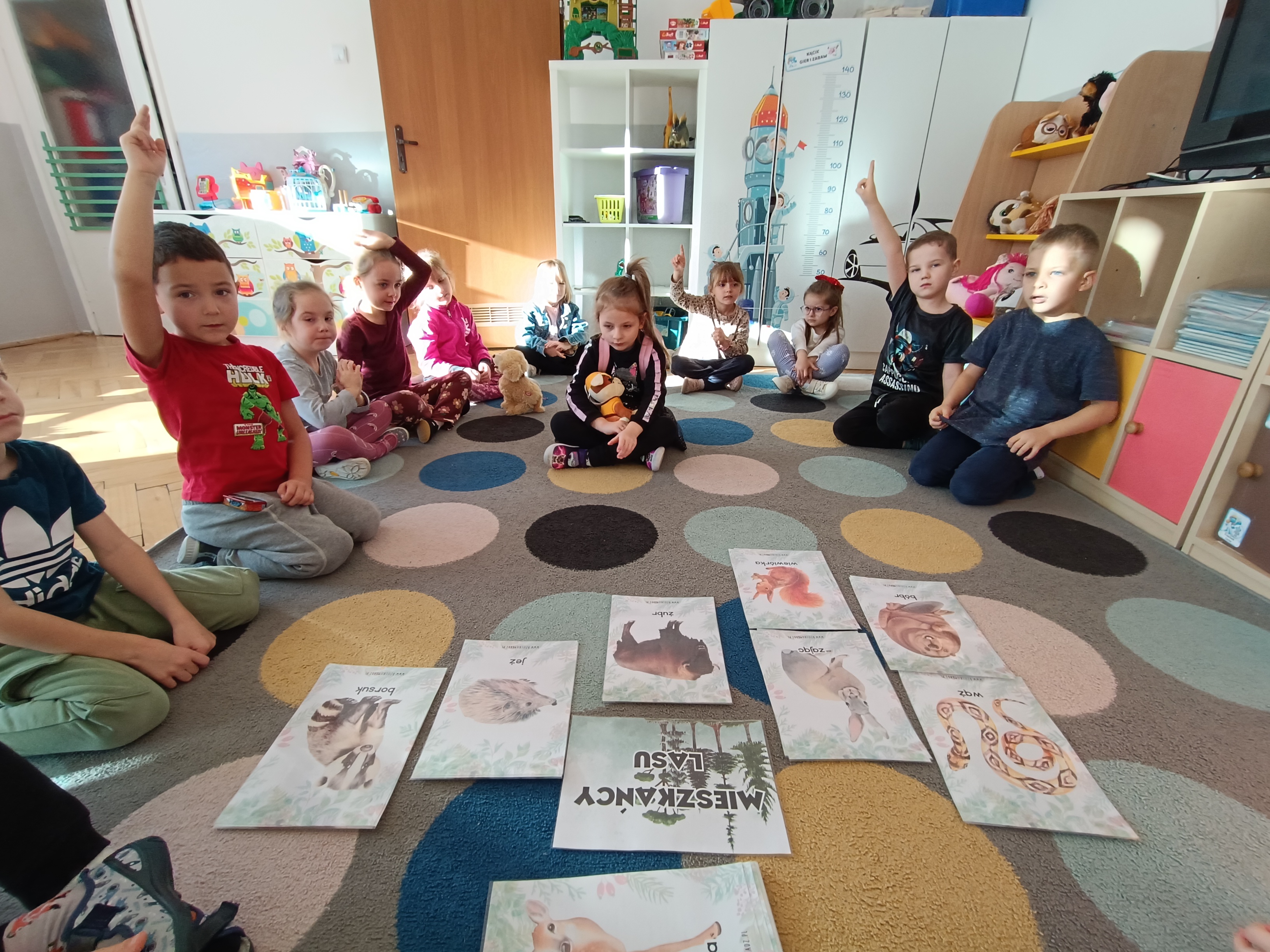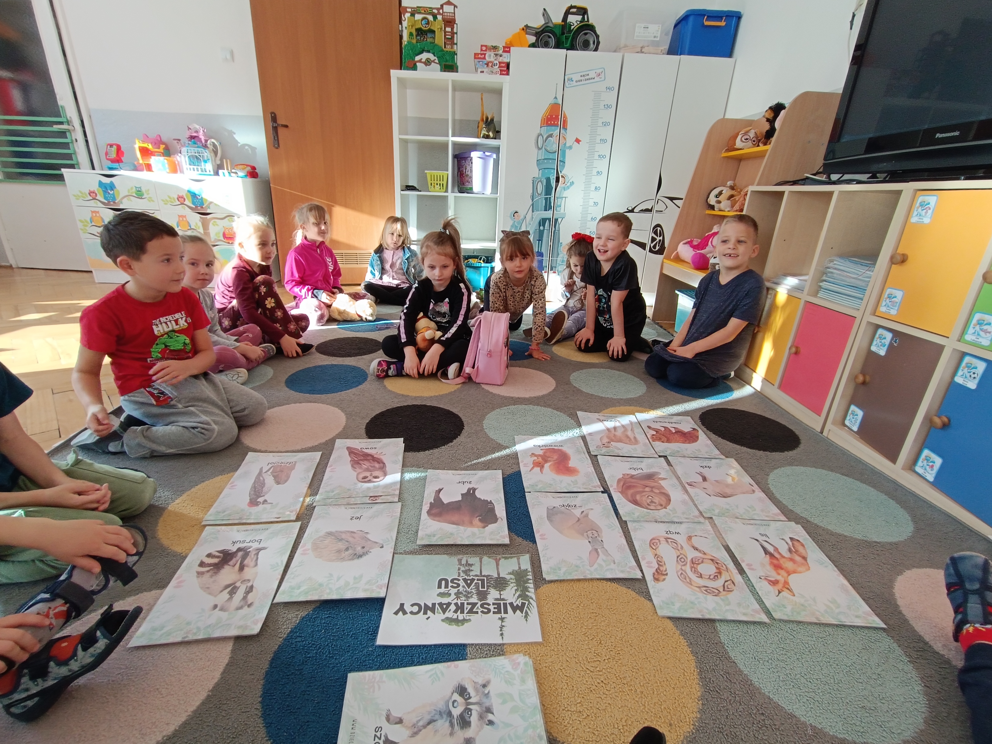 Rozmawialiśmy o zwierzętach, które zasypiają na zimę, o ich zapasach na zimę , o ptakach które opuszczają Polskę na zimę i odlatują do ciepłych krajów, a także o zwierzętach zamieszkujących lasy. Odgadywaliśmy zagadki Anny Urszuli Kamińskiej.