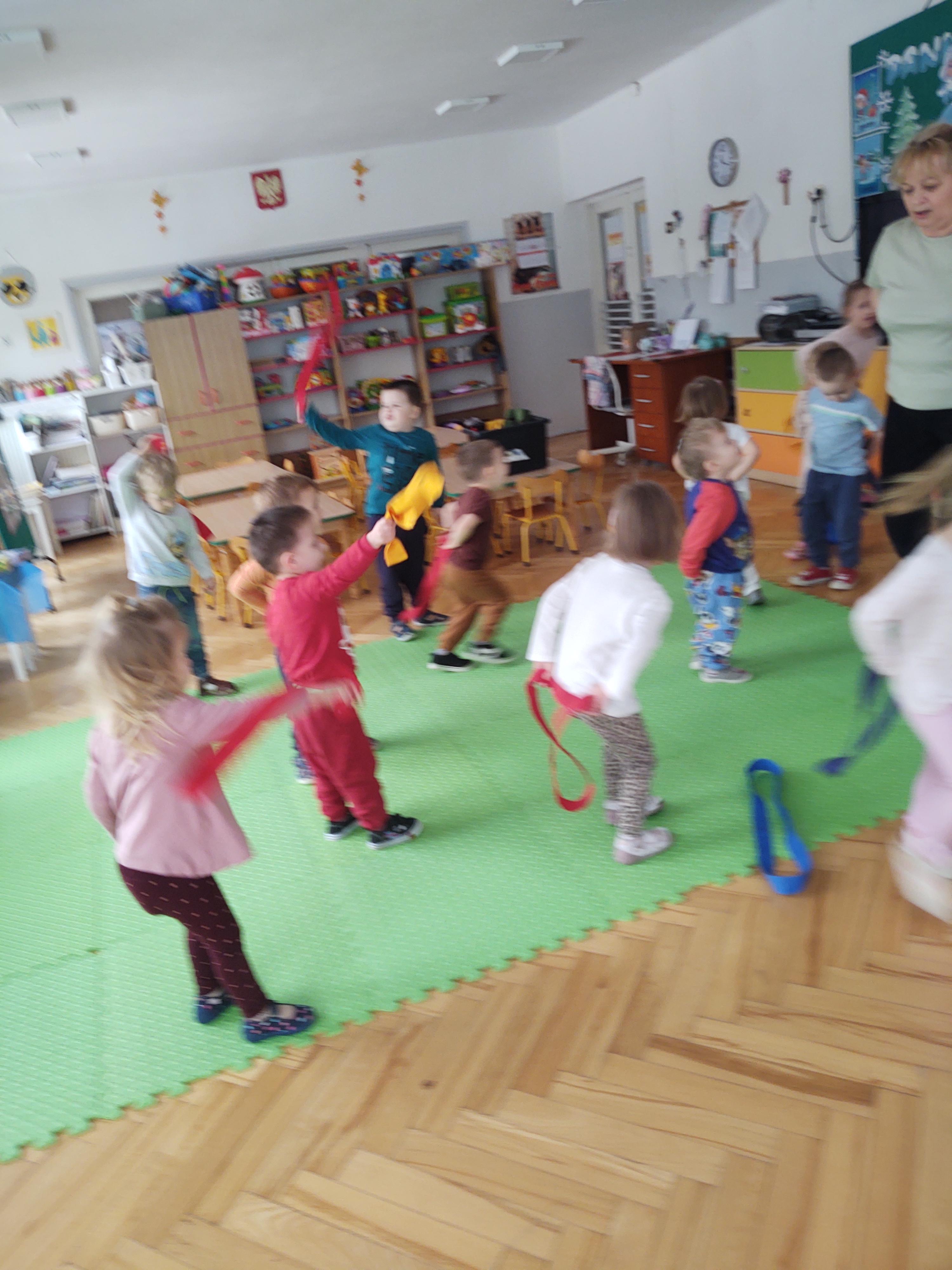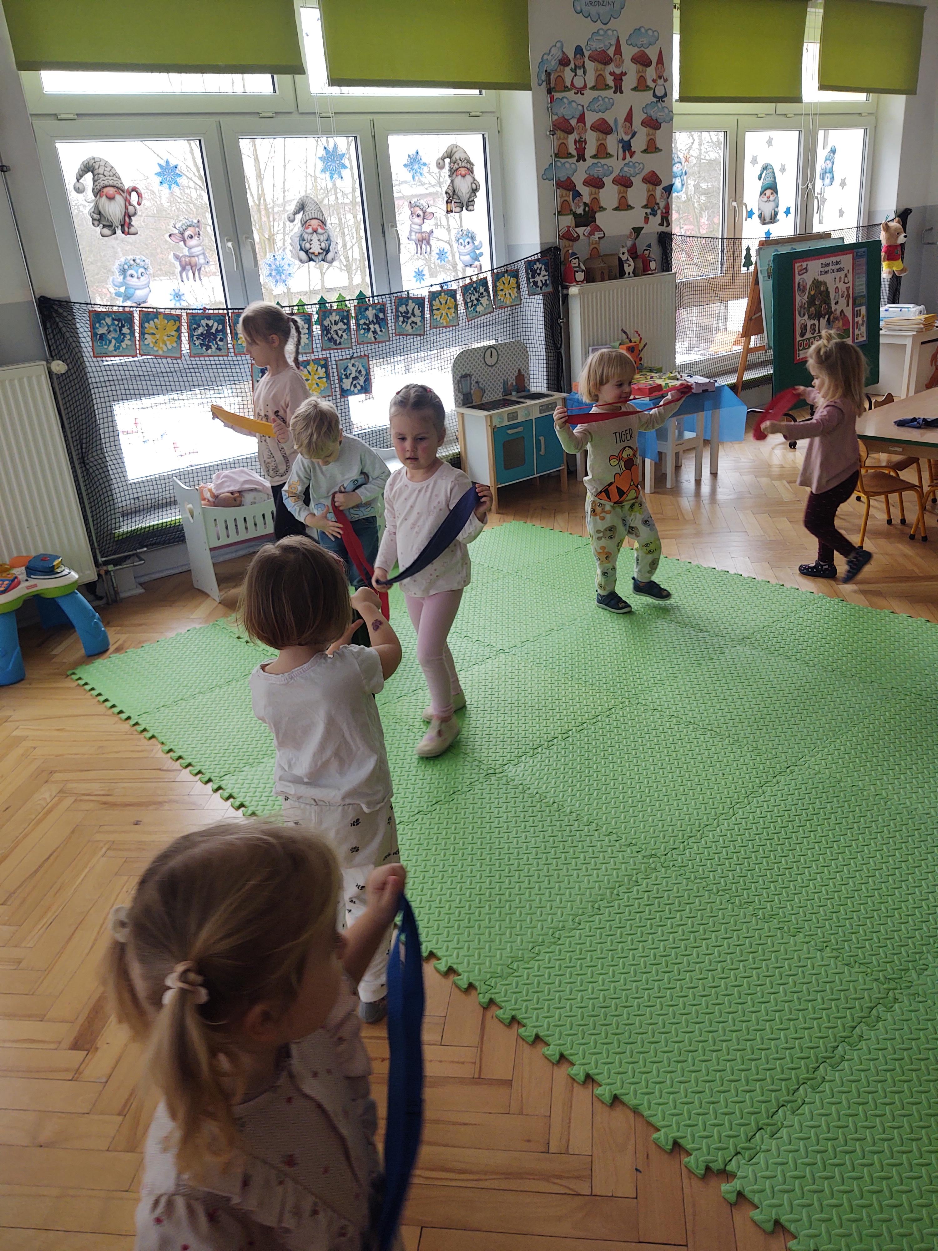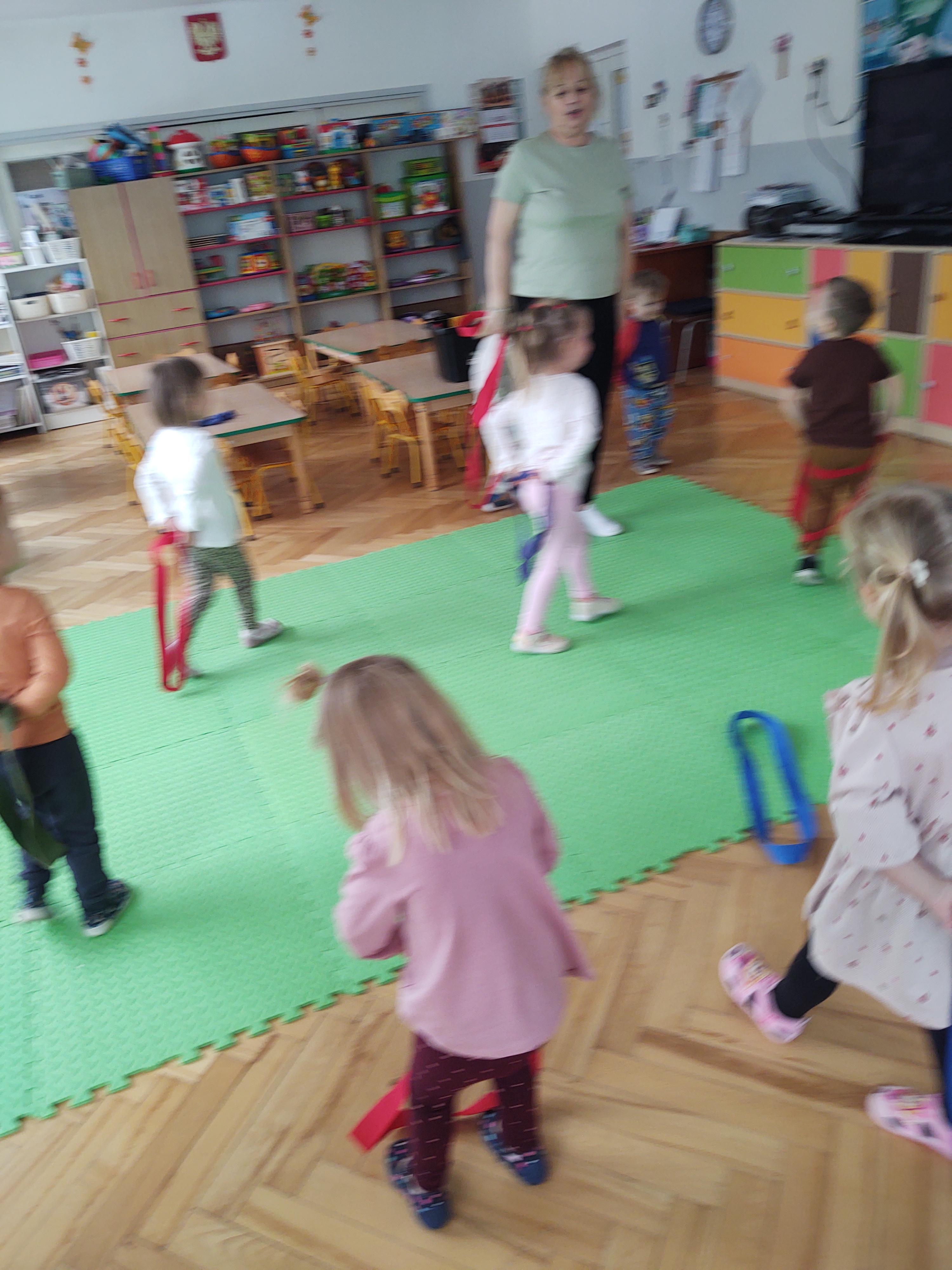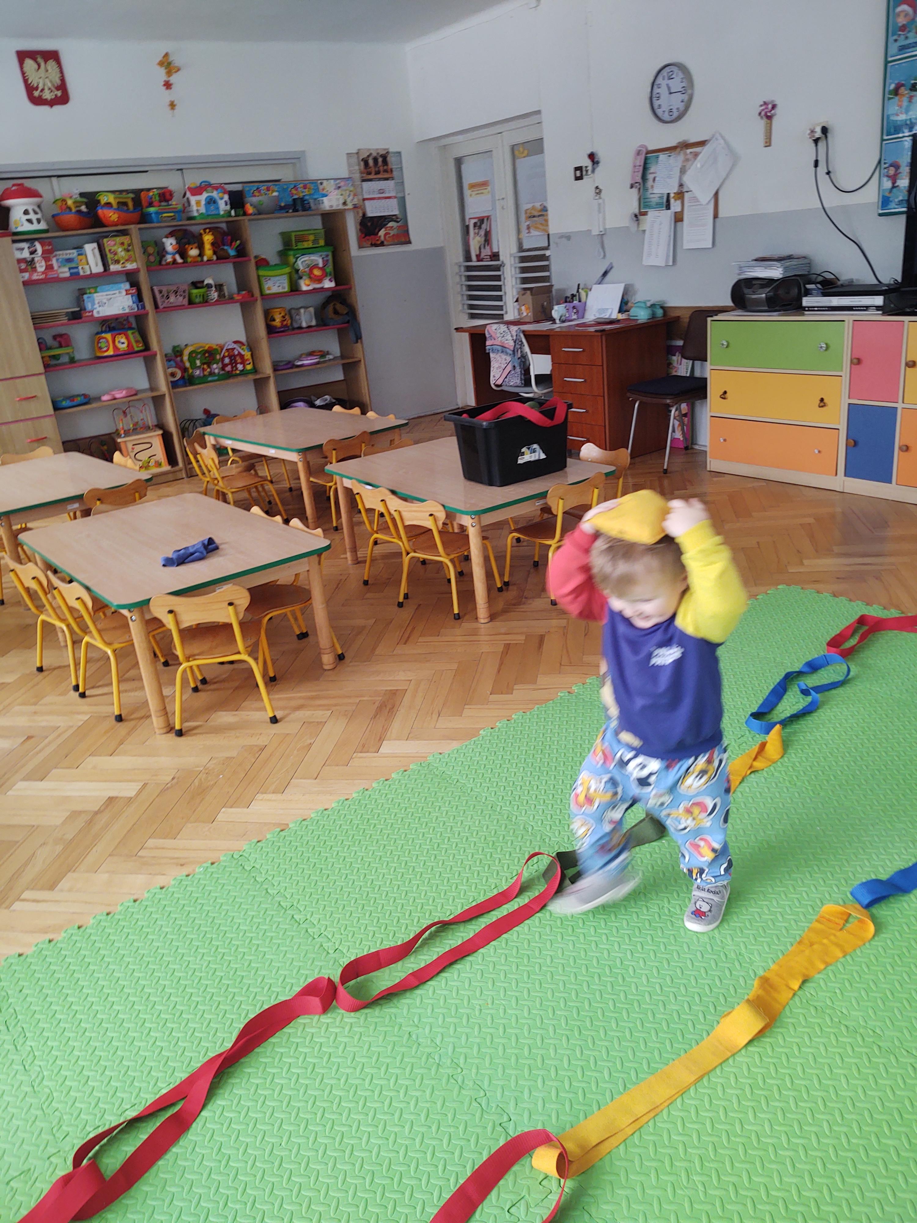Zabawy z szarfami sprzyjały także rozwijaniu kreatywności – dzieci proponowały własne sposoby wykorzystania przyborów, tworzyły „tory przeszkód” oraz wymyślały nowe formy aktywności. Dzięki temu zajęcia miały nie tylko charakter ruchowy, ale również twórczy i integracyjny.