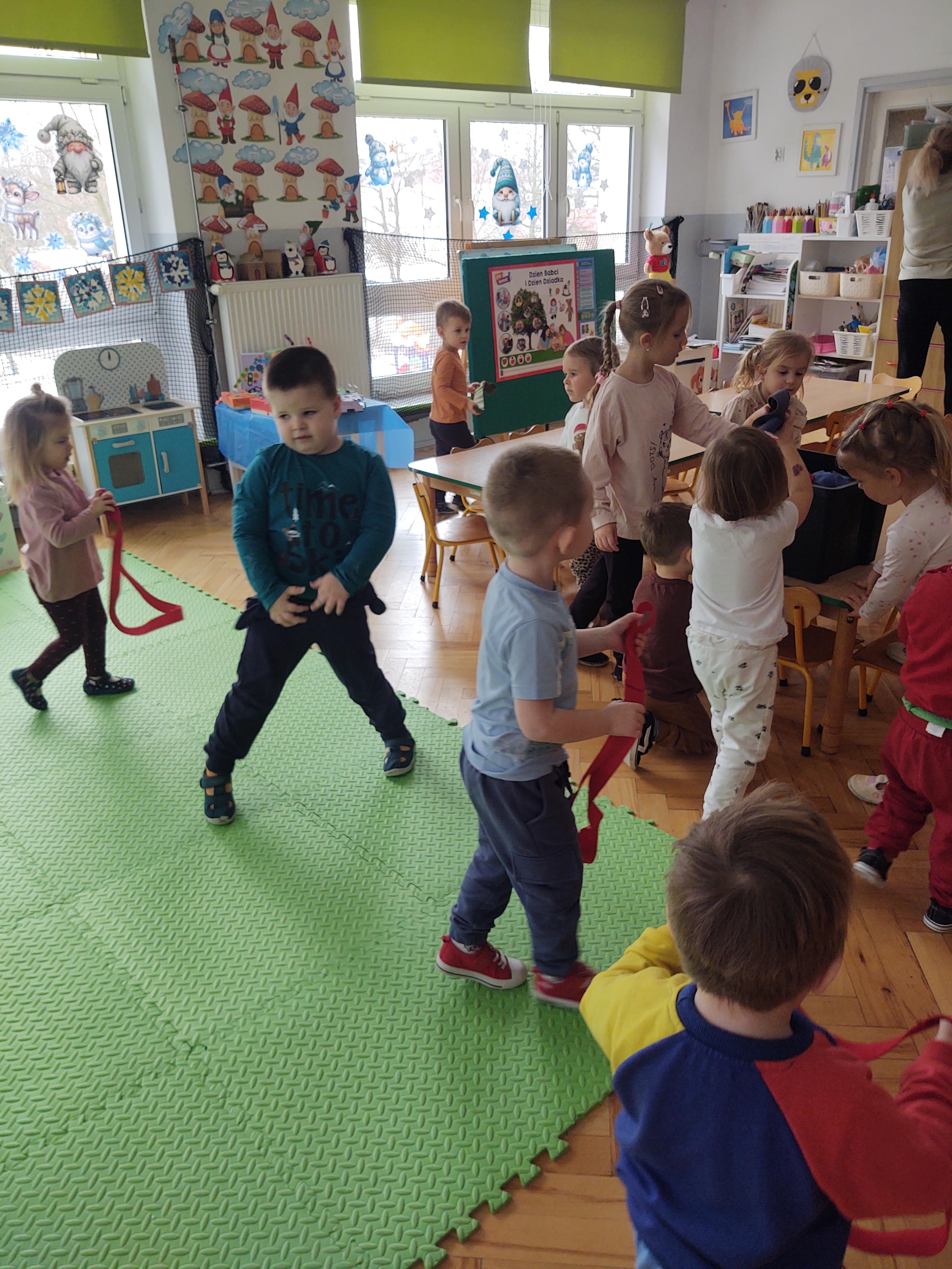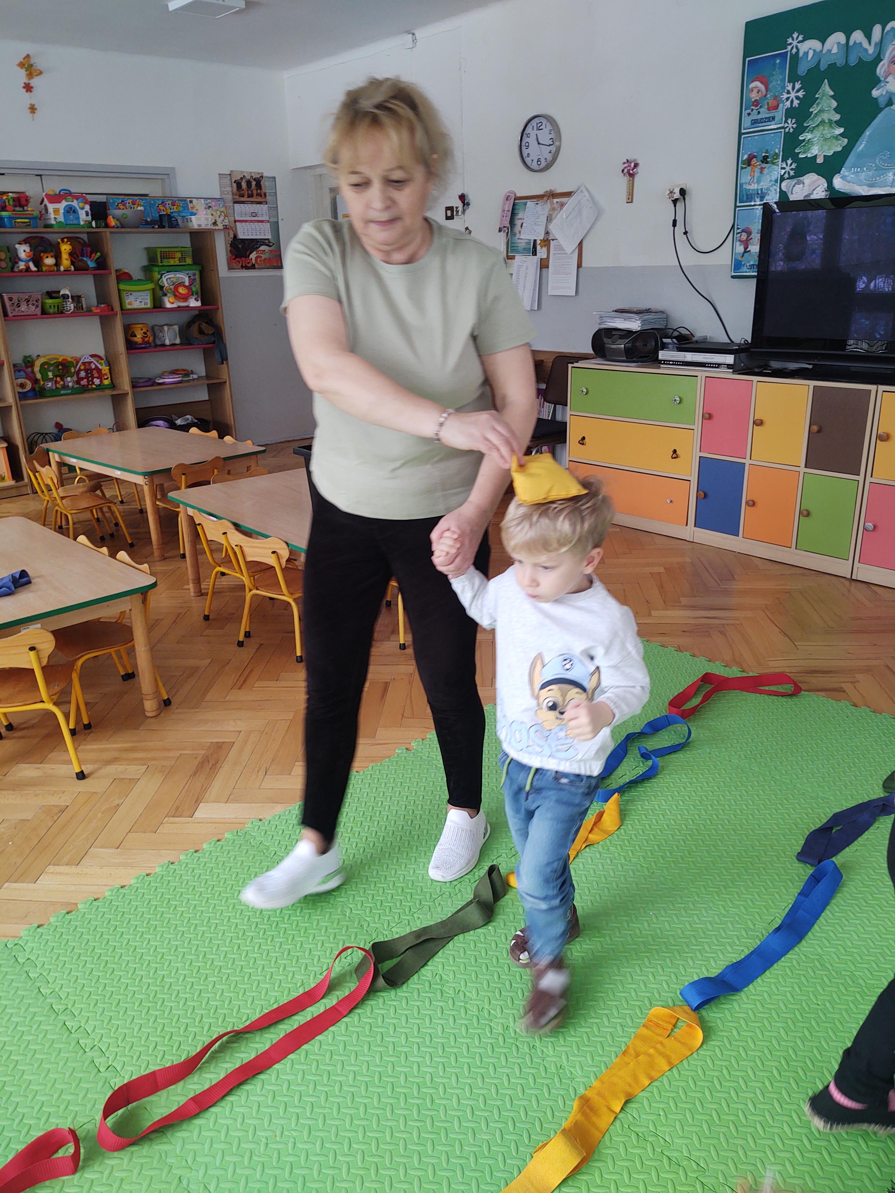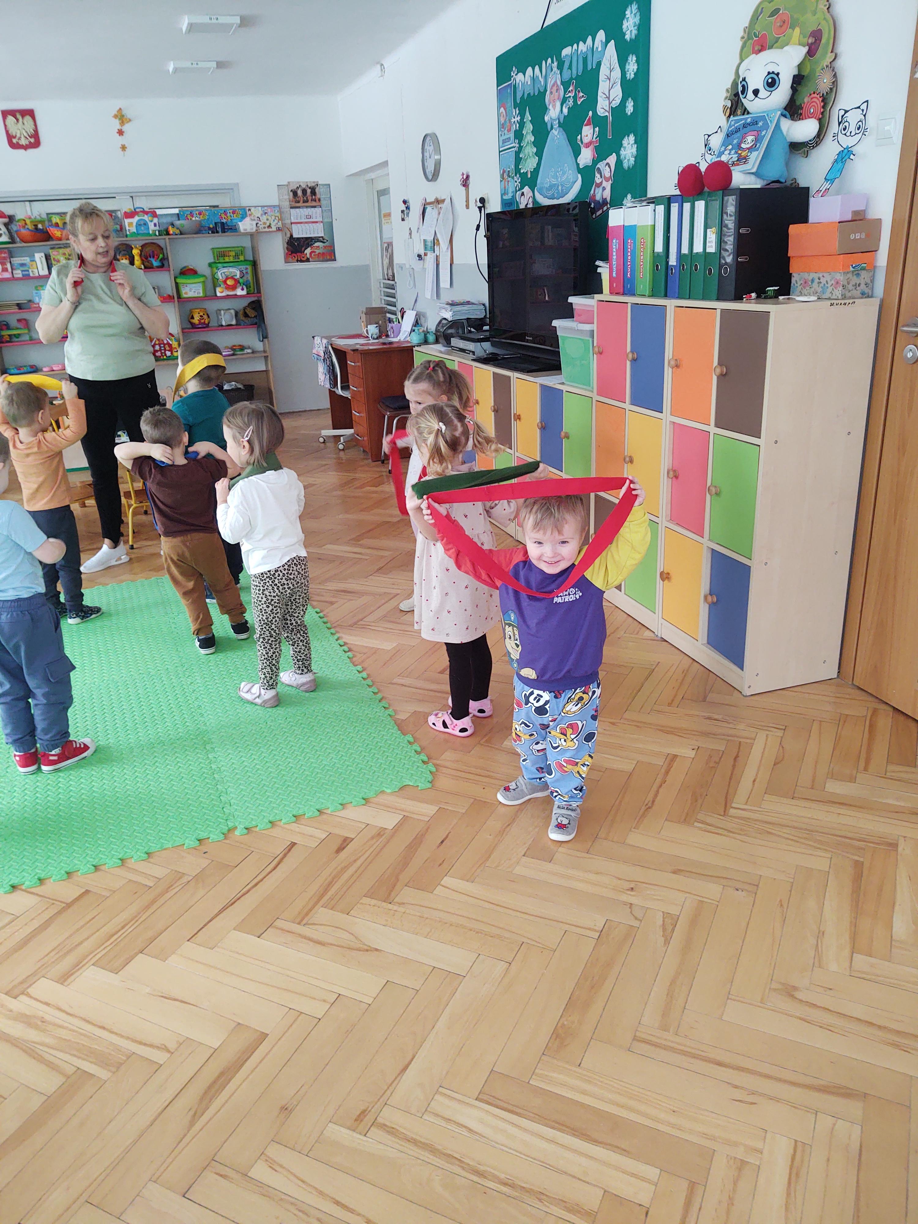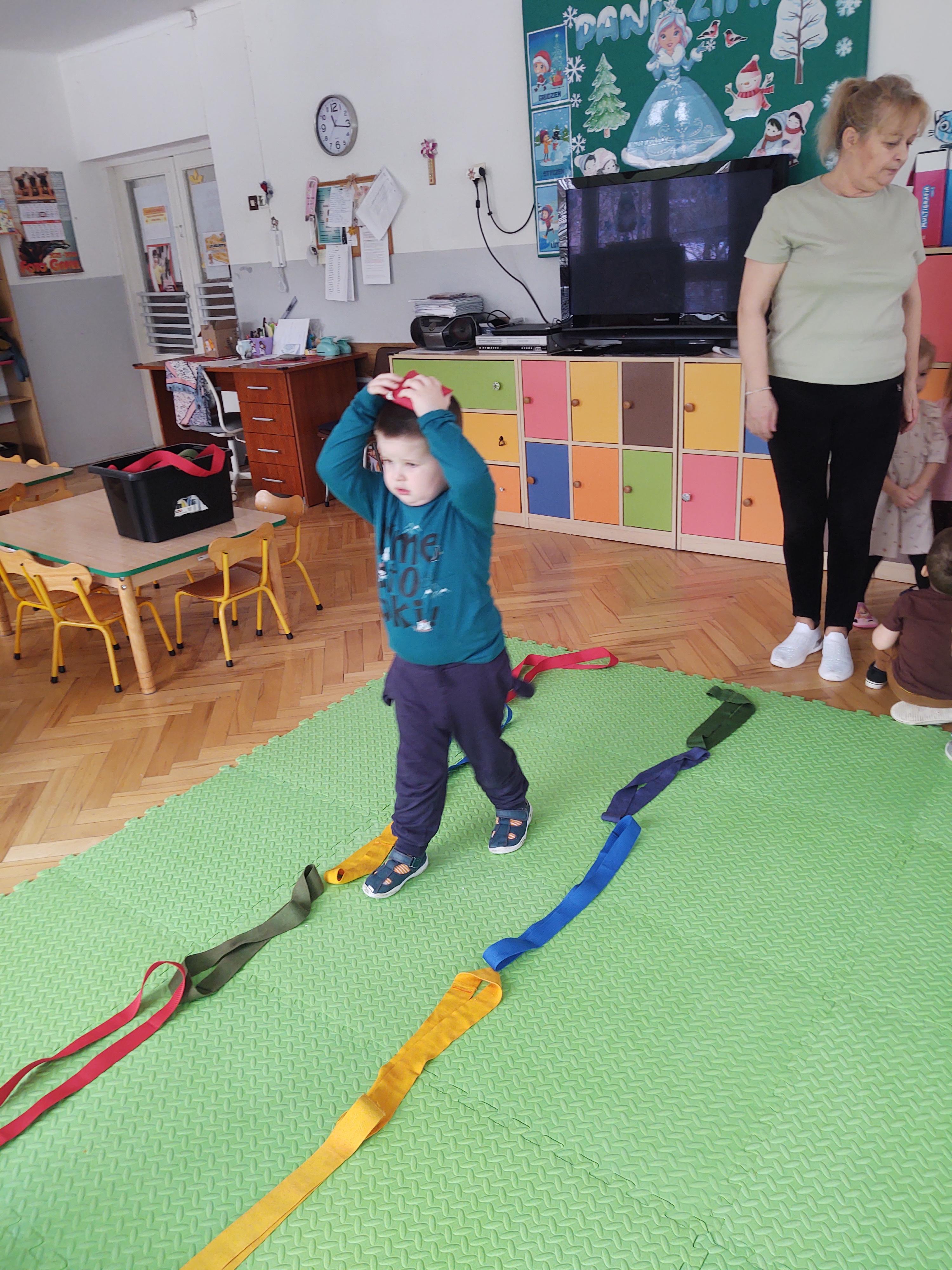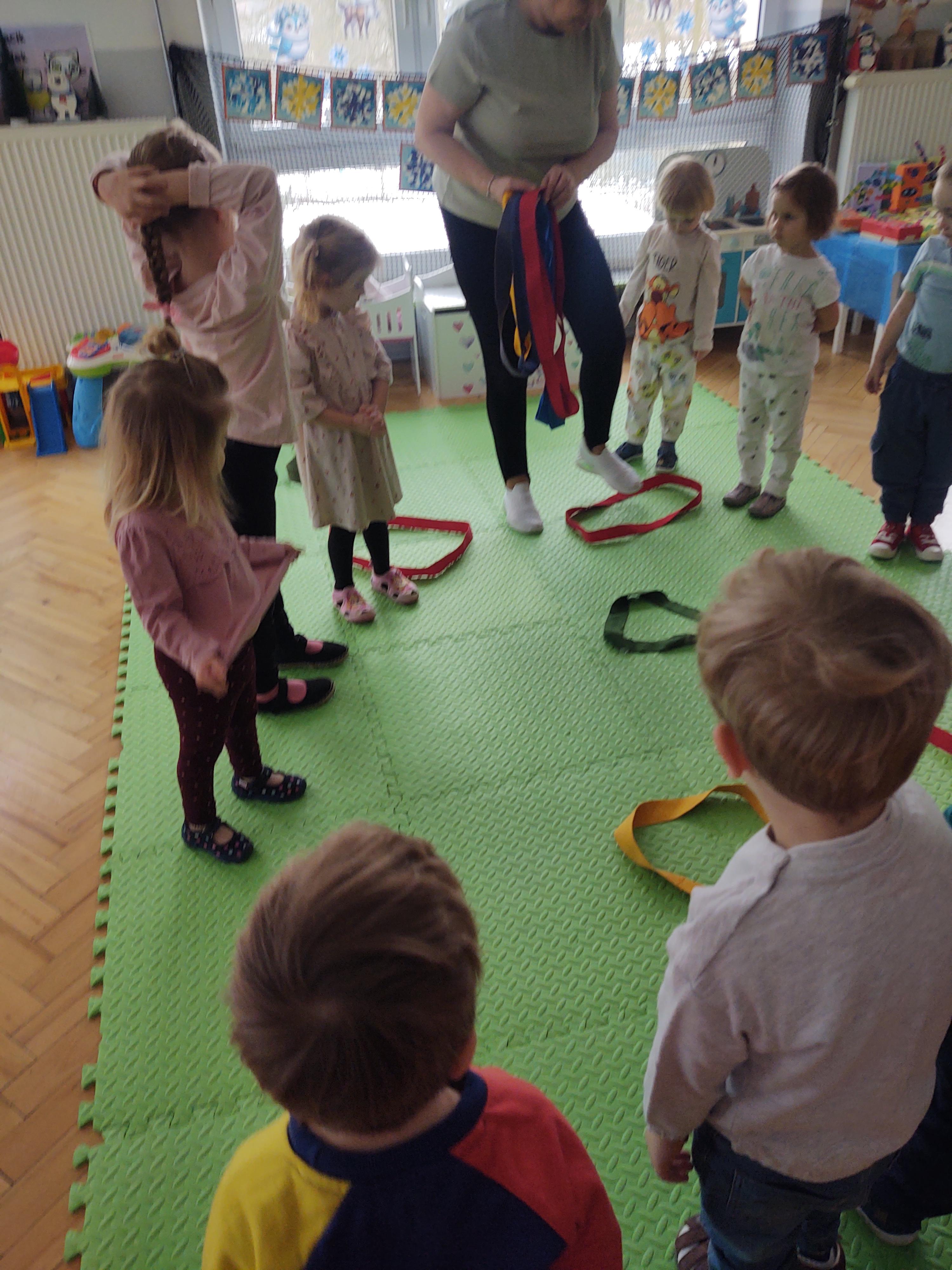 Zabawy z szarfami sprzyjały także rozwijaniu kreatywności – dzieci proponowały własne sposoby wykorzystania przyborów, tworzyły „tory przeszkód” oraz wymyślały nowe formy aktywności. Dzięki temu zajęcia miały nie tylko charakter ruchowy, ale również twórczy i integracyjny.