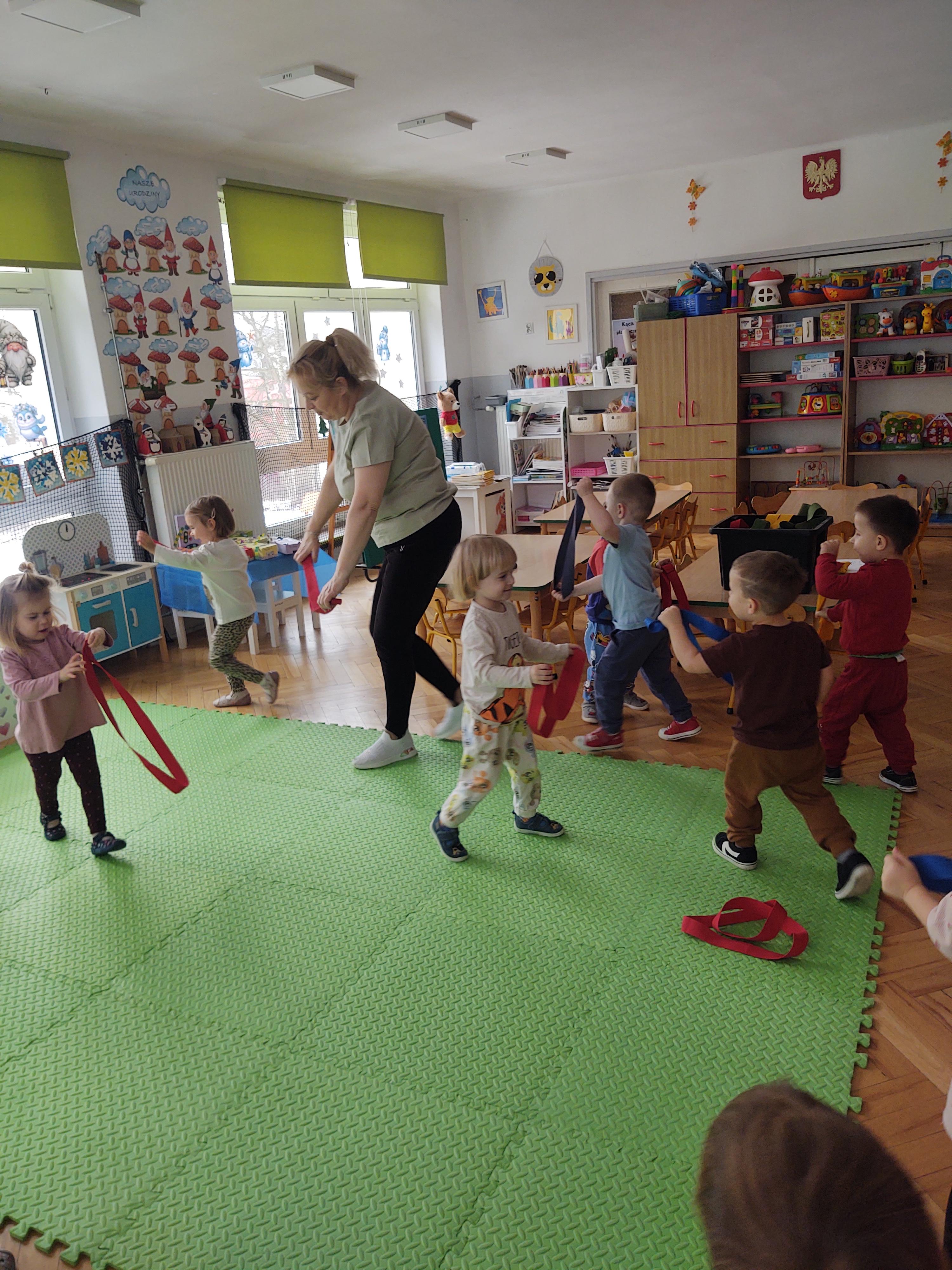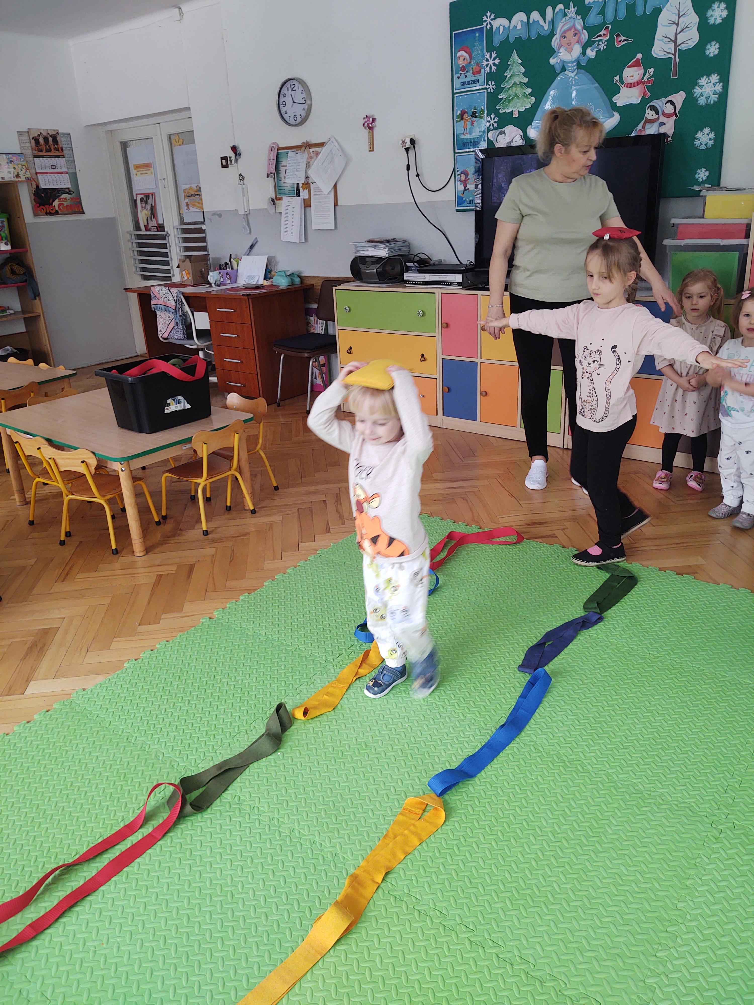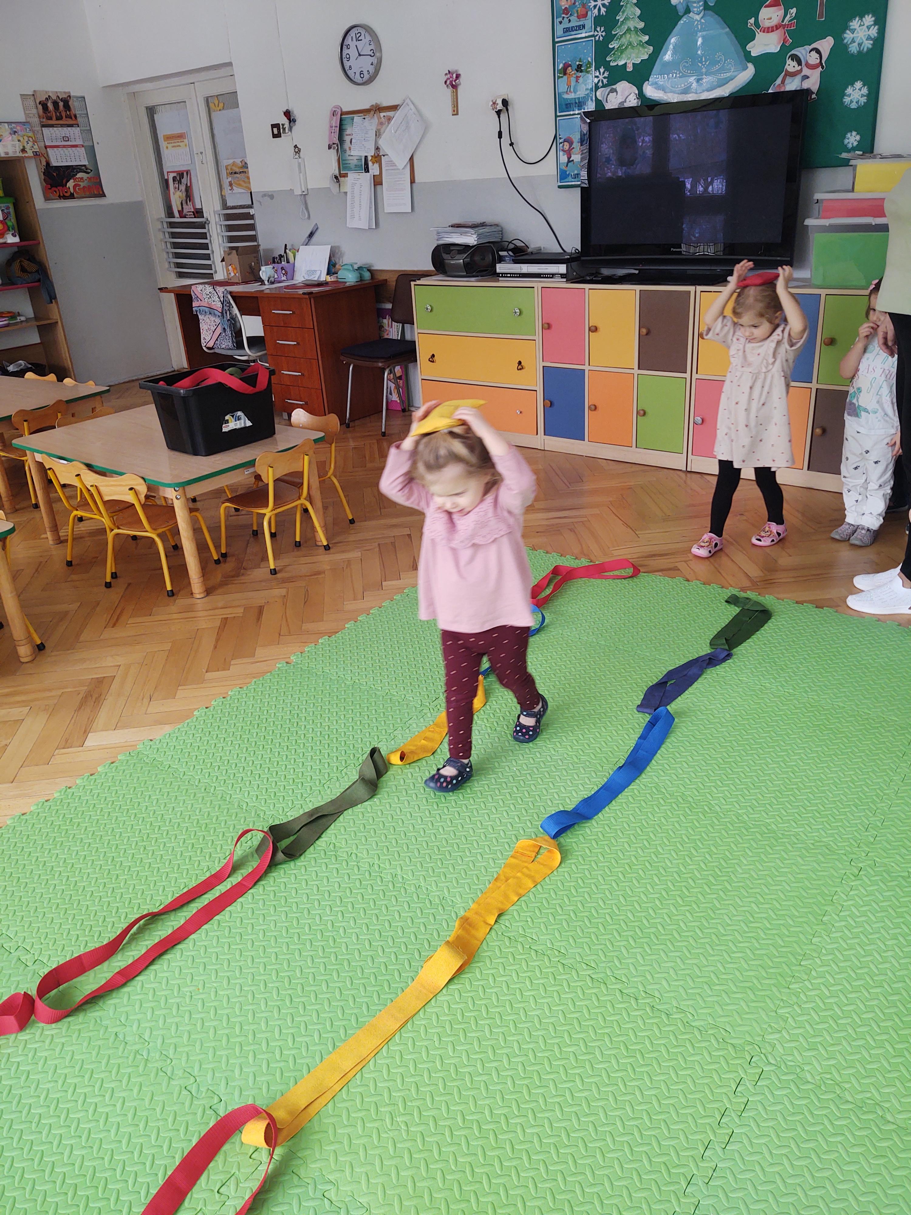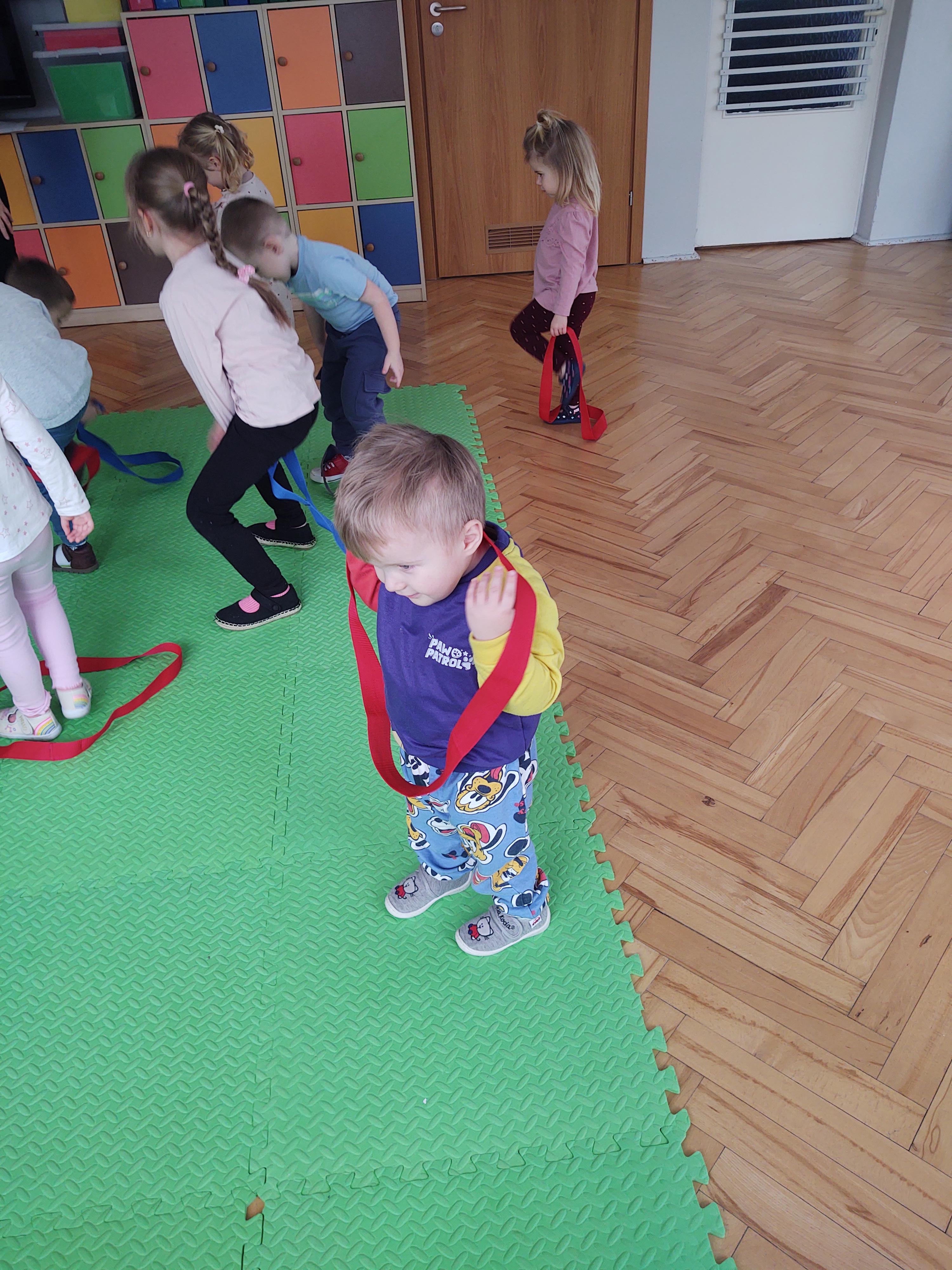 Zabawy z szarfami sprzyjały także rozwijaniu kreatywności – dzieci proponowały własne sposoby wykorzystania przyborów, tworzyły „tory przeszkód” oraz wymyślały nowe formy aktywności. Dzięki temu zajęcia miały nie tylko charakter ruchowy, ale również twórczy i integracyjny.