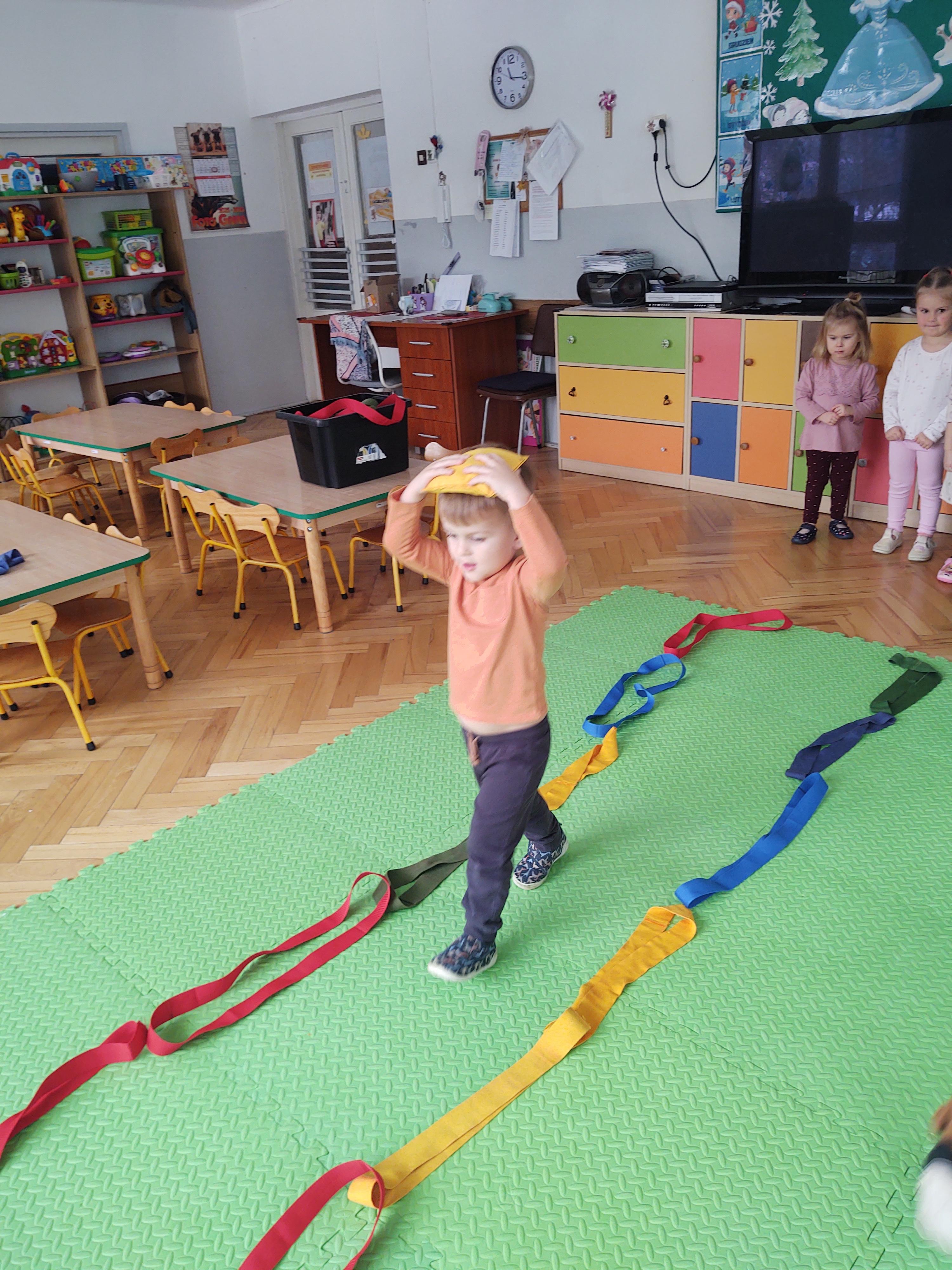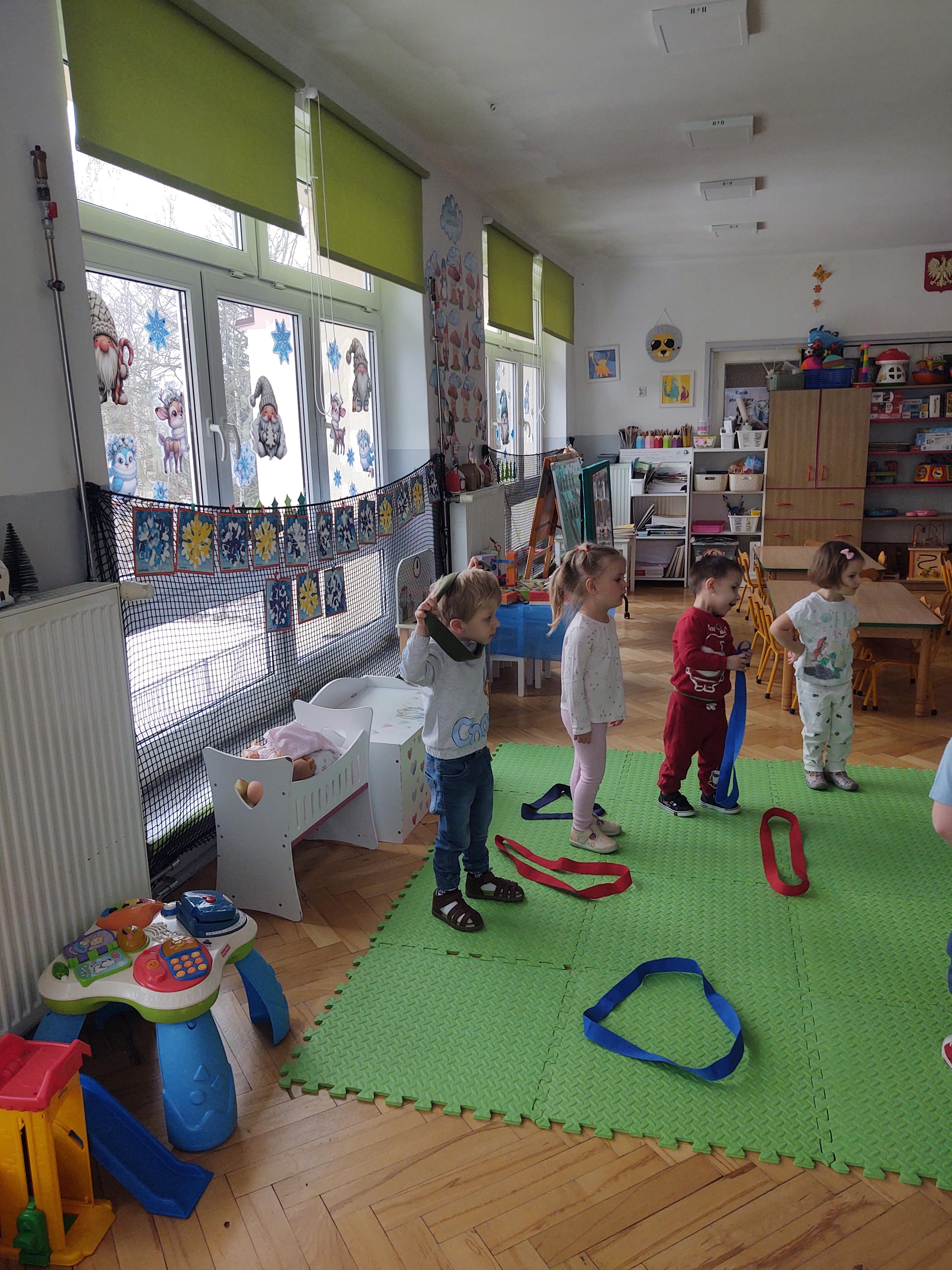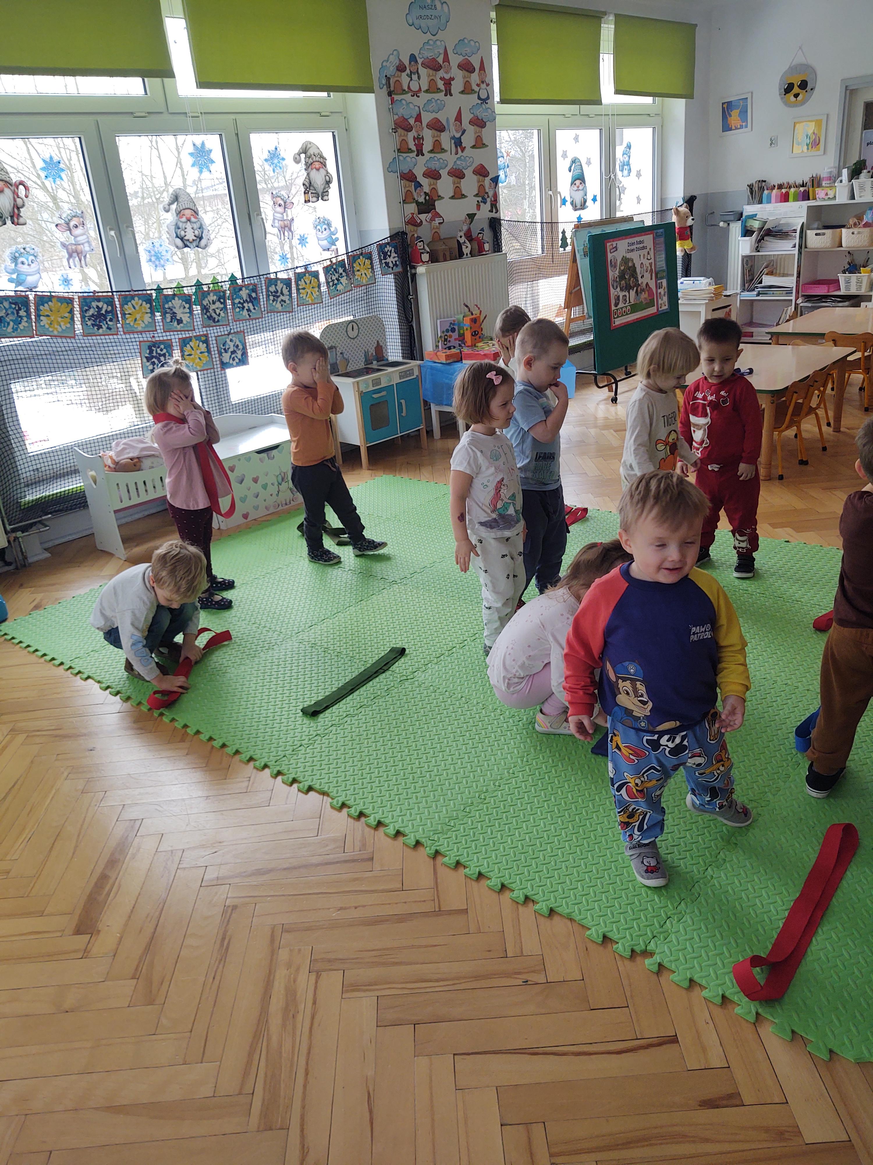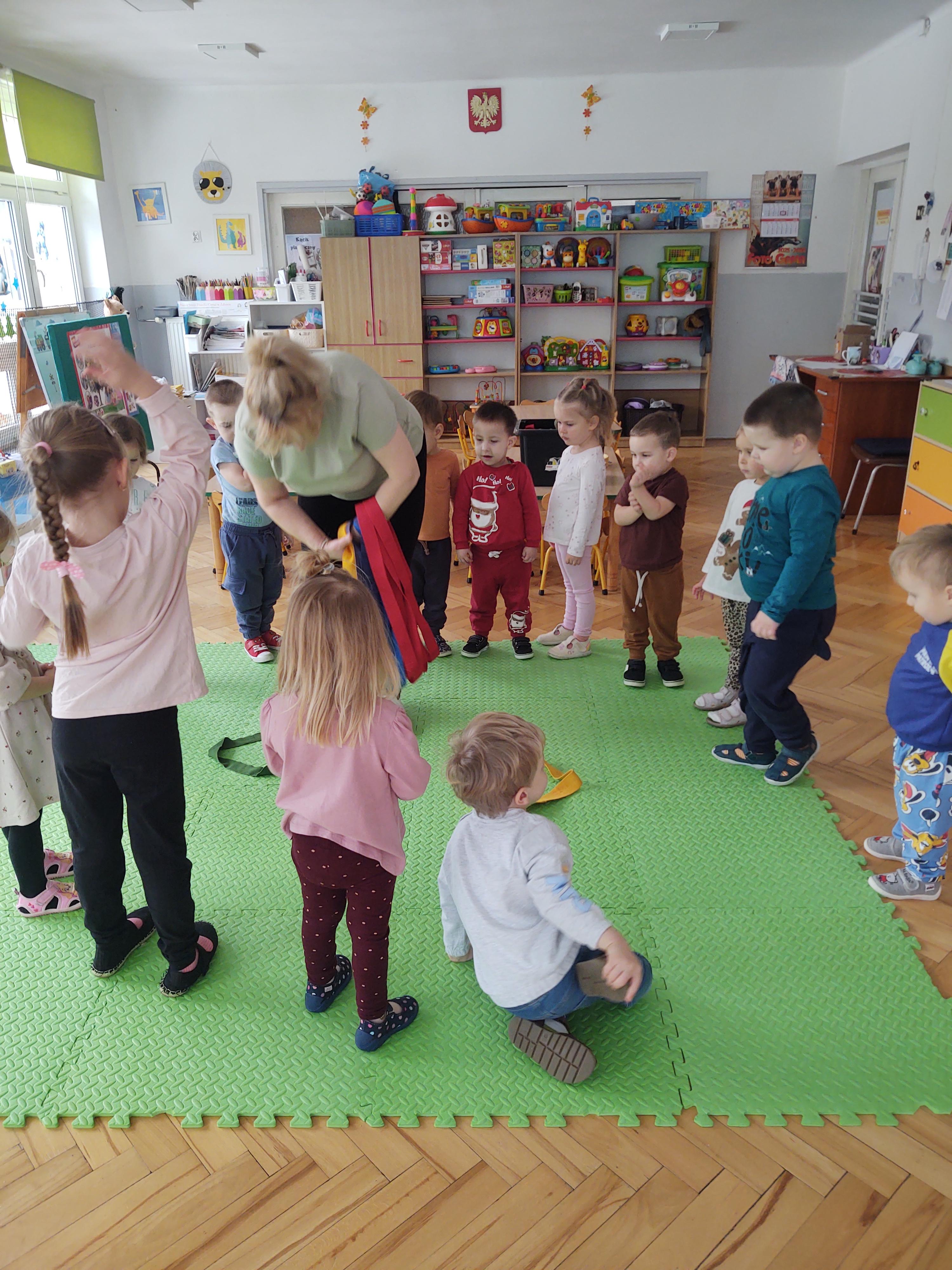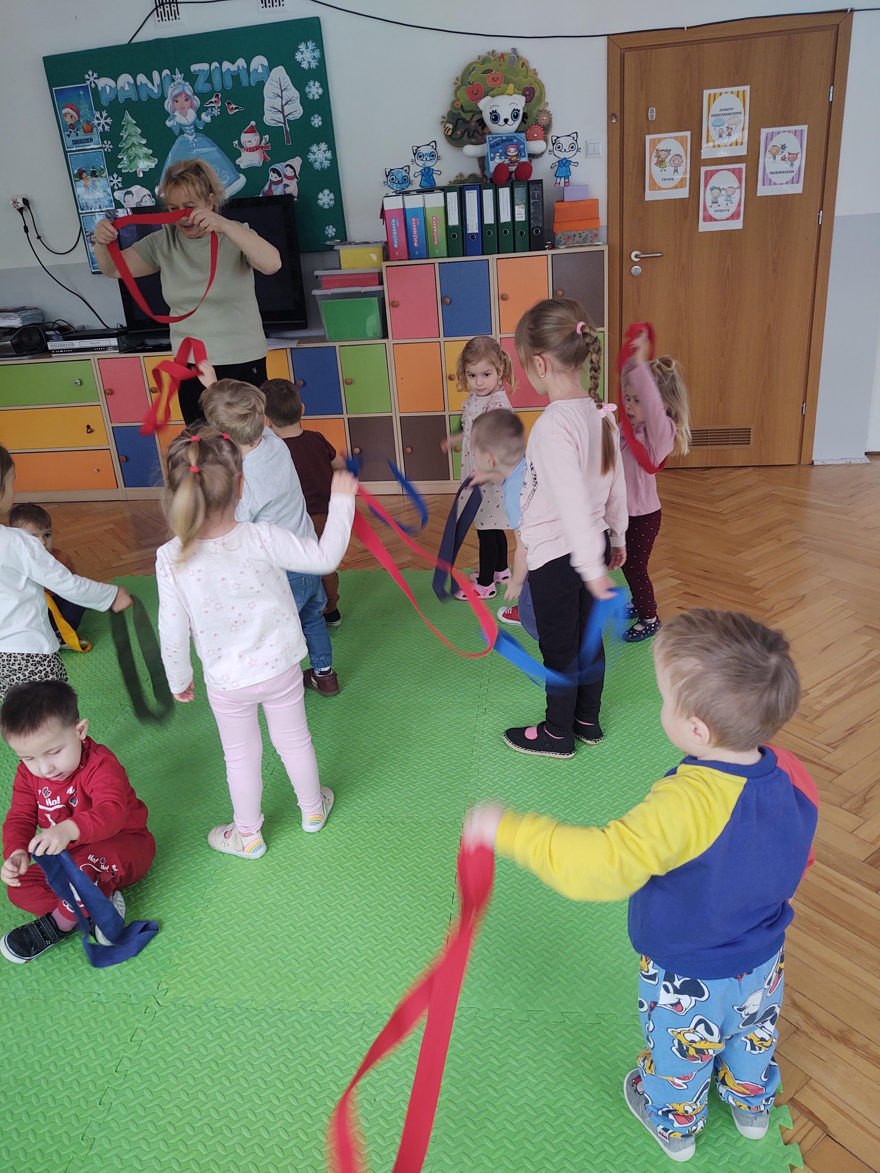 Zabawy z szarfami sprzyjały także rozwijaniu kreatywności – dzieci proponowały własne sposoby wykorzystania przyborów, tworzyły „tory przeszkód” oraz wymyślały nowe formy aktywności. Dzięki temu zajęcia miały nie tylko charakter ruchowy, ale również twórczy i integracyjny.