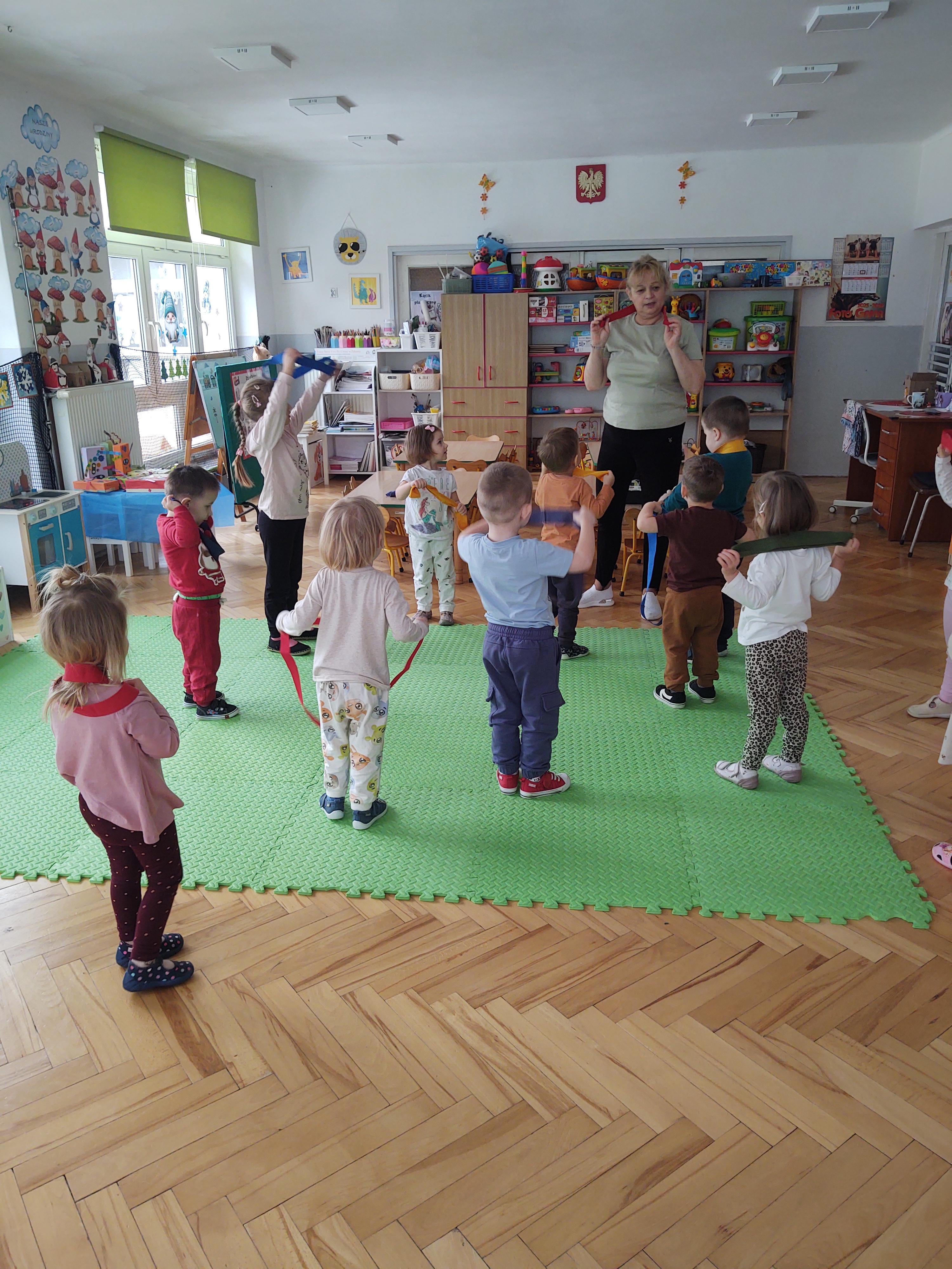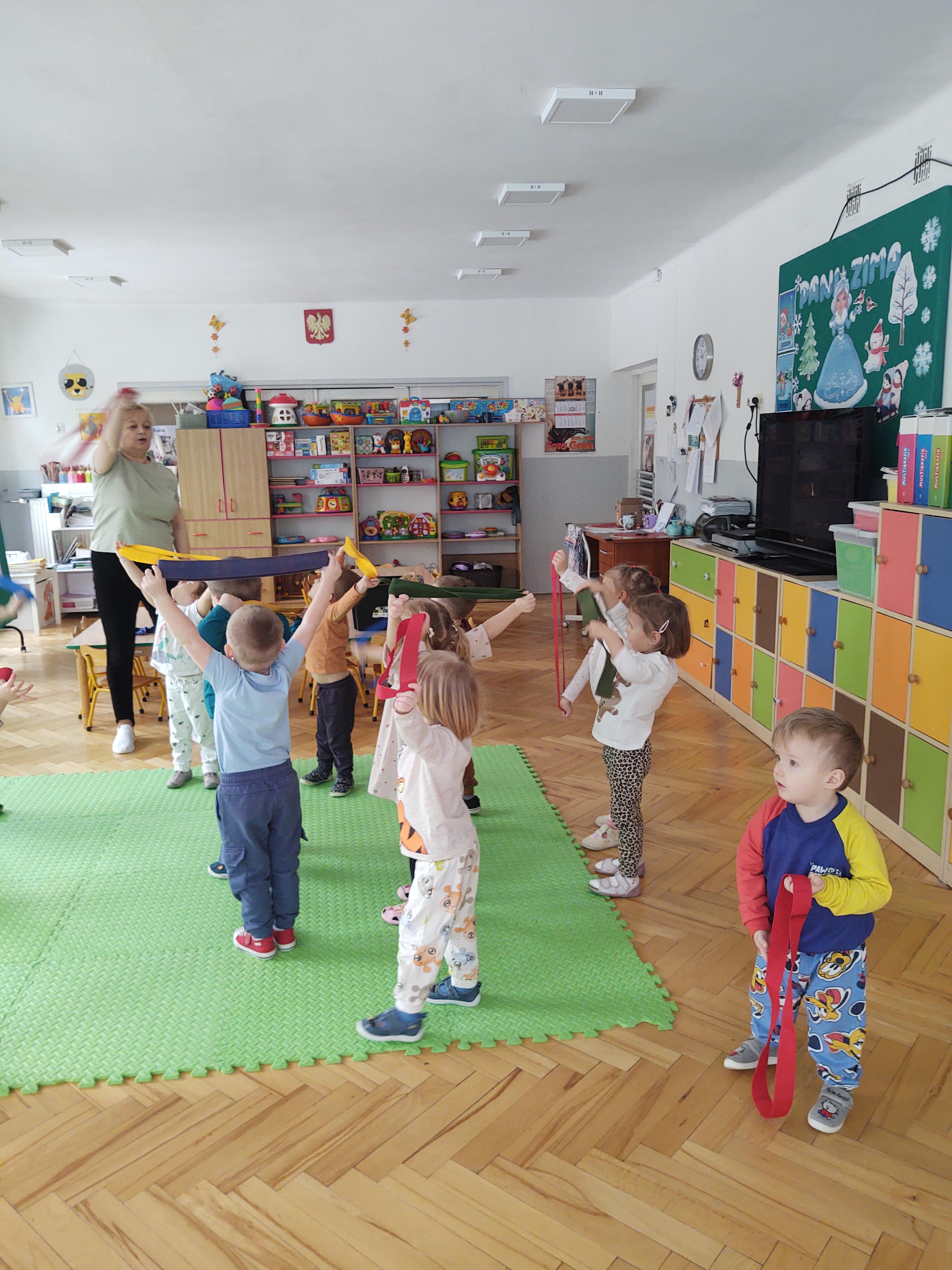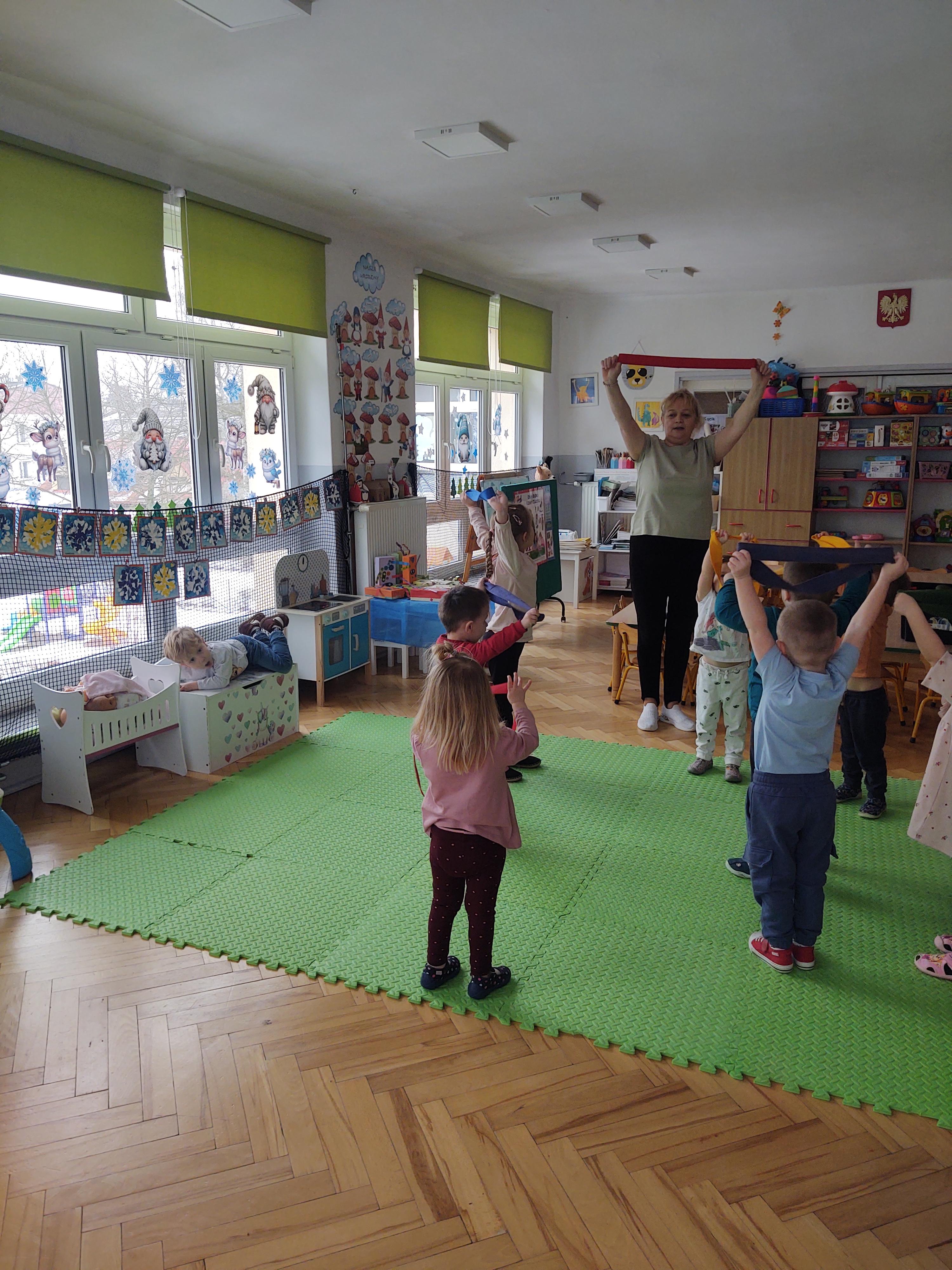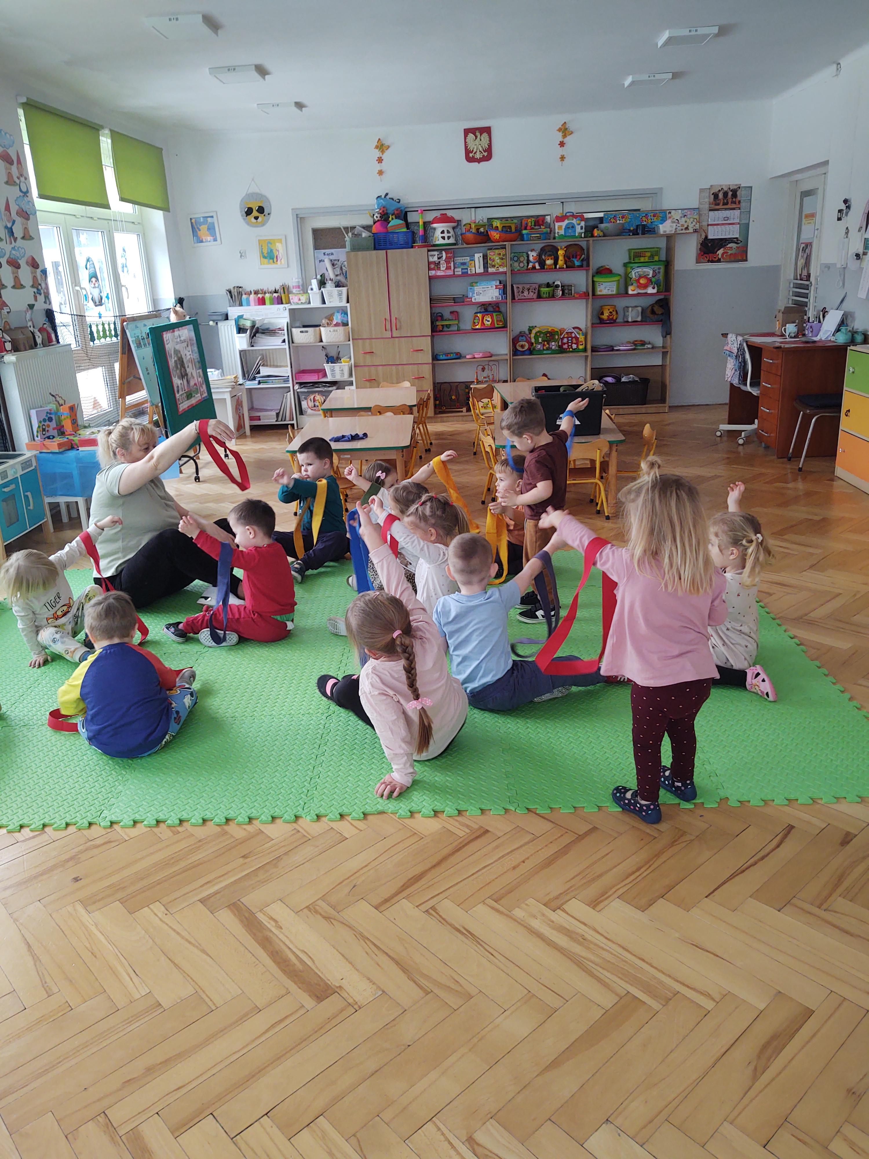 W ramach programu edukacyjnego „W zdrowym ciele zdrowy duch…” zrealizowaliśmy kolejne zajęcia ruchowe z wykorzystaniem szarf gimnastycznych.
