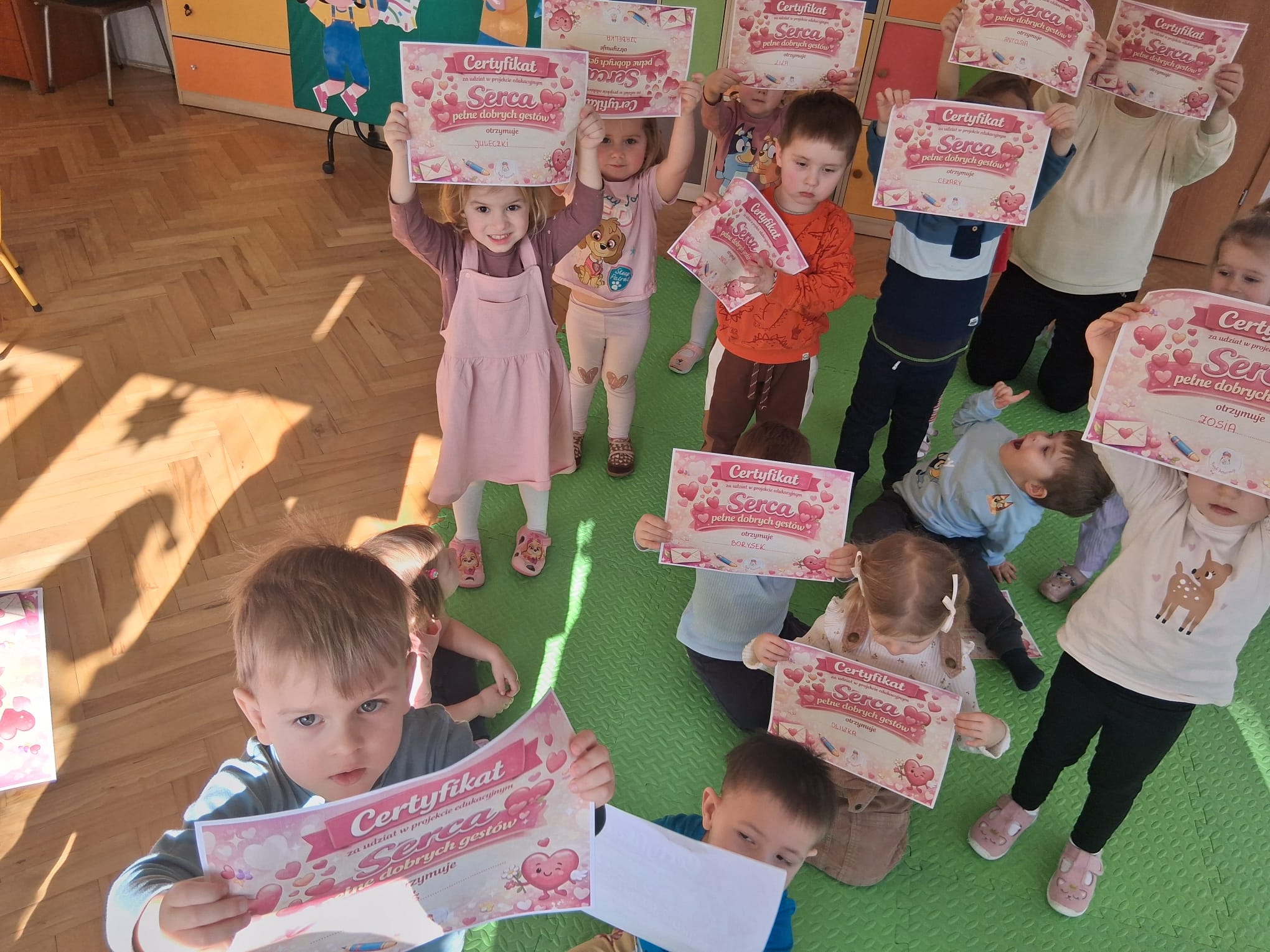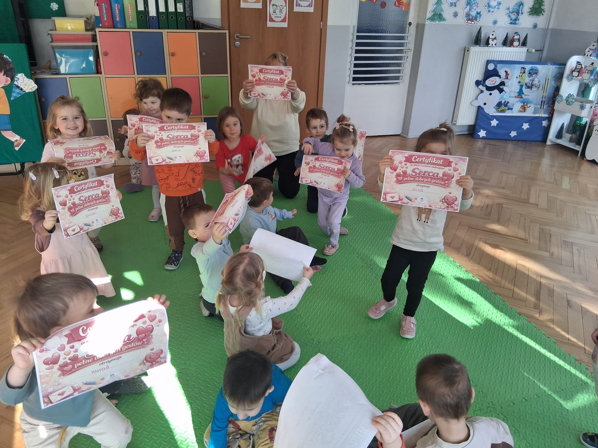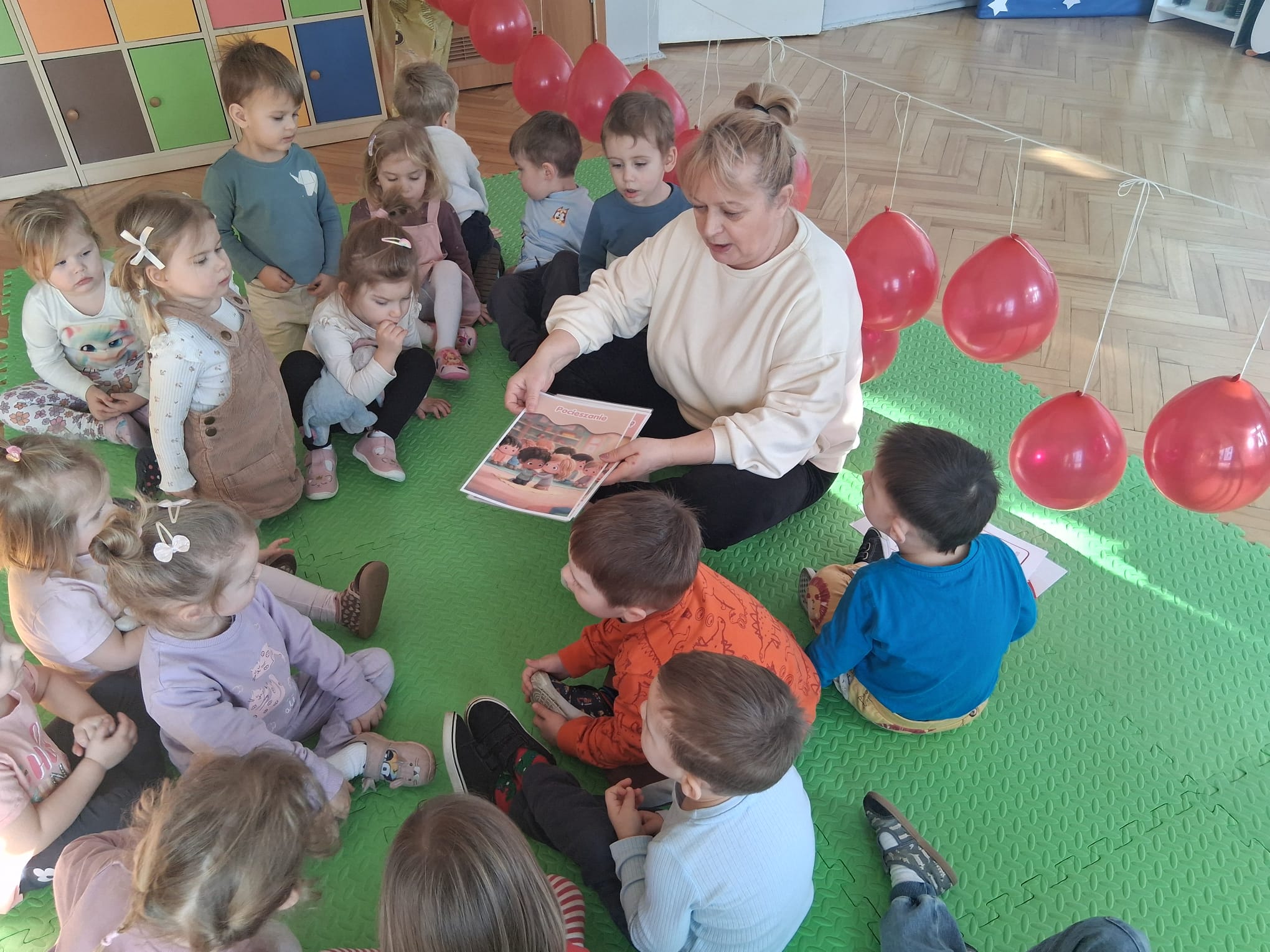 Realizacja programu edukacyjnego „Serca dobrych gestów” w grupie najmłodszych odbyła się w nawiązaniu do święta Walentynki, które stało się okazją do rozmów o przyjaźni, życzliwości i okazywaniu sympatii innym.