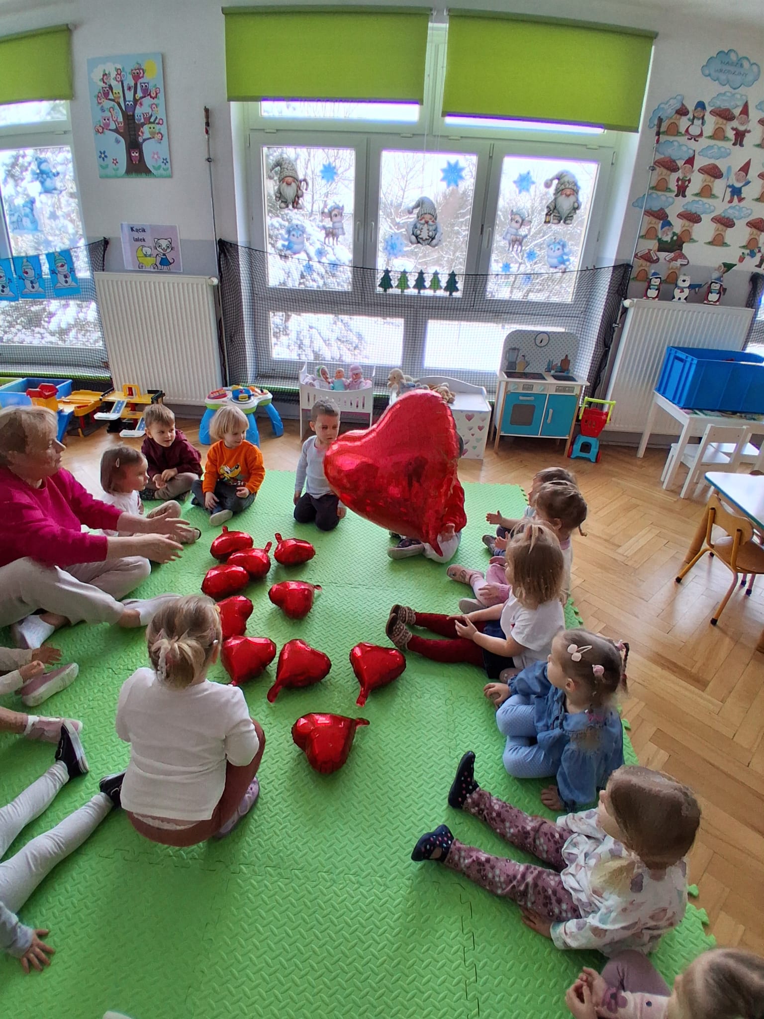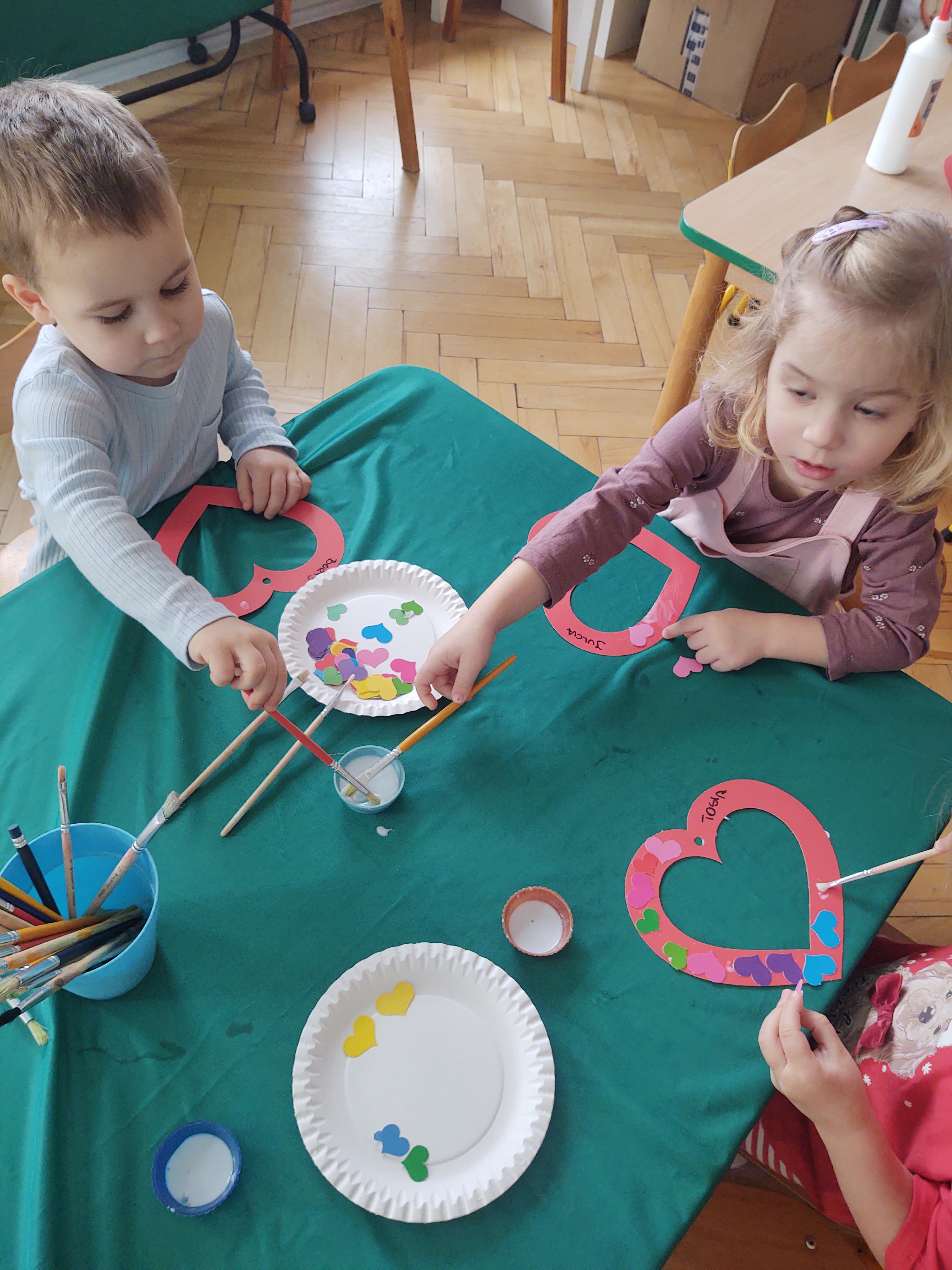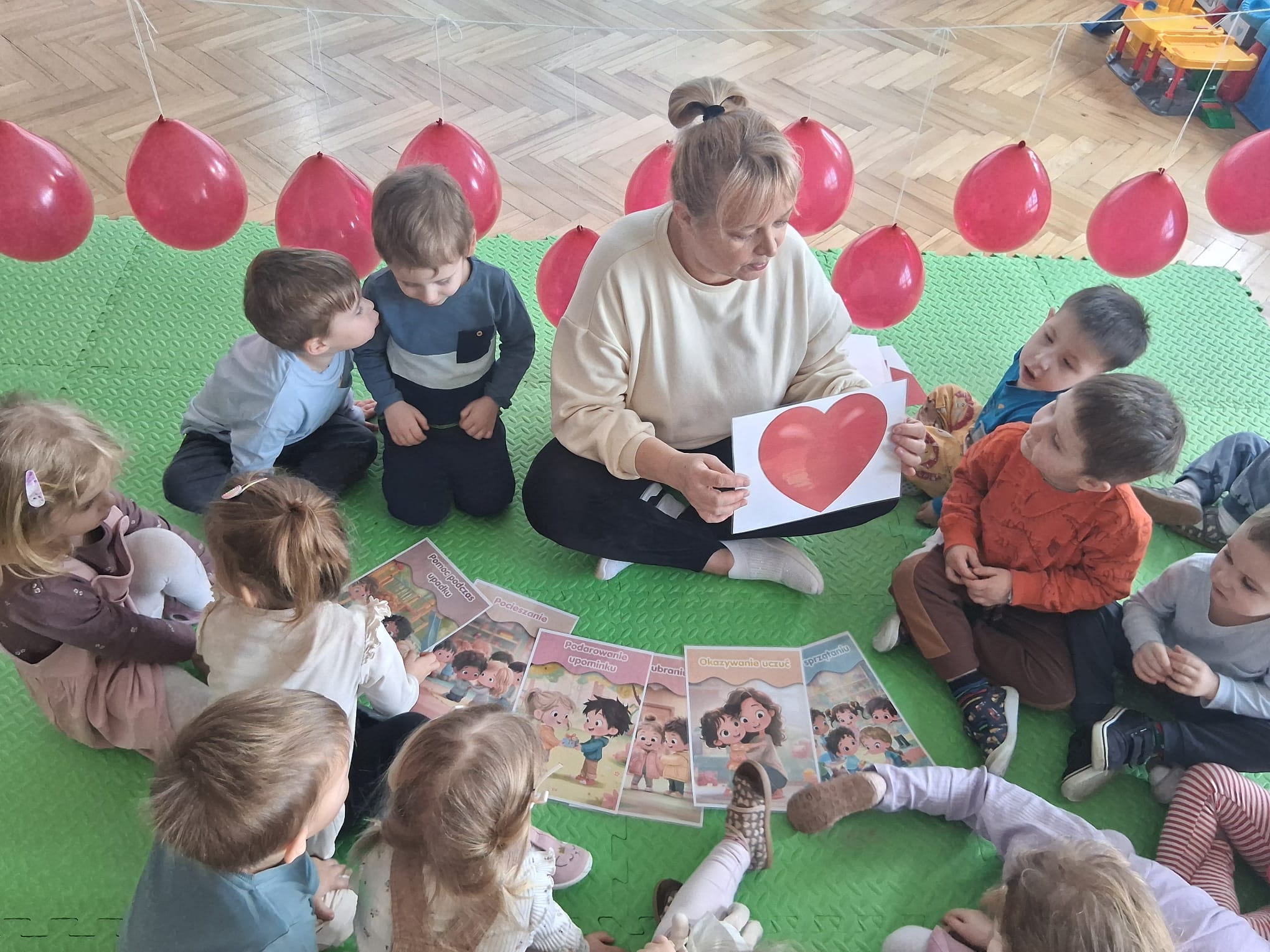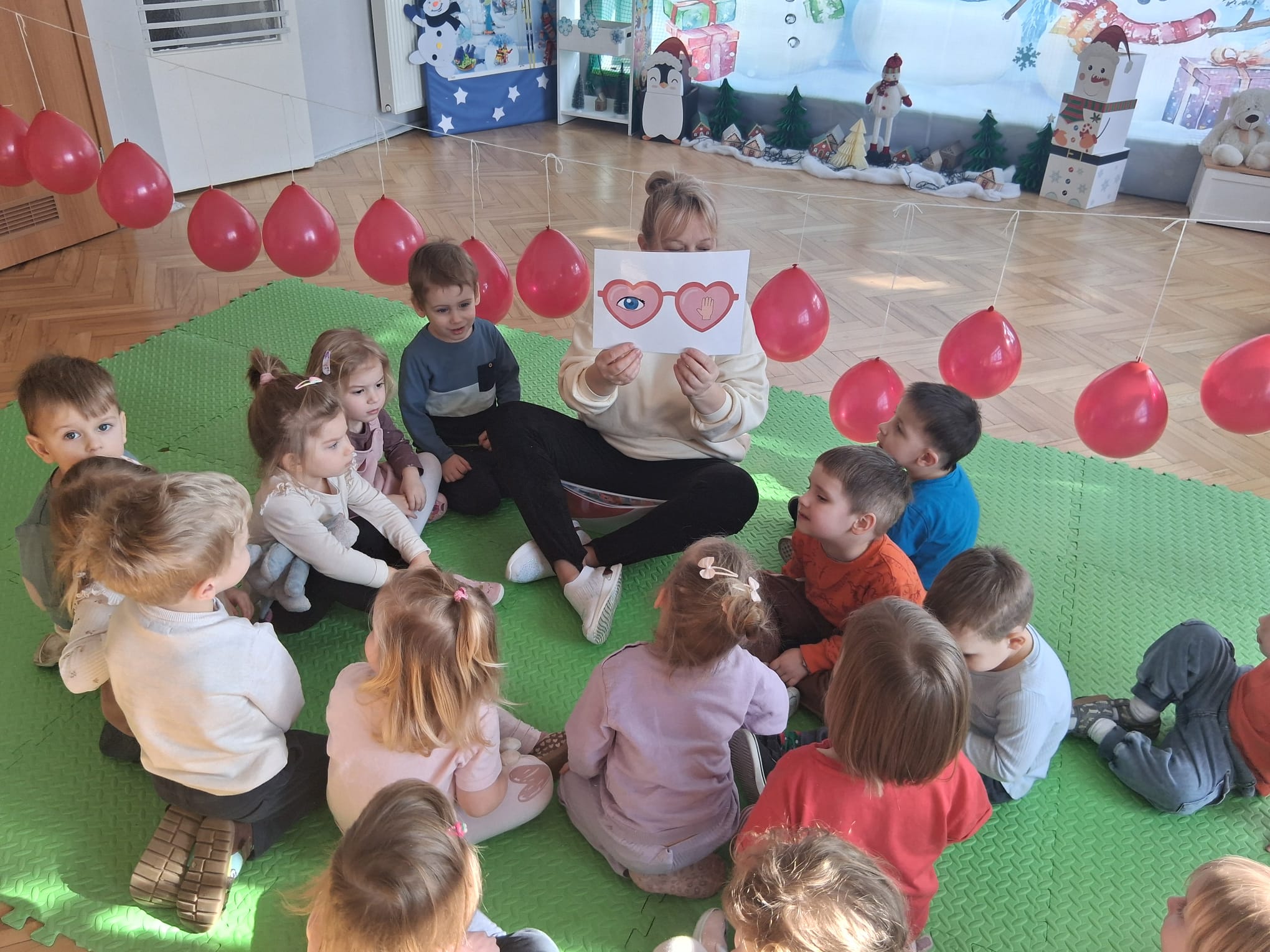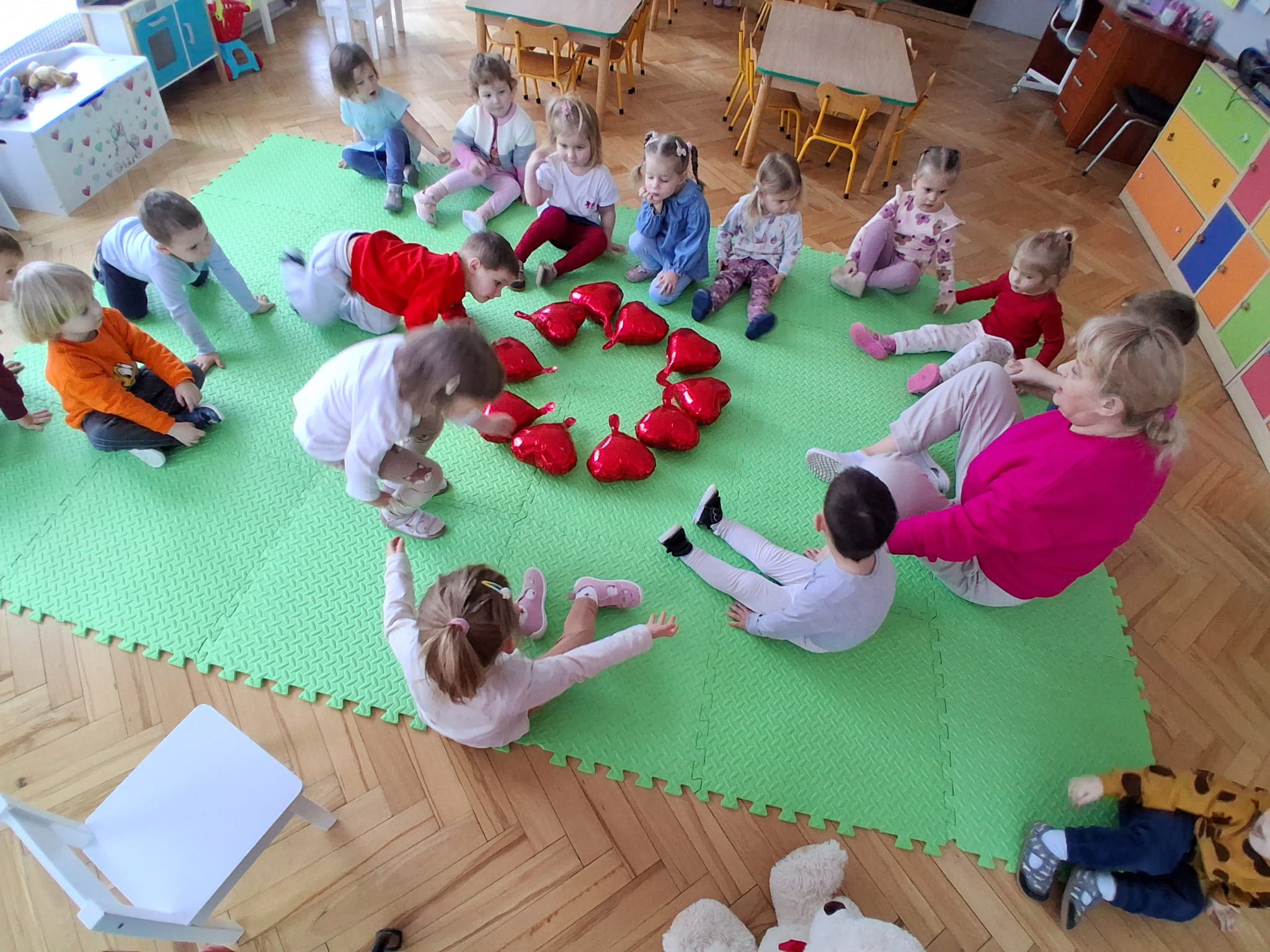 Podczas zajęć dzieci uczestniczyły w zabawach integracyjnych, uczyły się mówić miłe słowa oraz rozpoznawać i nazywać emocje. Wspólnie przygotowały serduszkowe prace plastyczne.