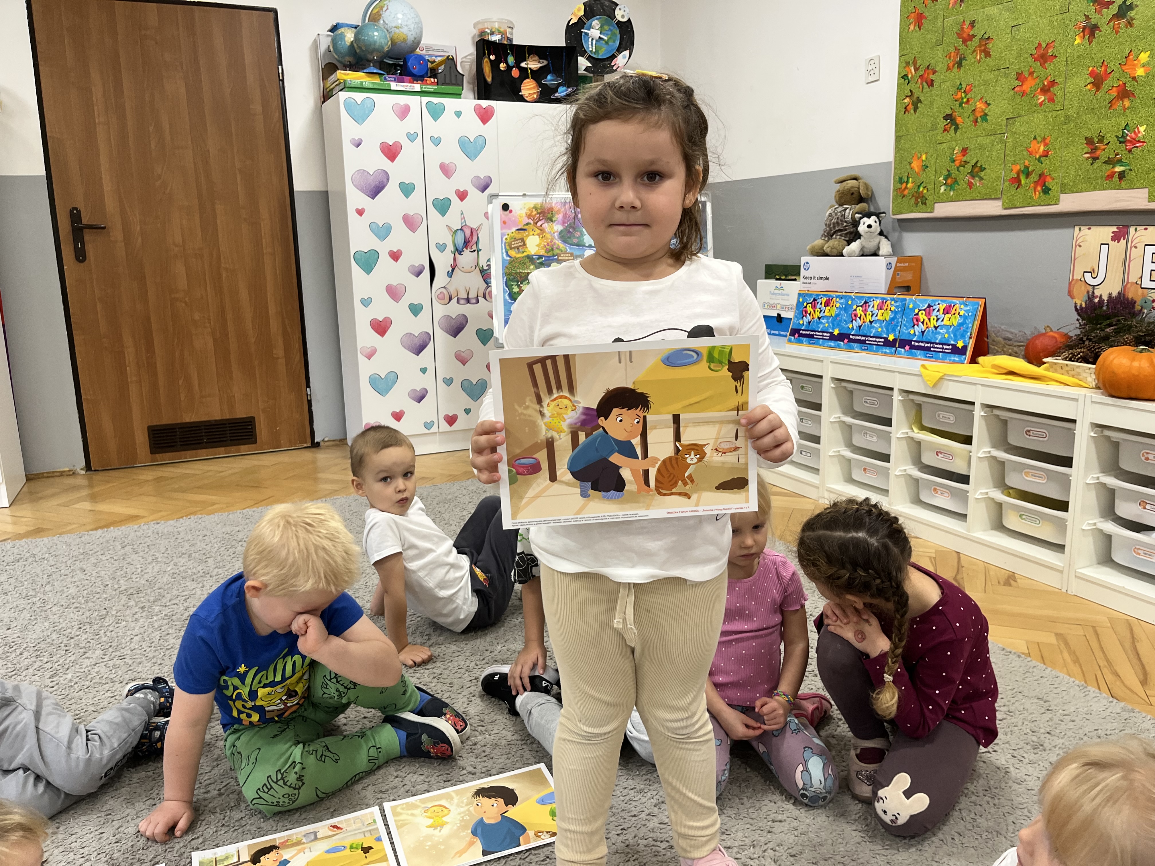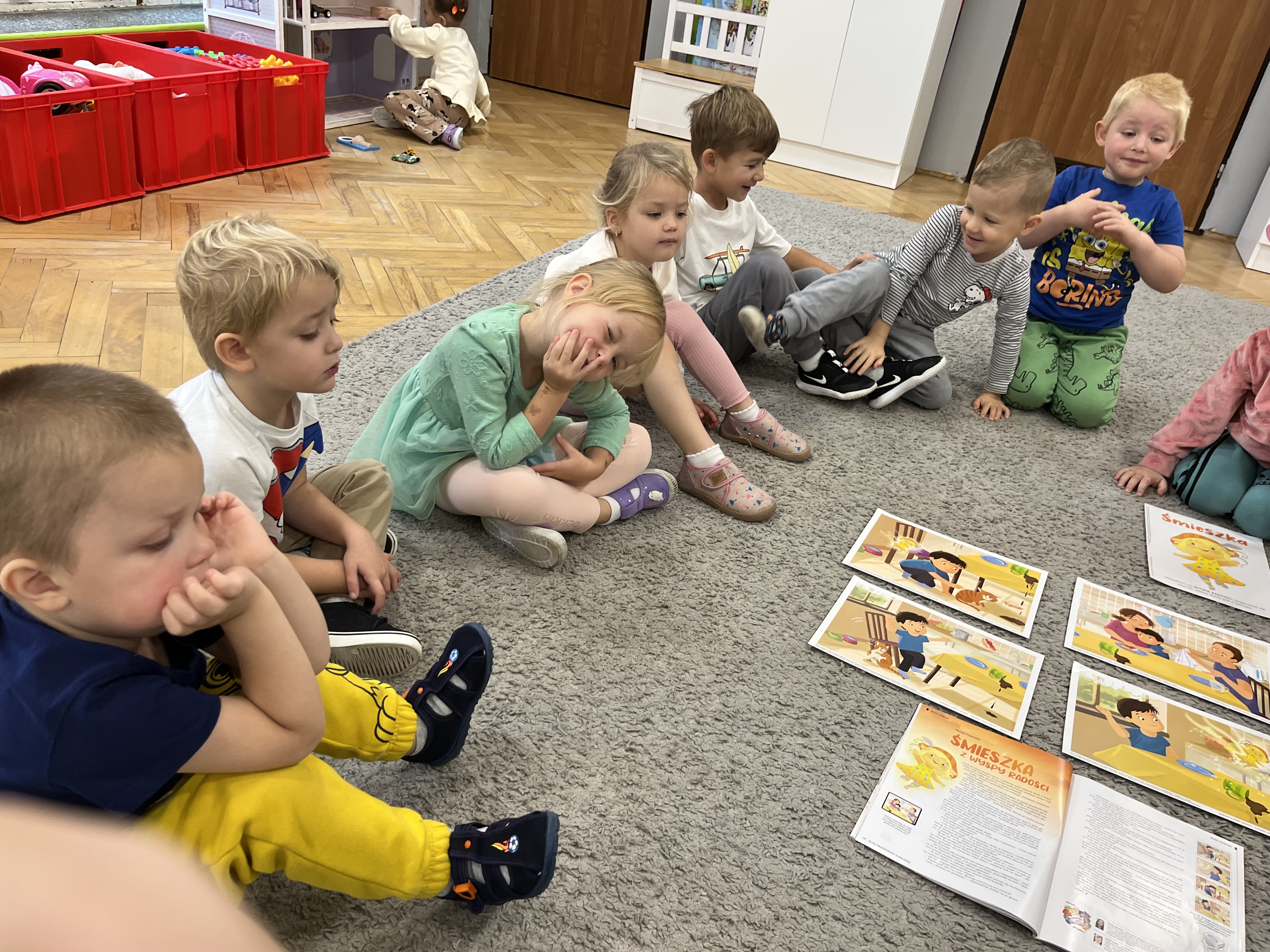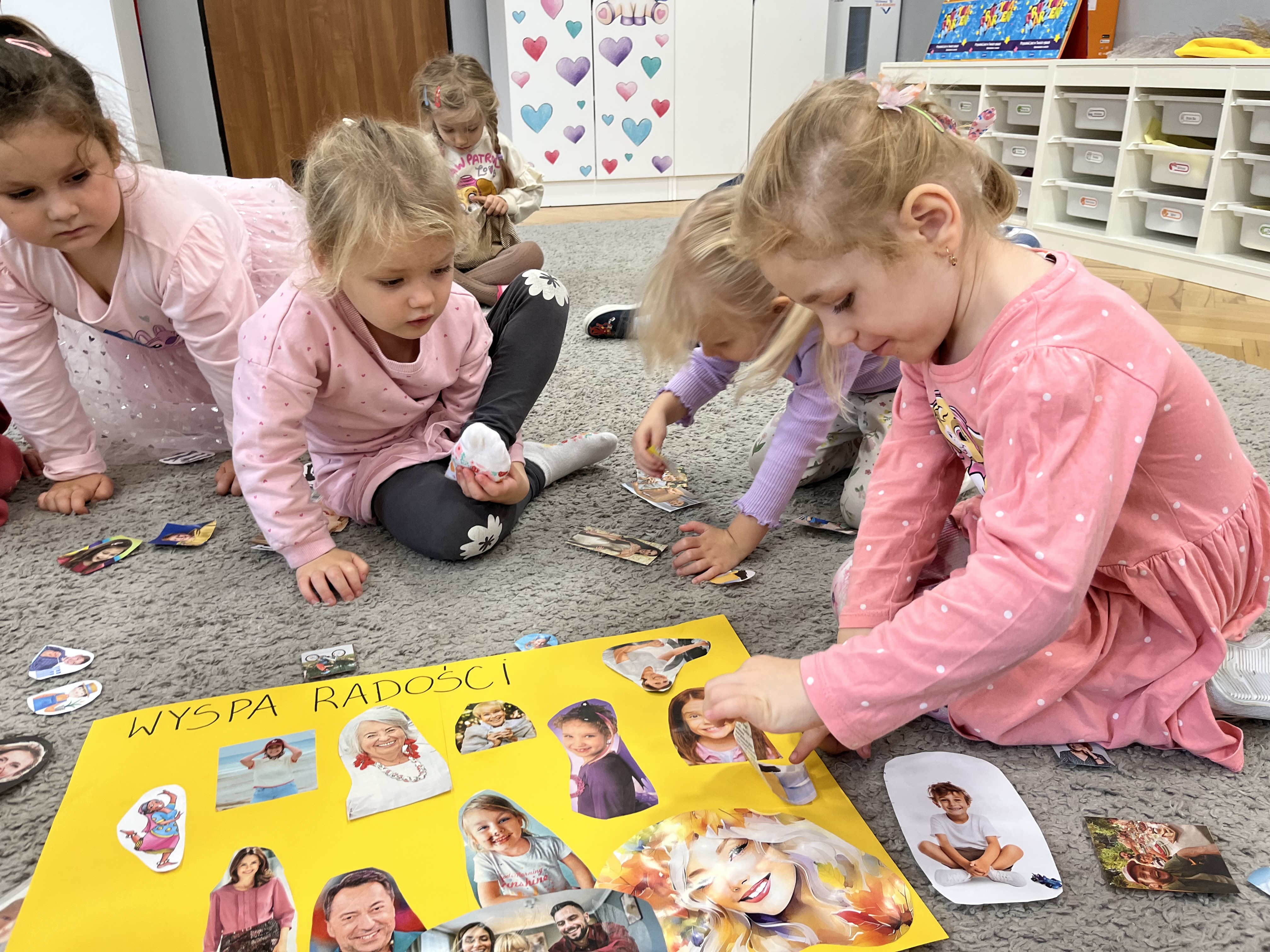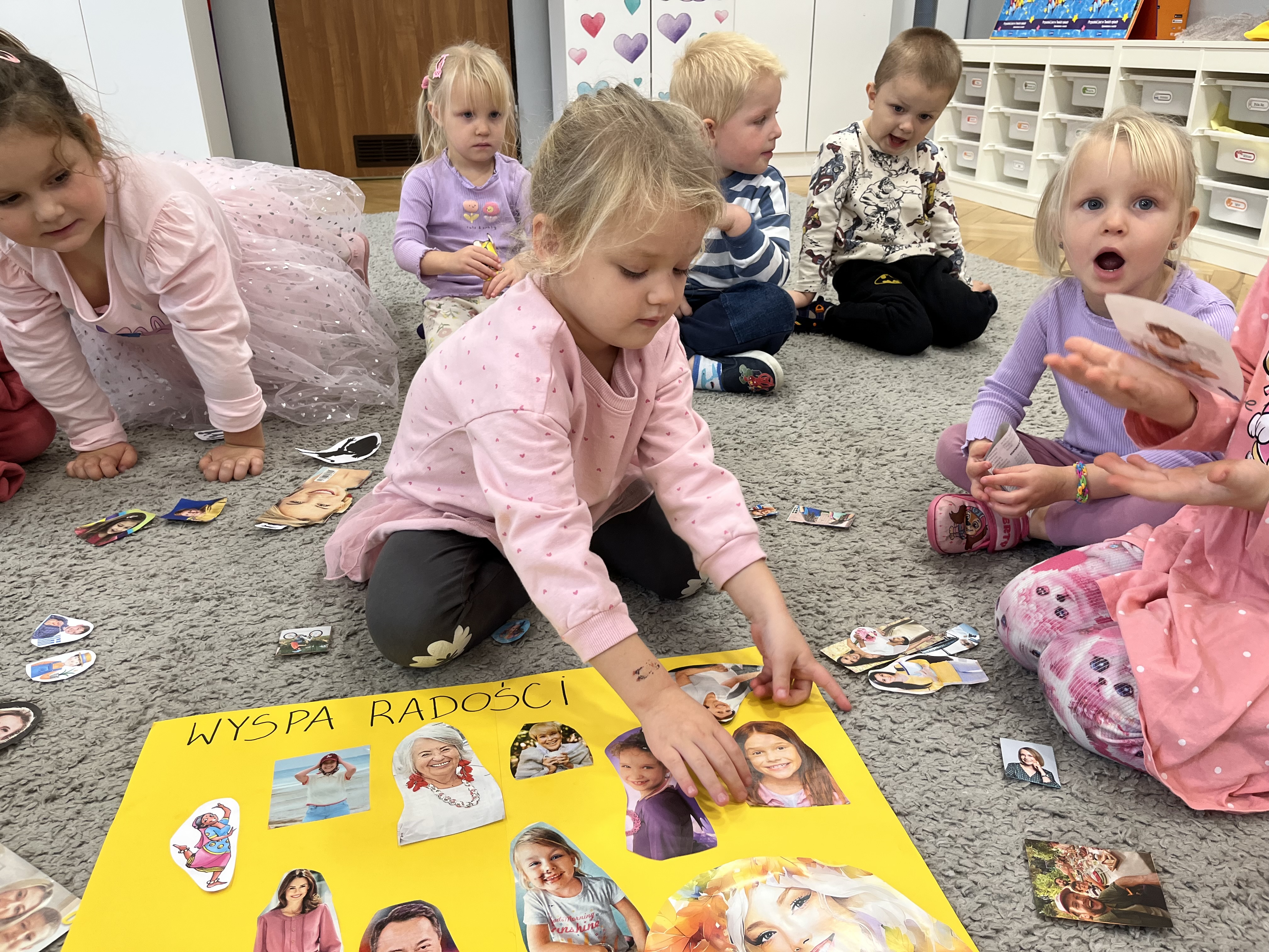 Podczas zajęć dzieci wysłuchały projektowej piosenki „Czuciaki z Krainy Emocji”, a następnie obejrzały bajkę „Śmieszka z Wyspy Radości”. Po wysłuchaniu utworu przedszkolaki z zaangażowaniem układały obrazki do historyjki, odtwarzając jej przebieg zgodnie z kolejnością wydarzeń.