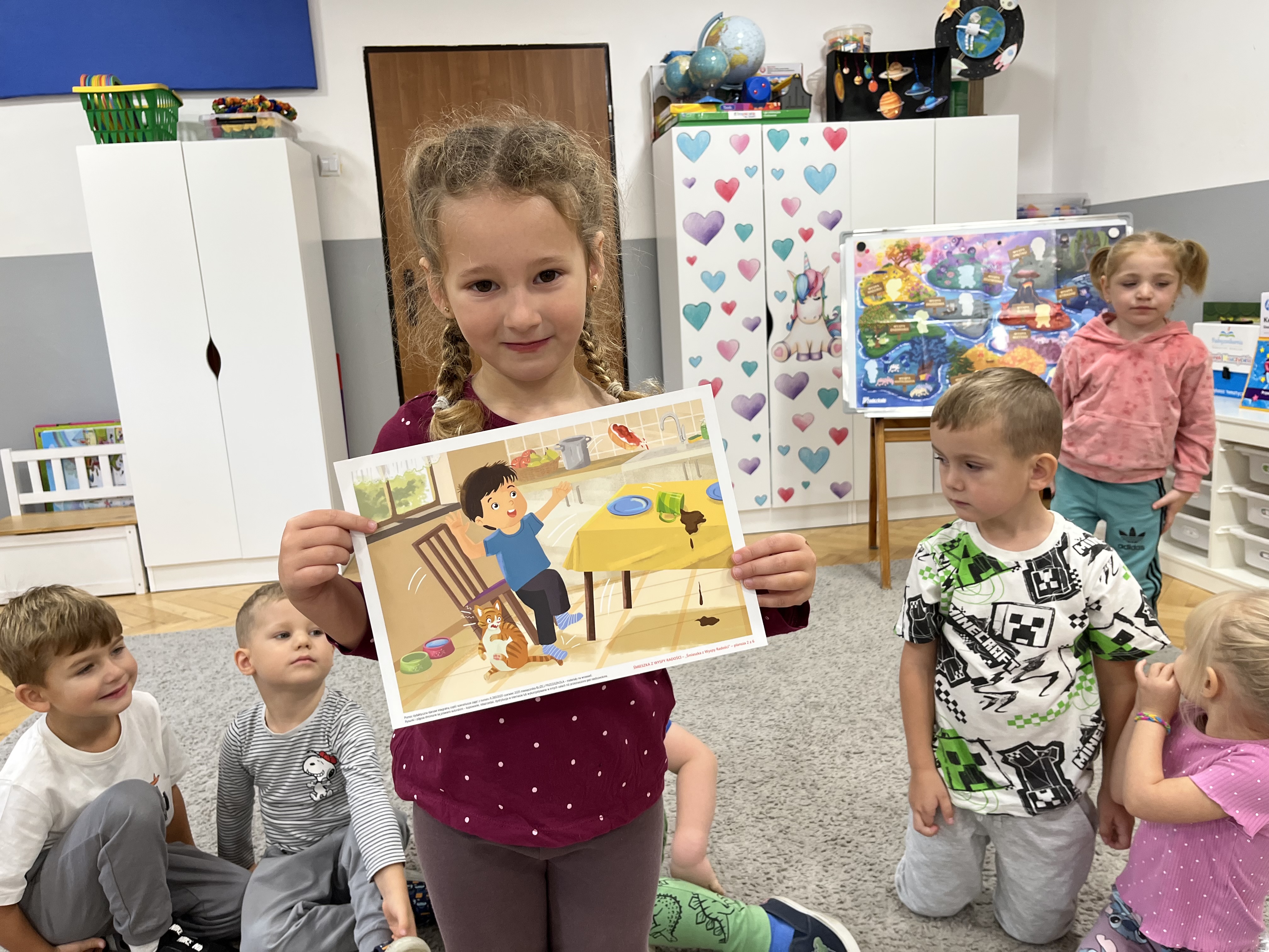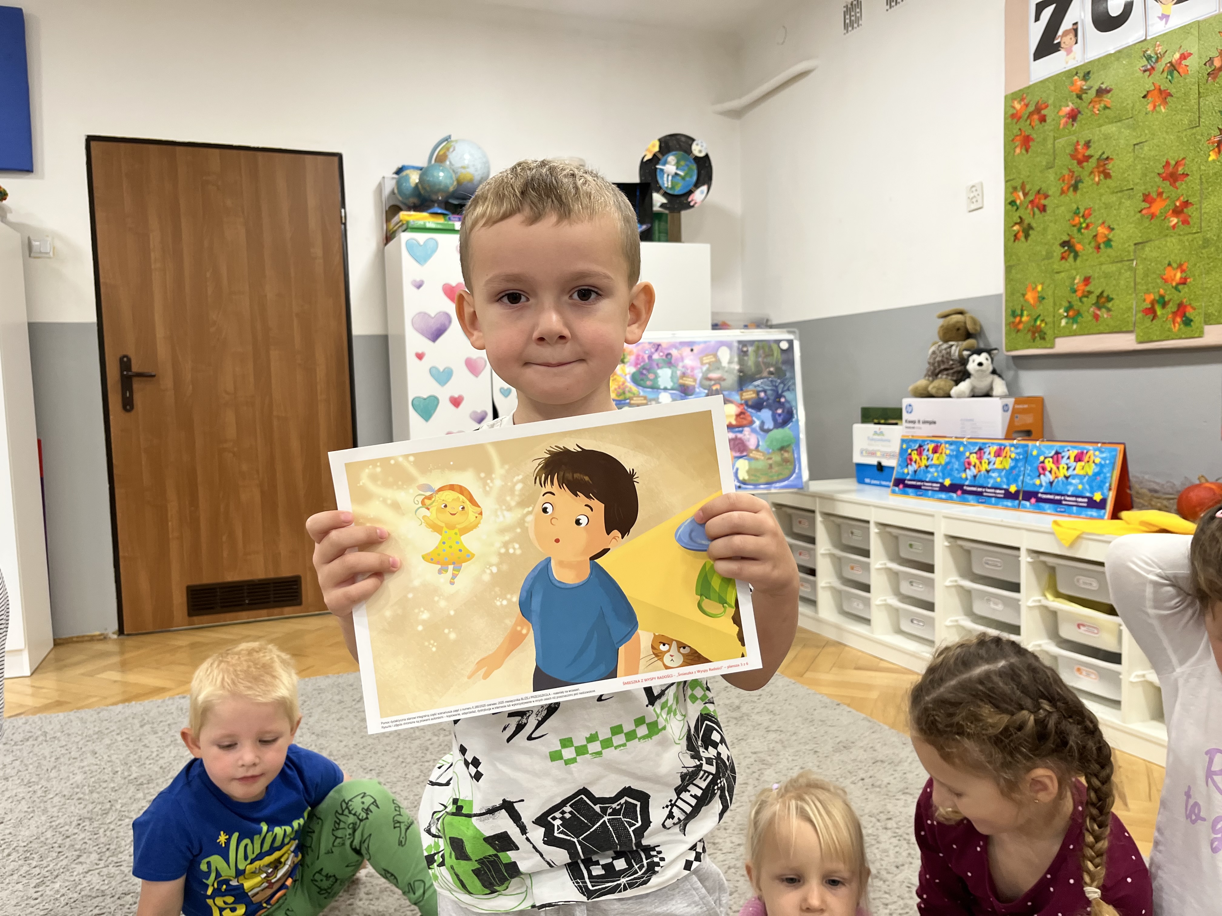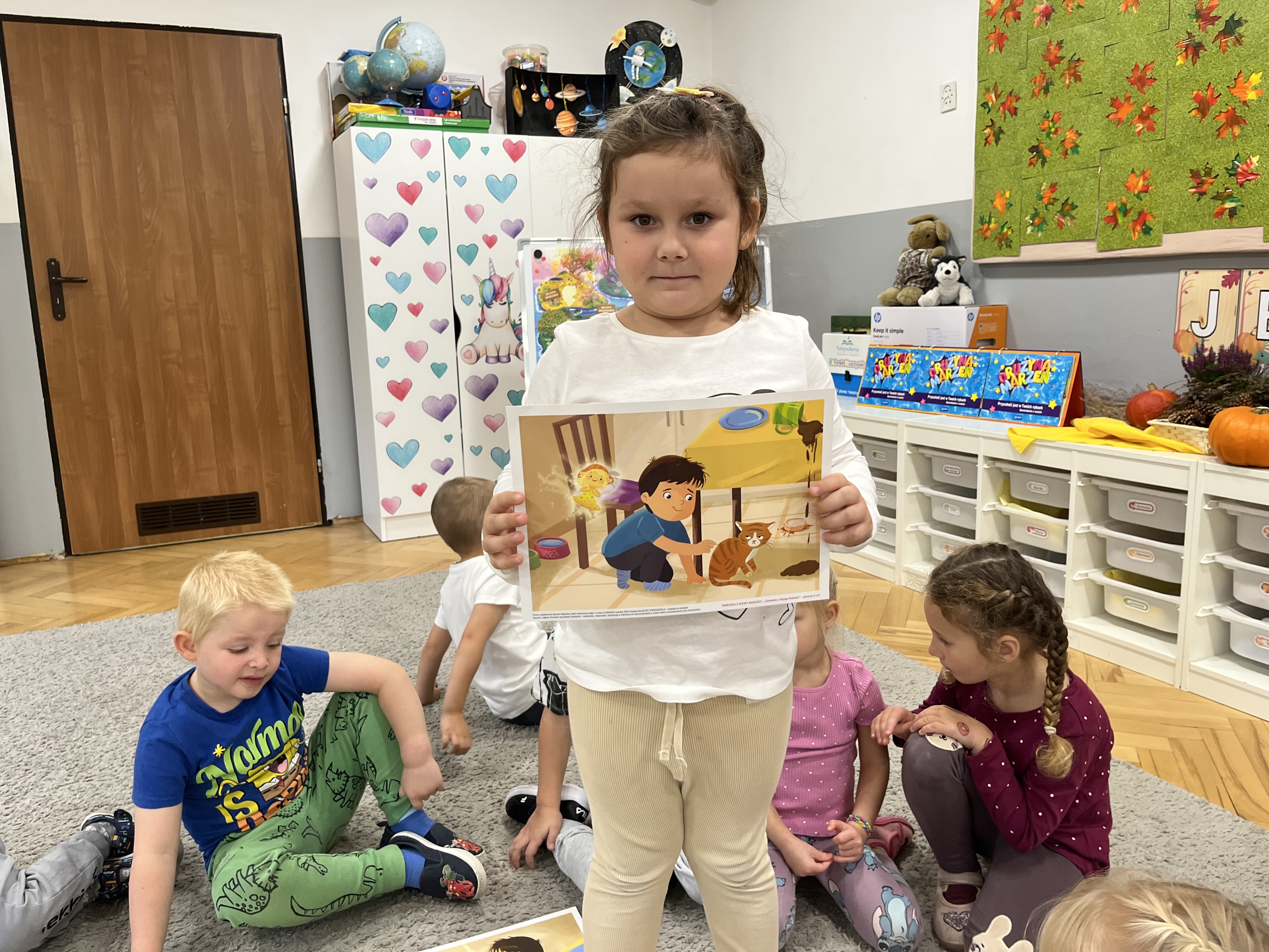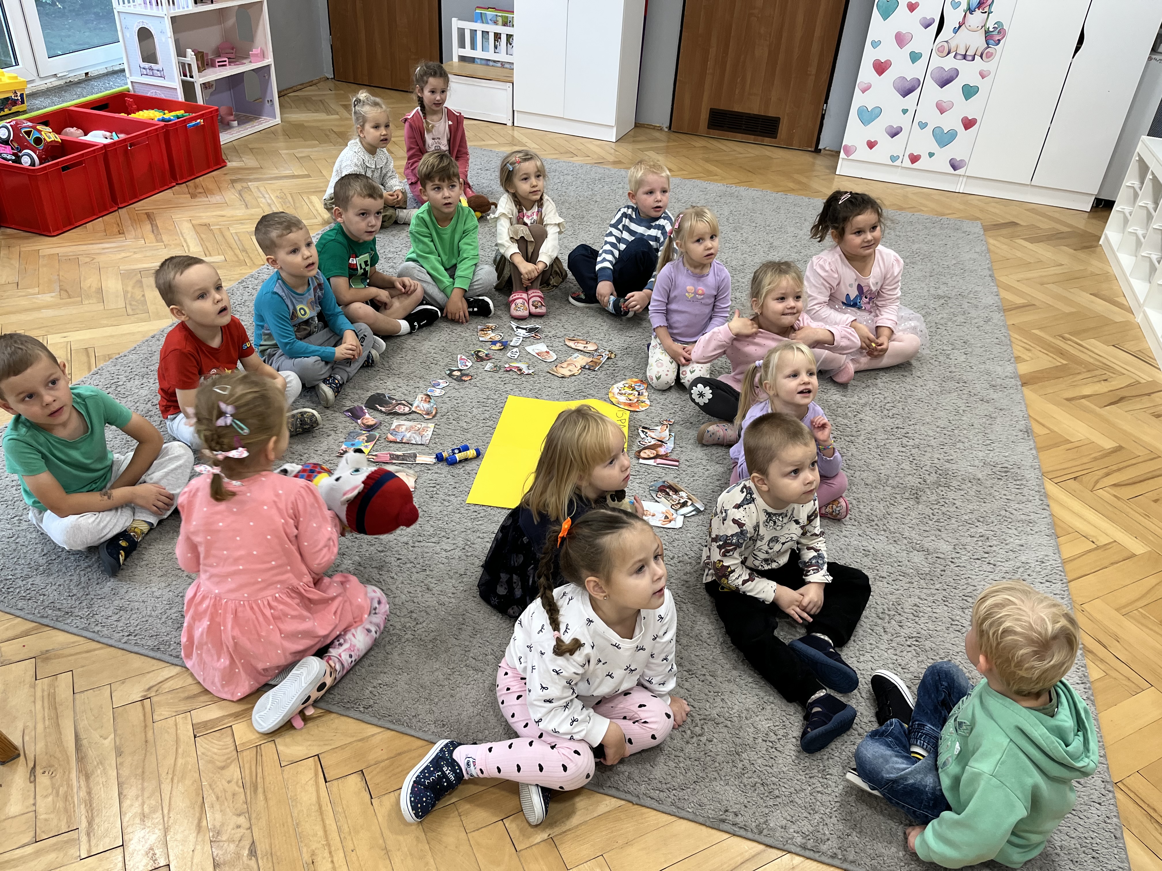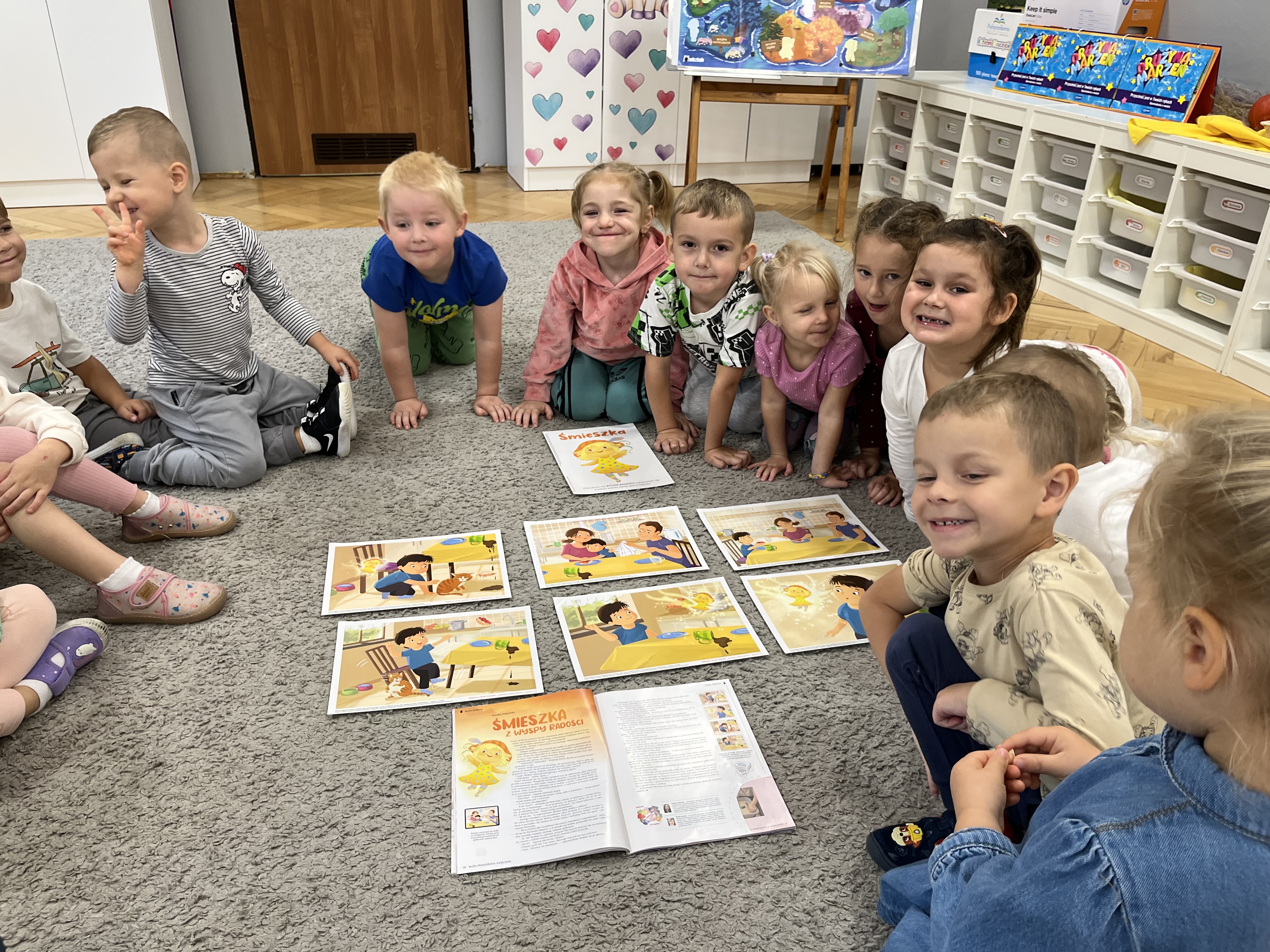 Podczas zajęć dzieci wysłuchały projektowej piosenki „Czuciaki z Krainy Emocji”, a następnie obejrzały bajkę „Śmieszka z Wyspy Radości”. Po wysłuchaniu utworu przedszkolaki z zaangażowaniem układały obrazki do historyjki, odtwarzając jej przebieg zgodnie z kolejnością wydarzeń.