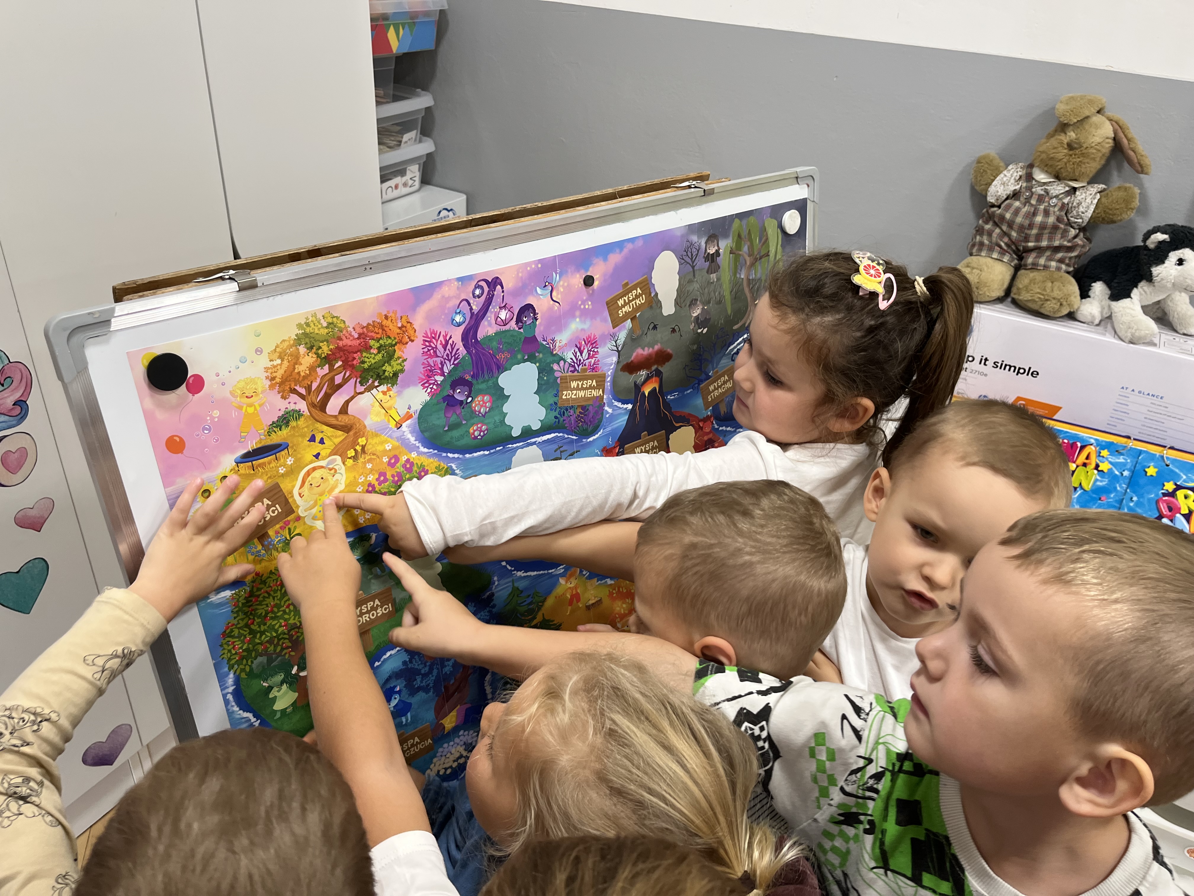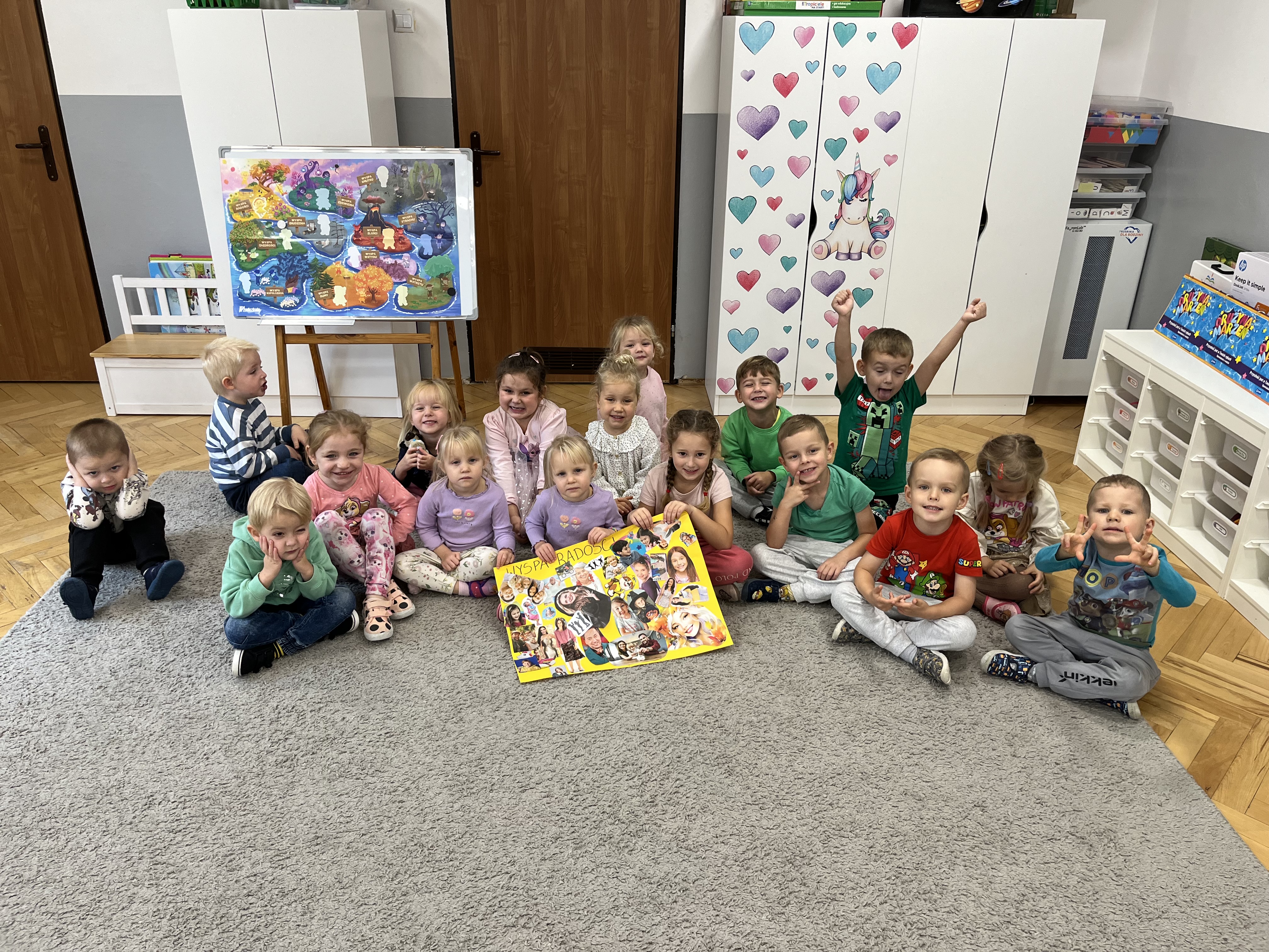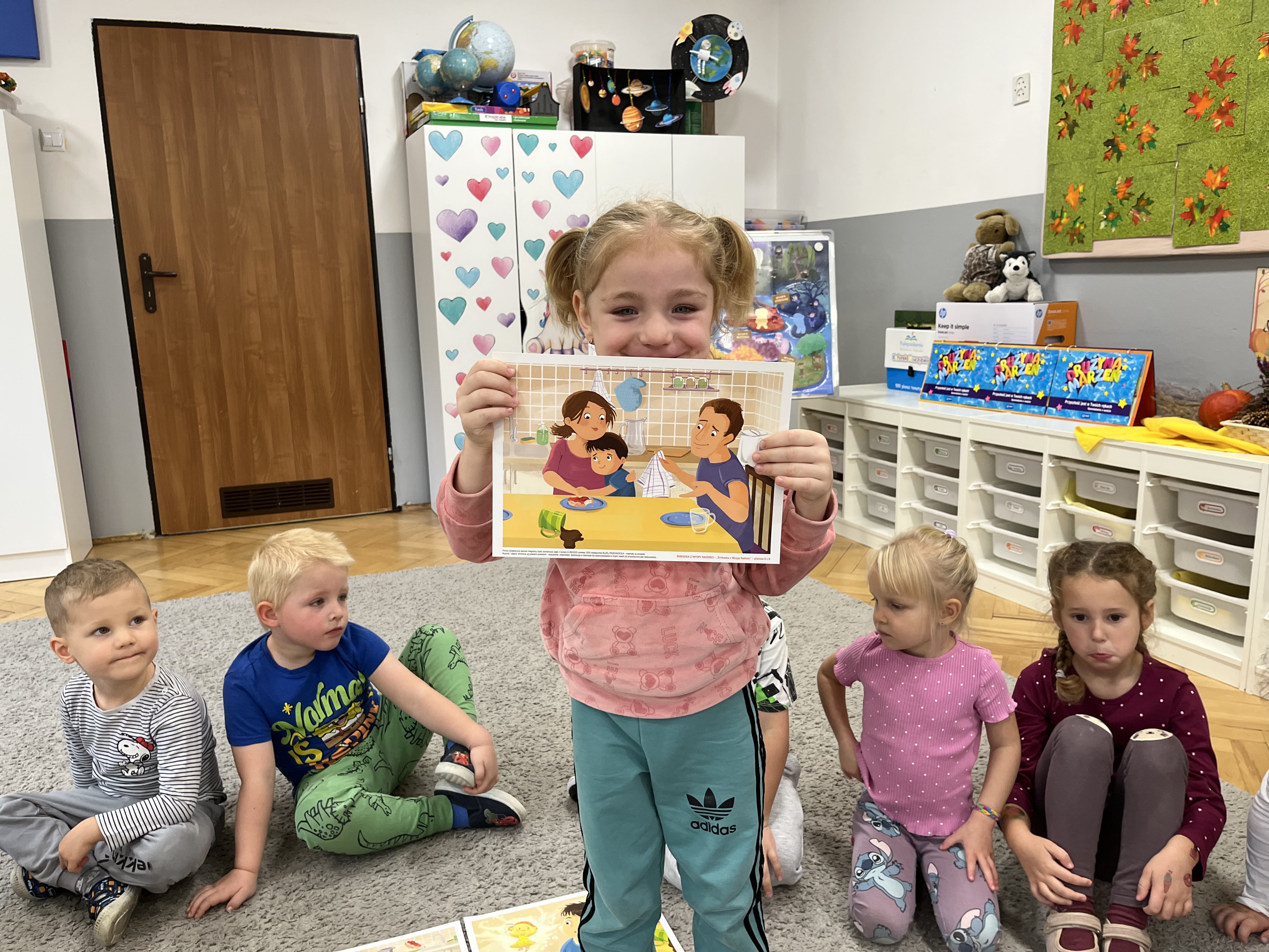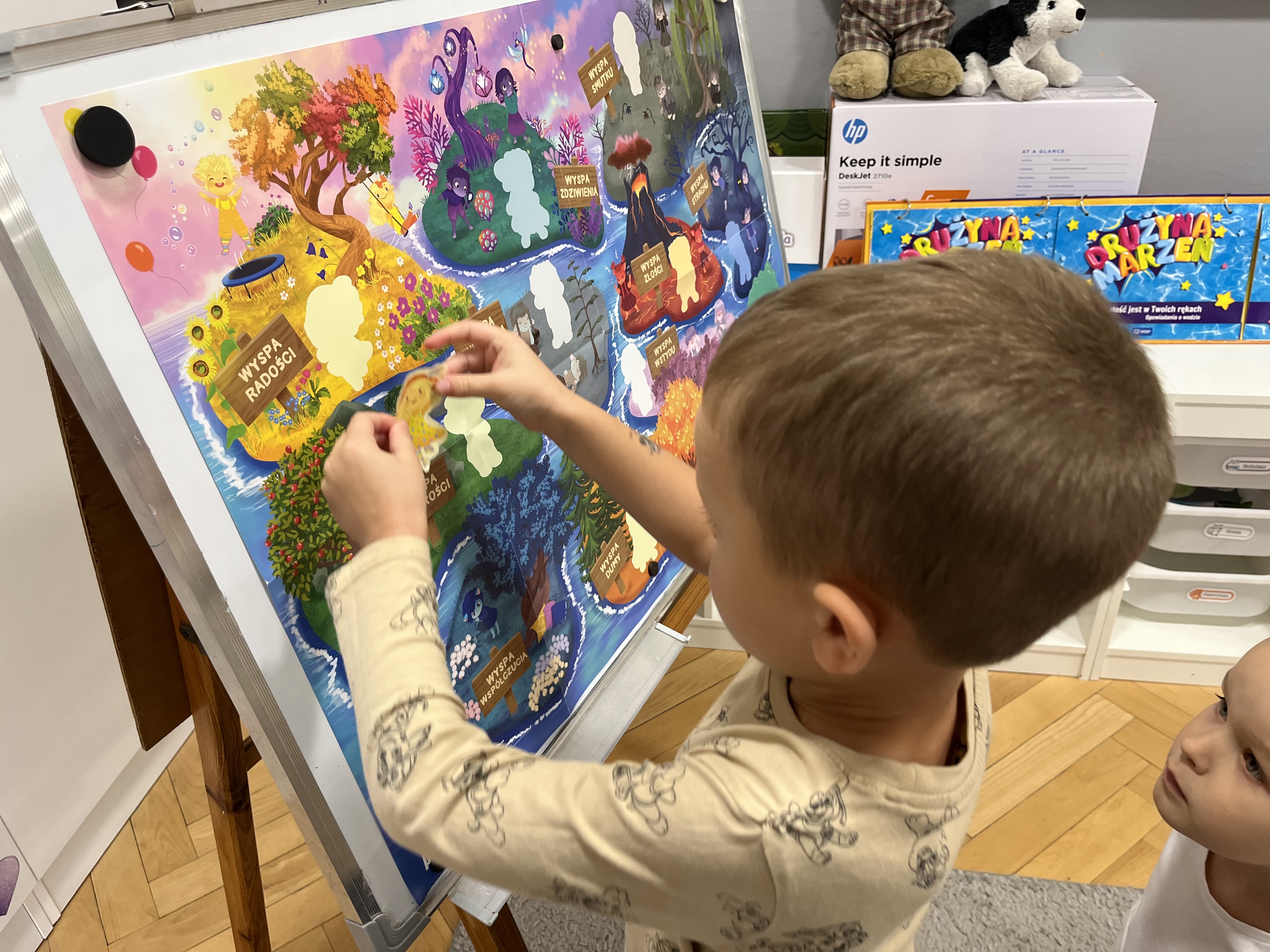 Podczas zajęć dzieci wysłuchały projektowej piosenki „Czuciaki z Krainy Emocji”, a następnie obejrzały bajkę „Śmieszka z Wyspy Radości”. Po wysłuchaniu utworu przedszkolaki z zaangażowaniem układały obrazki do historyjki, odtwarzając jej przebieg zgodnie z kolejnością wydarzeń.