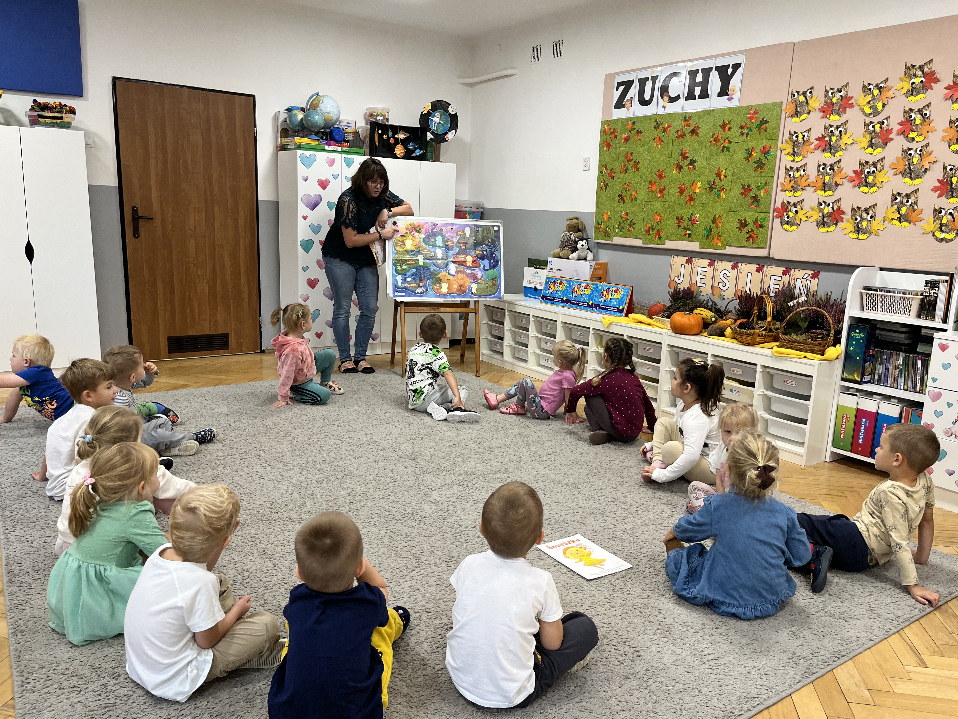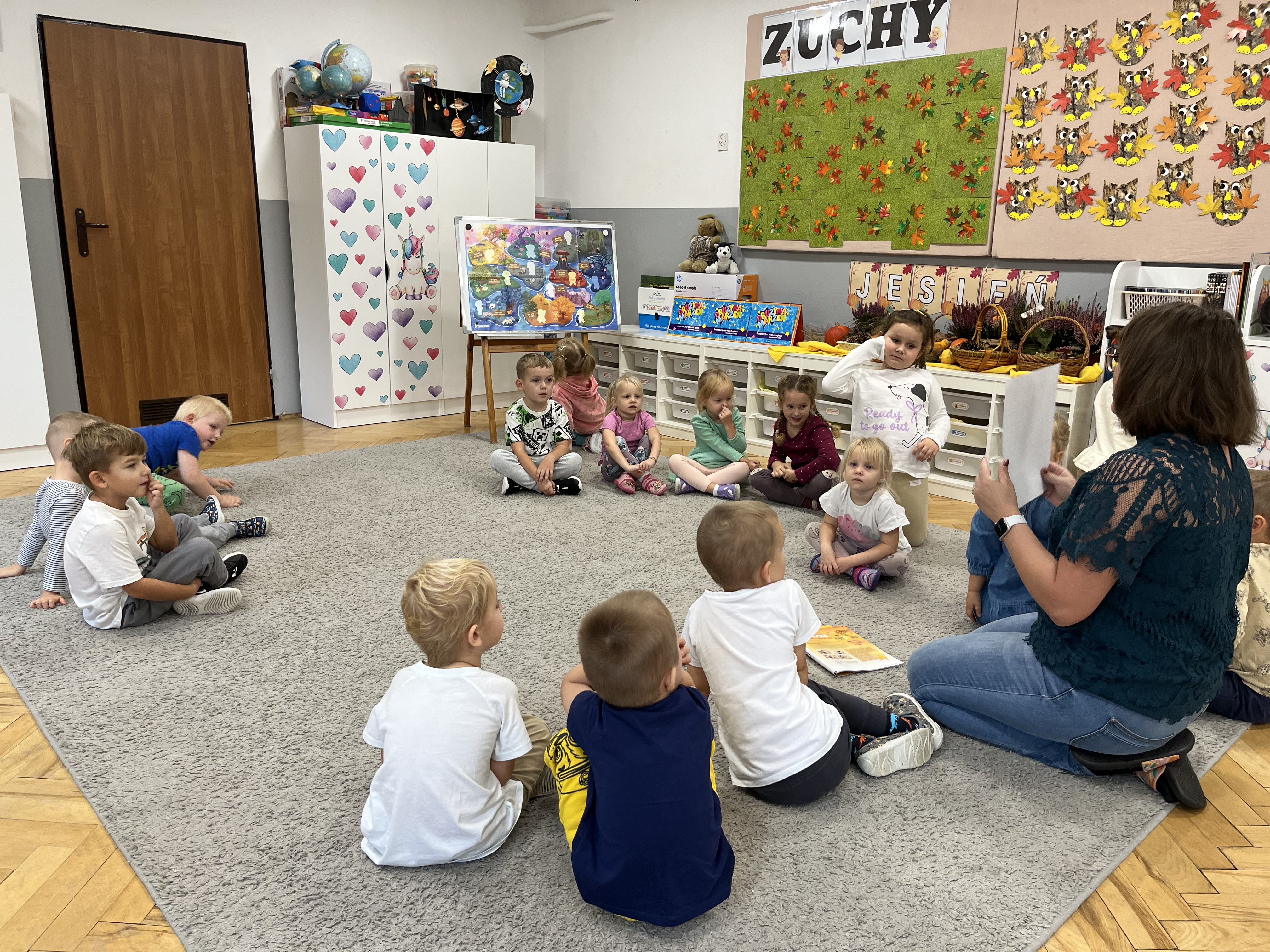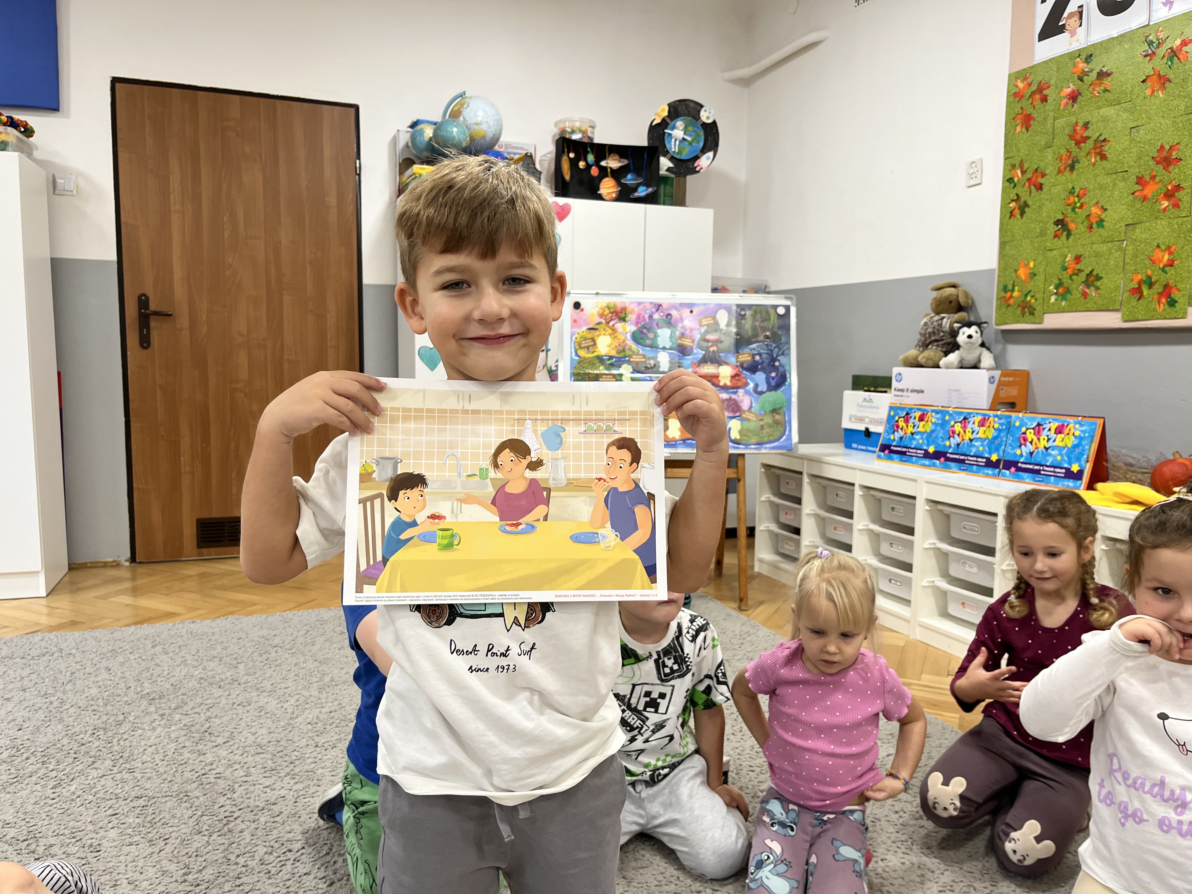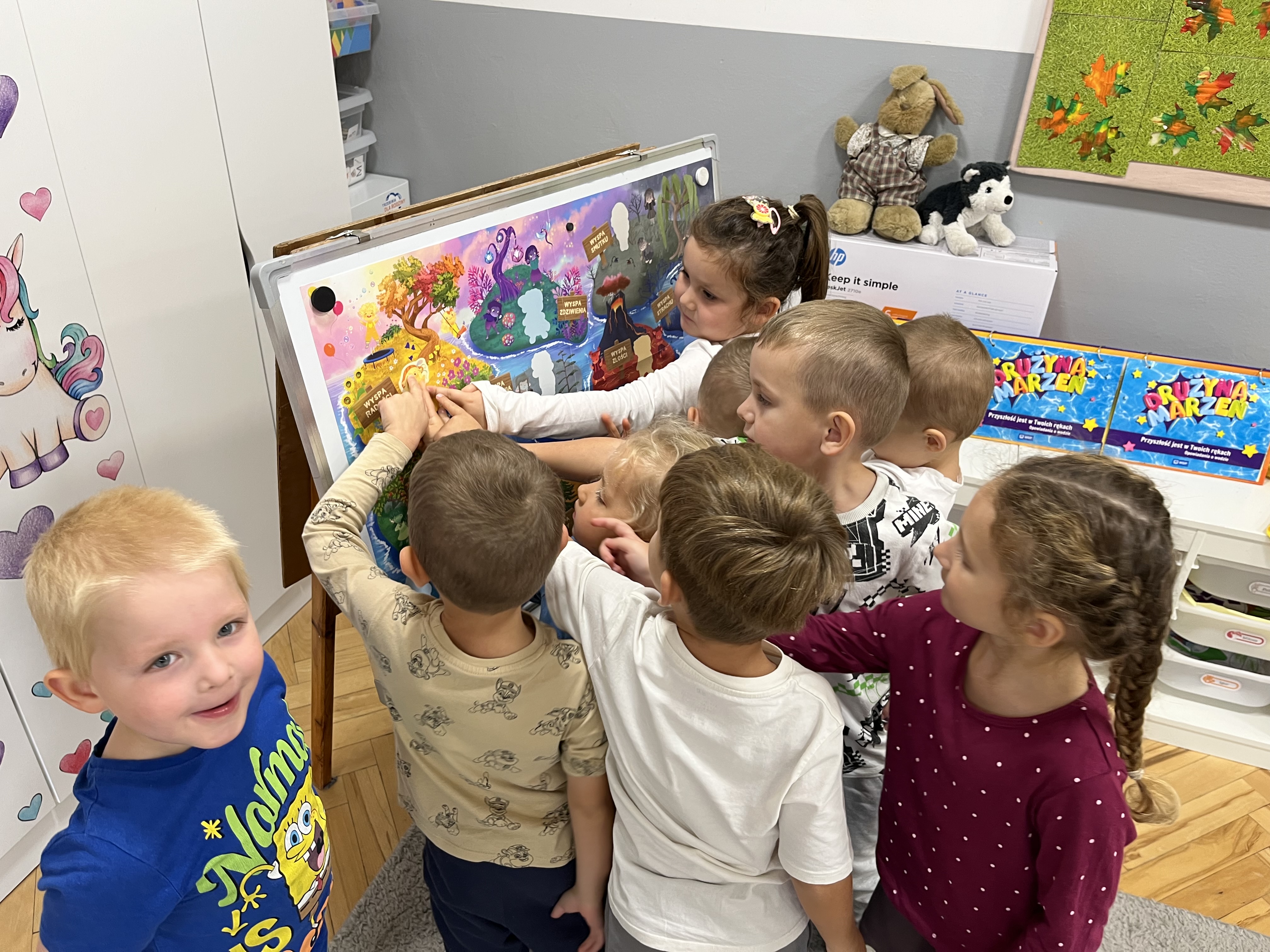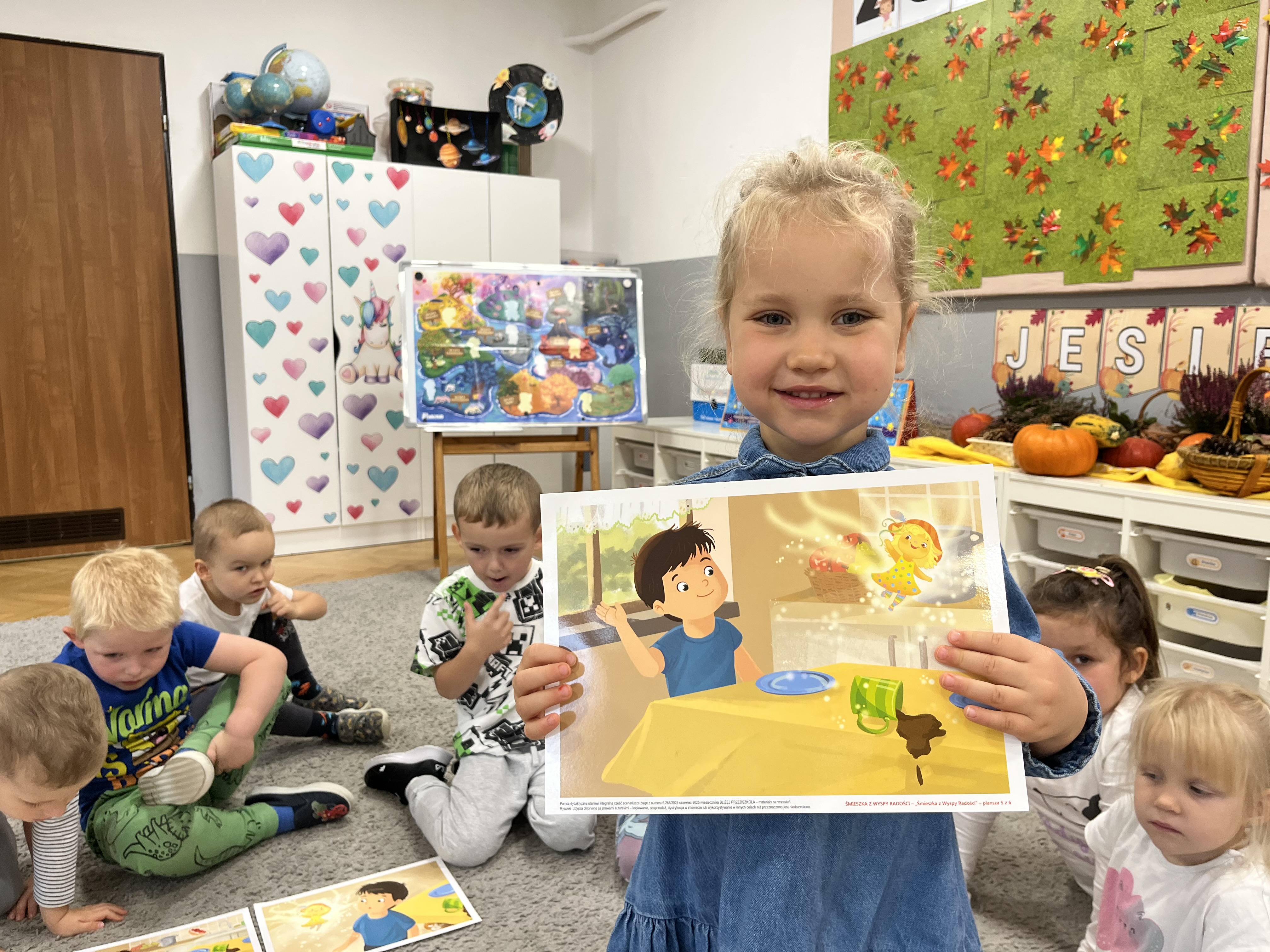 Podczas zajęć dzieci wysłuchały projektowej piosenki „Czuciaki z Krainy Emocji”, a następnie obejrzały bajkę „Śmieszka z Wyspy Radości”. Po wysłuchaniu utworu przedszkolaki z zaangażowaniem układały obrazki do historyjki, odtwarzając jej przebieg zgodnie z kolejnością wydarzeń.