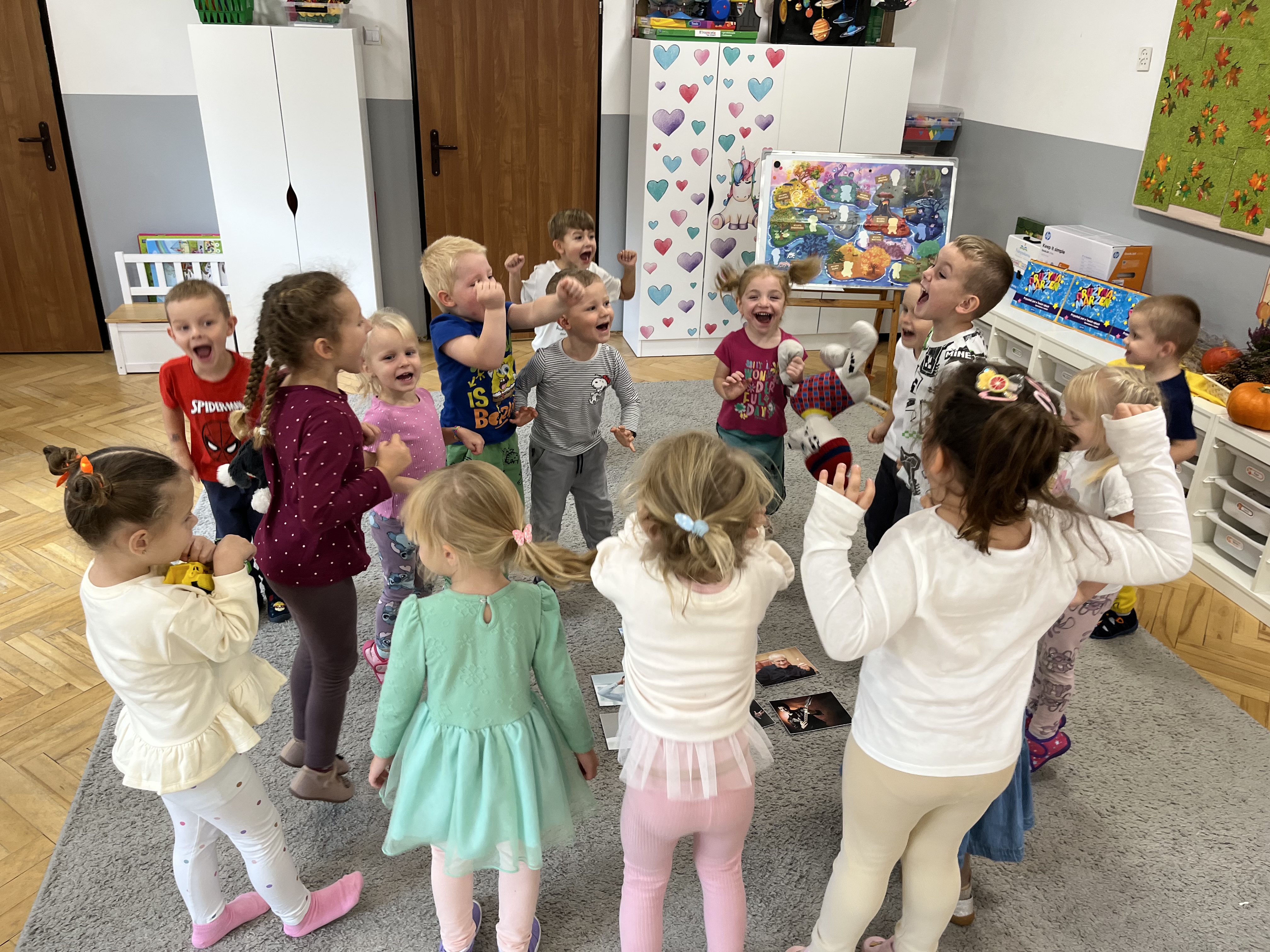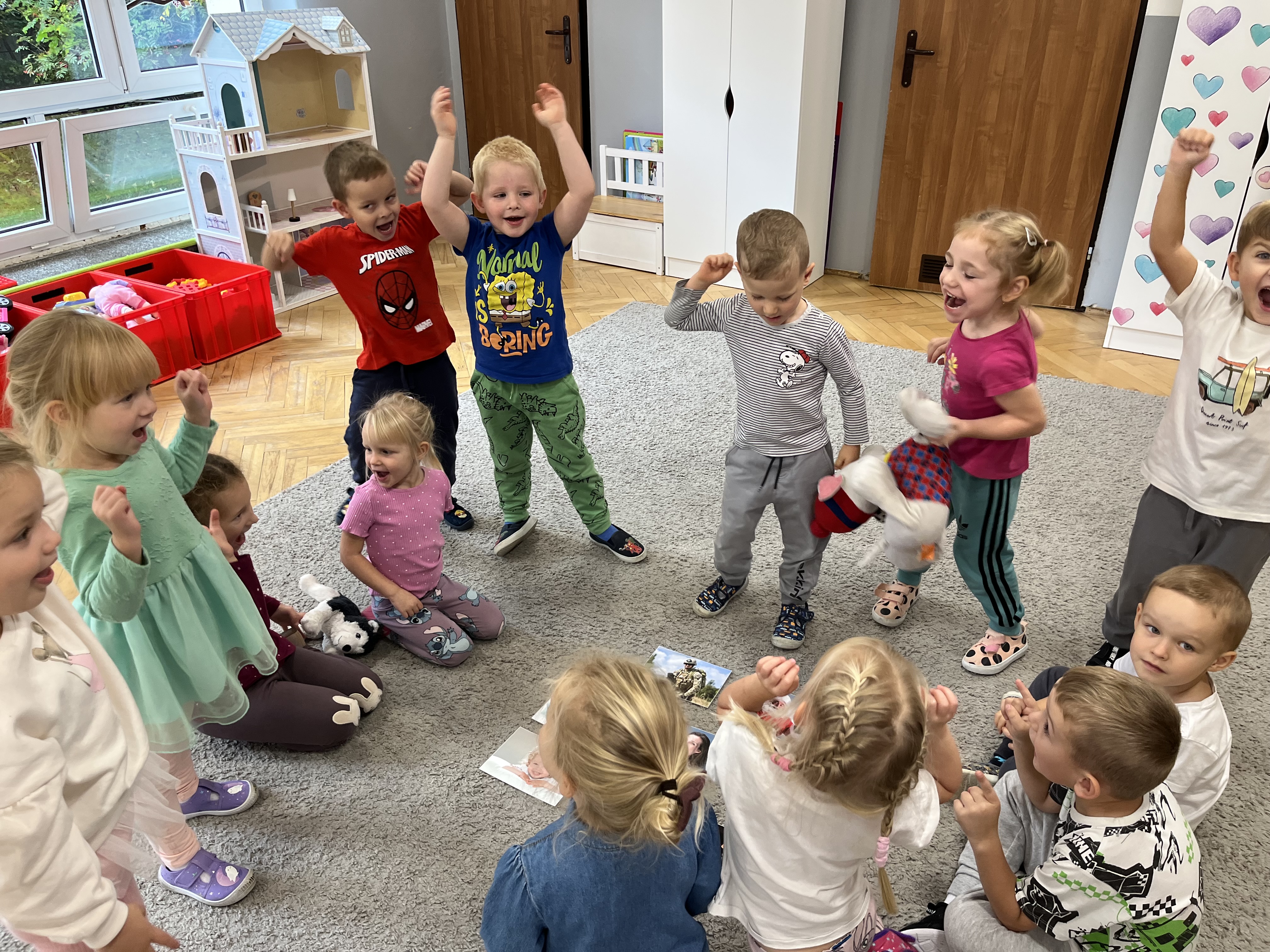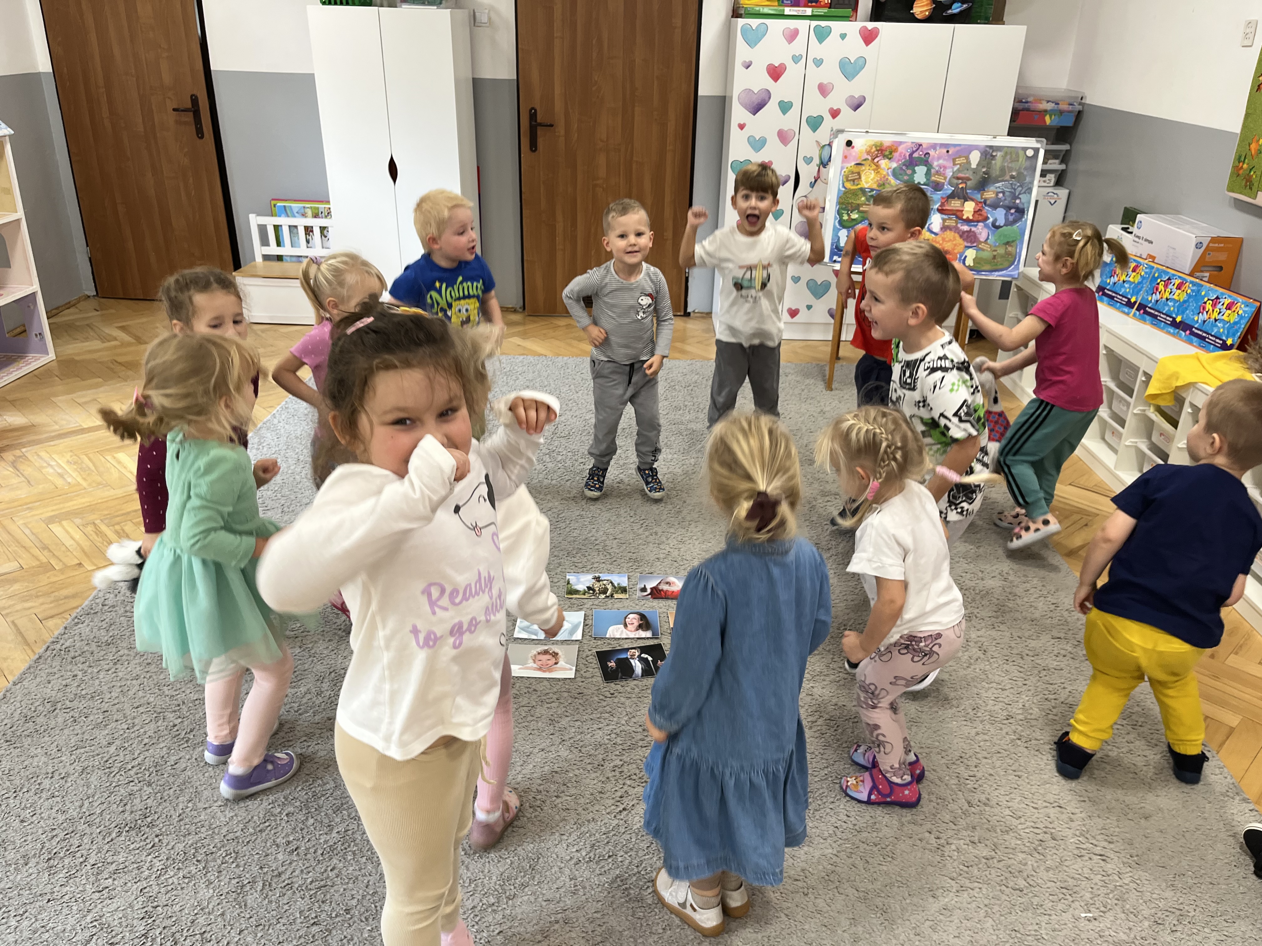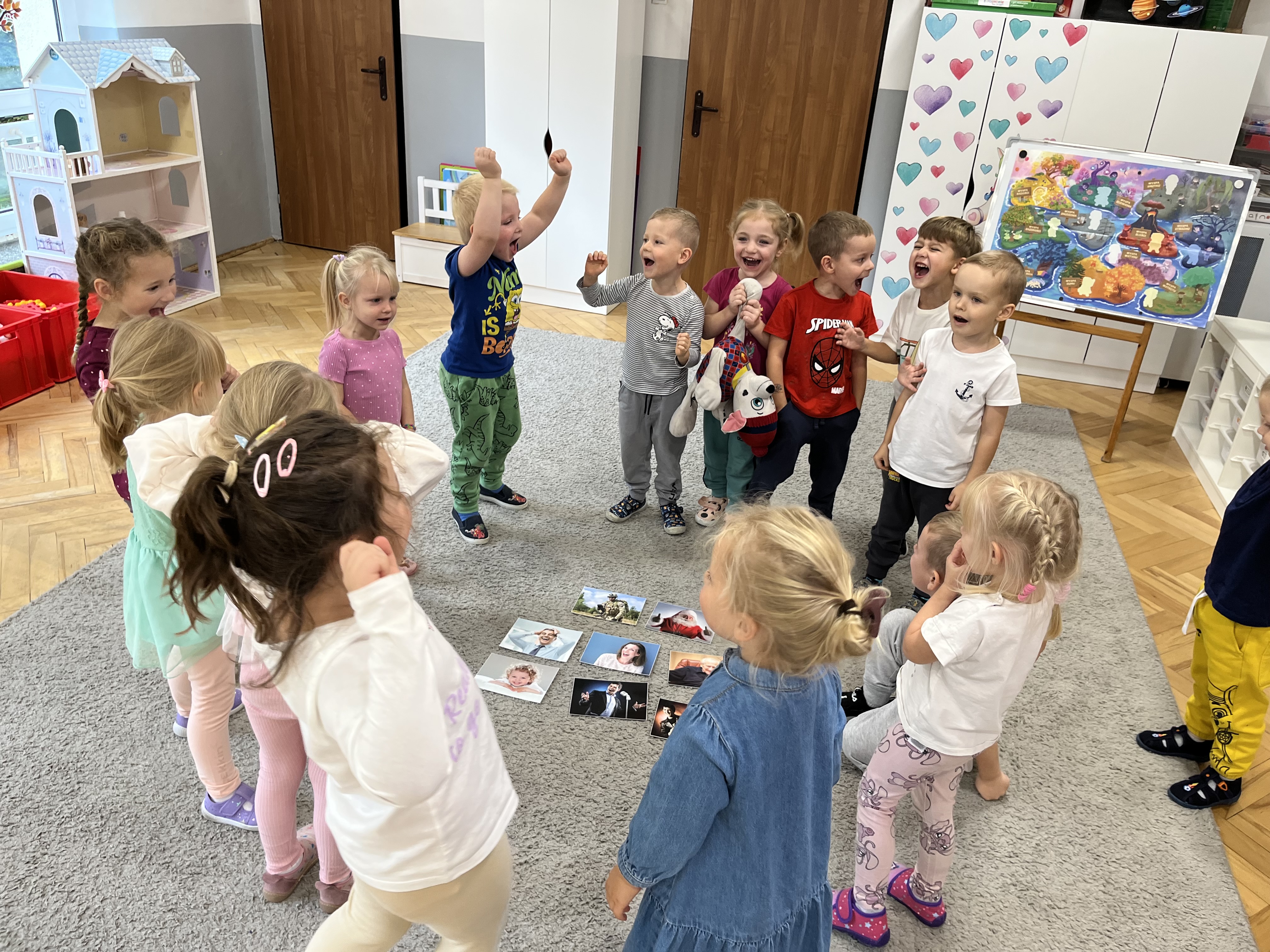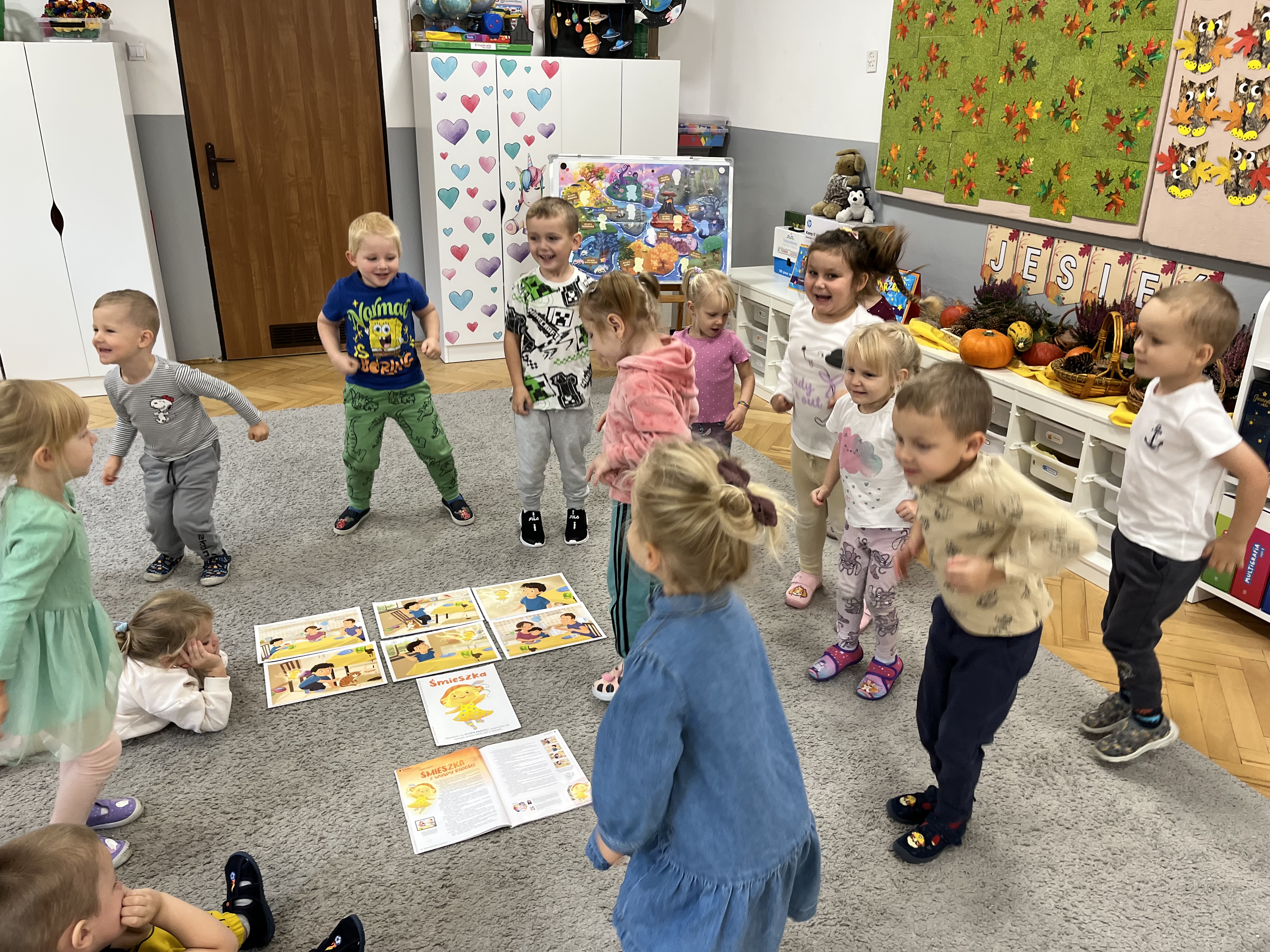Podczas zabaw ruchowych przedszkolaki rozpoznawały i nazywały różne emocje, ze szczególnym uwzględnieniem radości. Wspólnie poszukiwały oznak tej emocji w mimice, gestach i zachowaniu.