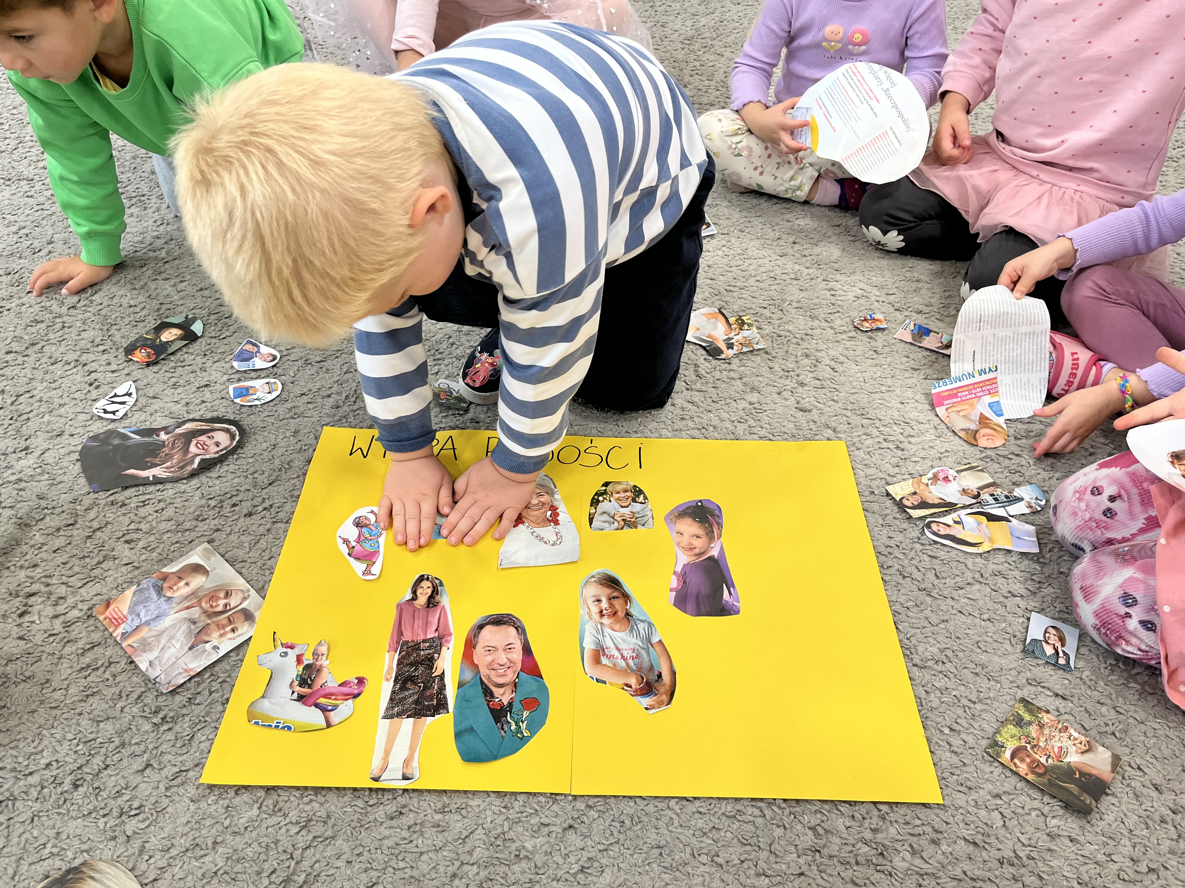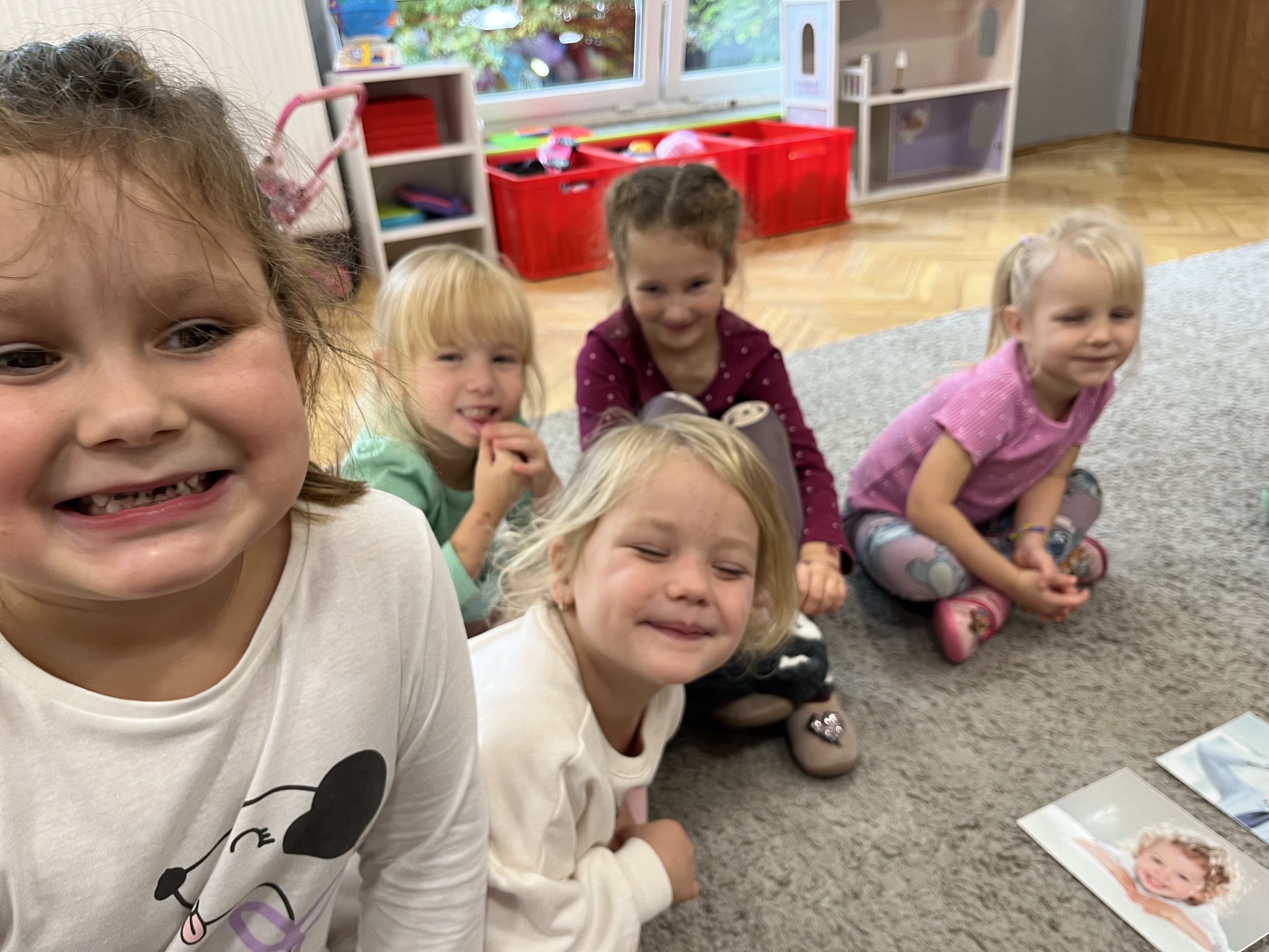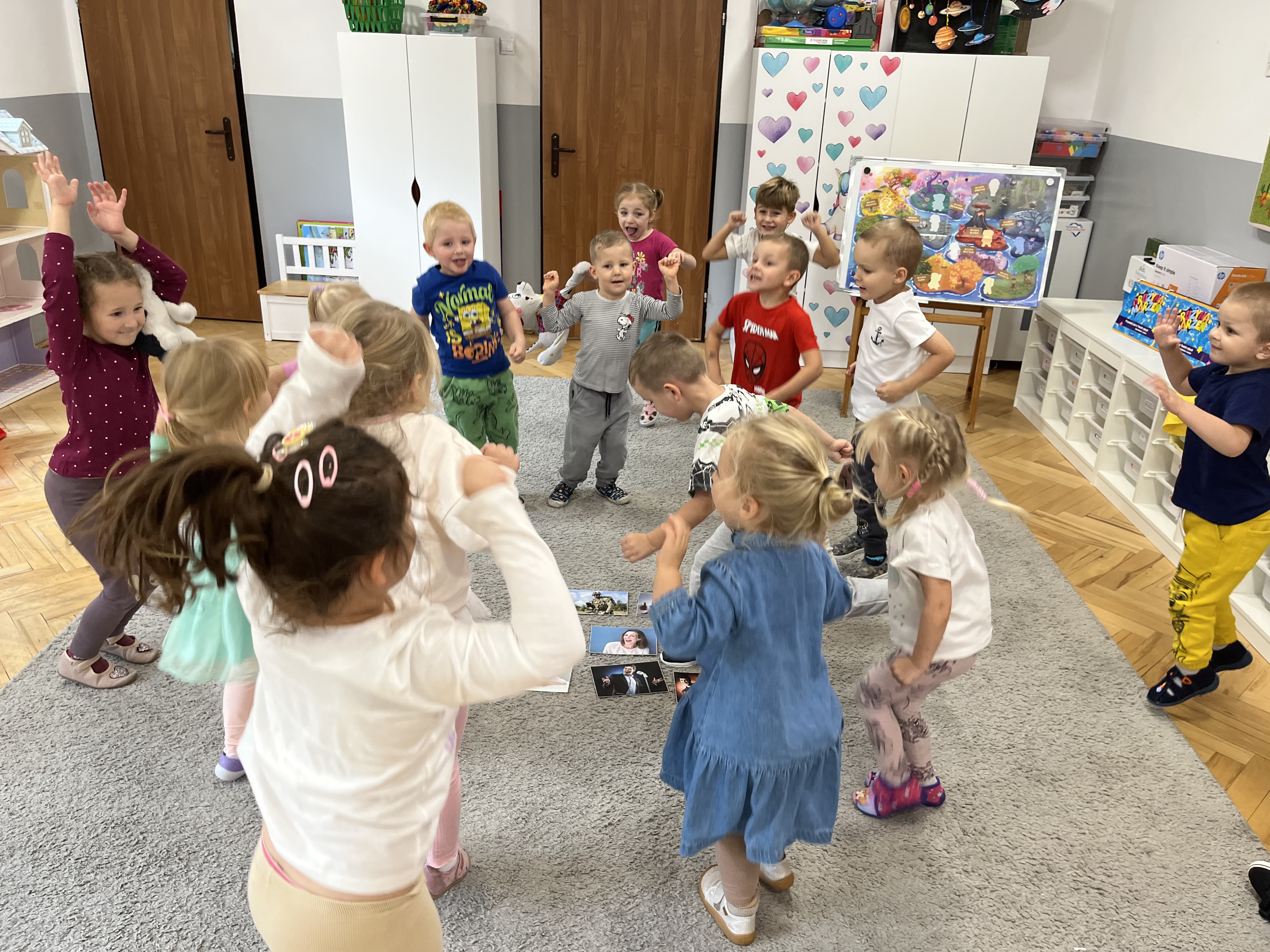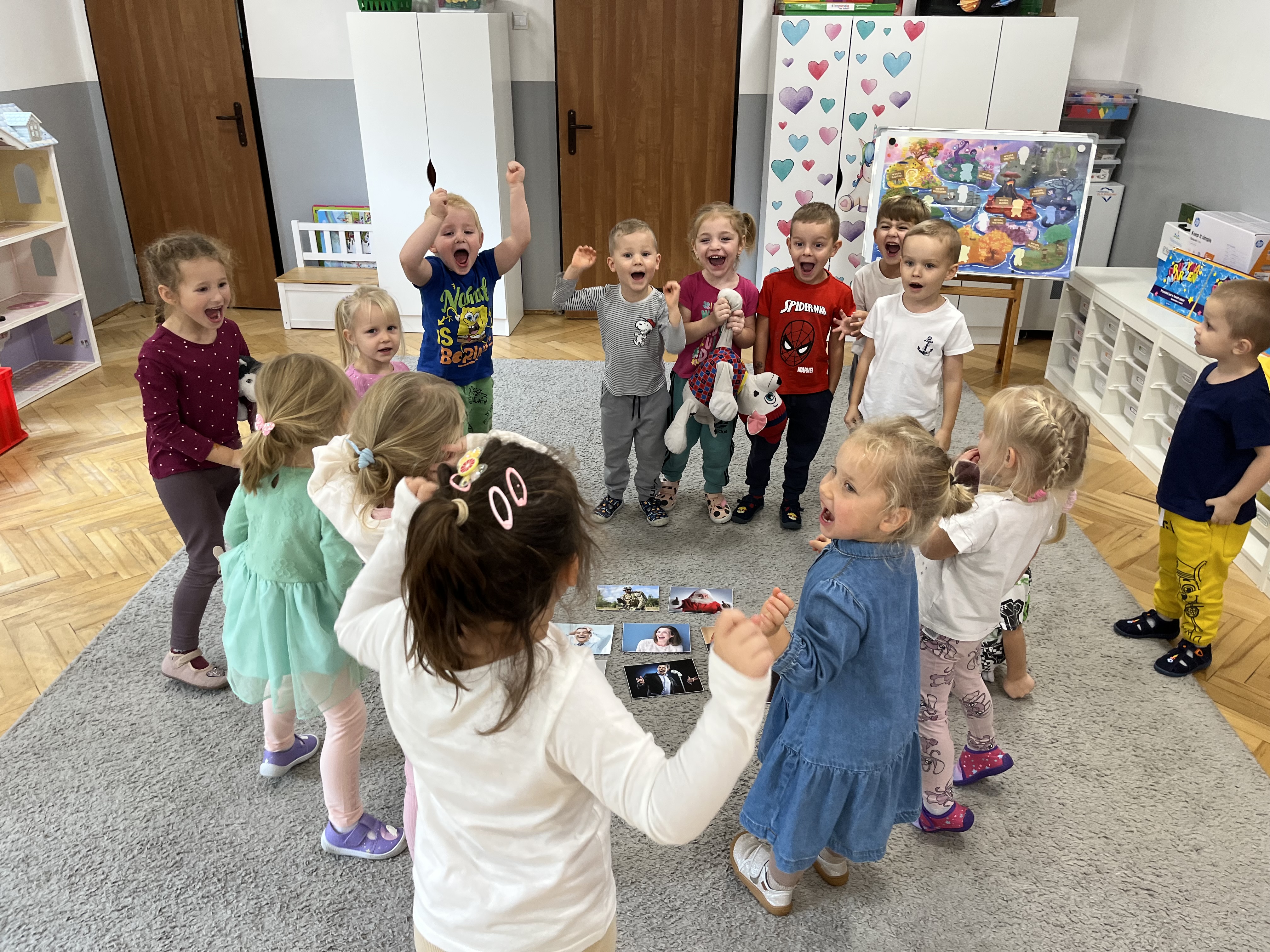 Podczas zabaw ruchowych przedszkolaki rozpoznawały i nazywały różne emocje, ze szczególnym uwzględnieniem radości. Wspólnie poszukiwały oznak tej emocji w mimice, gestach i zachowaniu.