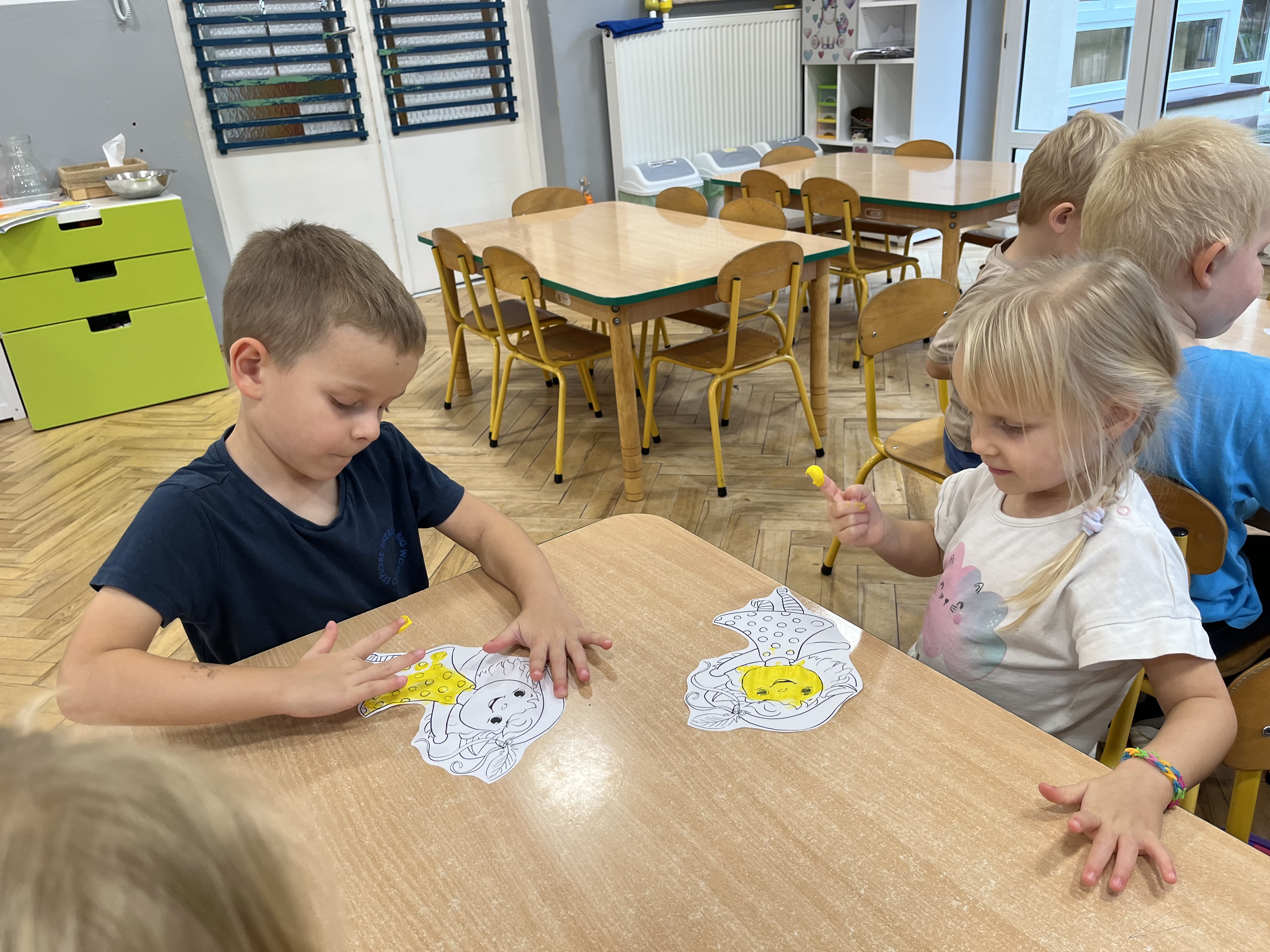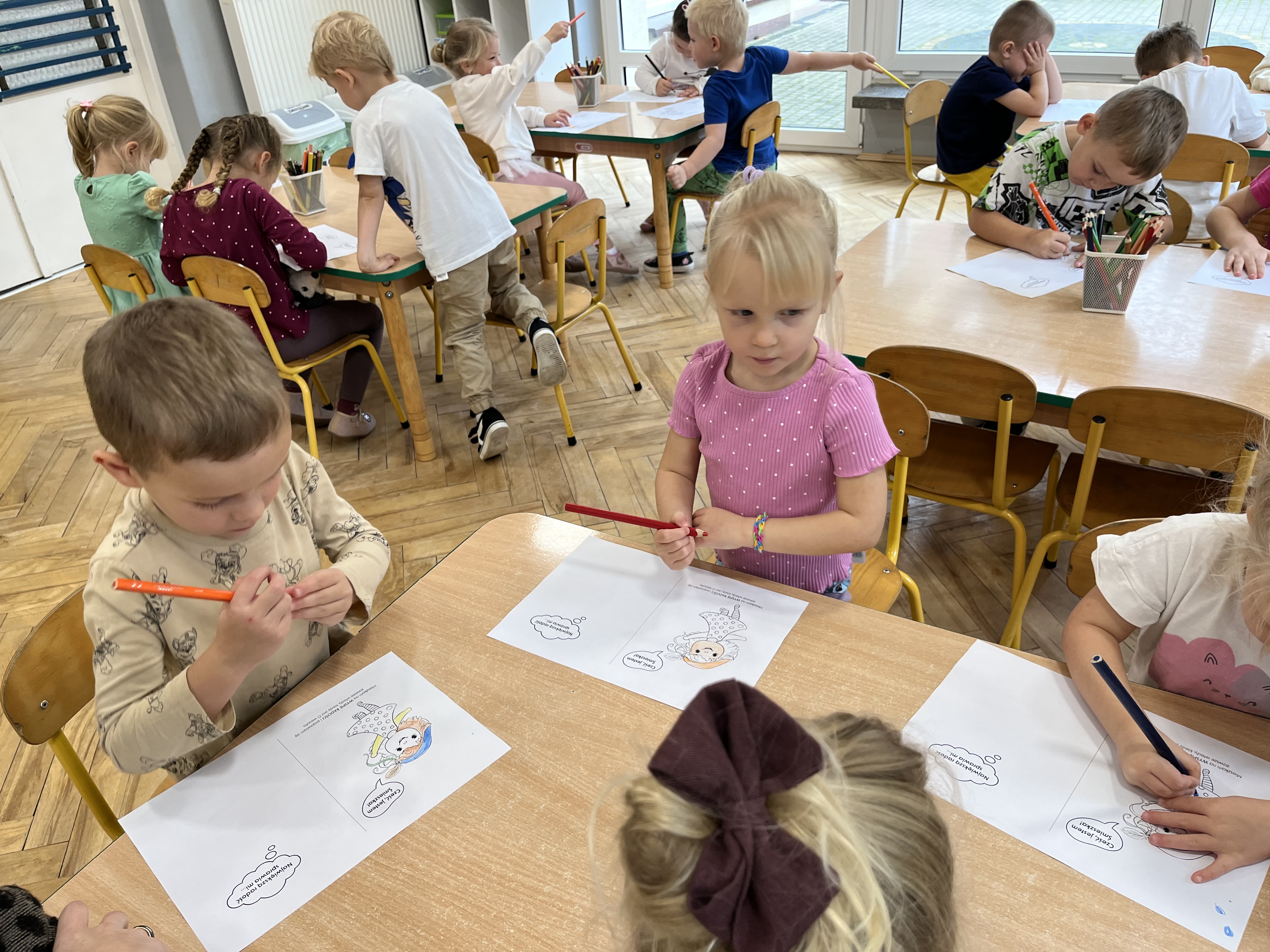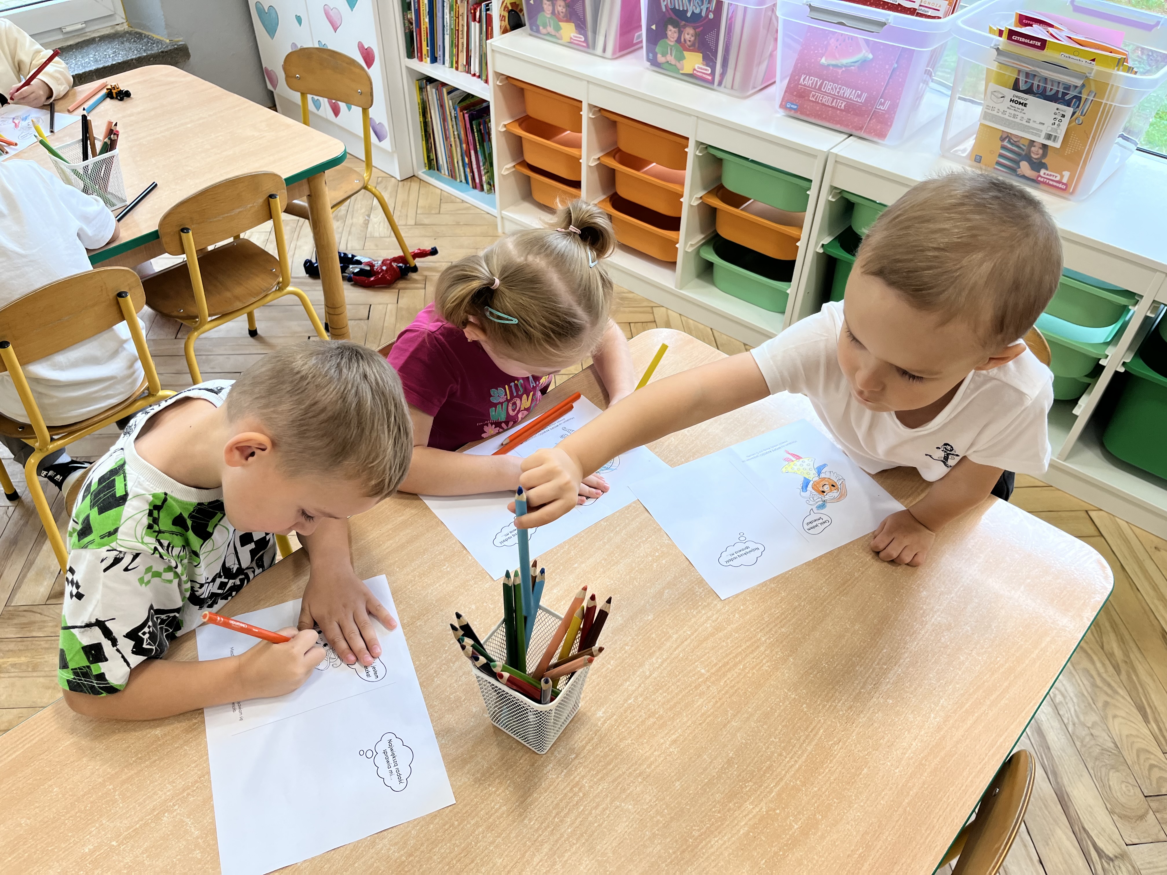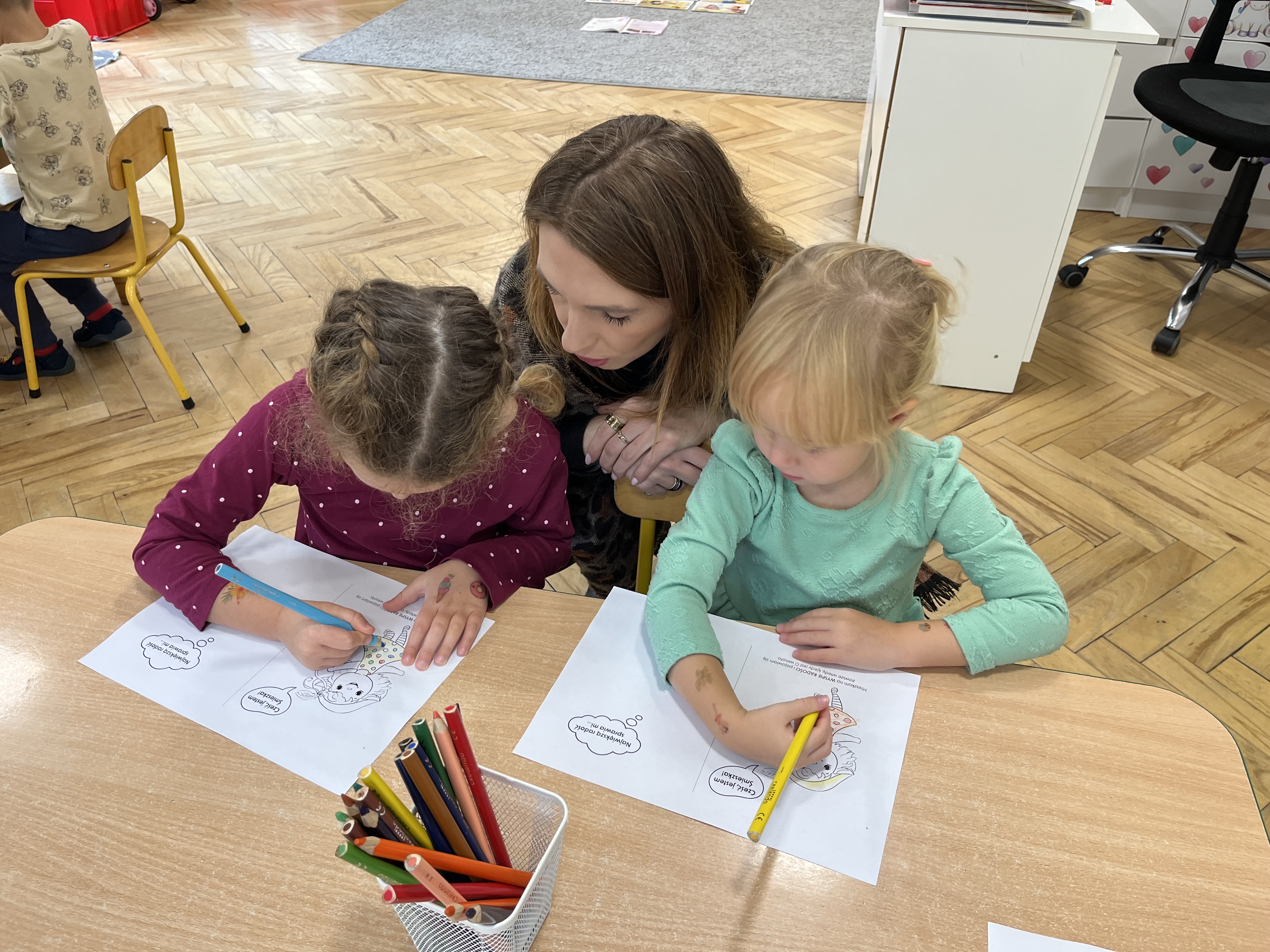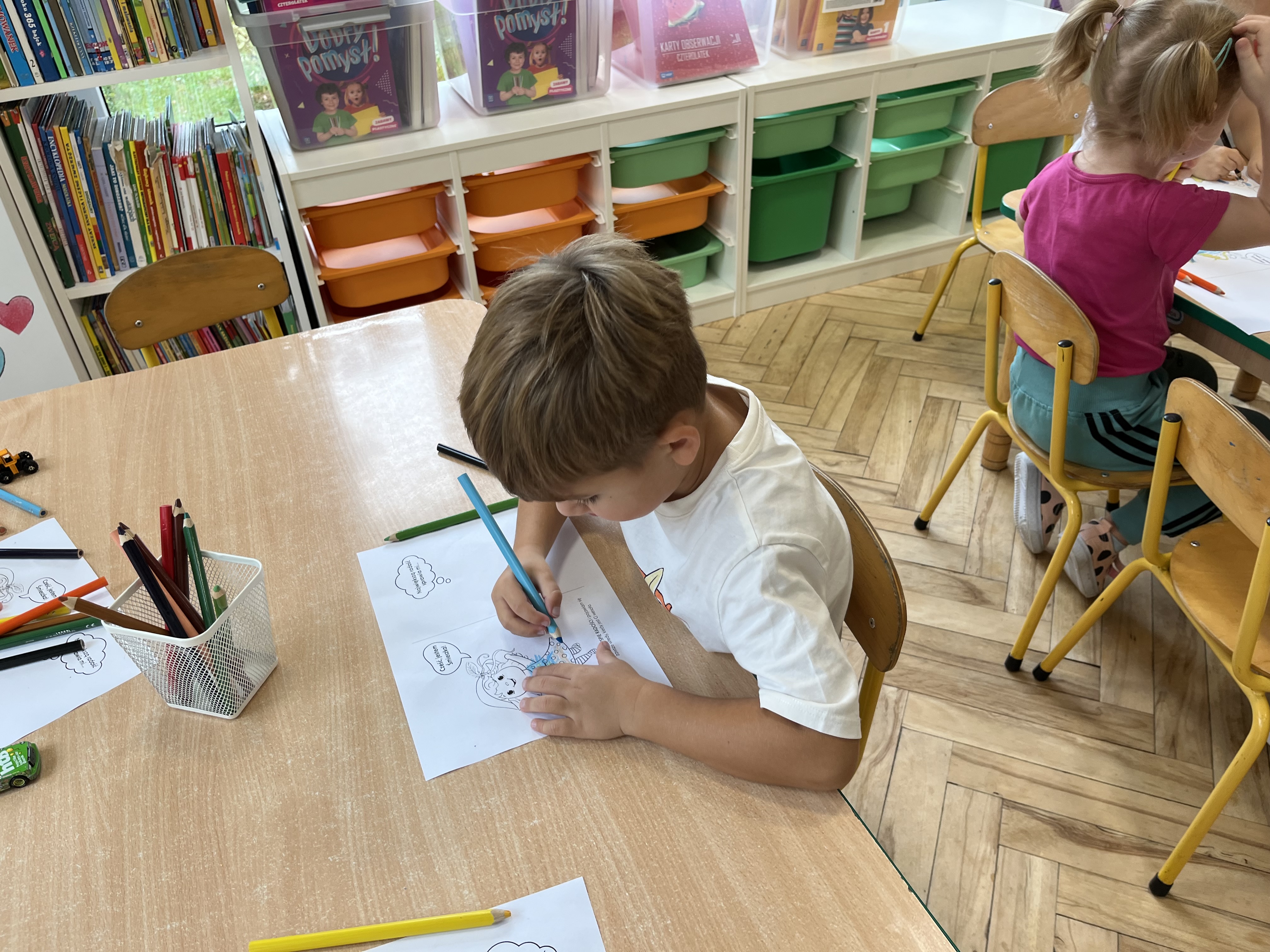W dalszej części zajęć dzieci wypełniły pierwszą kartę emocjonalnej książeczki – pokolorowały postać Śmieszki oraz narysowały to, co sprawia im największą radość.