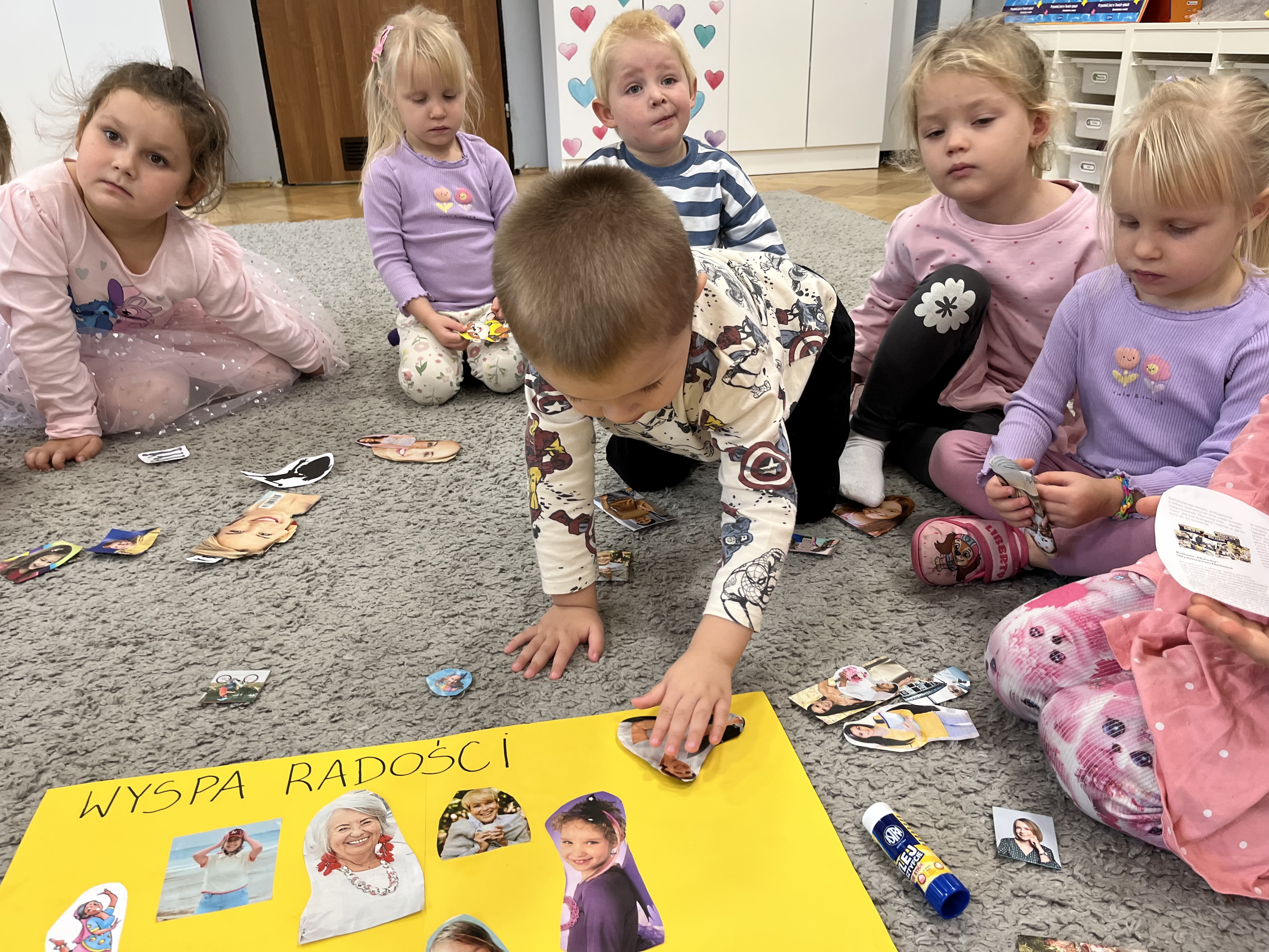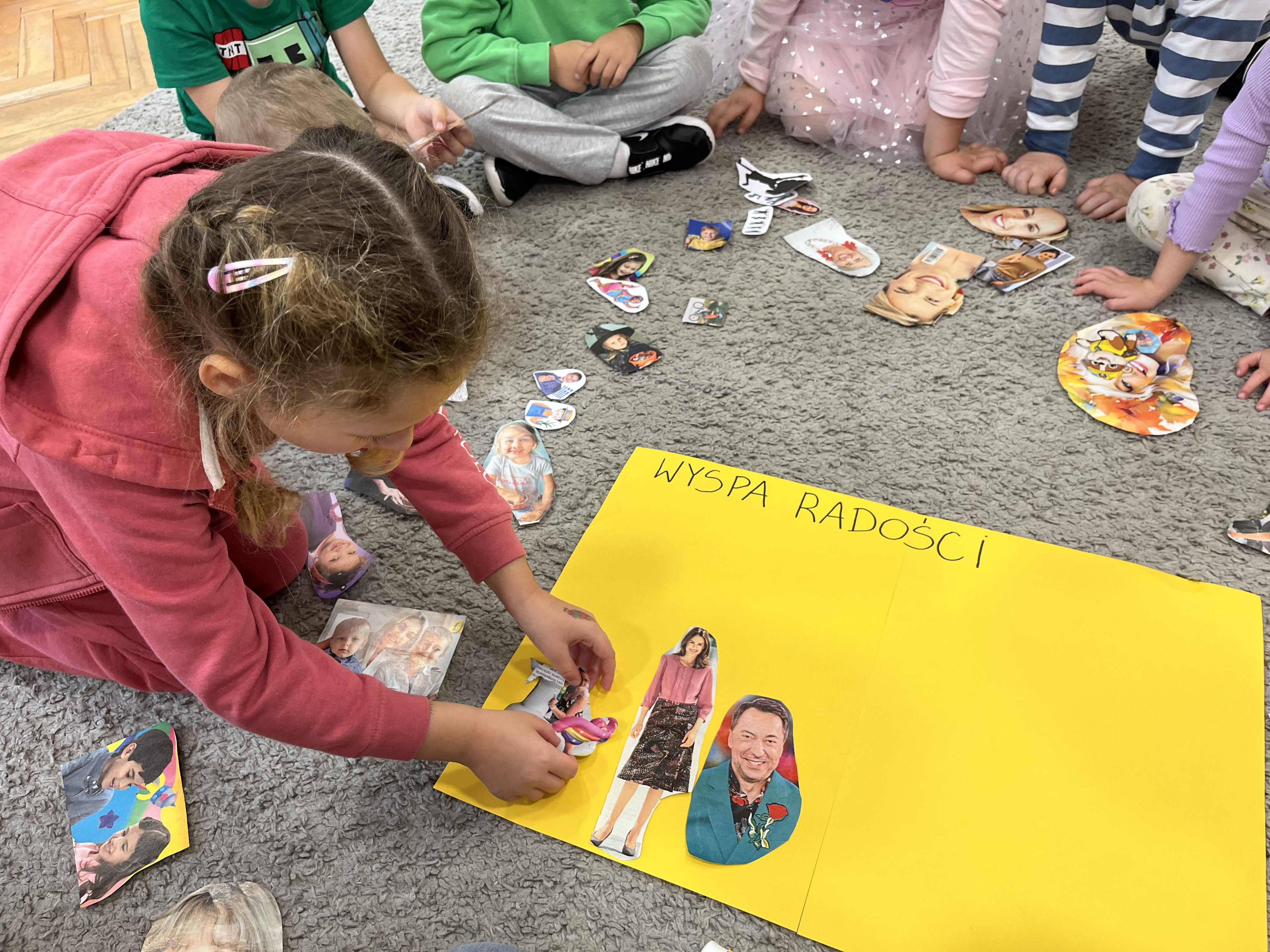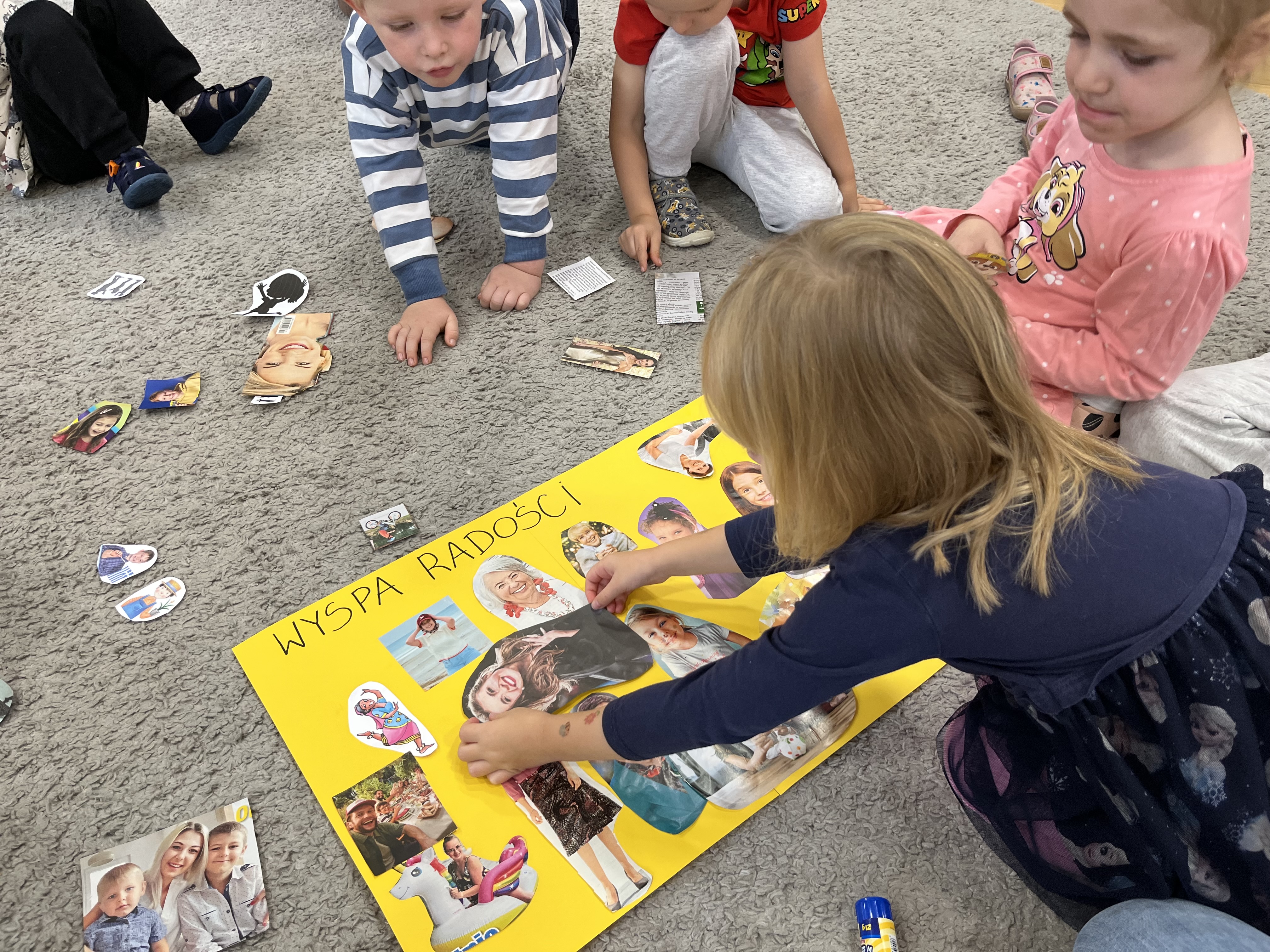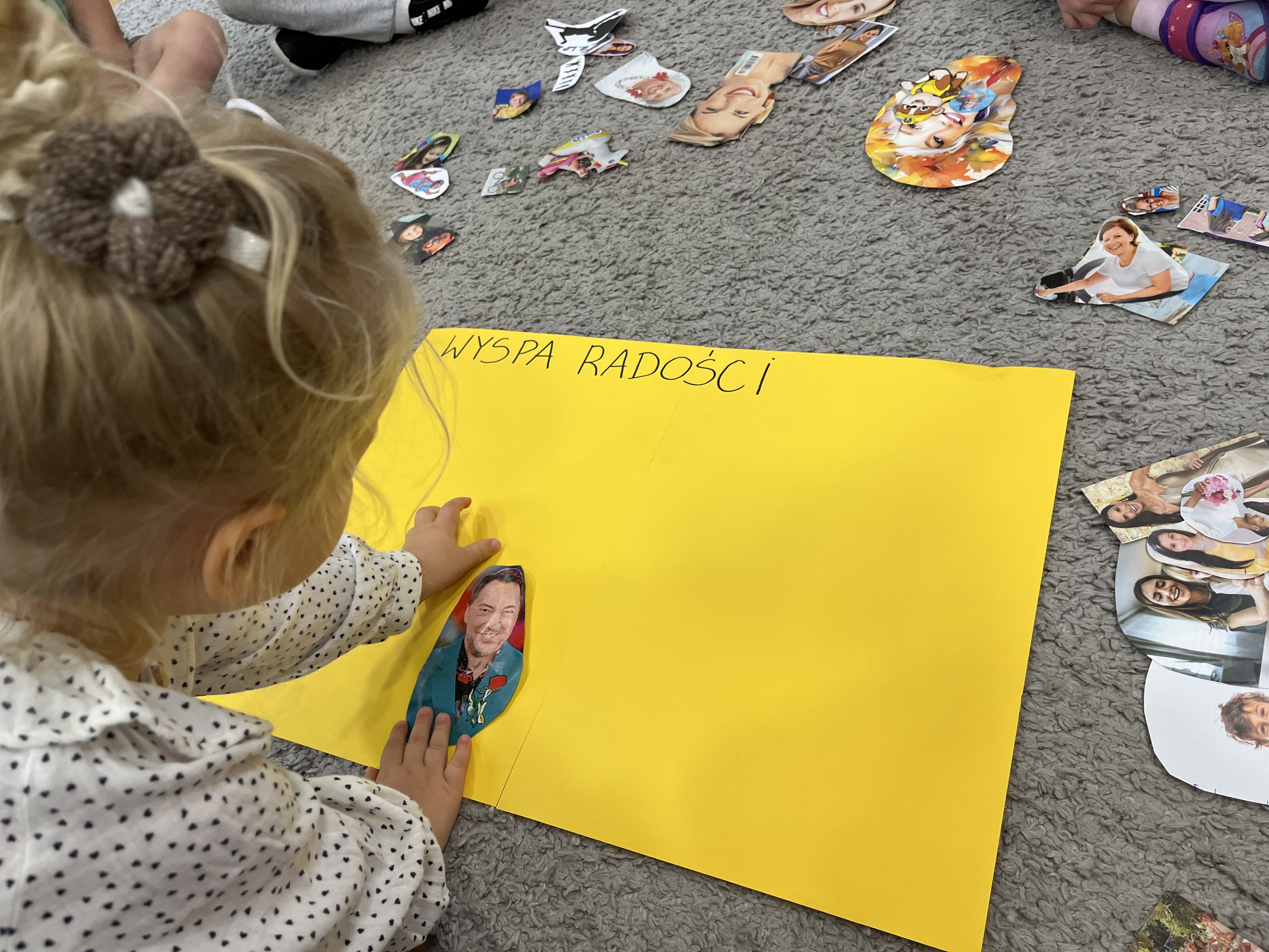 Na zakończenie zajęć dzieci stworzyły własną „Wyspę Radości”, wykorzystując wycinki z gazet przedstawiające radosnych ludzi. Praca plastyczna wywołała wiele pozytywnych emocji, a wspólne działania sprzyjały integracji grupy i wzmacnianiu więzi rówieśniczych.