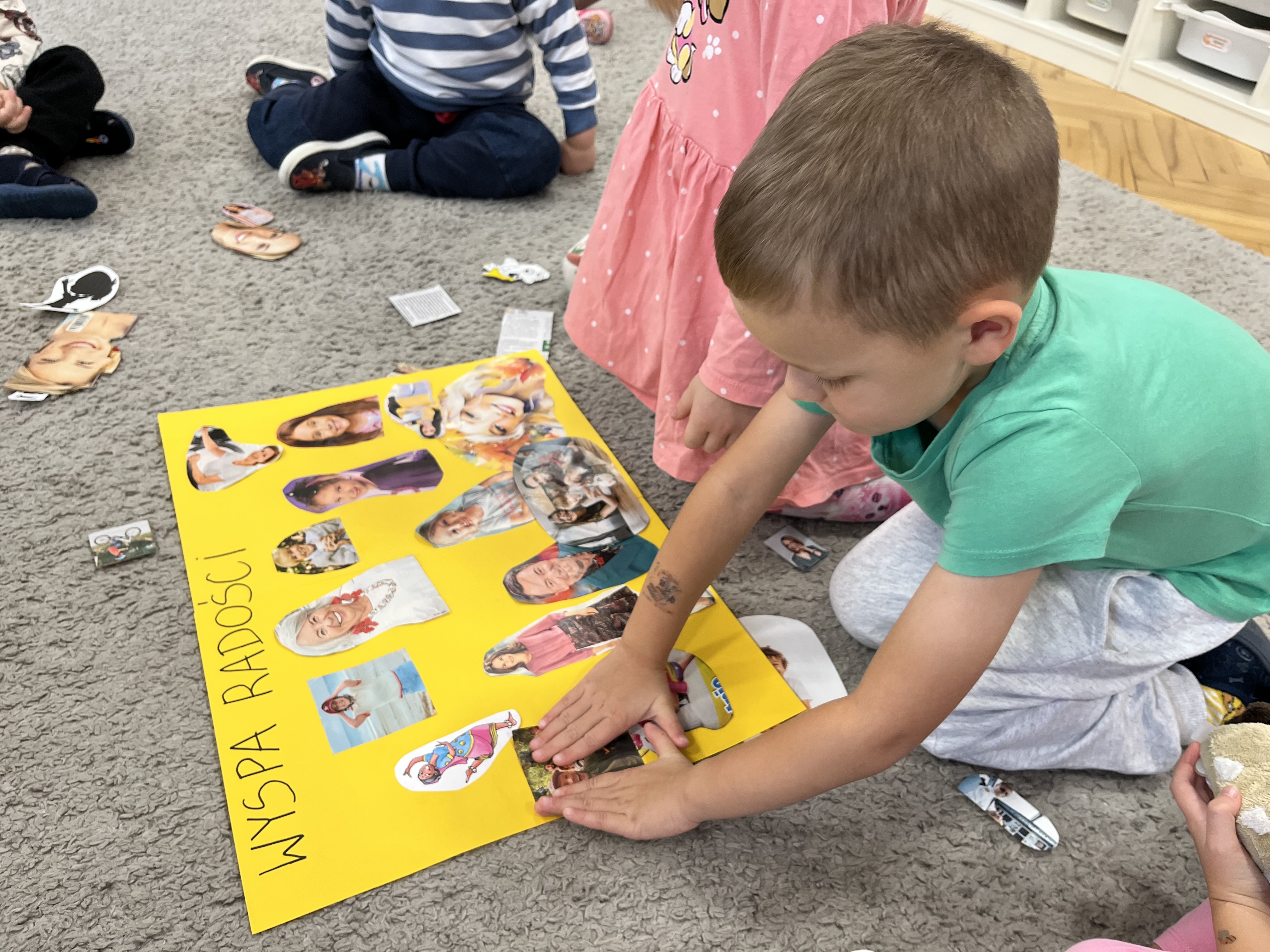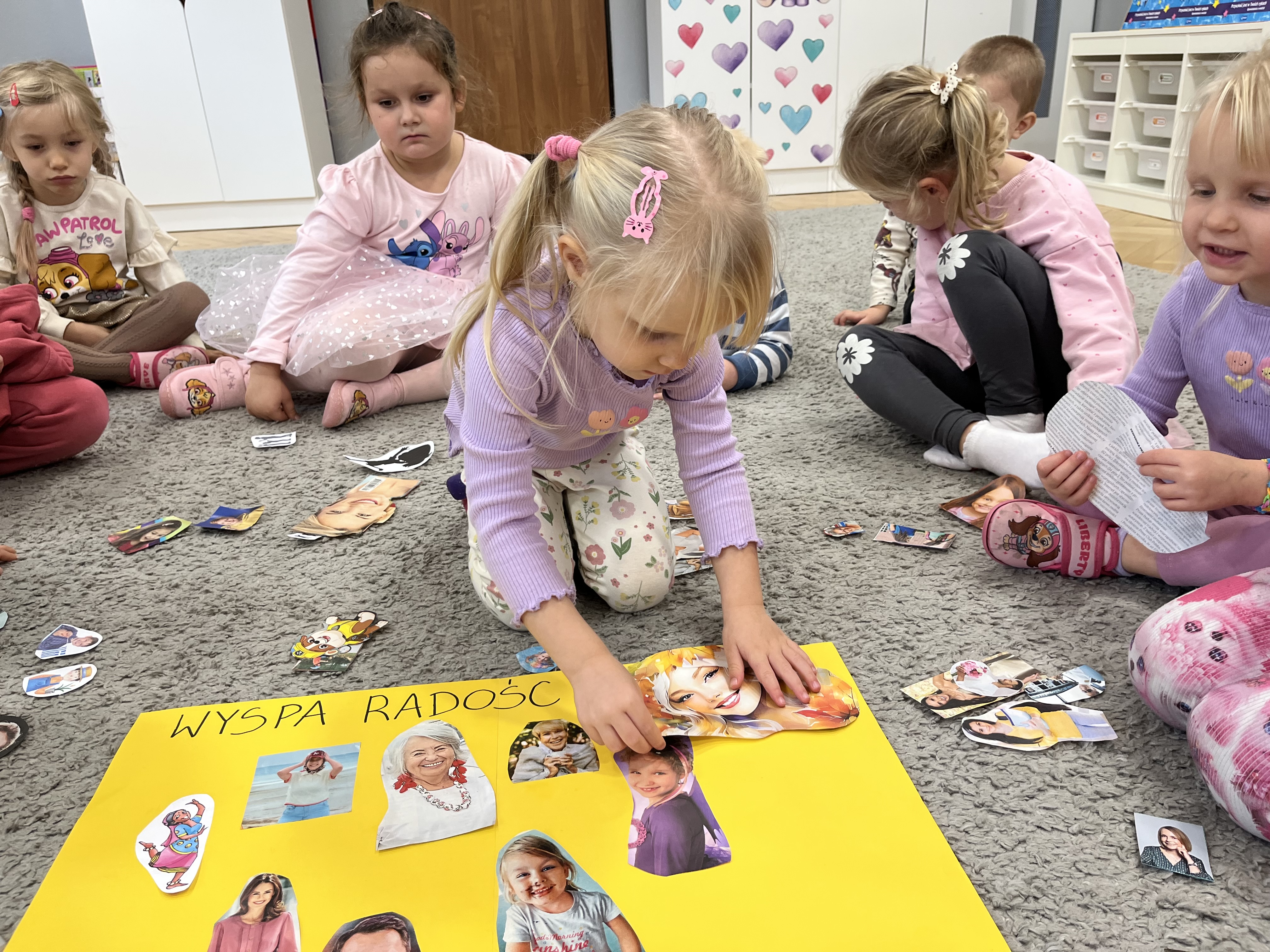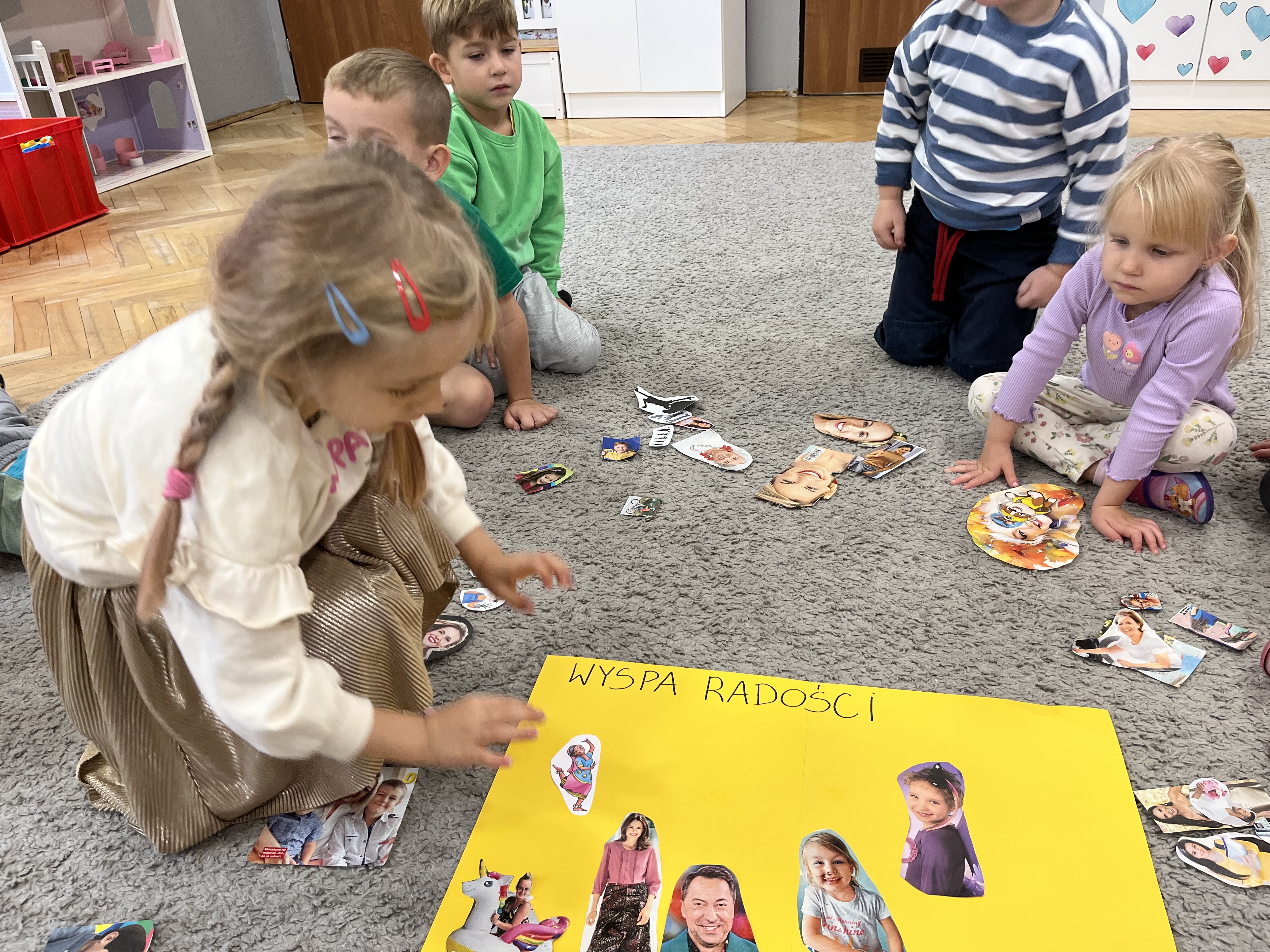 Na zakończenie zajęć dzieci stworzyły własną „Wyspę Radości”, wykorzystując wycinki z gazet przedstawiające radosnych ludzi. Praca plastyczna wywołała wiele pozytywnych emocji, a wspólne działania sprzyjały integracji grupy i wzmacnianiu więzi rówieśniczych.