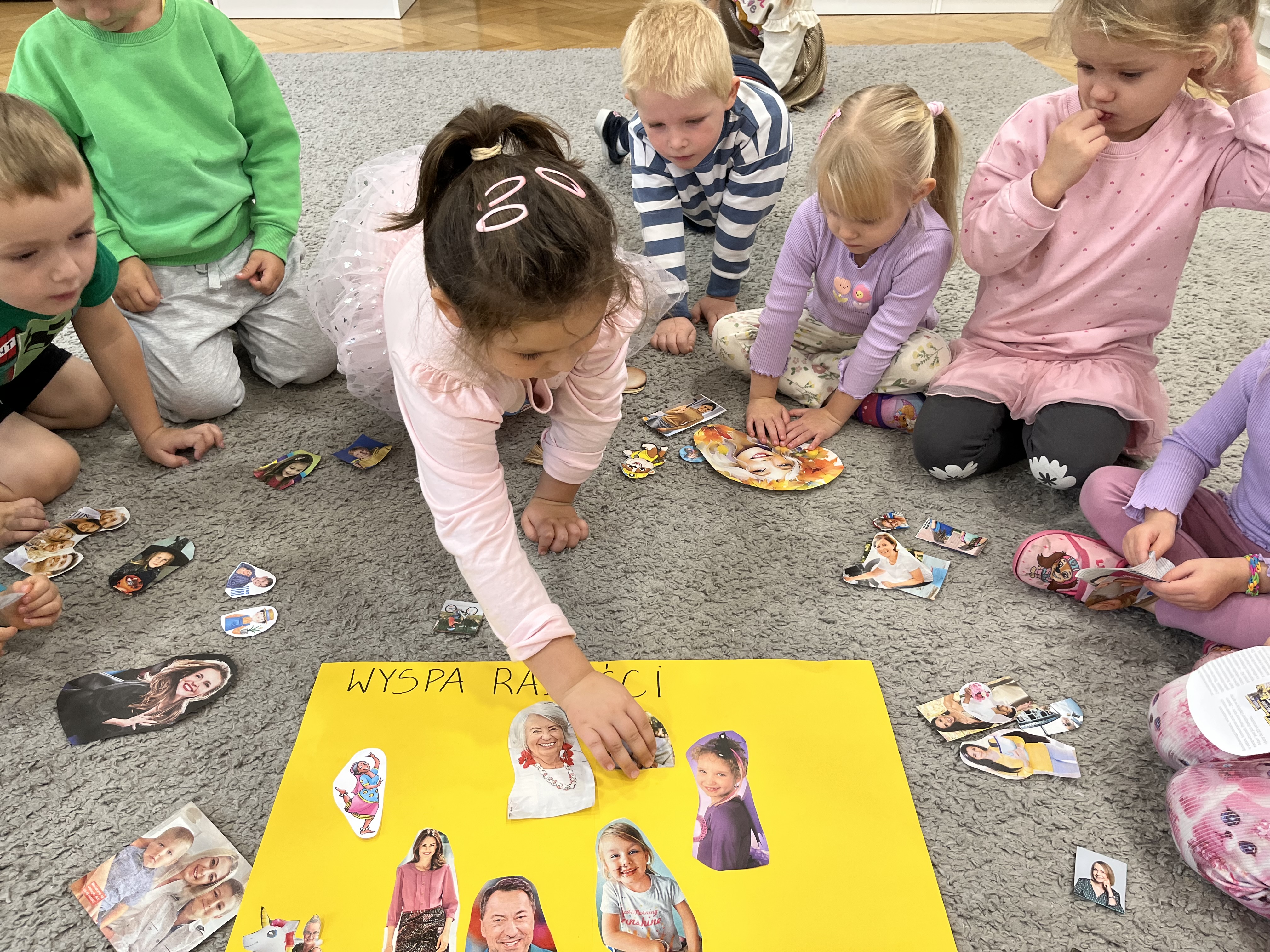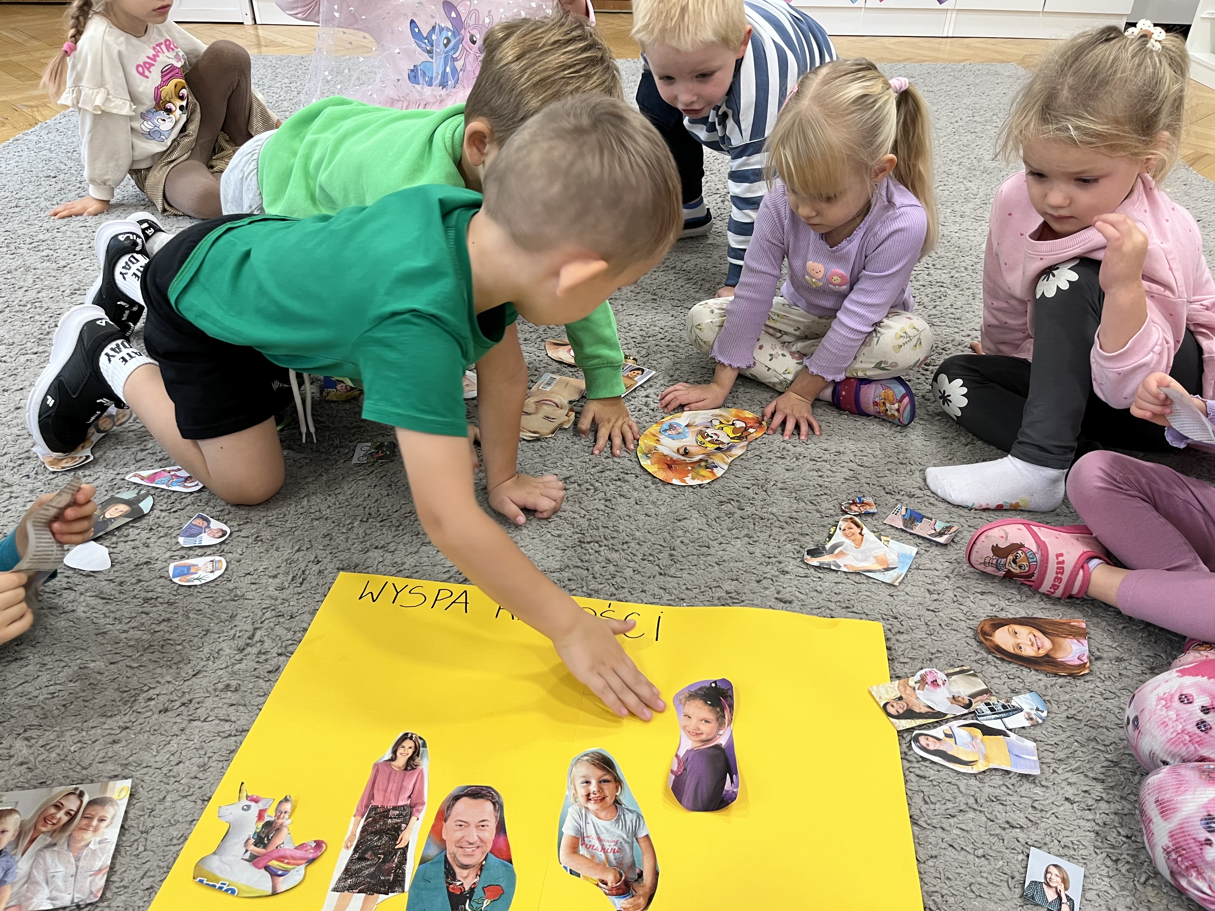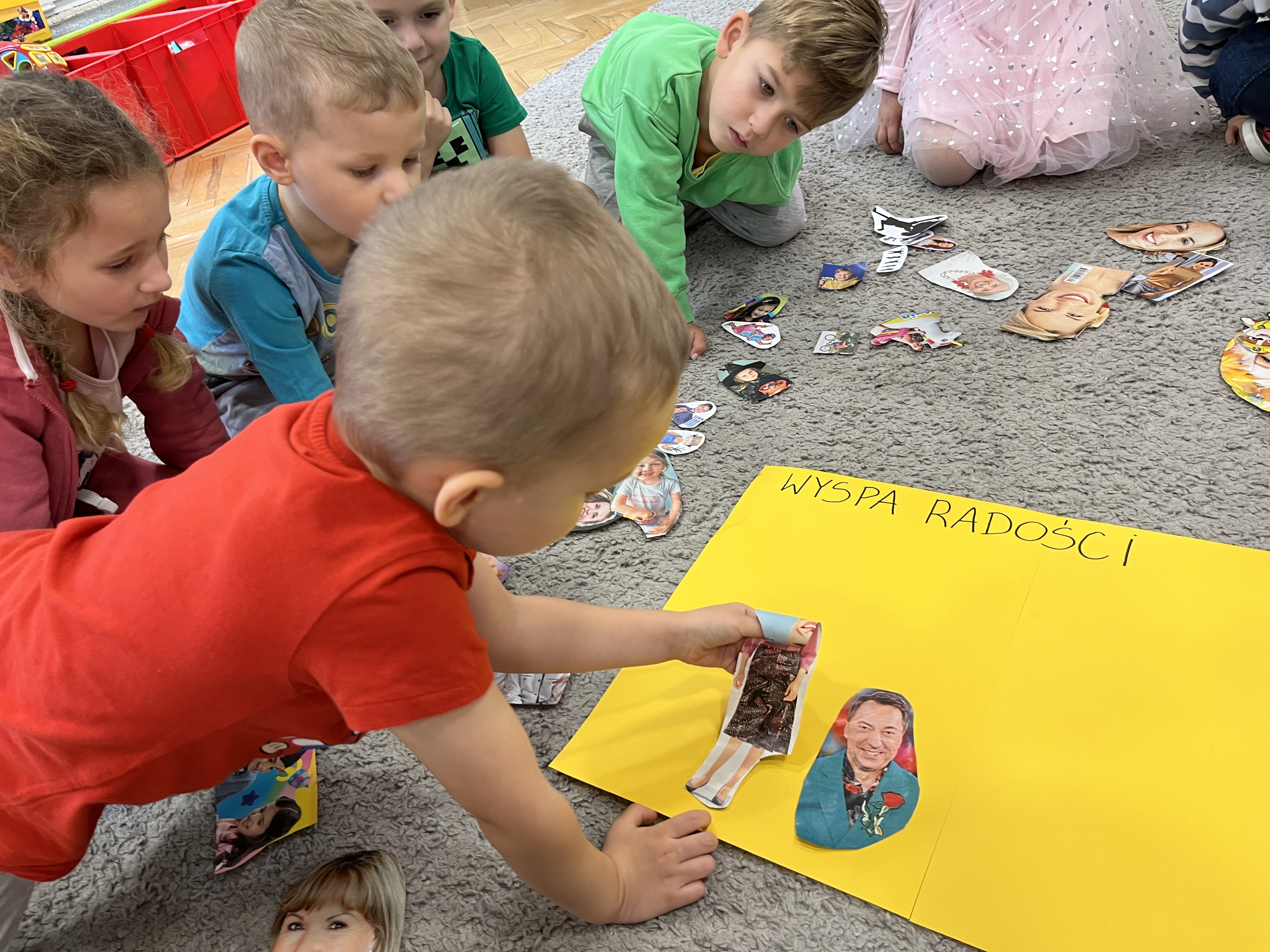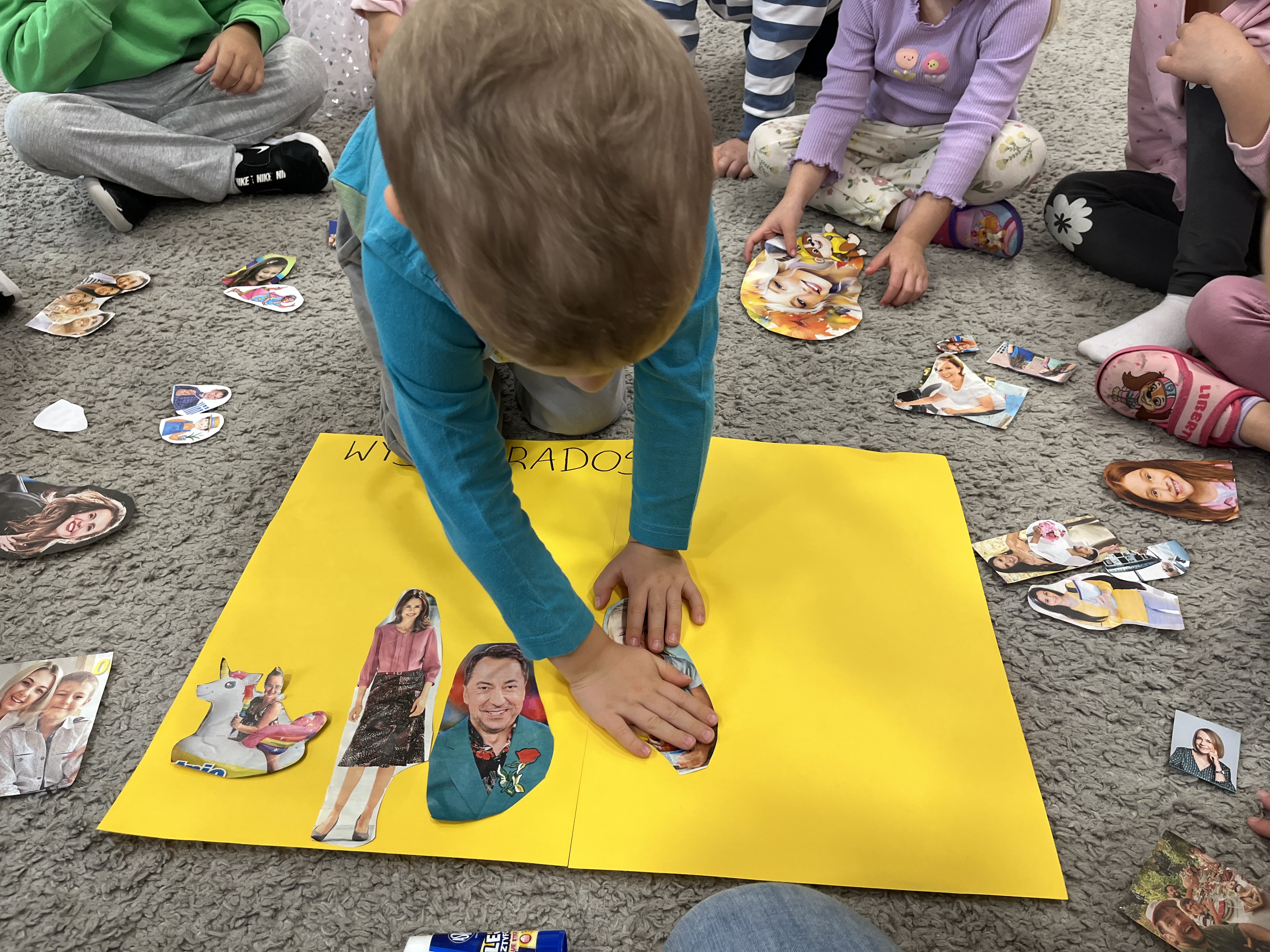 Na zakończenie zajęć dzieci stworzyły własną „Wyspę Radości”, wykorzystując wycinki z gazet przedstawiające radosnych ludzi. Praca plastyczna wywołała wiele pozytywnych emocji, a wspólne działania sprzyjały integracji grupy i wzmacnianiu więzi rówieśniczych.